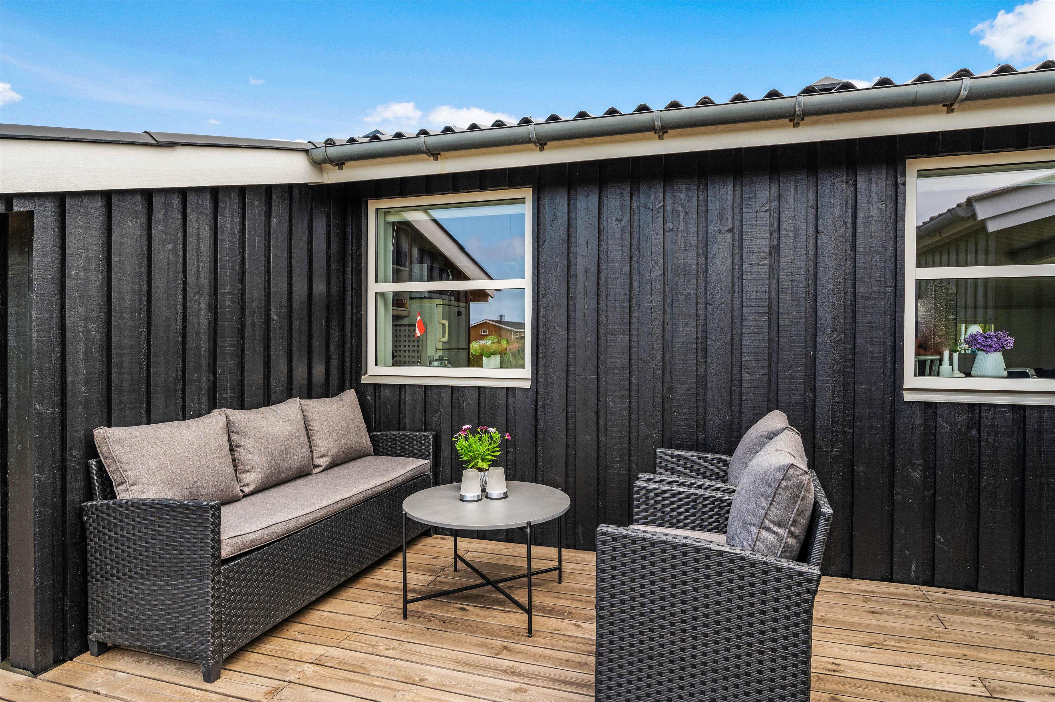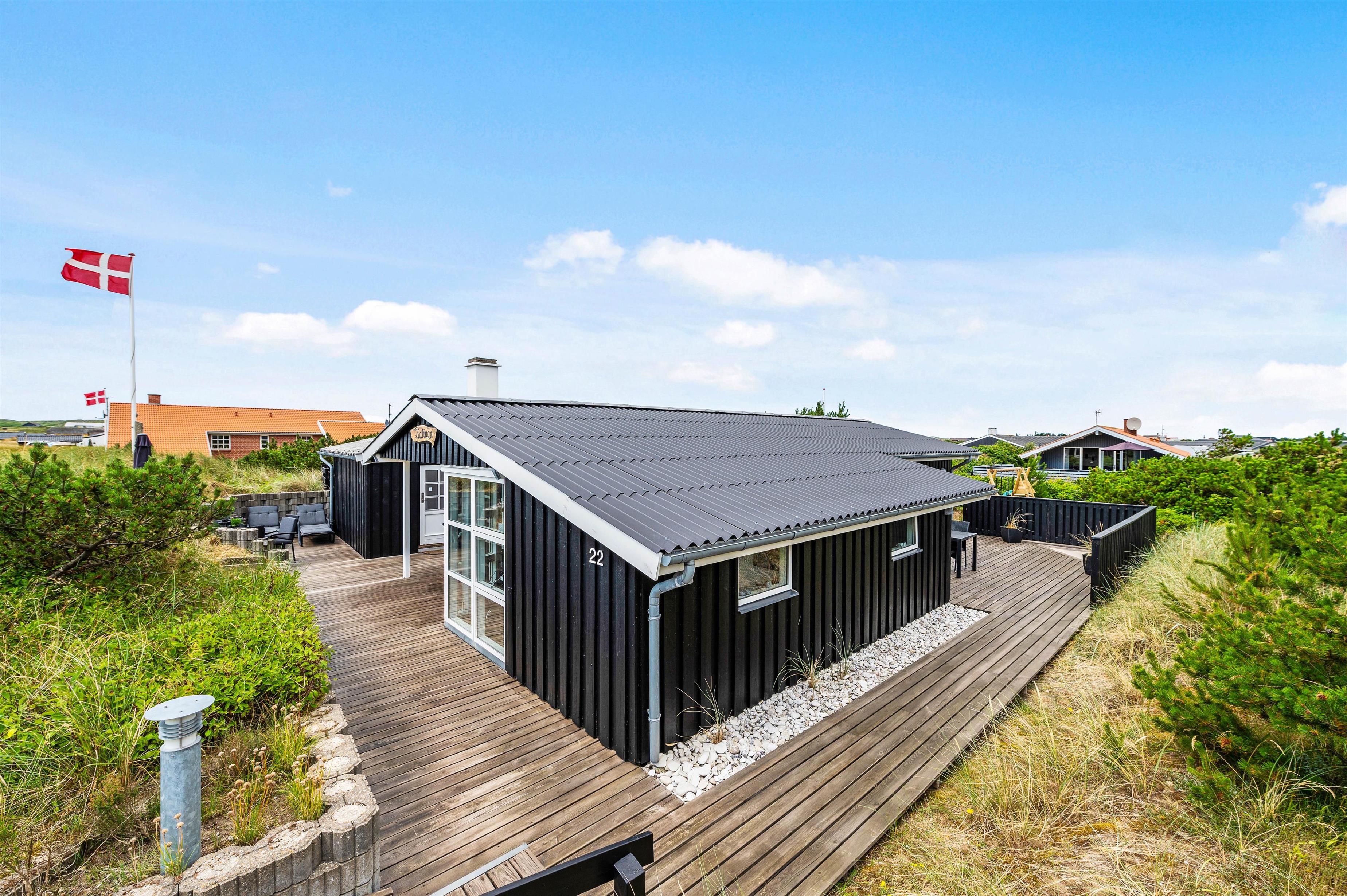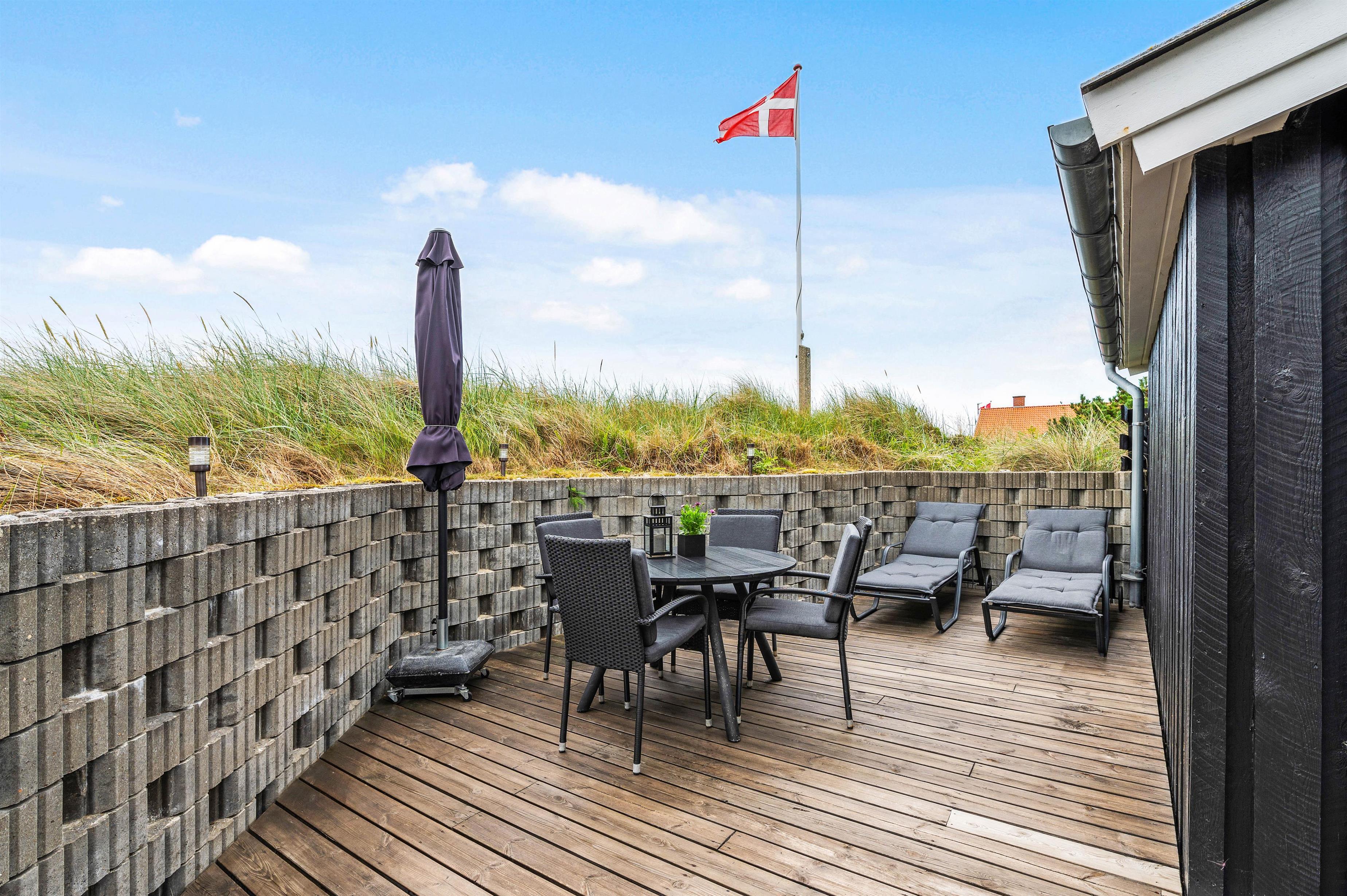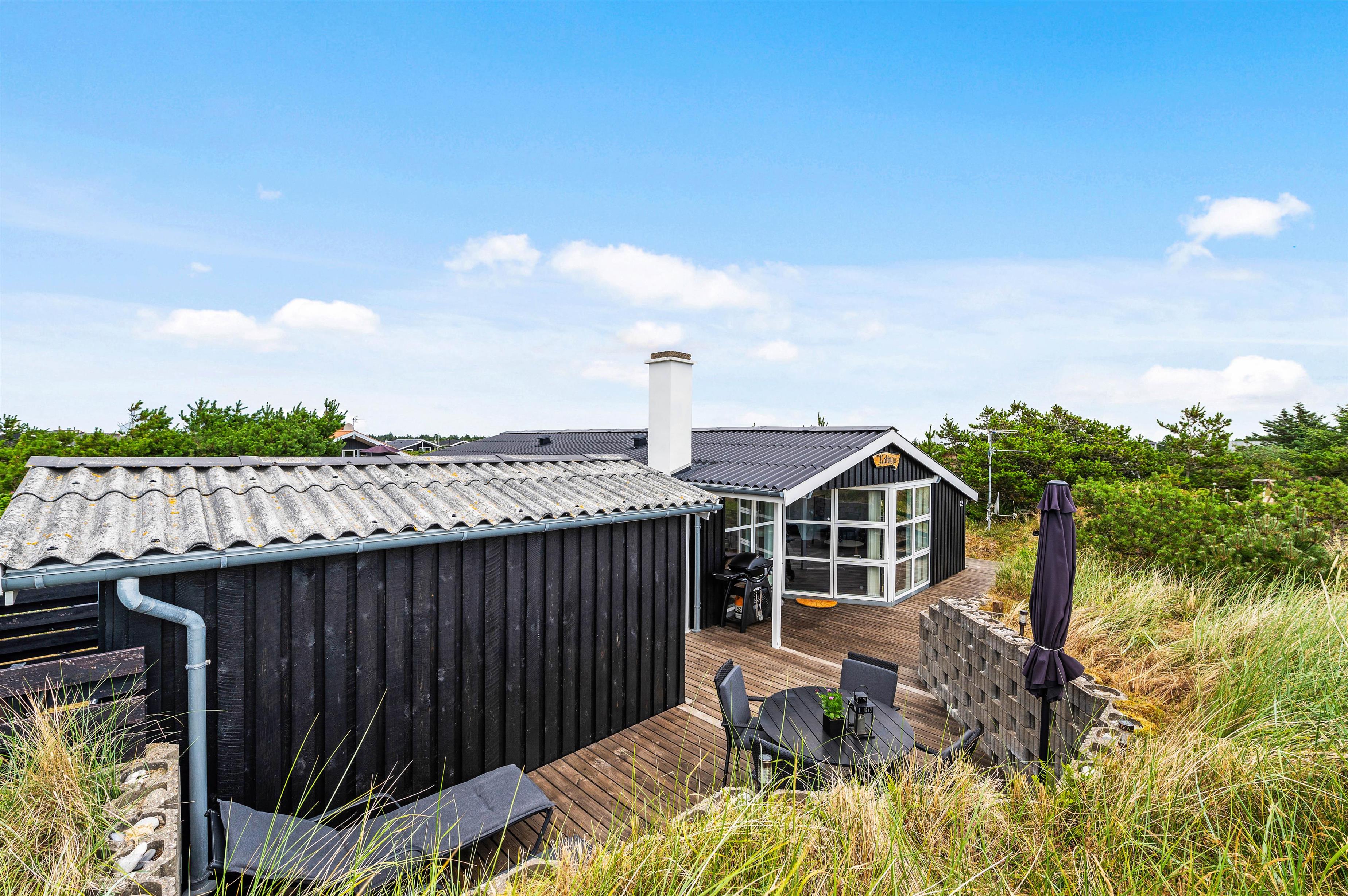 Feriehuset ligger på en dejlig nedsænket naturgrund, så de små klitter omkring sommerhuset giver god læ og sørger for, at I uforstyrret kan sidde ude på terrassen. Hele vejen rundt om feriehuset er der anlagt en god terrasse, så uanset hvor vinden kommer fra, vil I altid kunne finde et godt sted med læ og sidde ude.