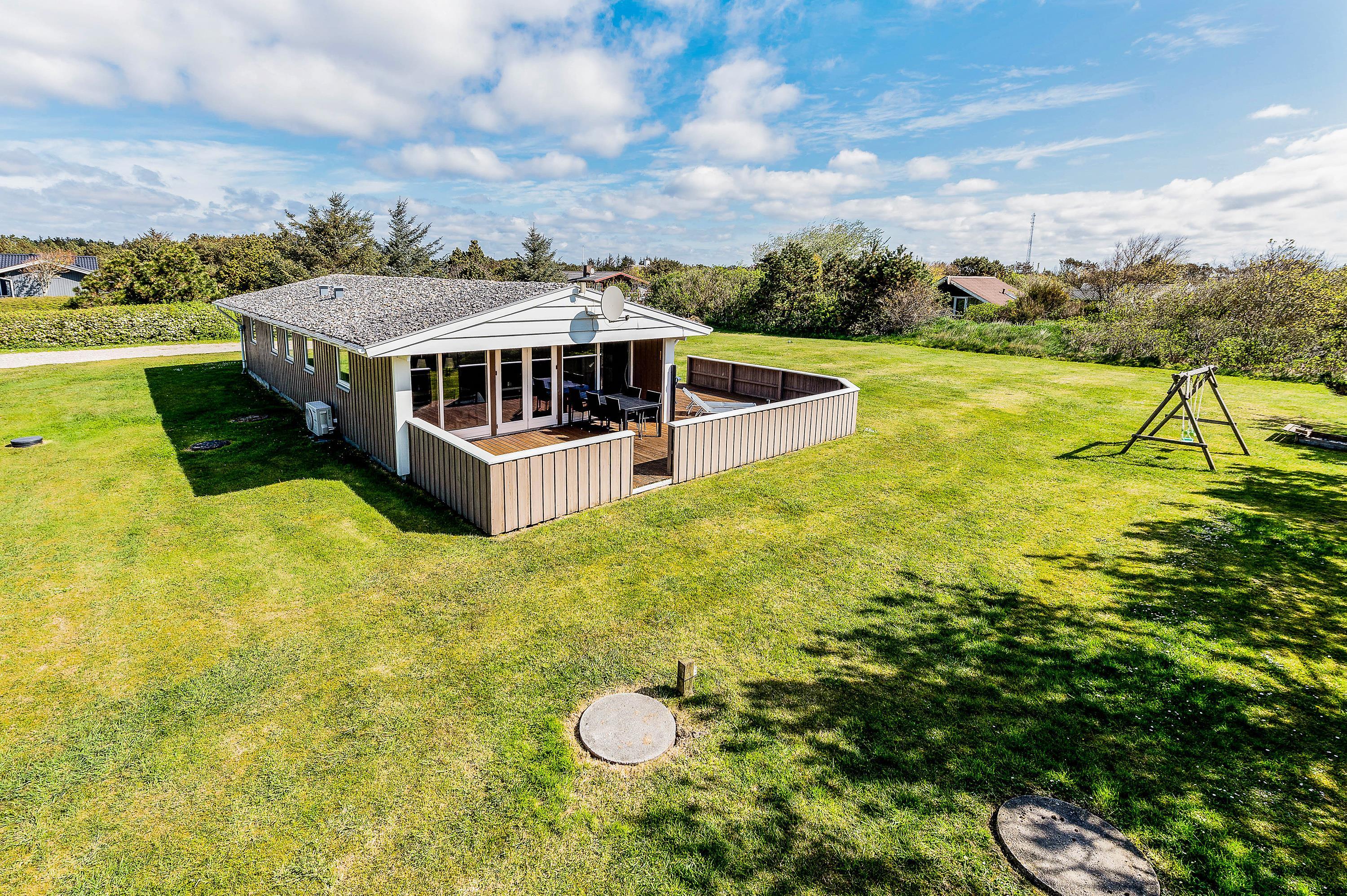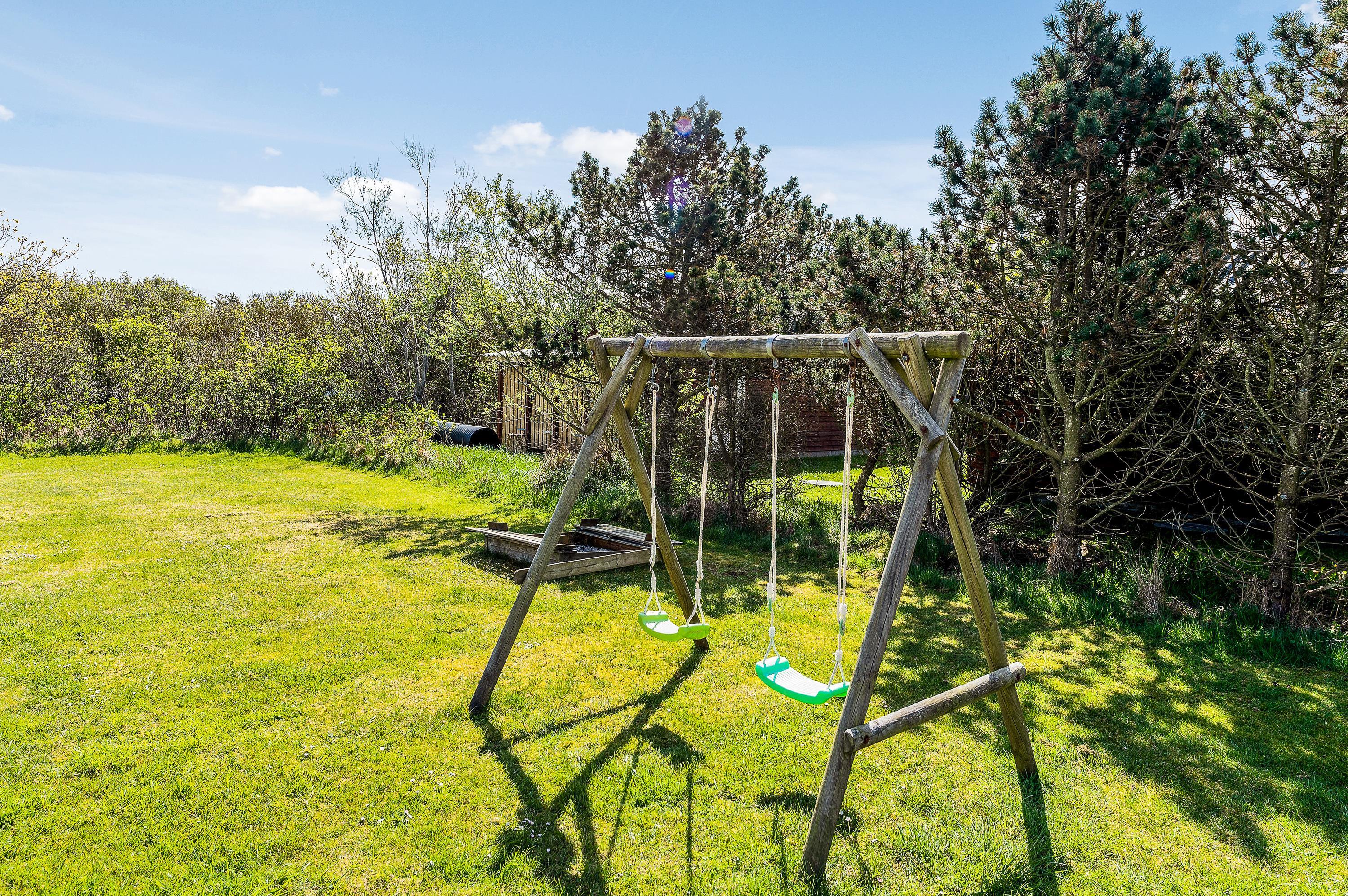 Beliggenheden på den store, let afskærmet grund opfordrer til boldspil og leg i de fine legeredskaber for de mindste og den lukkede terrasse giver rig mulighed for at nyde naturen i fred og ro i liggestole eller de gode havemøbler.