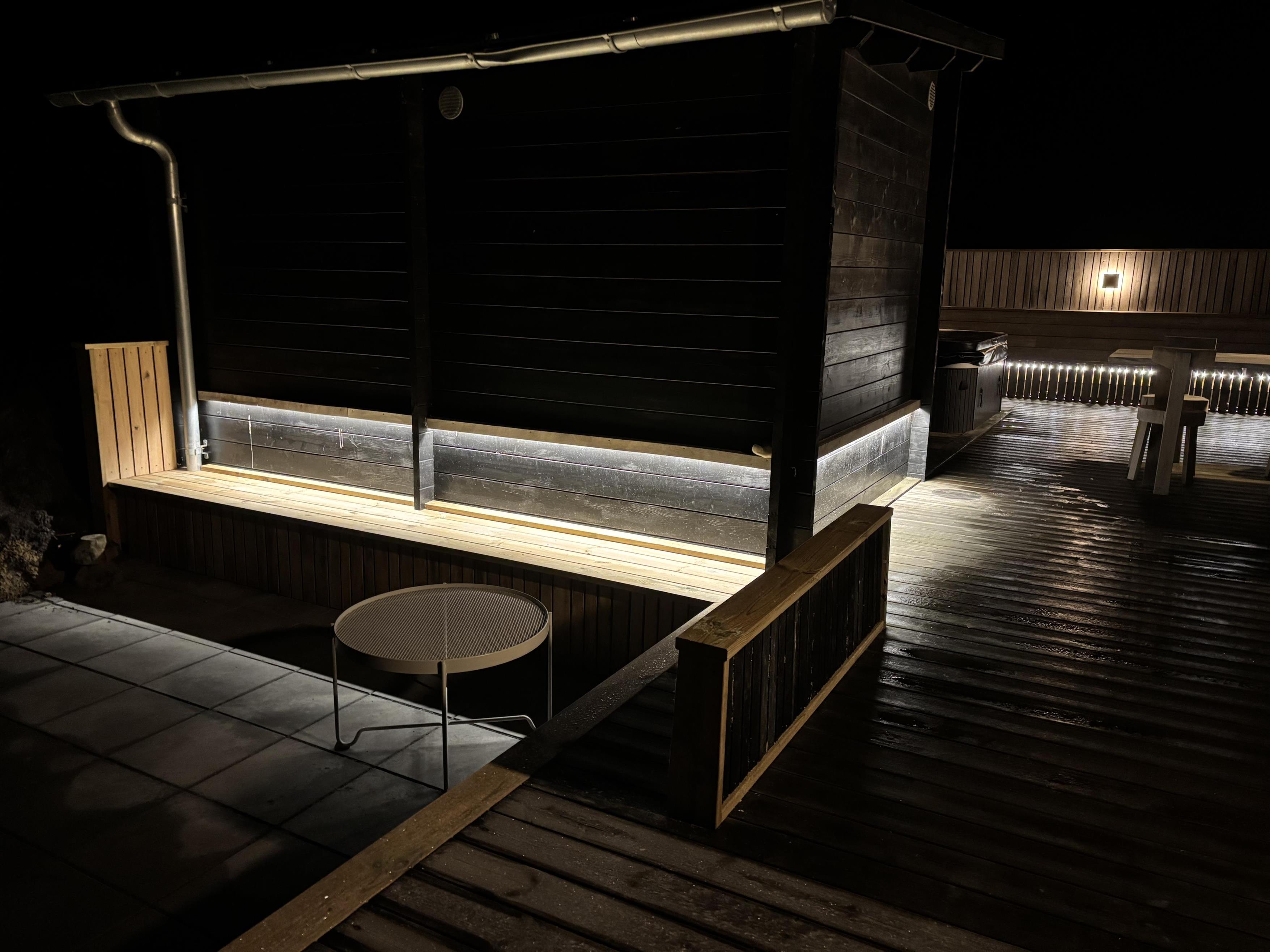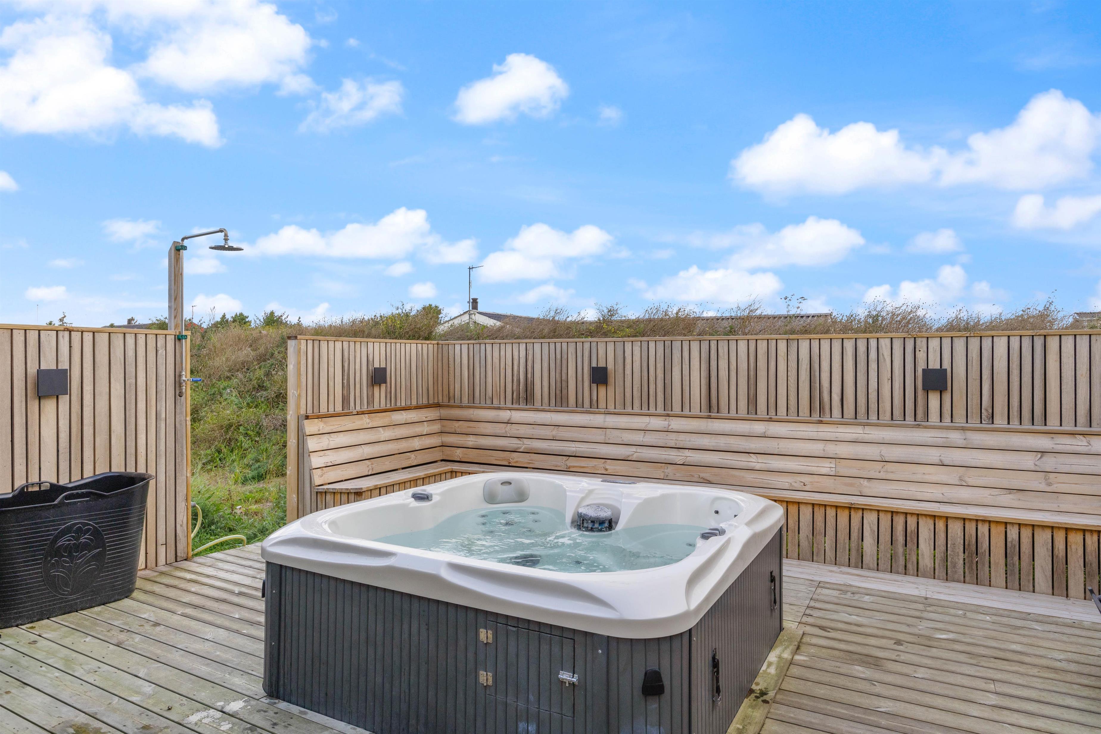 Rammerne er altså sat for en ferie med masser af wellness og velvære. Ikke mindst på den store terrasse, hvor et 5 pers-udendørs spabad og en sauna står klar til at give jer de skønneste, afslappende ferieoplevelser. Efter en tur i udespaen eller saunaen kan I skylle jer under den udendørs bruser.