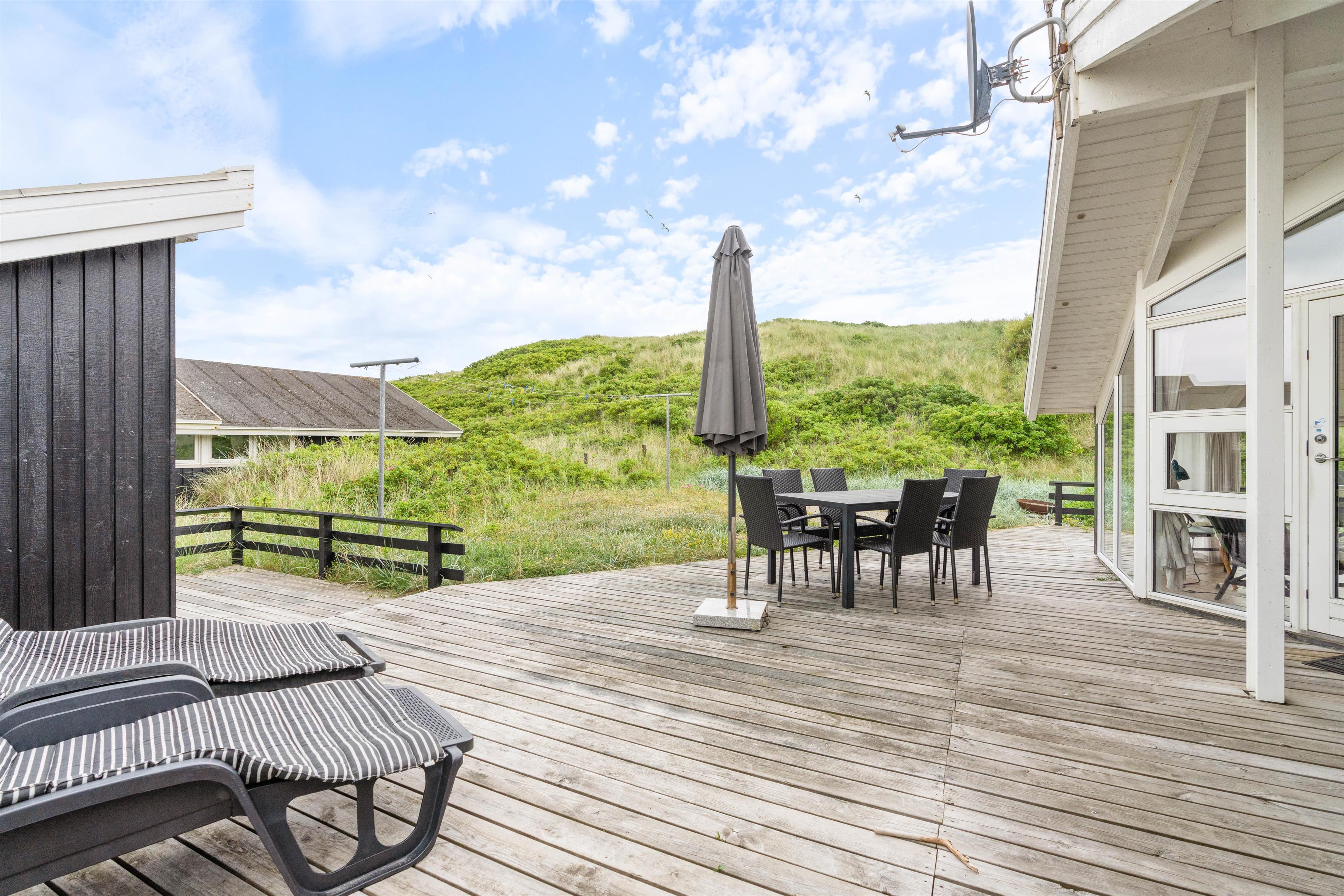 Ved den yderste klit, og med stranden i baghaven, finder I dette dejlige feriehus med lys og indbydende indretning. Her er 4 soveværelser og plads til 6 personer. Feriehuset fremstår overalt lys og indbydende, mens I udenfor mod vest og syd har I en dejlig terrasse, hvor I kan nyde sommervejret.
