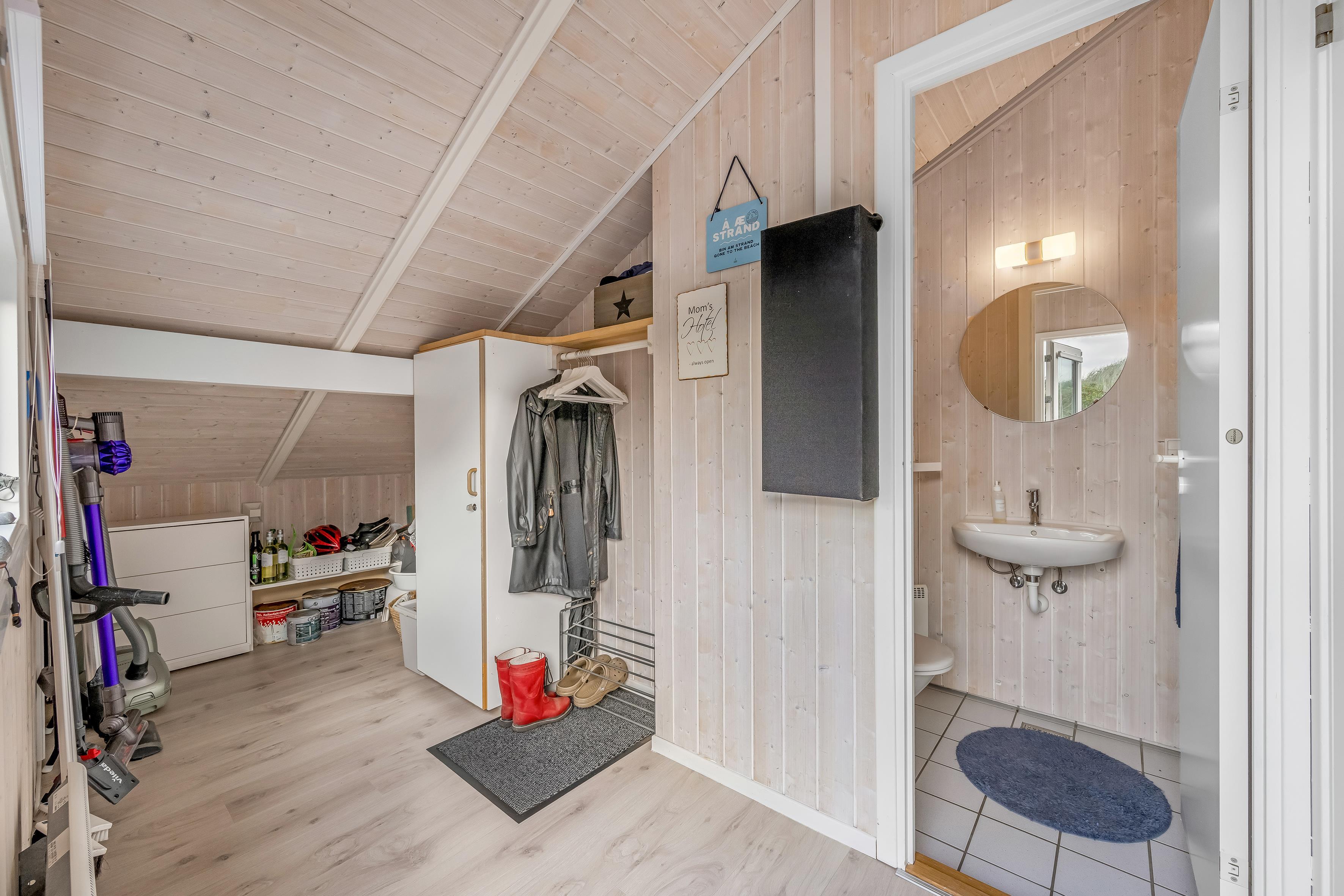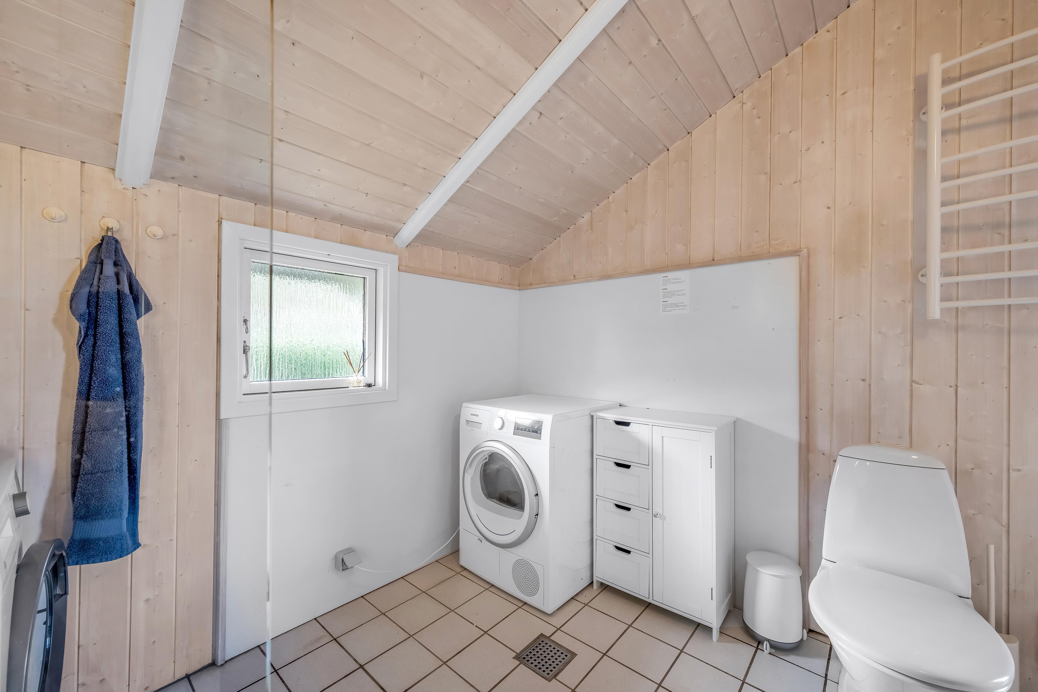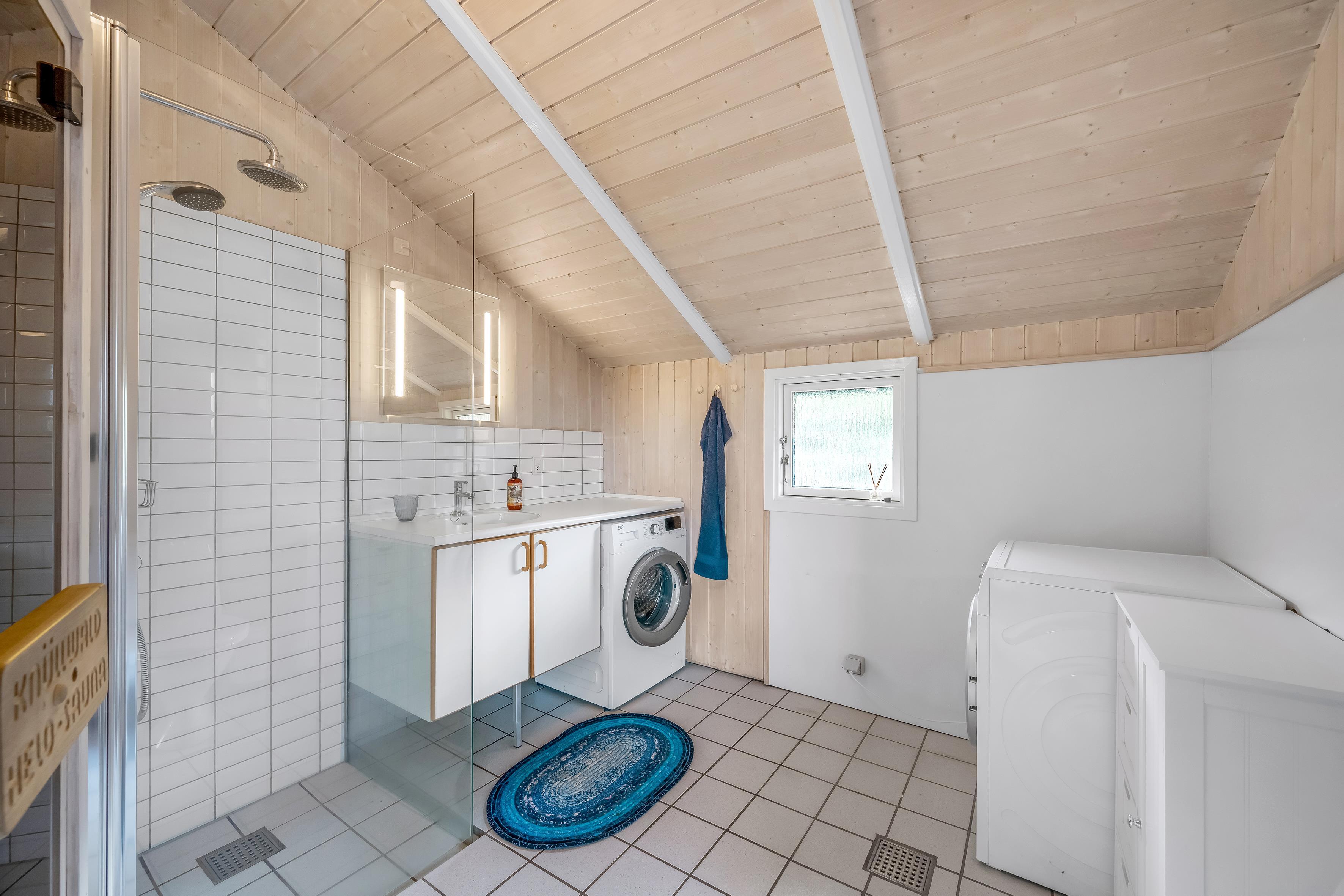Hverdagen er gjort enkel: Køkkenet er udstyret med opvaskemaskine, så der er mere tid til fælles stunder og mindre tid ved opvasken. Derudover står både vaskemaskine og tørretumbler til rådighed – særligt praktisk, når håndklæder eller tøj skal friskes op efter en strandtur. Badeværelset har gulvvarme, som giver ekstra komfort, og et gæstetoilet sørger for, at morgenrutinerne bliver lettere og mere ubekymrede.