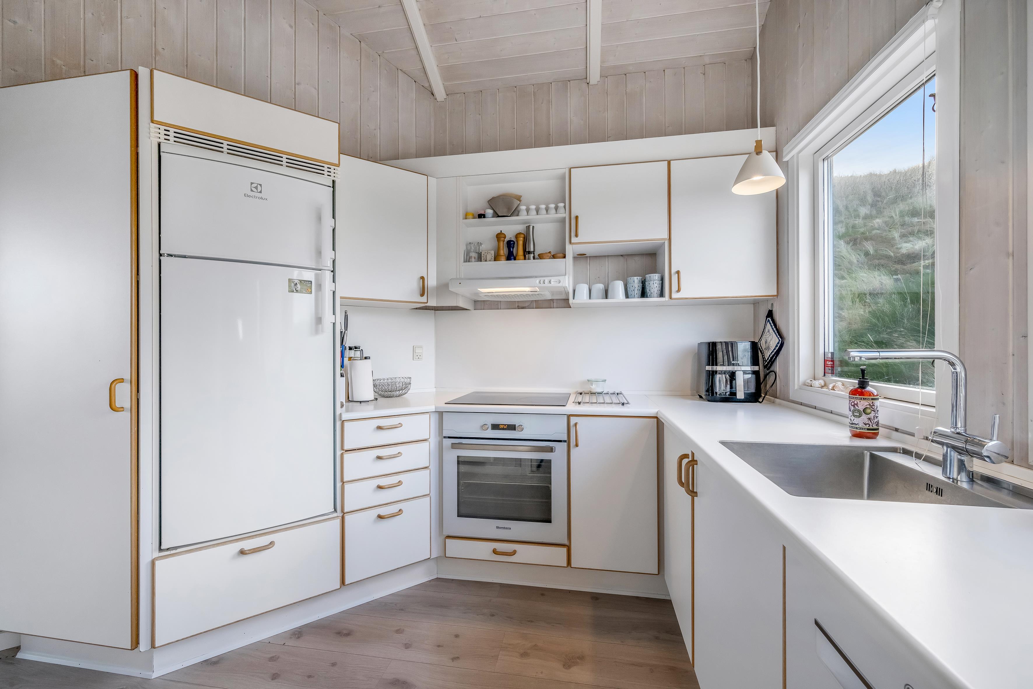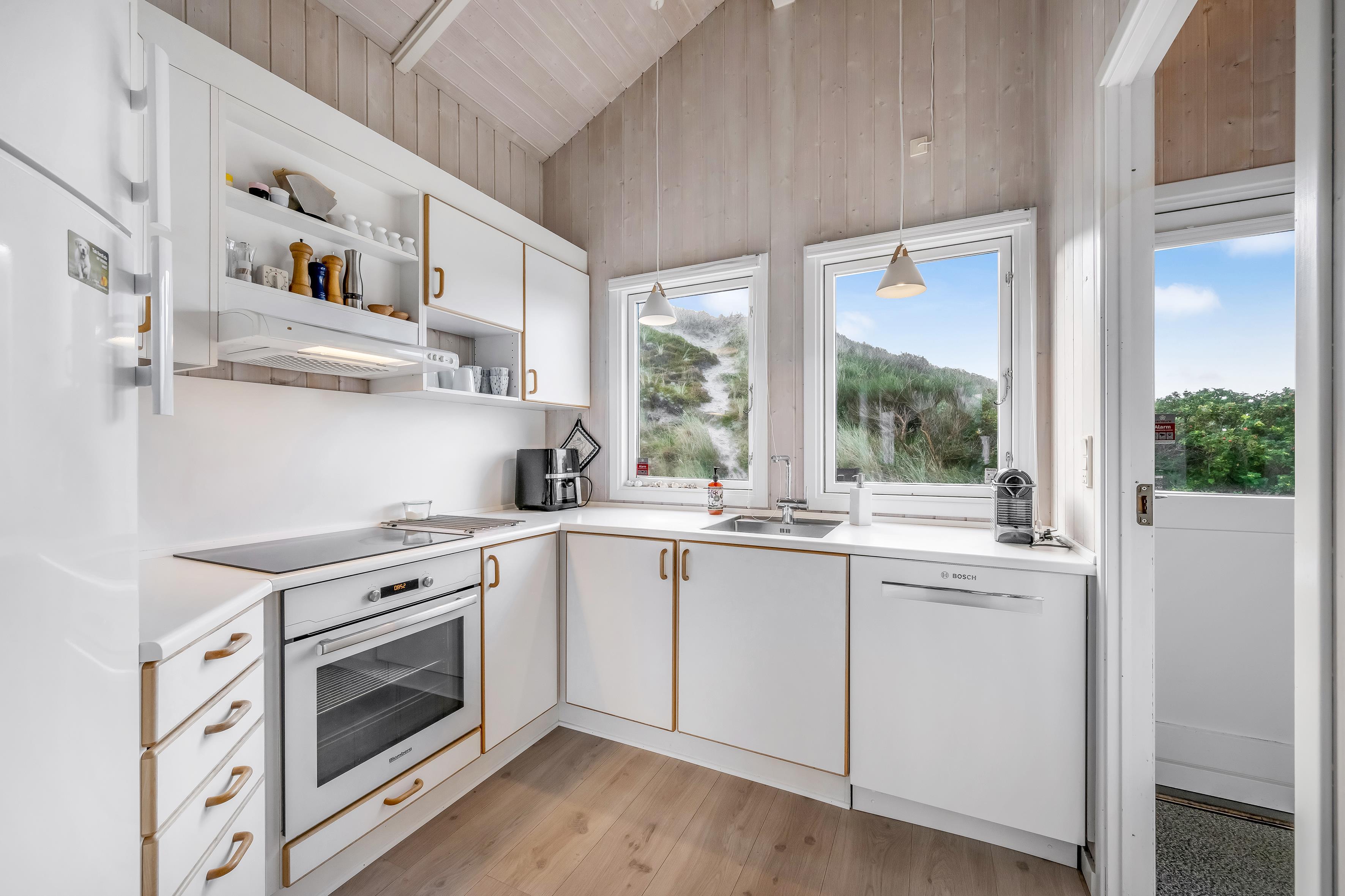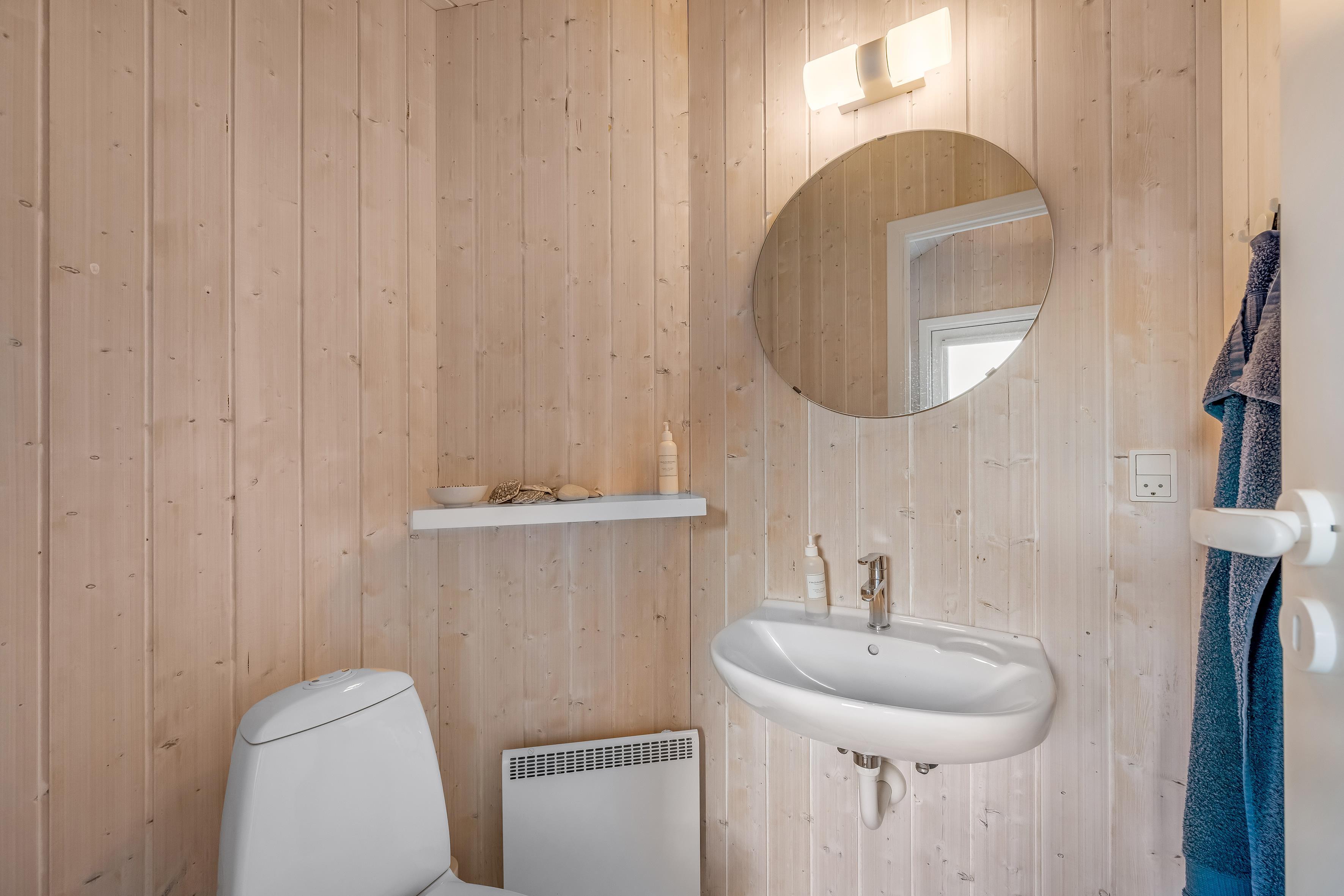 Hverdagen er gjort enkel: Køkkenet er udstyret med opvaskemaskine, så der er mere tid til fælles stunder og mindre tid ved opvasken. Derudover står både vaskemaskine og tørretumbler til rådighed – særligt praktisk, når håndklæder eller tøj skal friskes op efter en strandtur. Badeværelset har gulvvarme, som giver ekstra komfort, og et gæstetoilet sørger for, at morgenrutinerne bliver lettere og mere ubekymrede.
