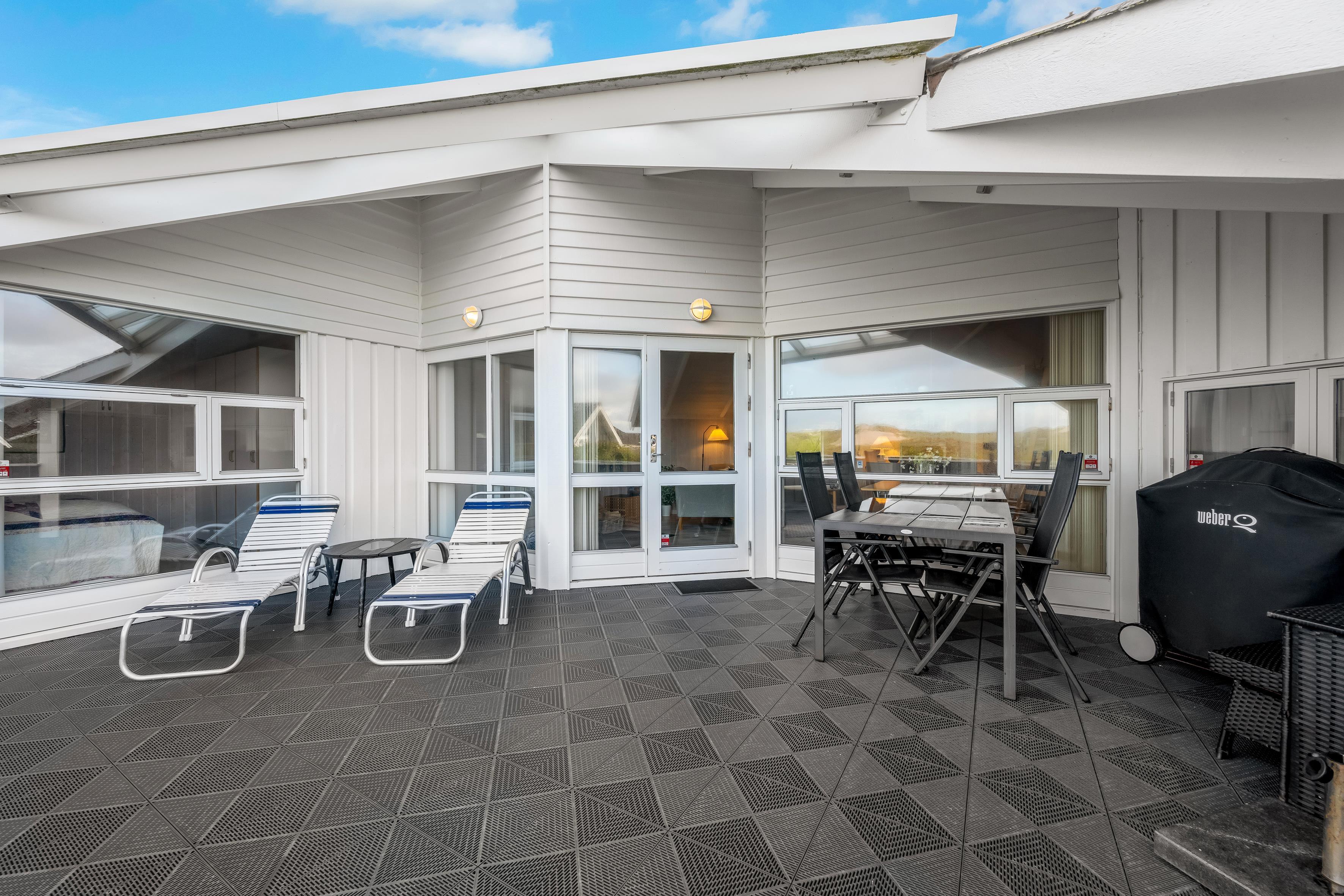 Udenfor venter et roligt fristed under åben himmel: Feriehuset ligger på en naturgrund og har en afskærmet terrasse, der både er lukket og overdækket. Det giver ekstra privatliv, læ for vinden og gode muligheder for at nyde den friske luft. Terrassen indbyder også til at nyde morgenmaden i solens første stråler eller lange aftener med varme drikke, når dagen ved stranden er ved at gå på hæld. Og med kun 800 meter til indkøb er det nemt at være spontan med dagens menu.