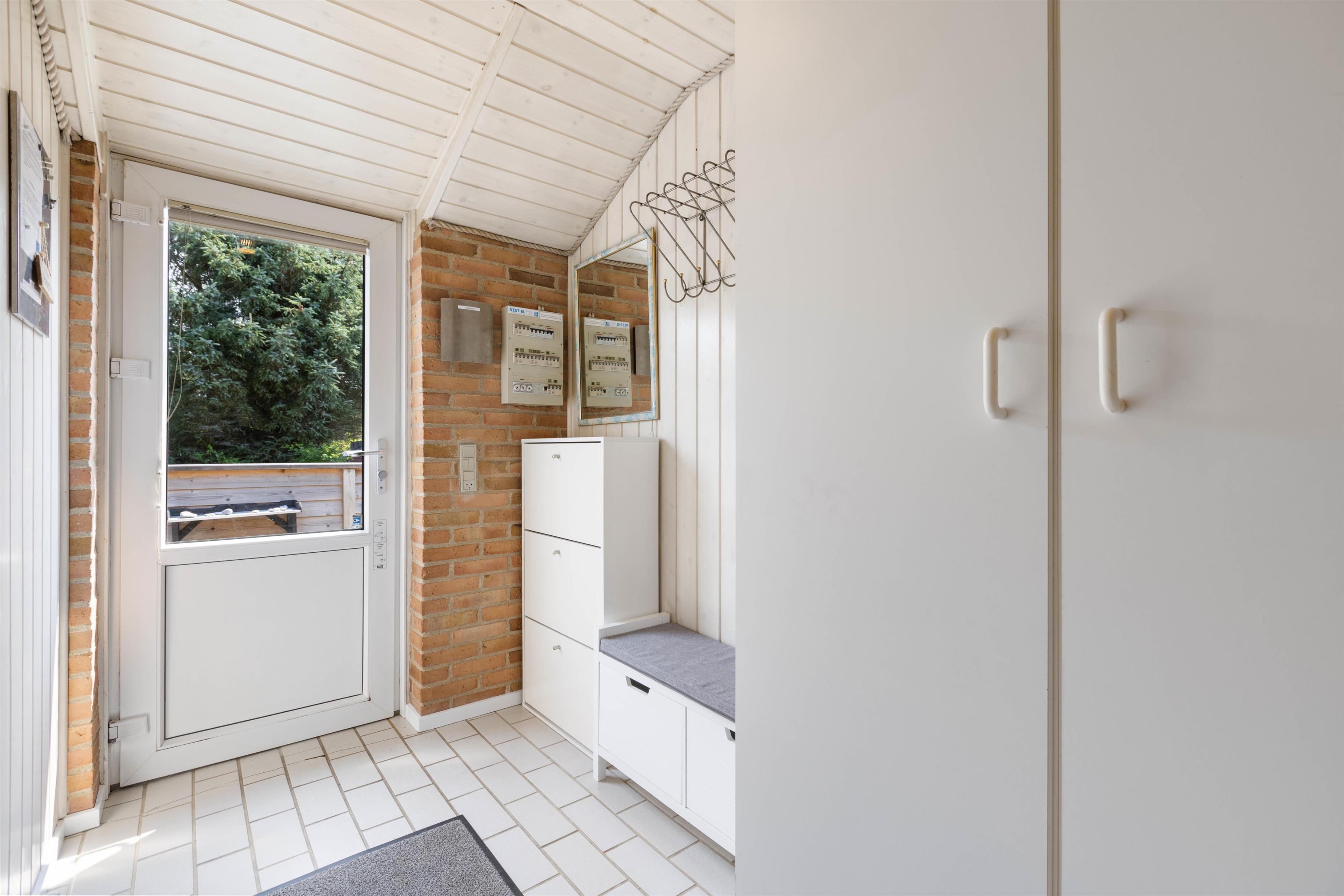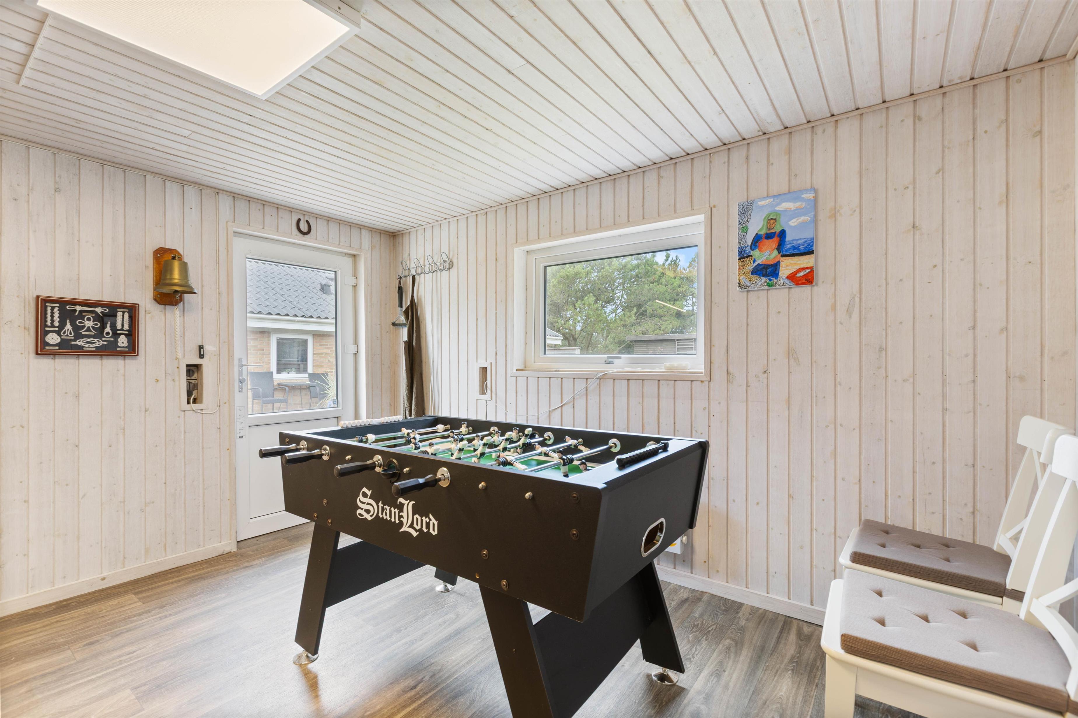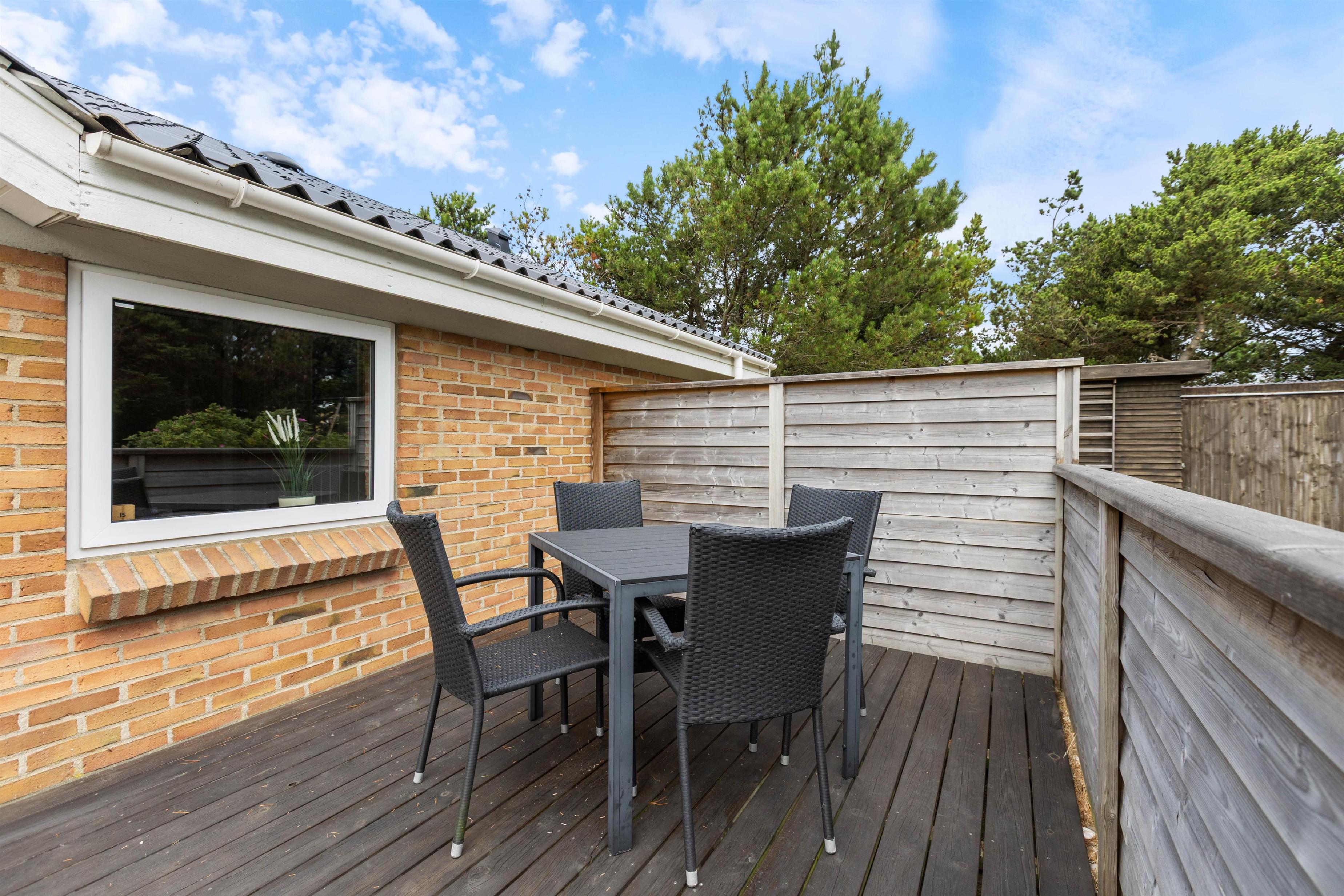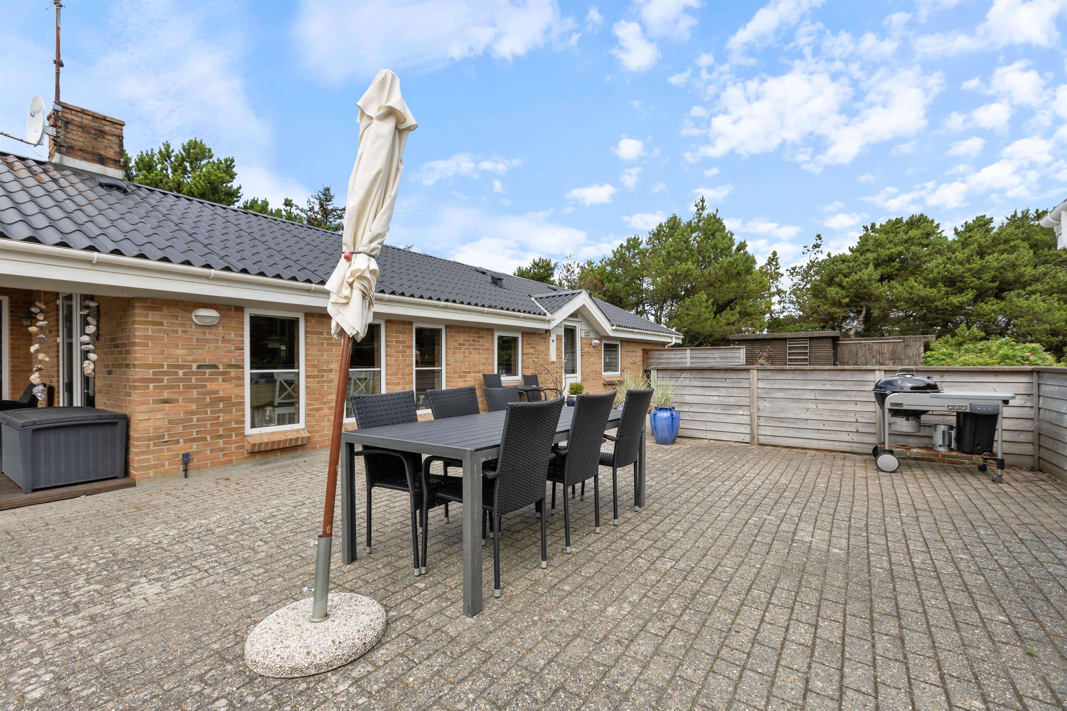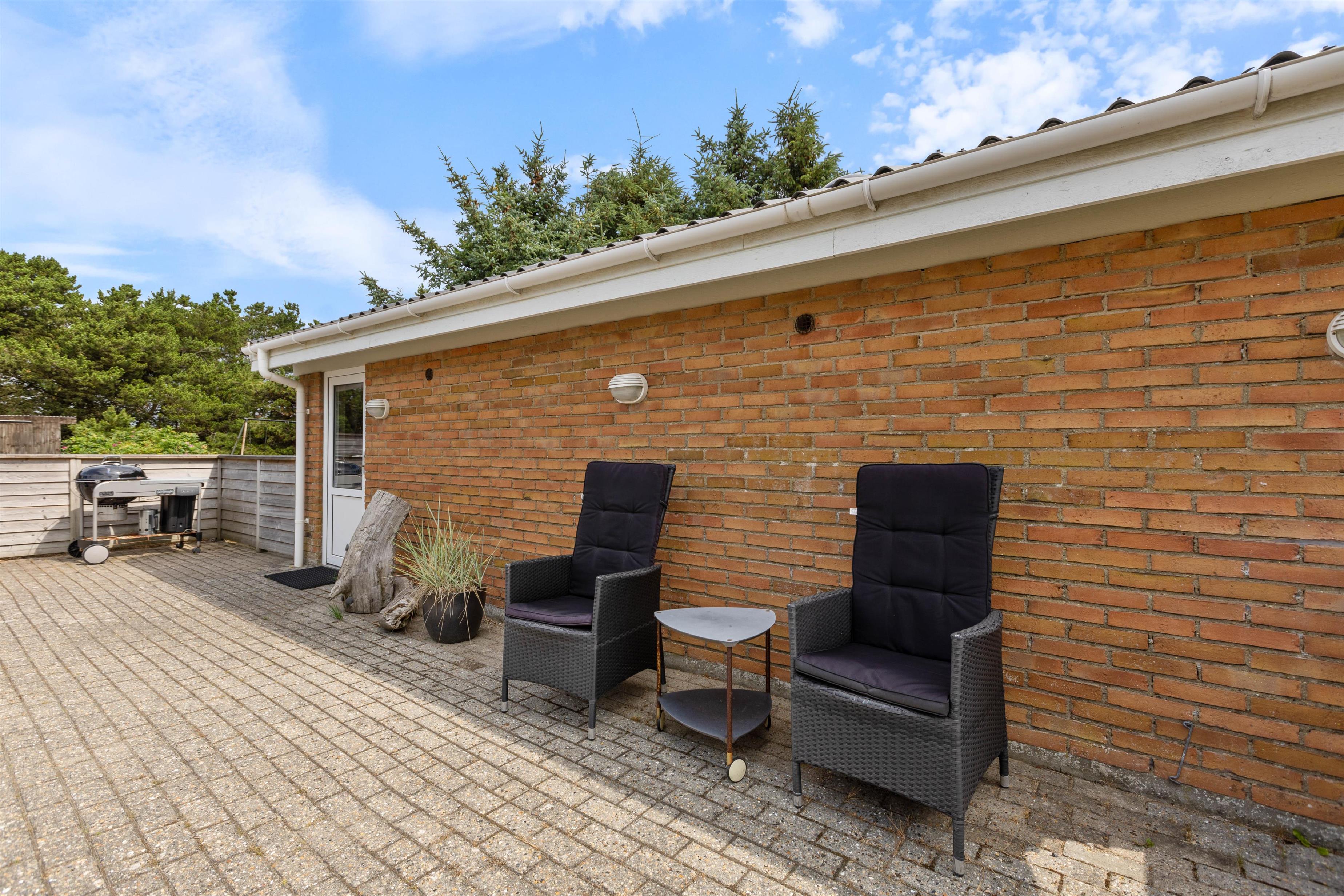 På sommerhusets store afskærmede terrasse som former en gårdhave kan I sidde i læ og nyde en dejlig kop kaffe eller nyde aftensmaden selvlavet på feriehusets egen grill. Her kan hunde frit løbe rundt, da terrassen er lukket. I garagen kan I finde et aktivitetsrum med bordfodbold, bordtennisbord, dart og mere til alle aldre.