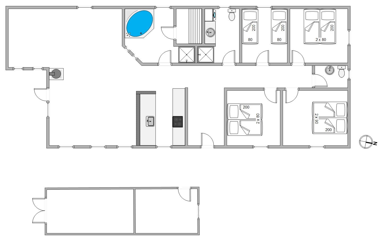 Feriehuset rummer et stort badeværelse med spa, bruser og sauna samt et gæstetoilet med bruser.