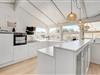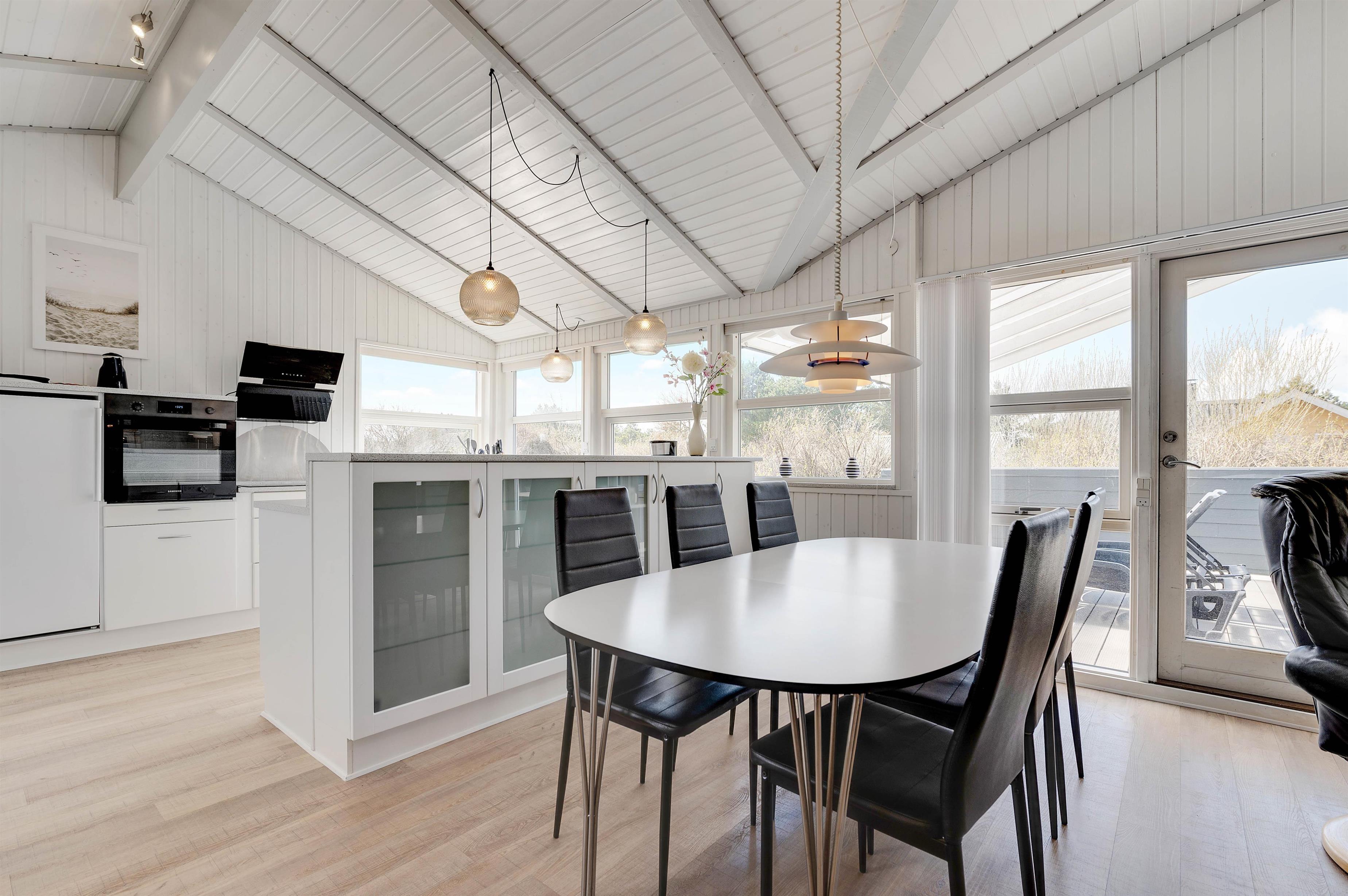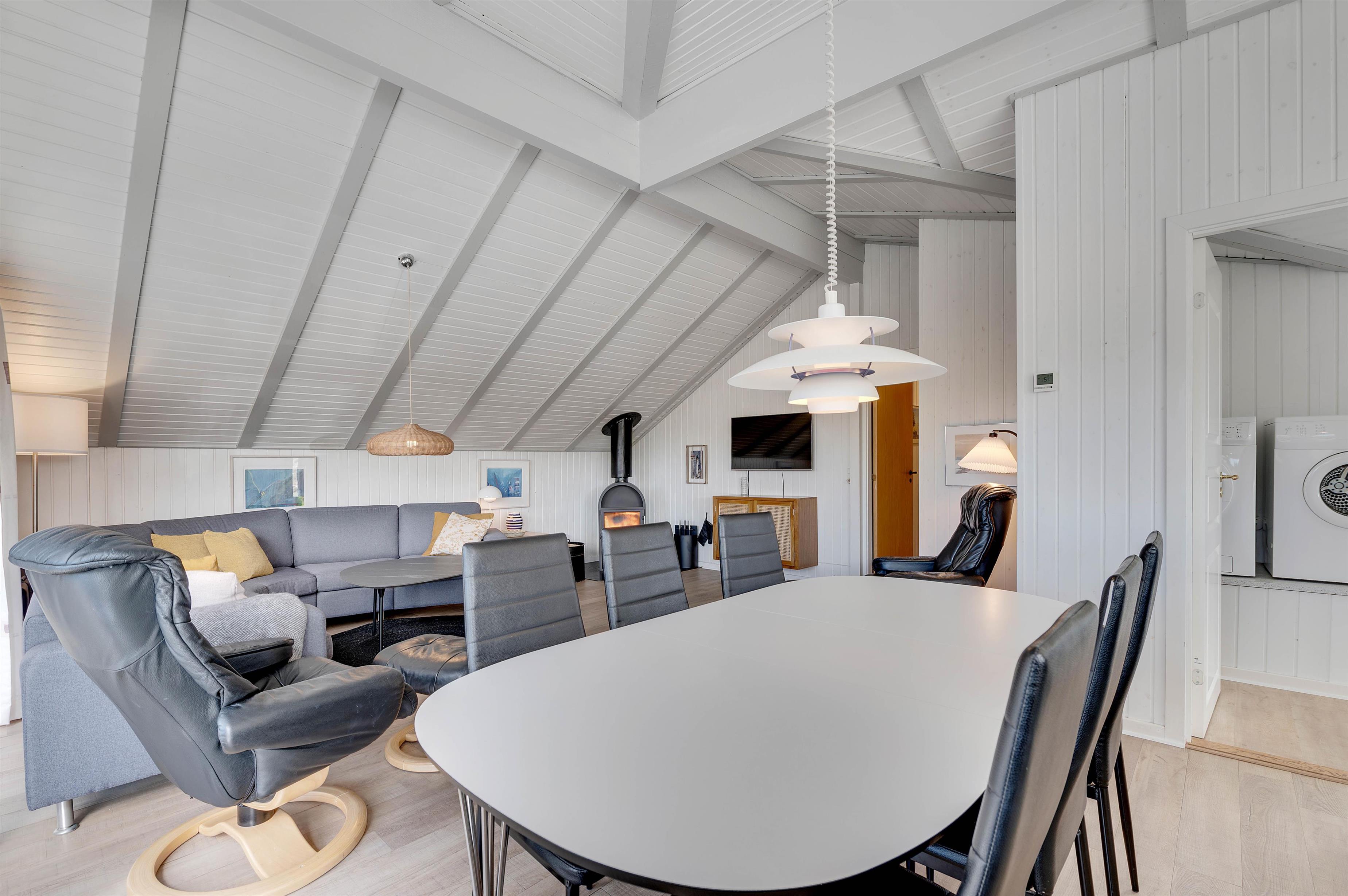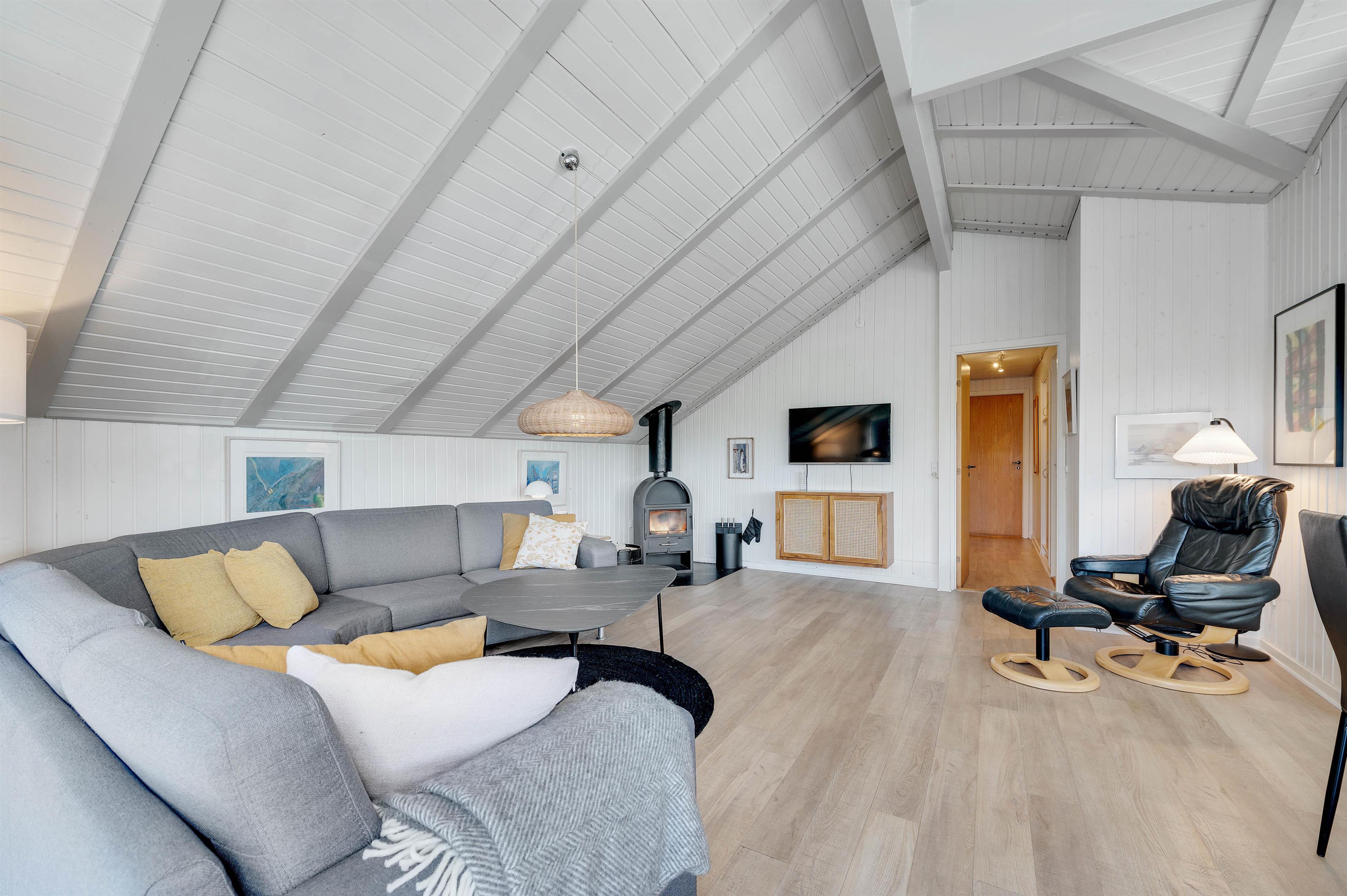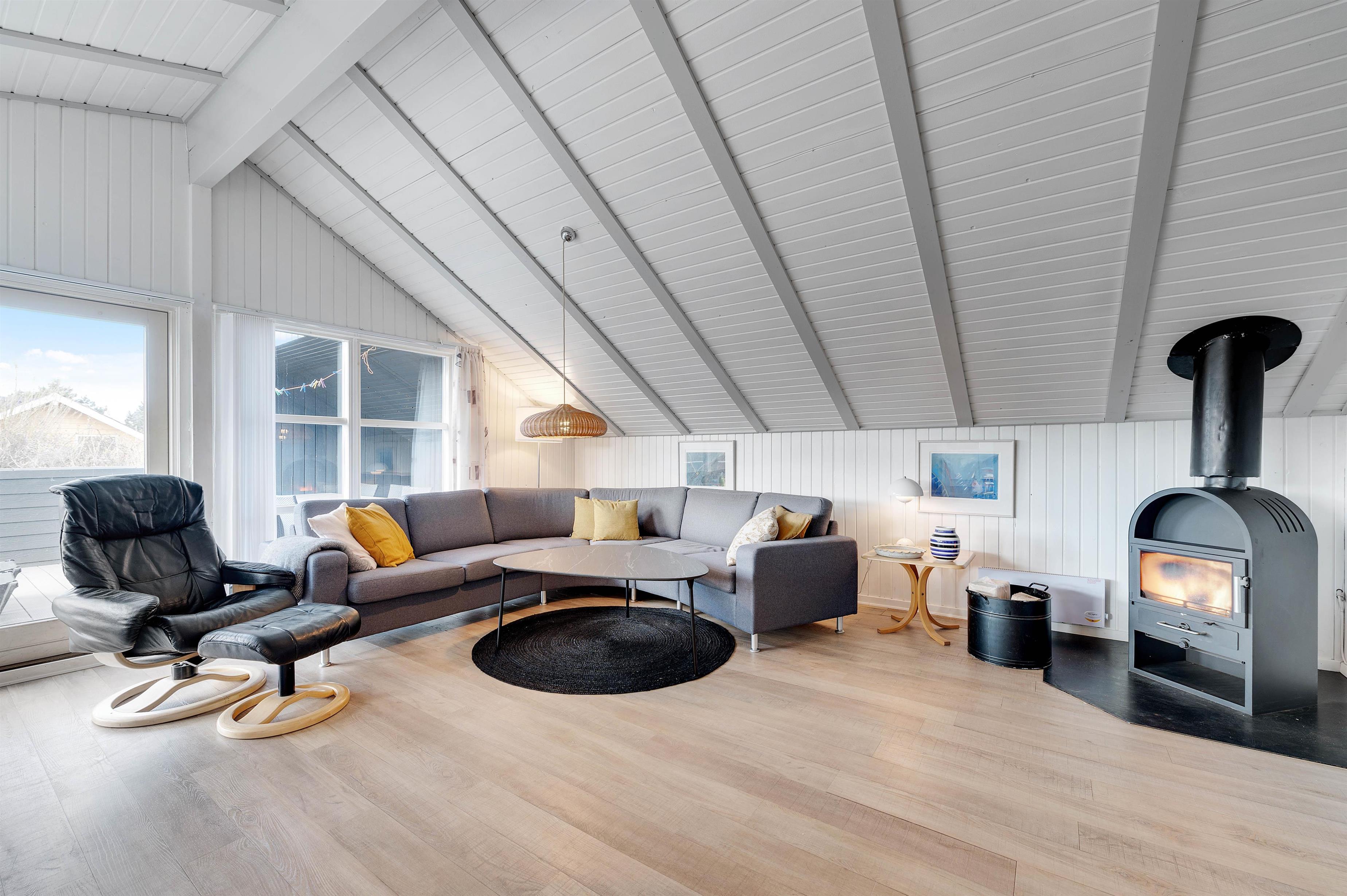 Feriehusets hjerte er det store køkken i åben forbindelse med stuen. Her er opvaskemaskine, mikroovn og køleskab med lille frostboks. Stuen har nydelige møbler, brændeovn og fjernsyn. Desuden er der gratis trådløst internet.