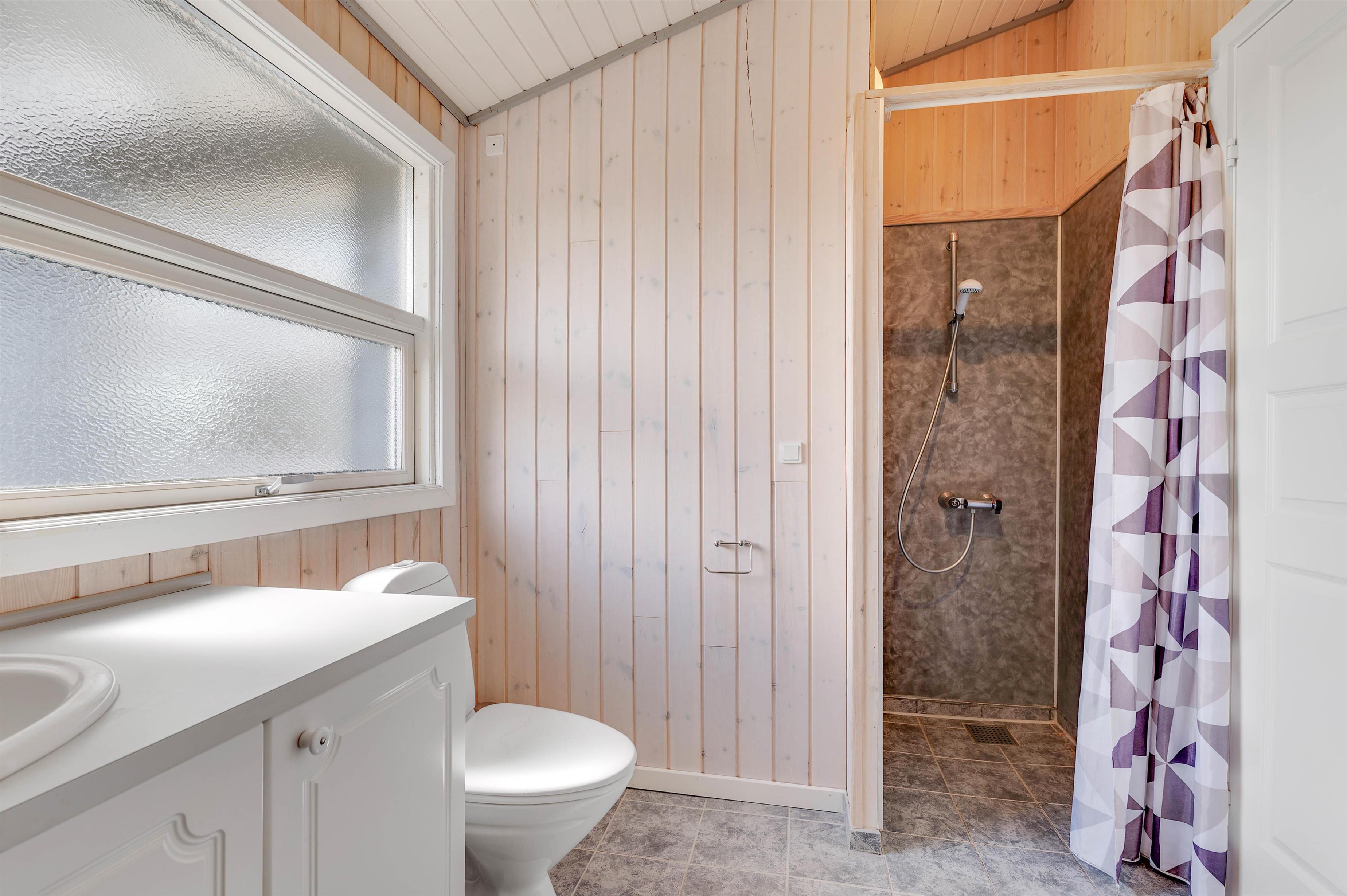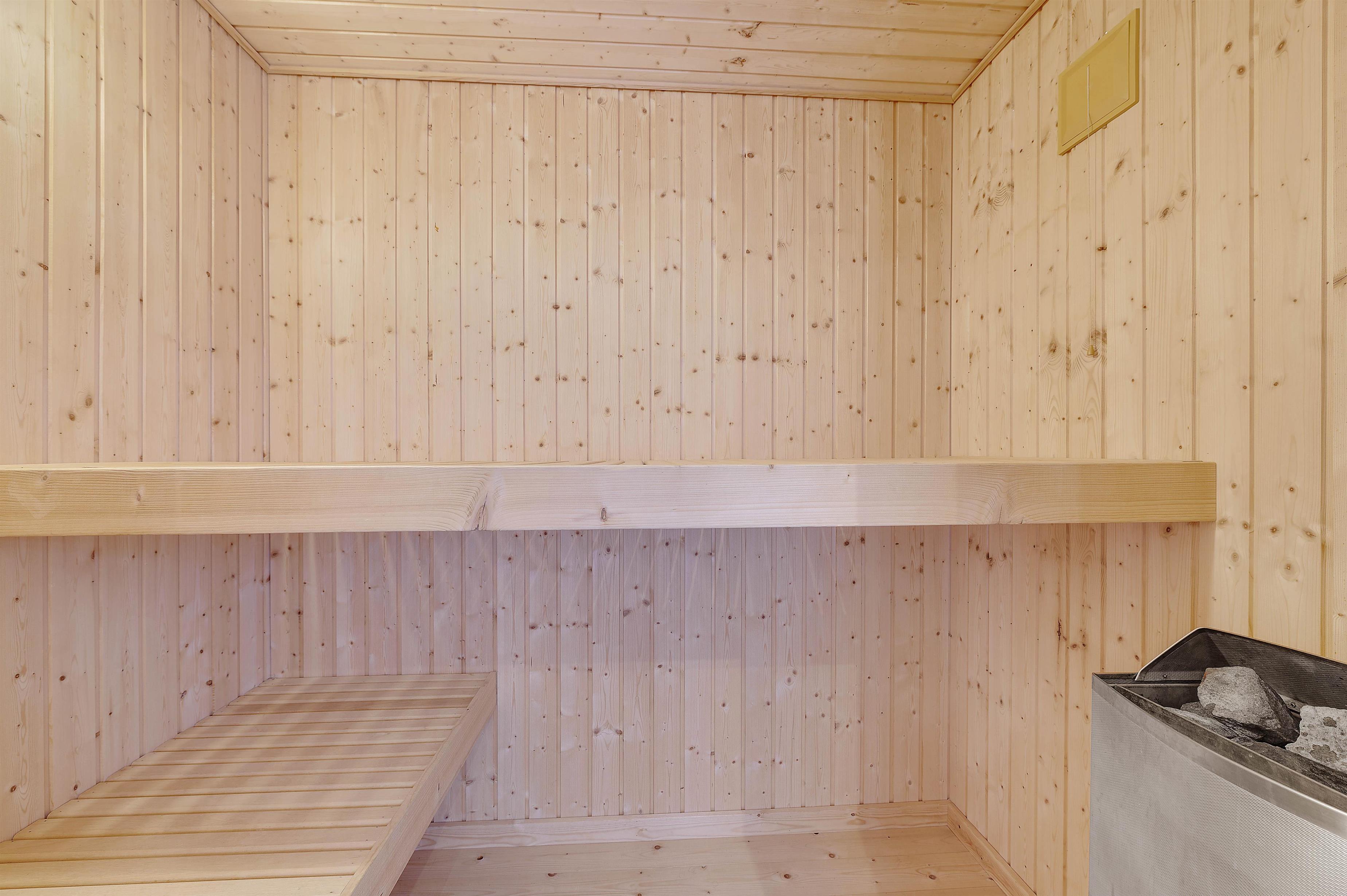 Der er et stort og pænt badeværelse med bruseniche og gulvvarme samt adgang til sauna med bænke i 2 niveauer.