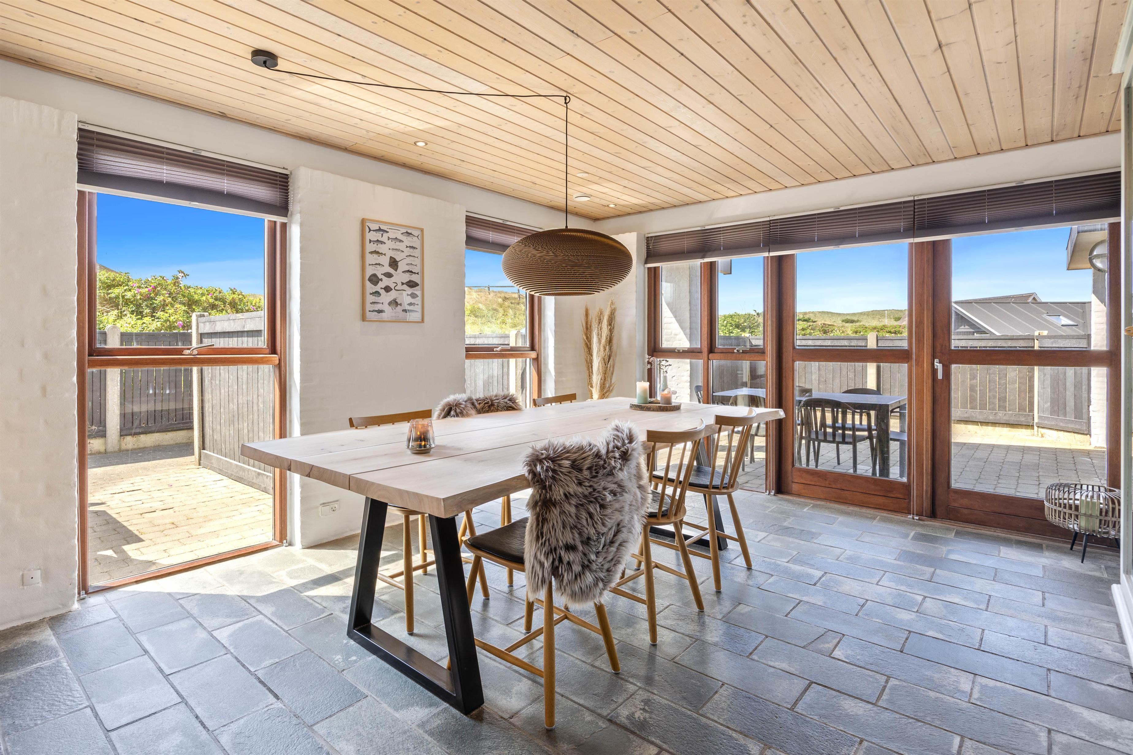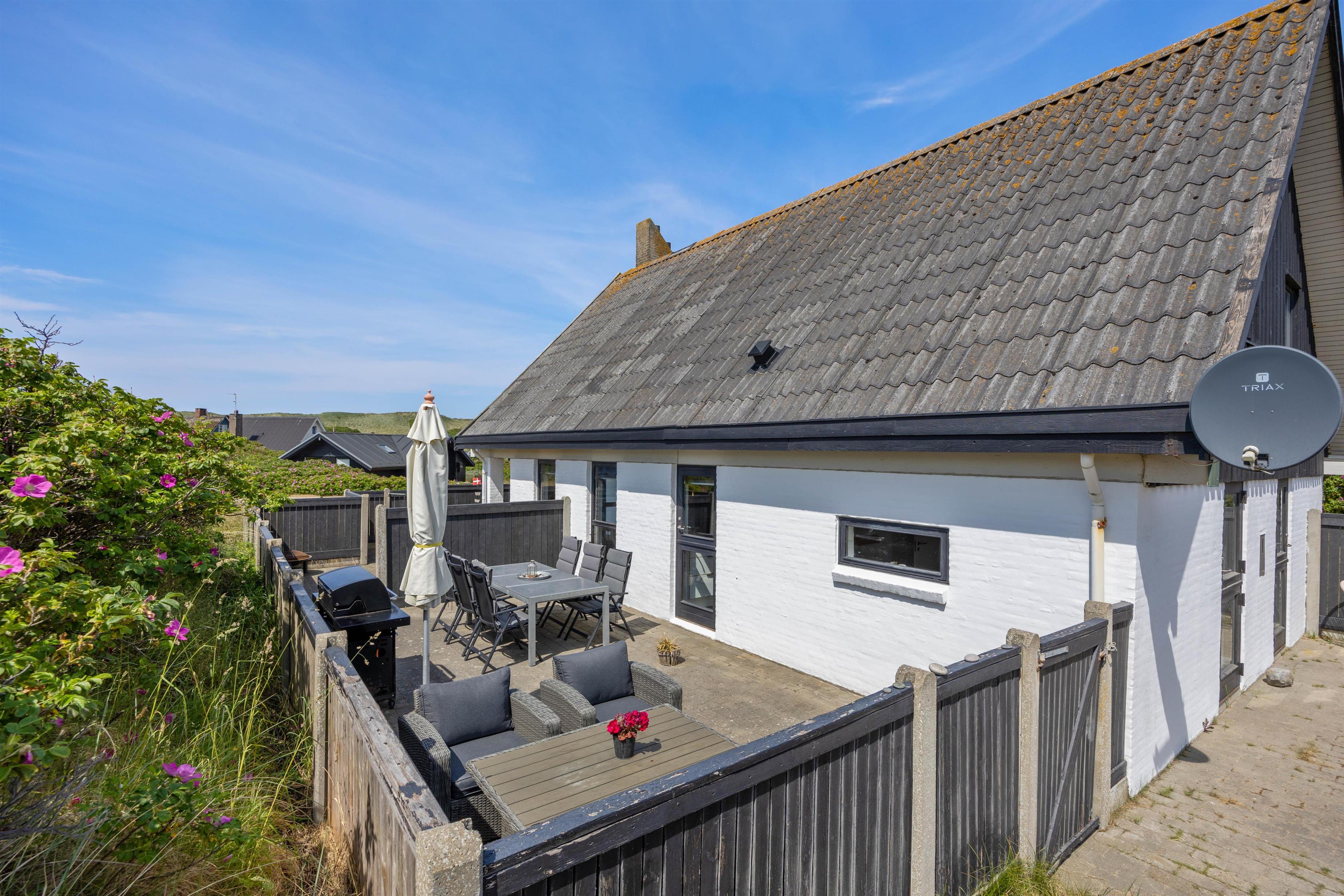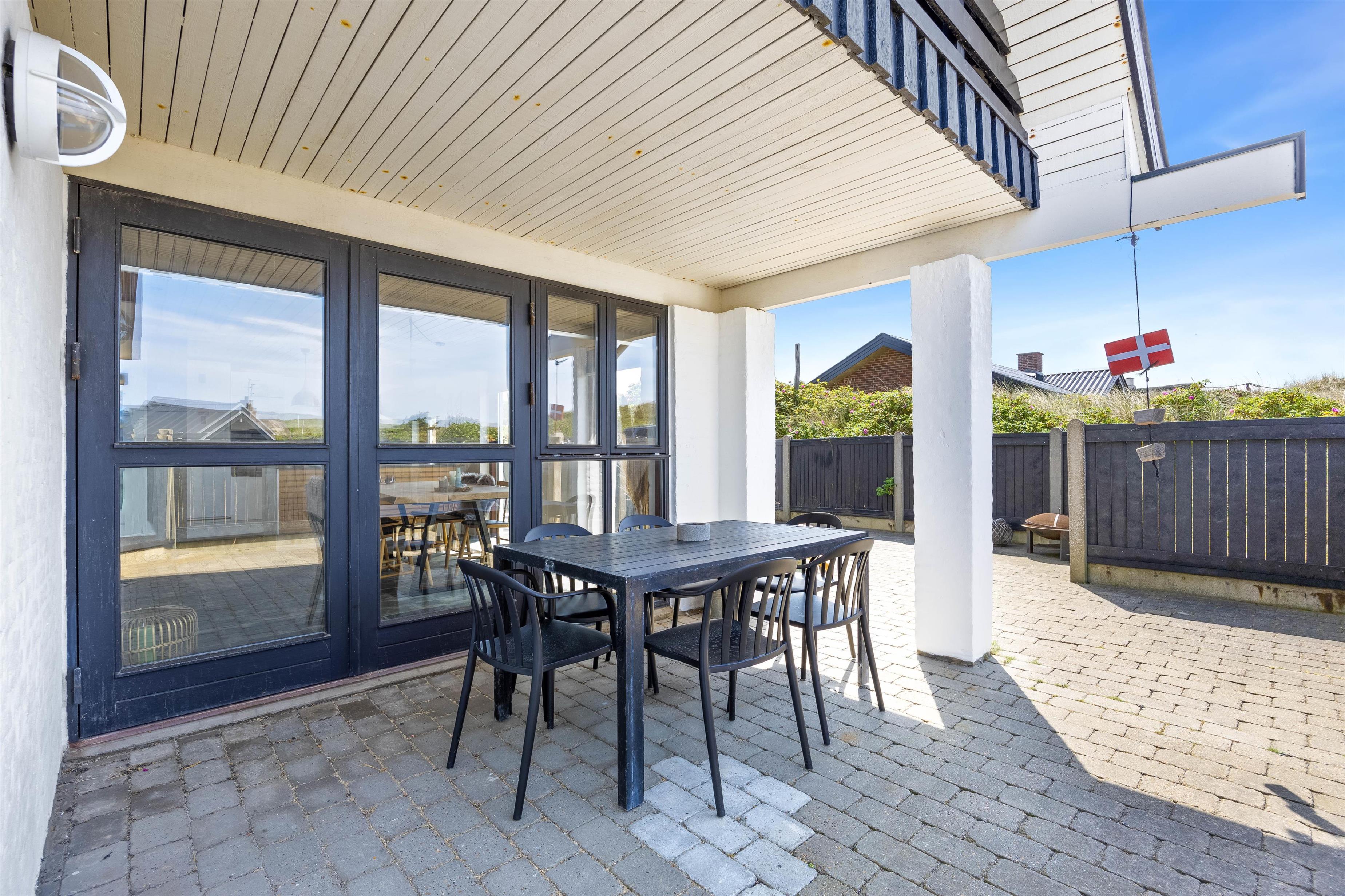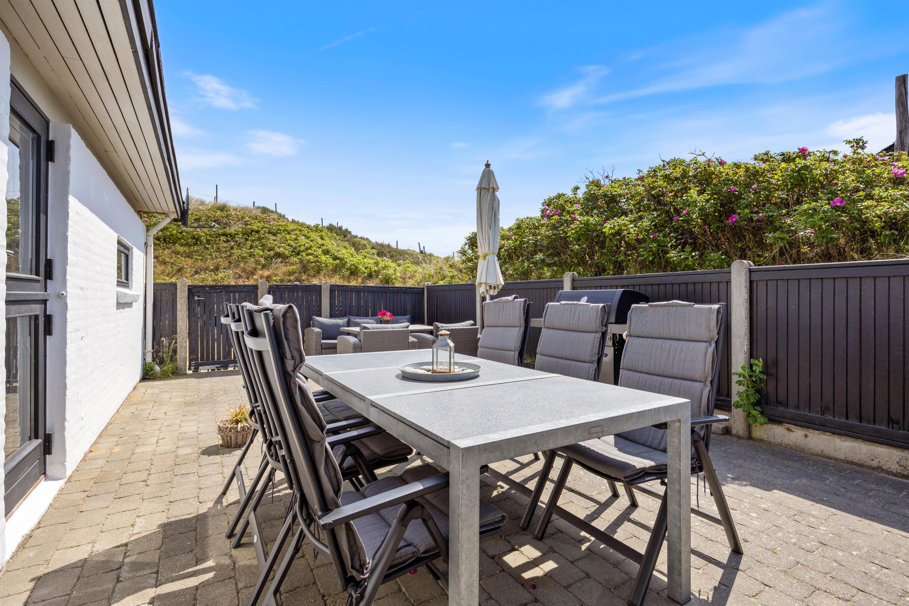 Den lukkede terrasse er ganske enkelt enestående. Den er stor, har flere indvendige afskærmninger og byder på rig mulighed for både læ og privatliv. Ideel til familier med småbørn og hund. Fra både spisestue og terrassen er der en vidunderlig udsigt til det smukke landskab med hede og klitter. Der er kun 200 meter til hav og strand.