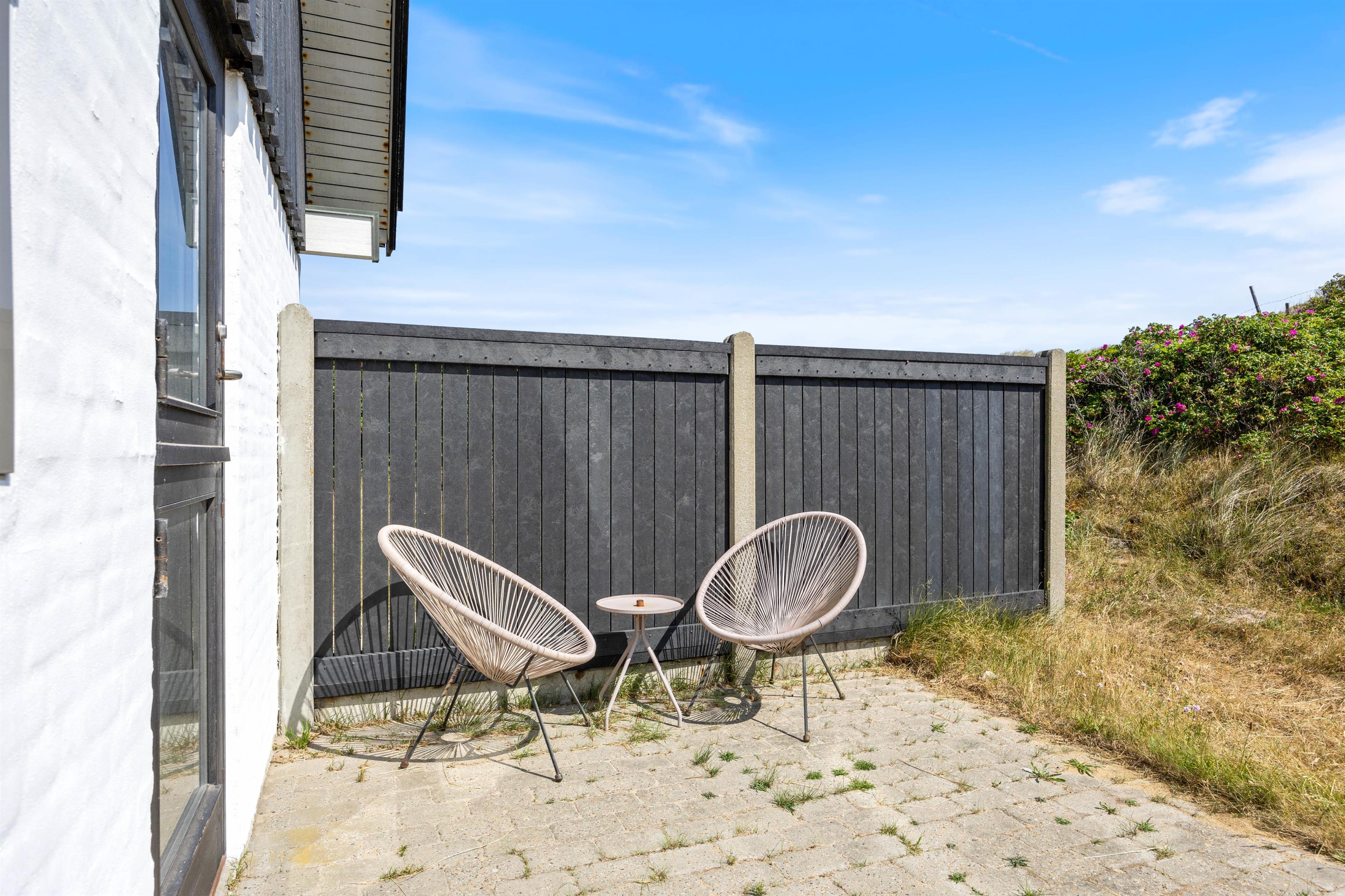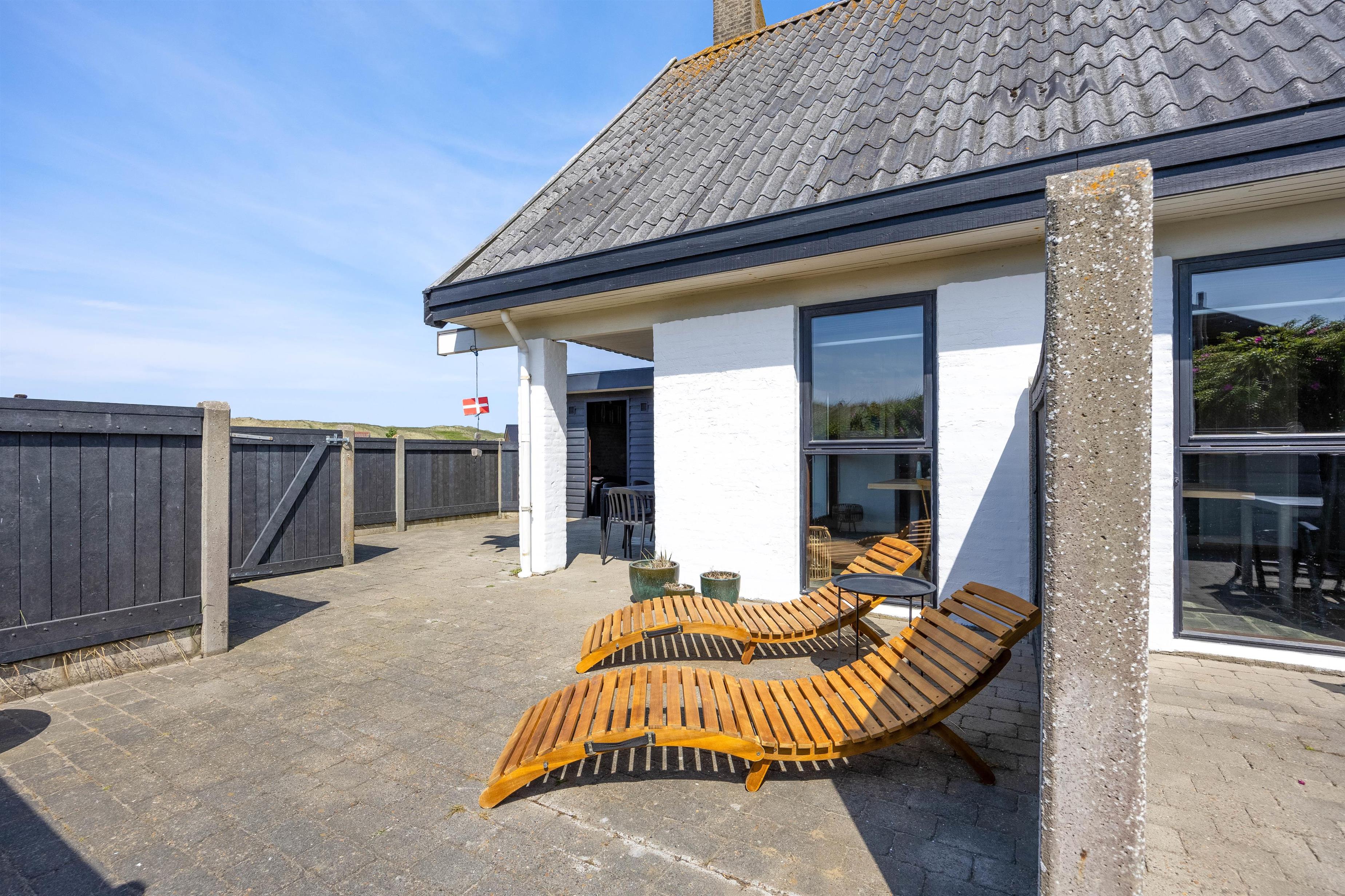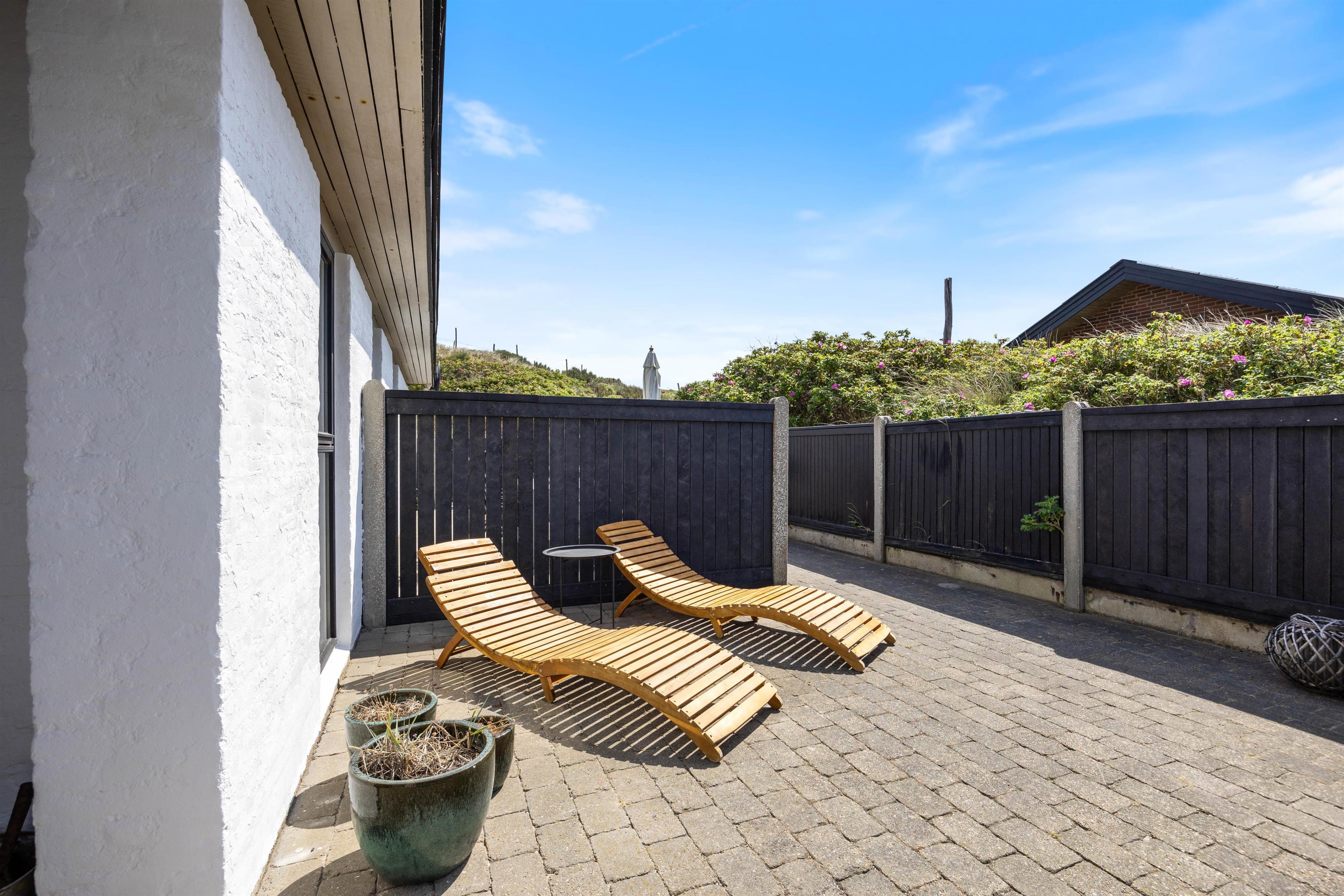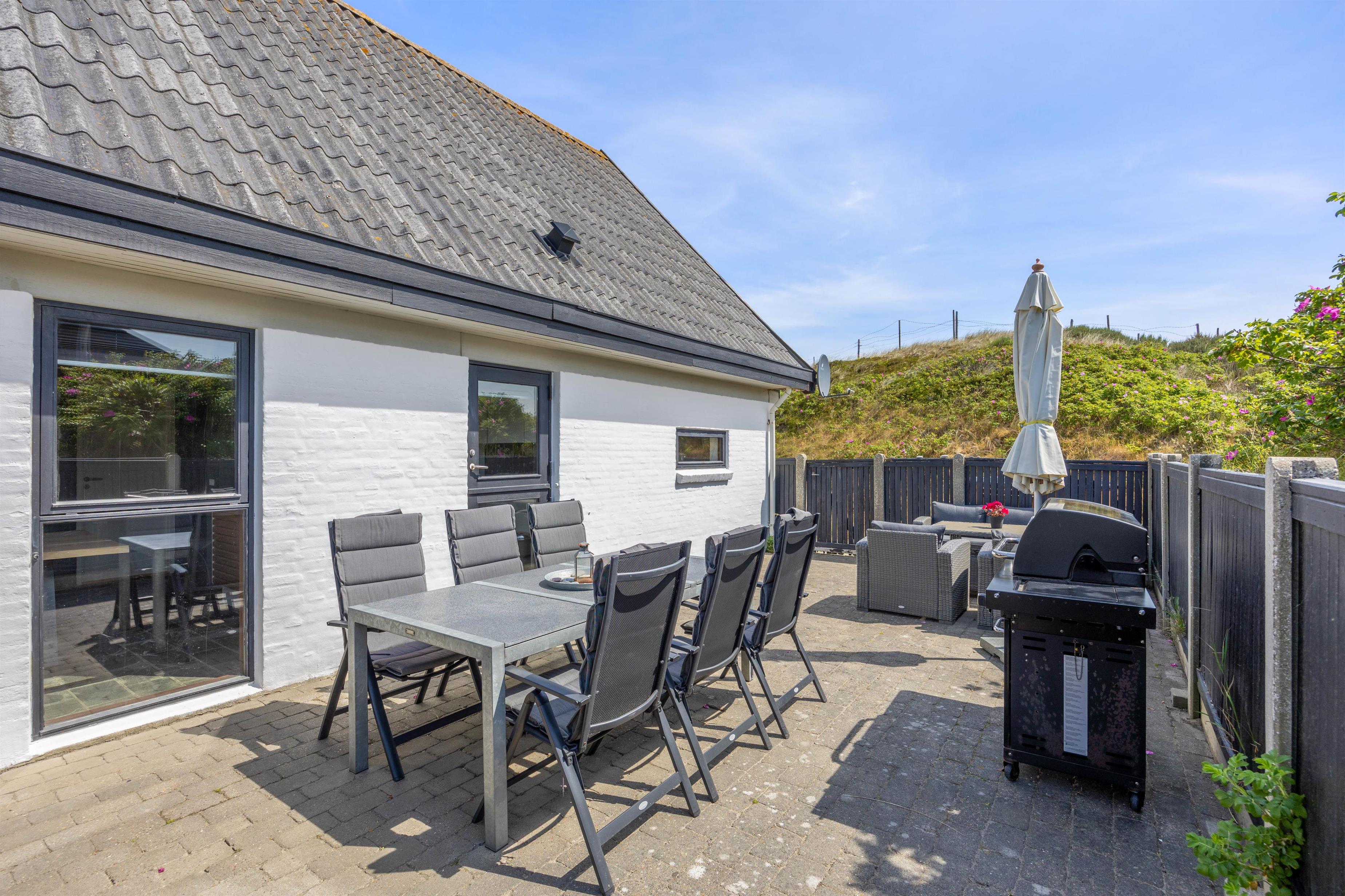 Den lukkede terrasse er ganske enkelt enestående. Den er stor, har flere indvendige afskærmninger og byder på rig mulighed for både læ og privatliv. Ideel til familier med småbørn og hund. Fra både spisestue og terrassen er der en vidunderlig udsigt til det smukke landskab med hede og klitter. Der er kun 200 meter til hav og strand.