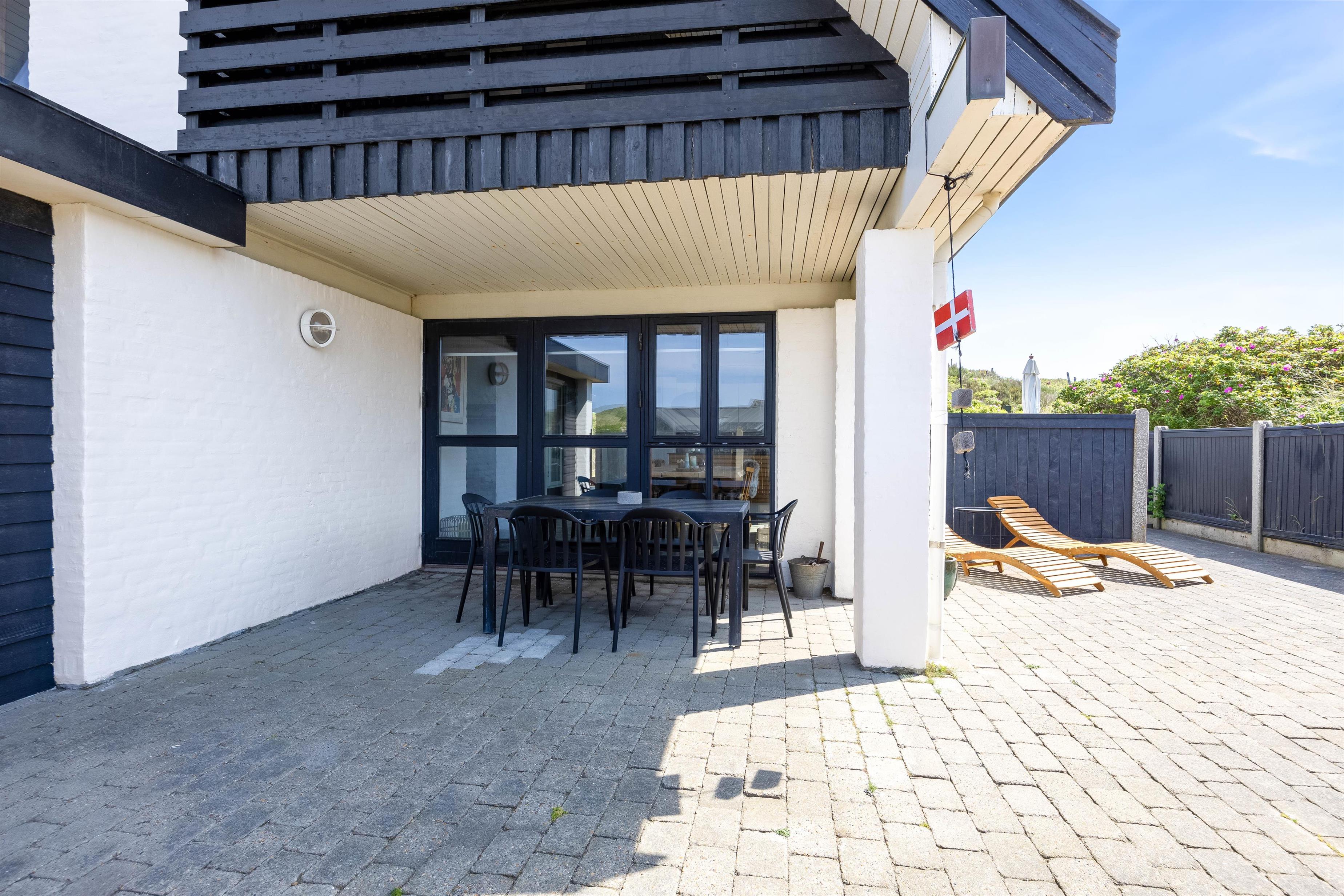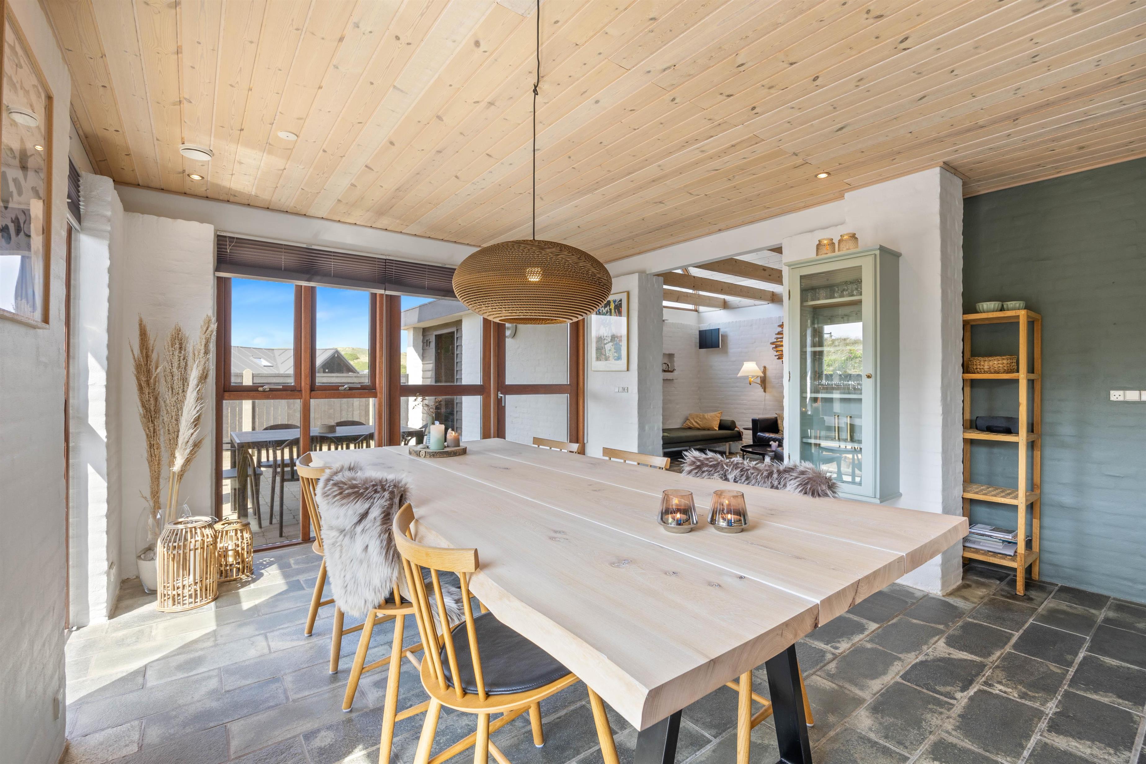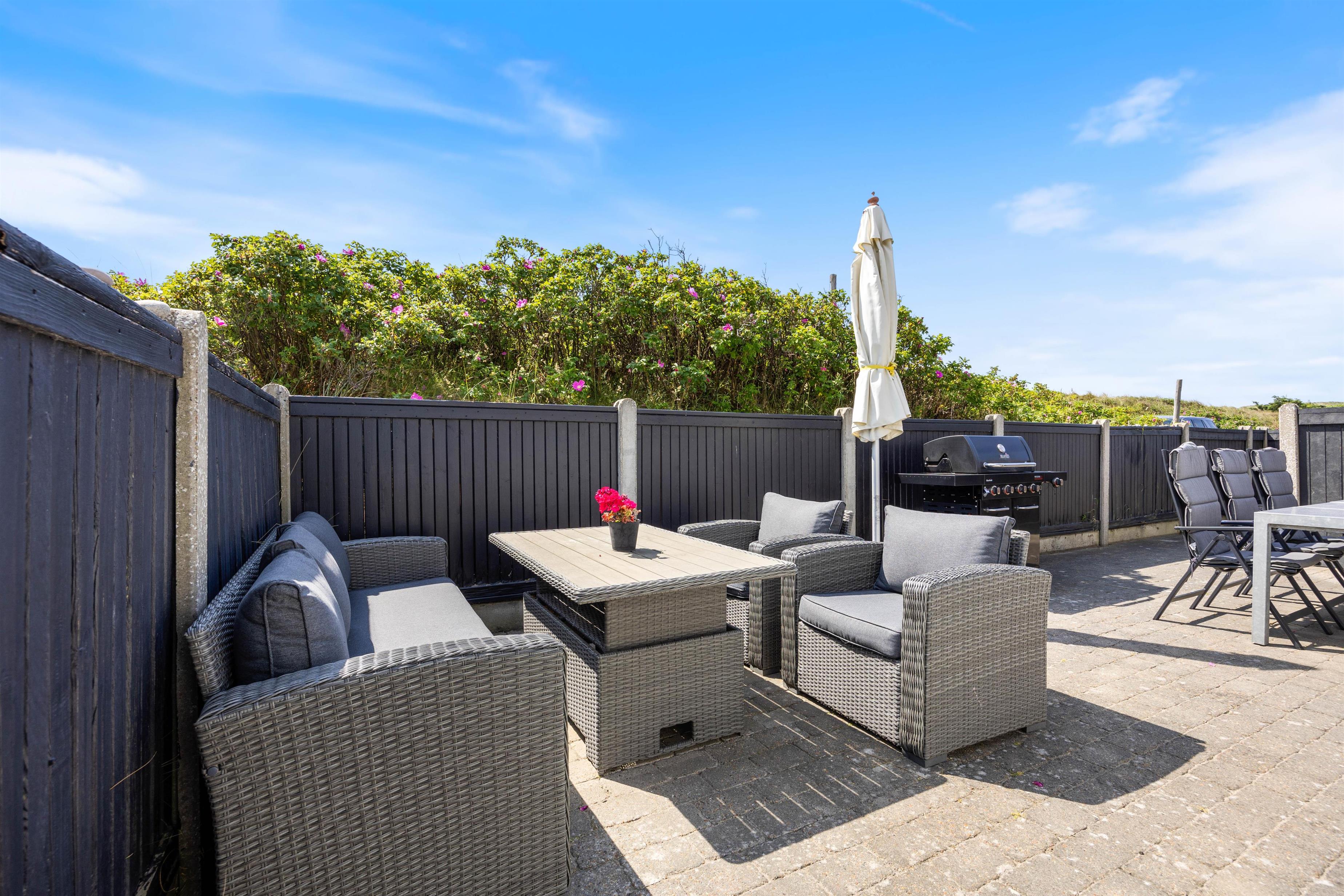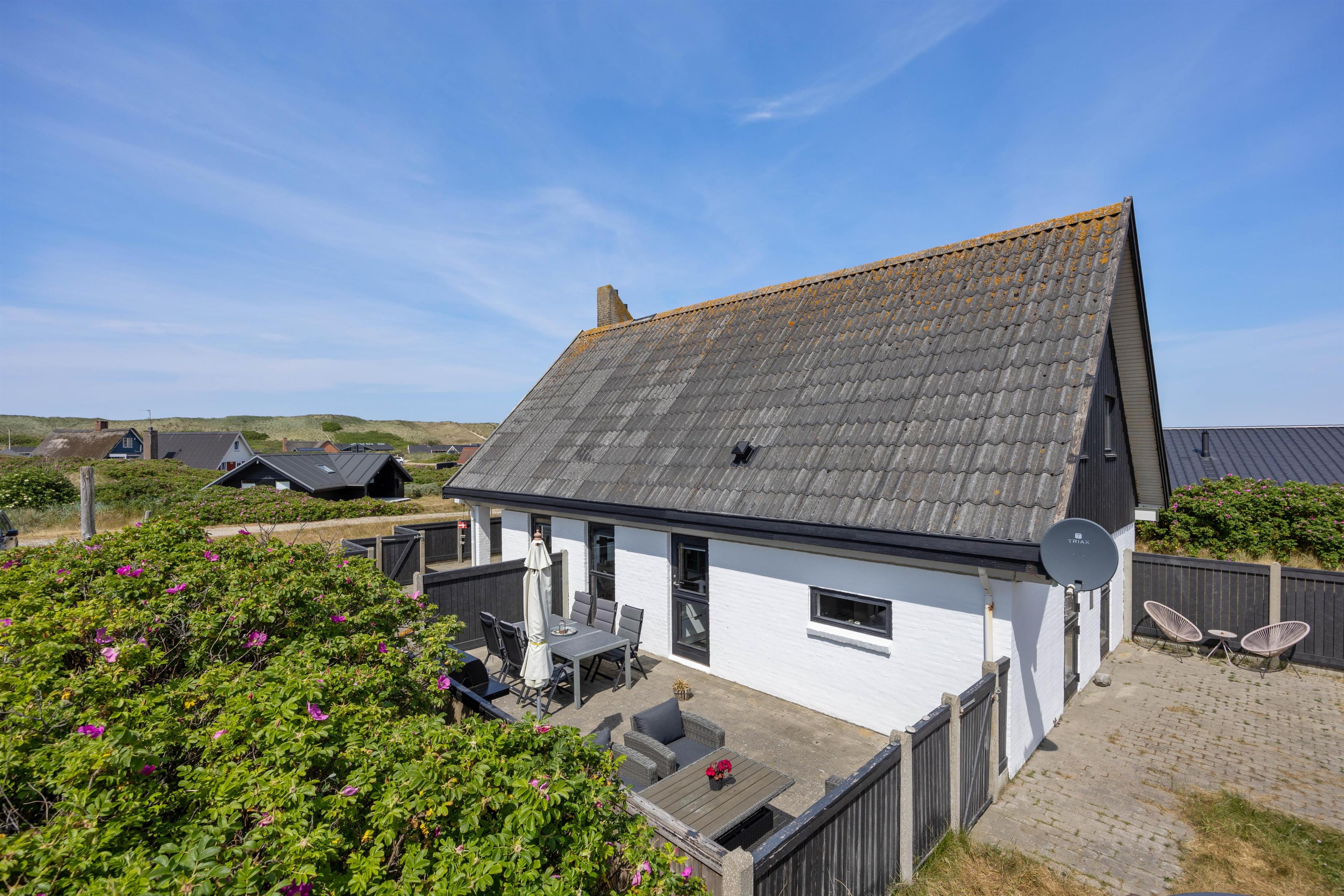 Den lukkede terrasse er ganske enkelt enestående. Den er stor, har flere indvendige afskærmninger og byder på rig mulighed for både læ og privatliv. Ideel til familier med småbørn og hund. Fra både spisestue og terrassen er der en vidunderlig udsigt til det smukke landskab med hede og klitter. Der er kun 200 meter til hav og strand.