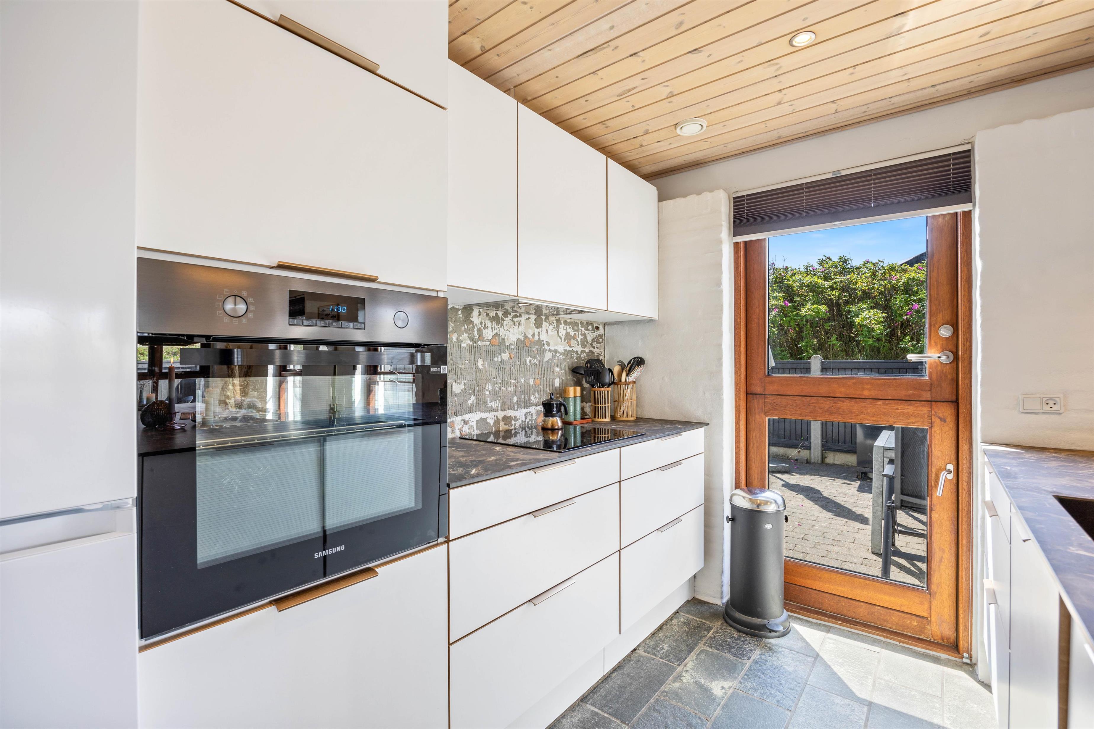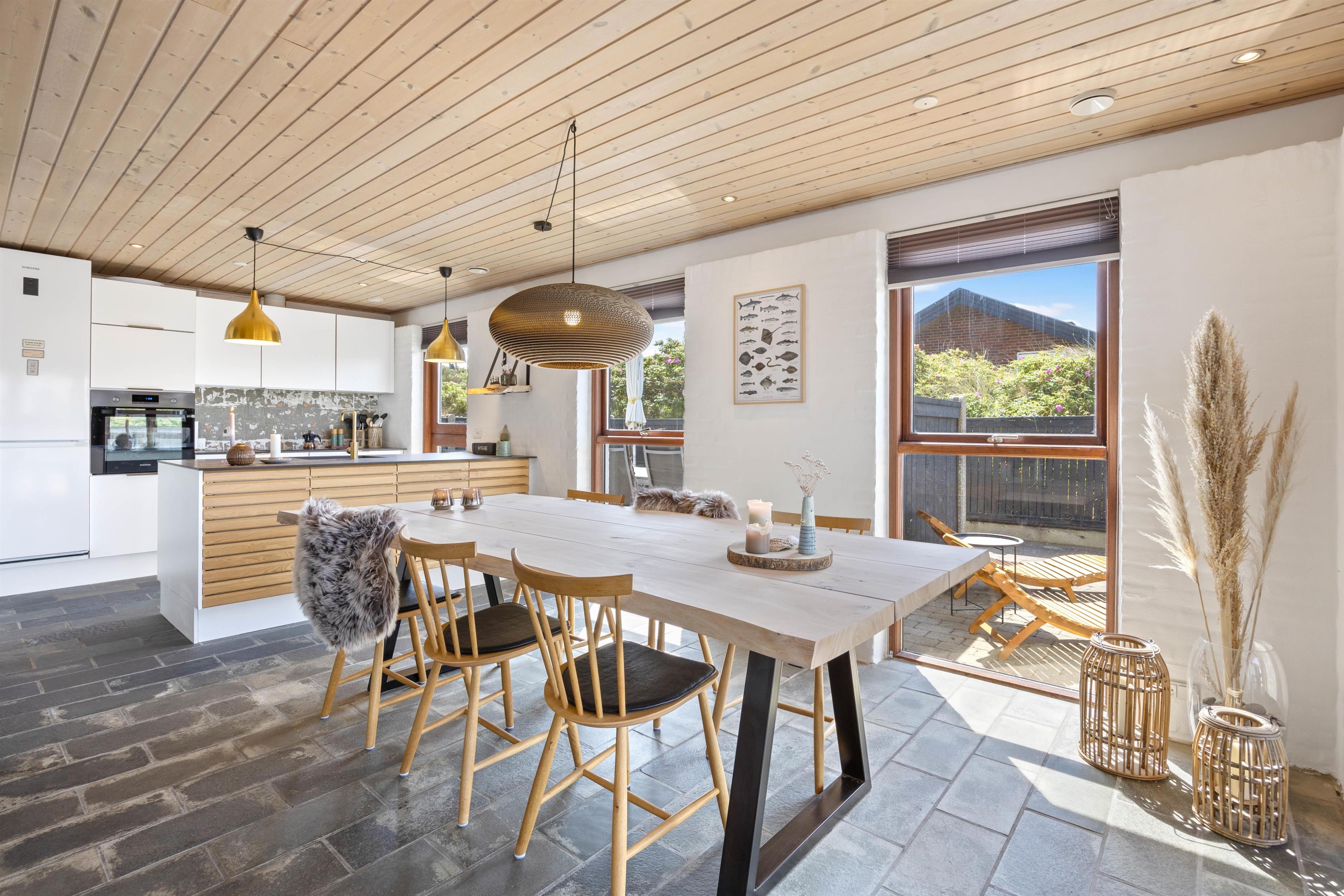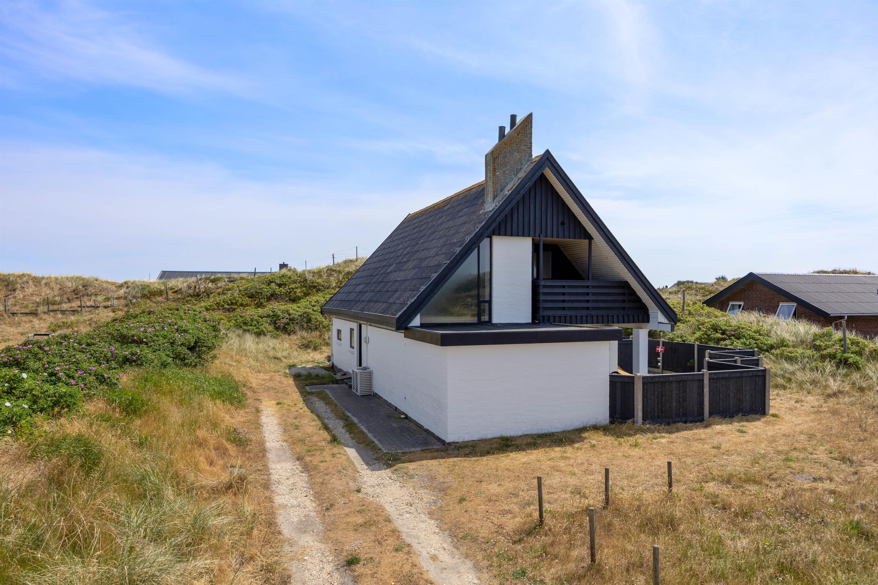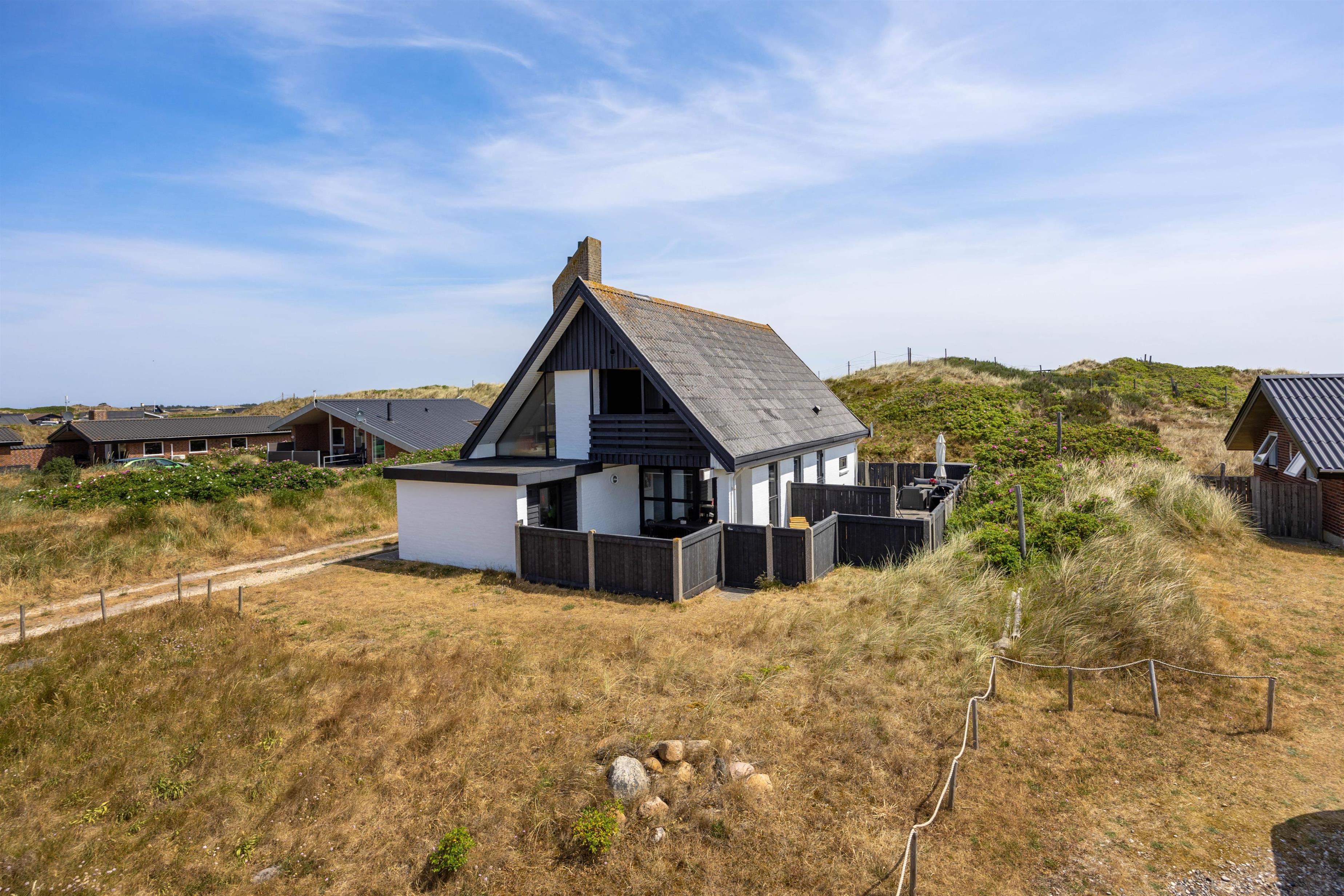 Den lukkede terrasse er ganske enkelt enestående. Den er stor, har flere indvendige afskærmninger og byder på rig mulighed for både læ og privatliv. Ideel til familier med småbørn og hund. Fra både spisestue og terrassen er der en vidunderlig udsigt til det smukke landskab med hede og klitter. Der er kun 200 meter til hav og strand.