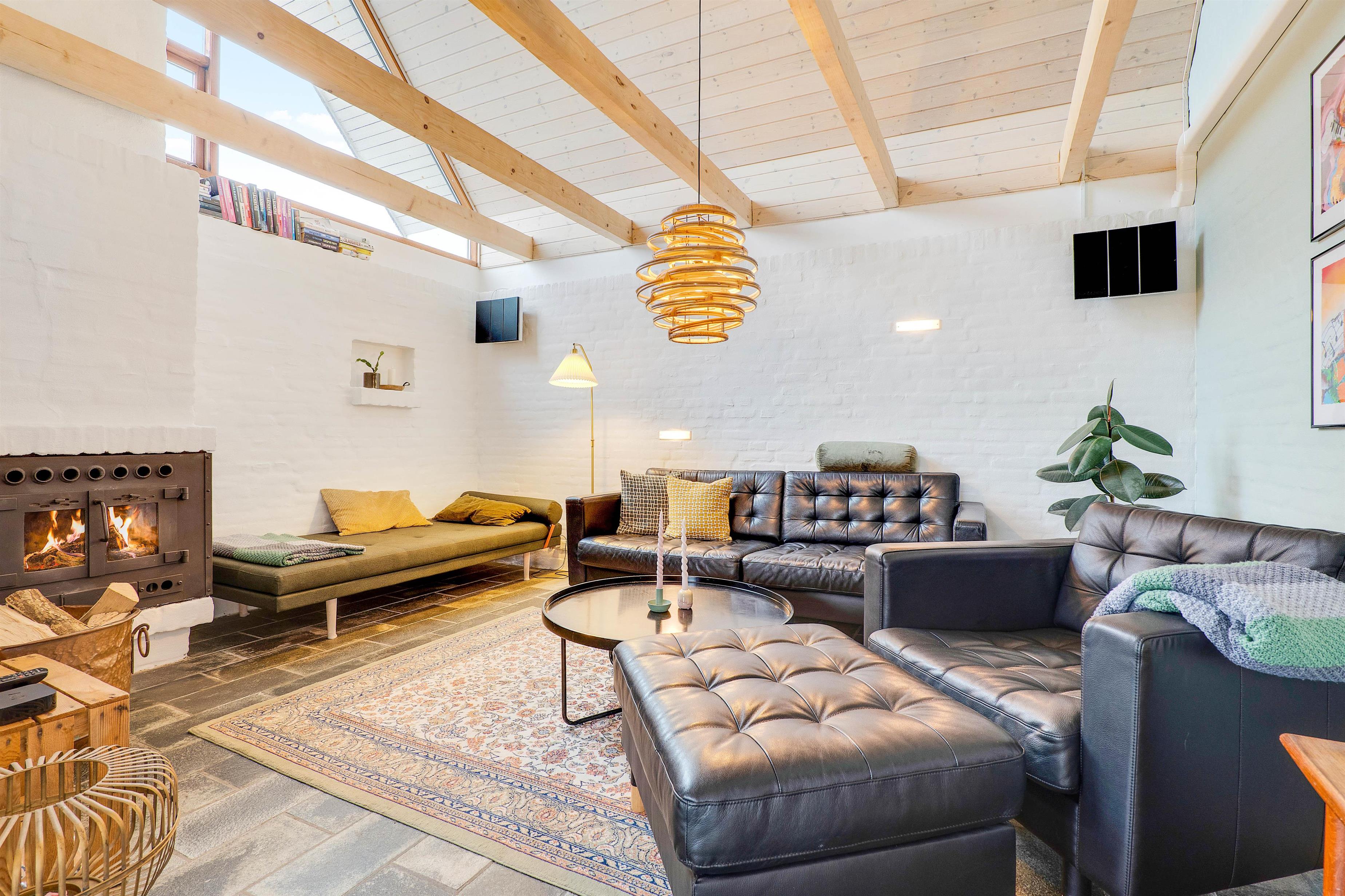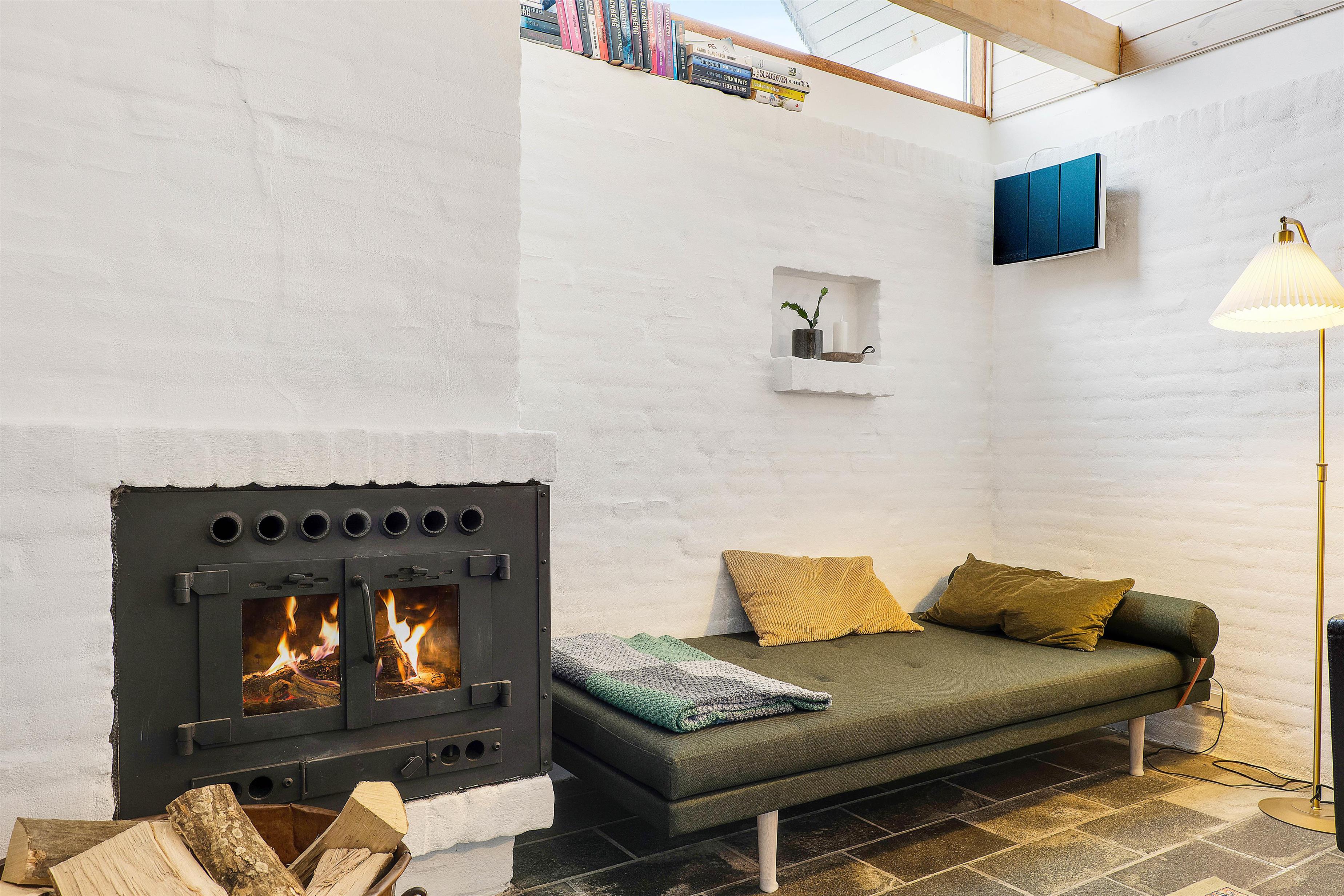 Sommerhuset består af en skøn og meget hyggelig stue med vandskurede vægge, træloft til kip og synlige bjælker. Den indbyggede pejs giver både varme og skaber hygge. Sæt jer godt til rette i sofaen og stream jeres yndlingsfilm fra jeres egen telefon - Sommerhuset har nemlig Apple-tv.