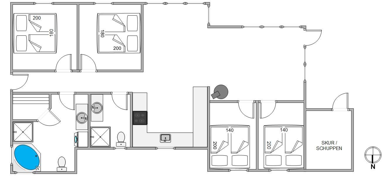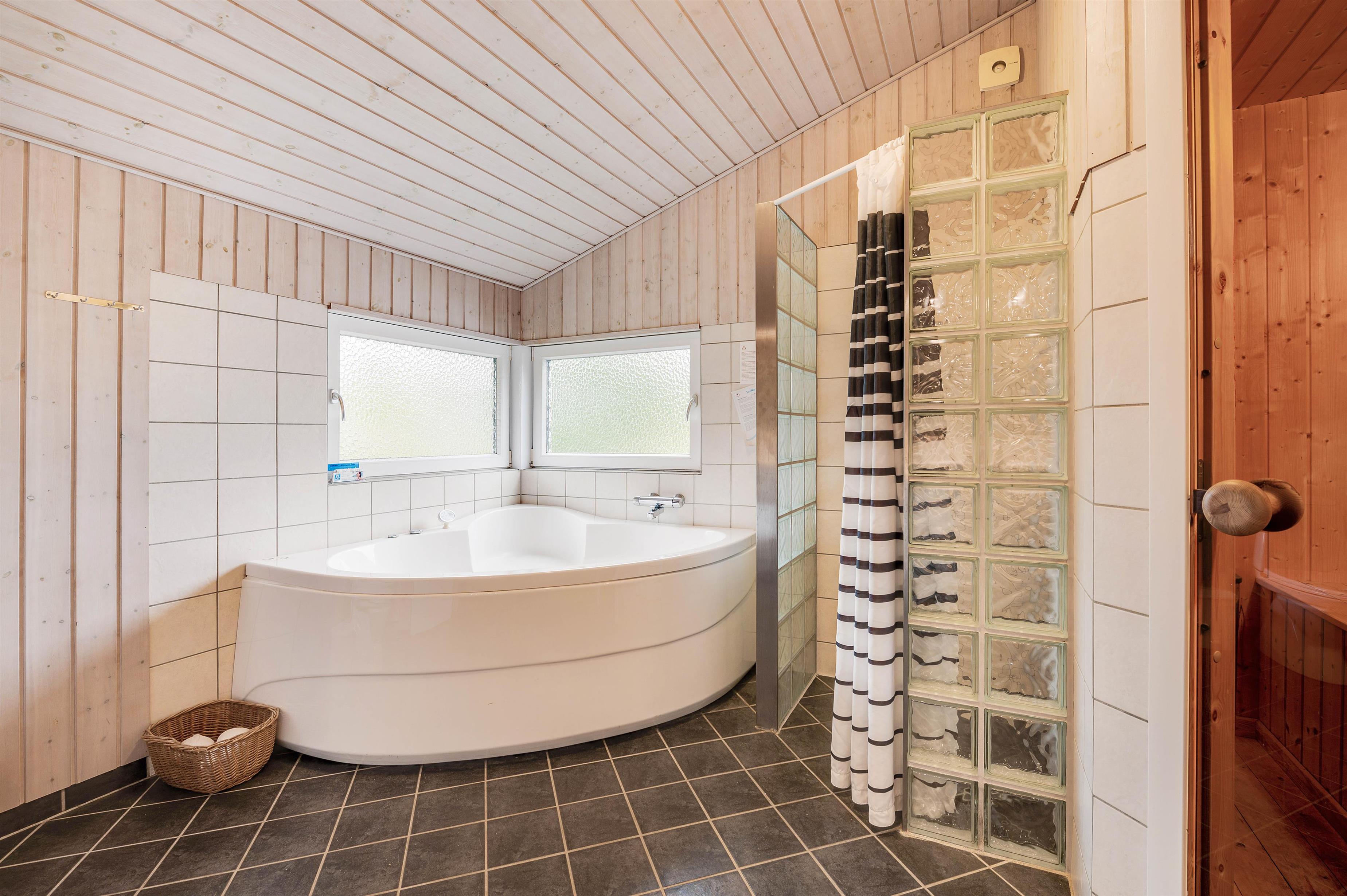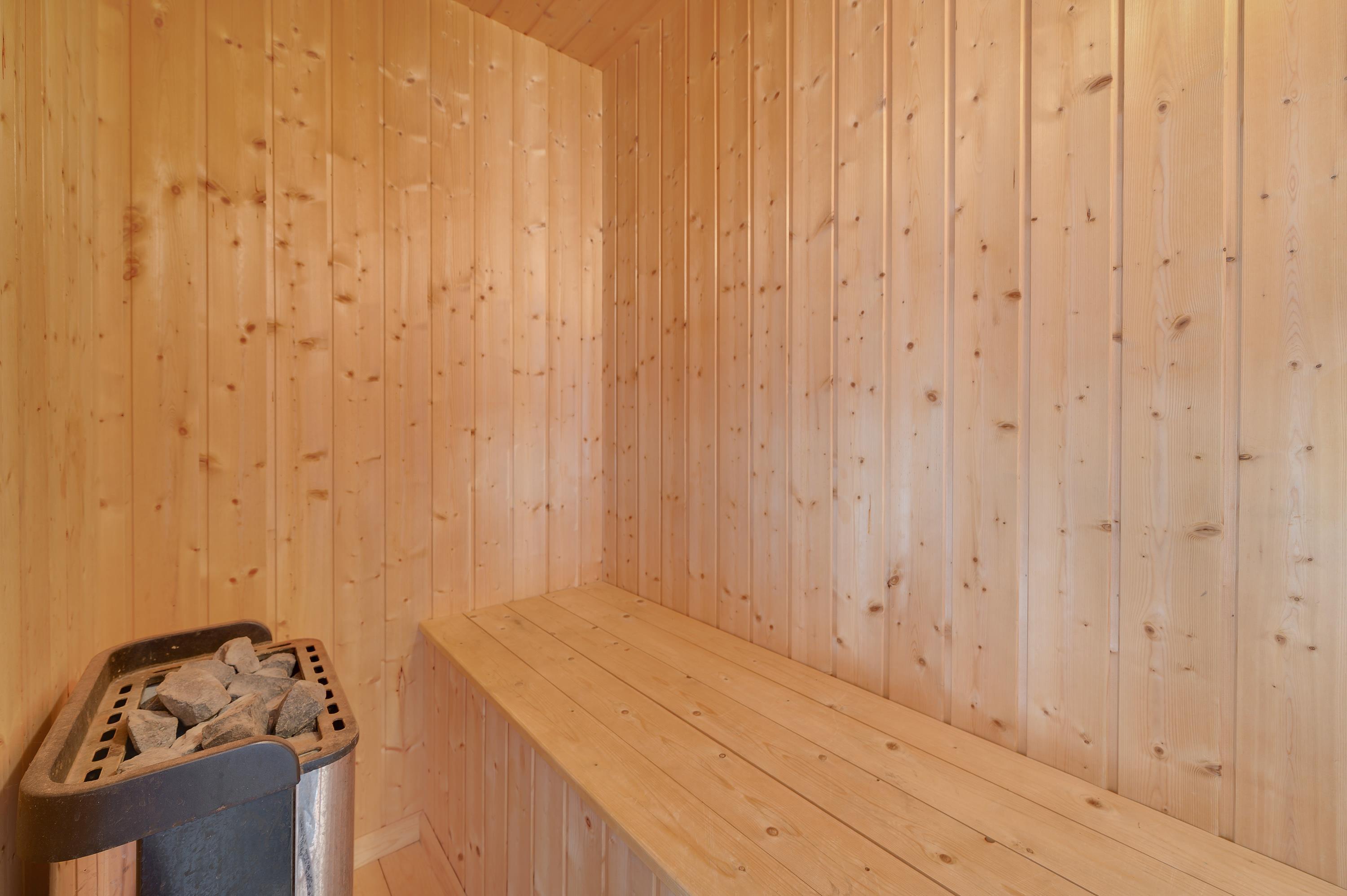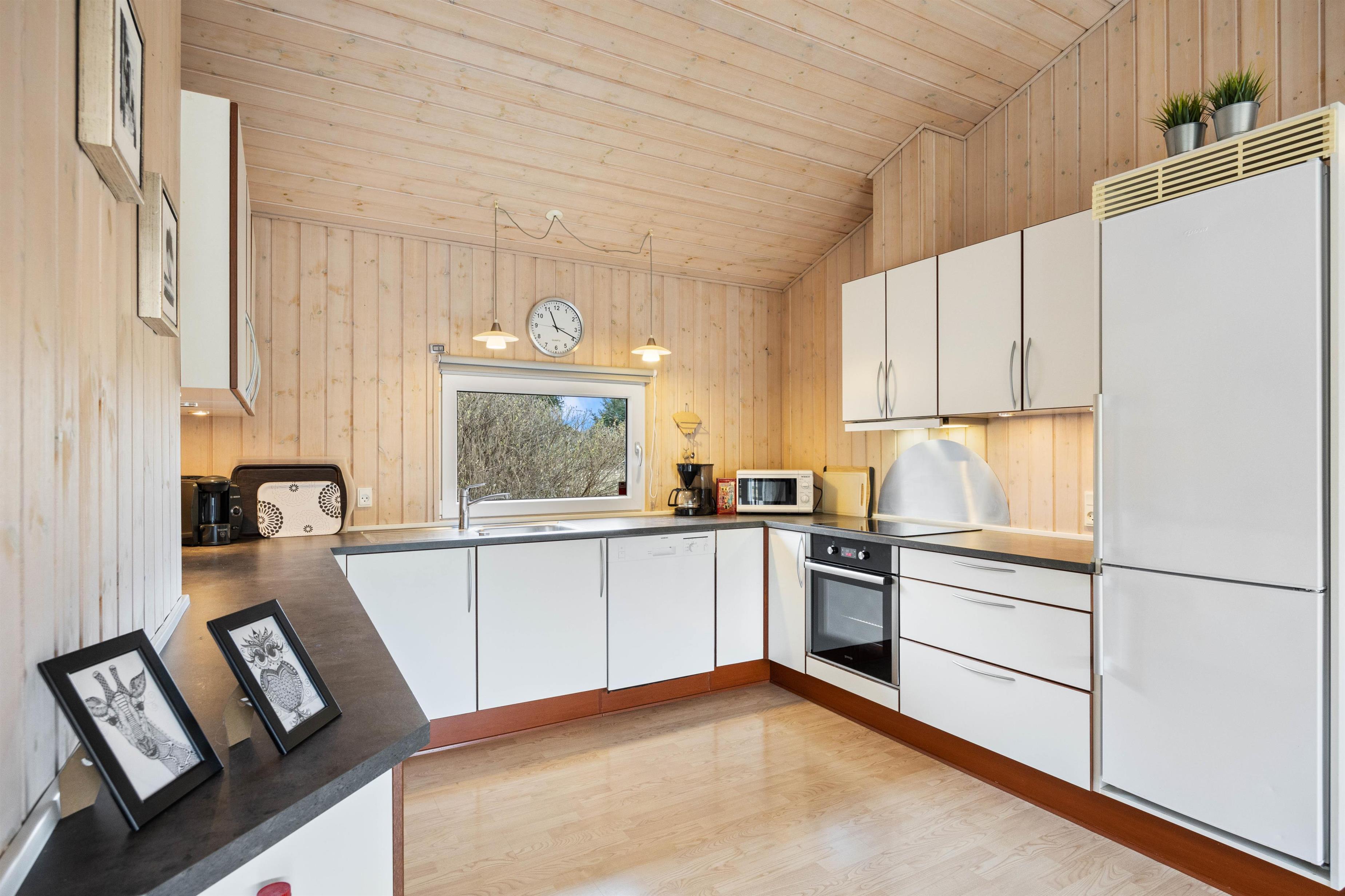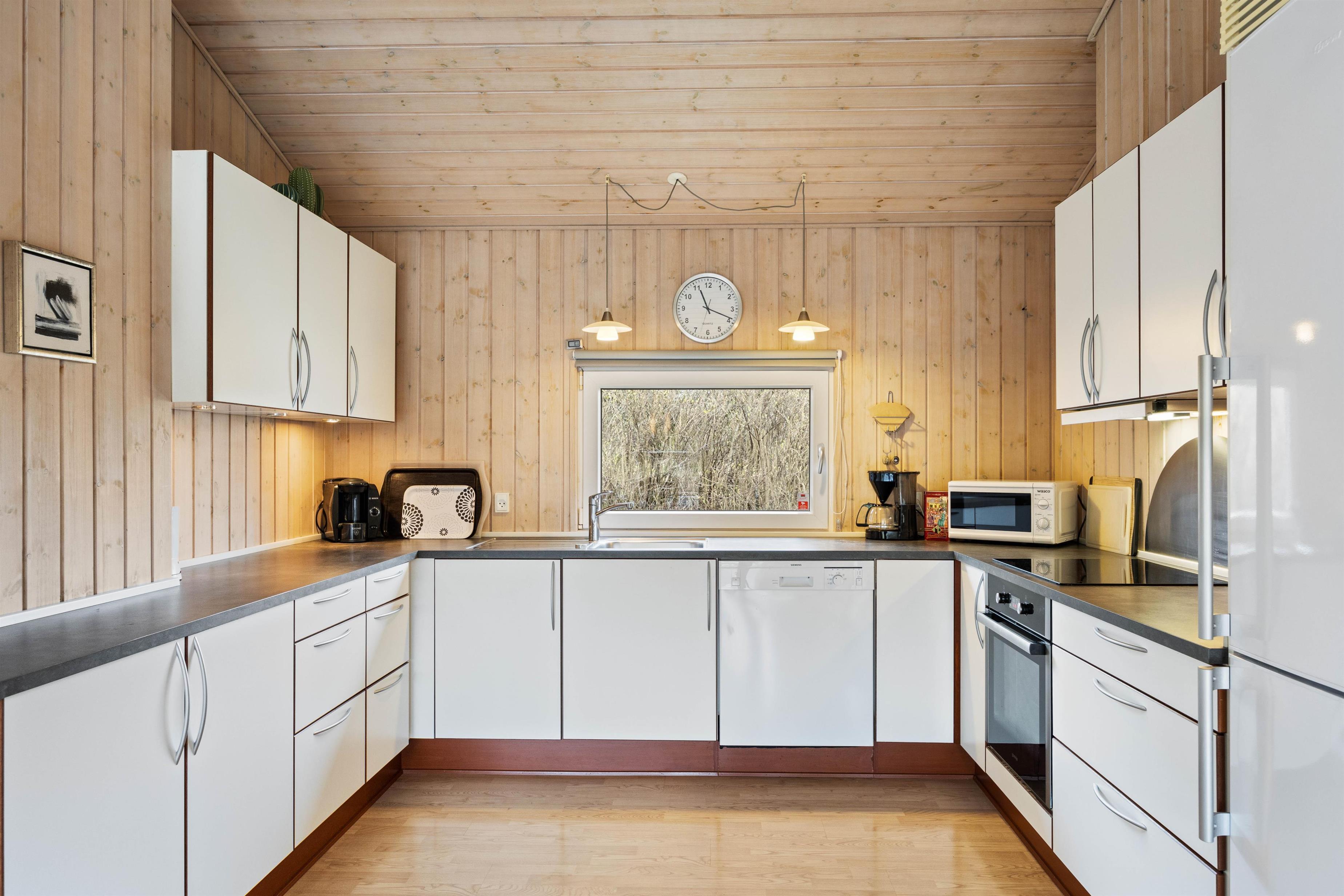 Køkkenet er i åben forbindelse med spiseafdelingen og stuen. Og her har du god skabs- og bordplads, så der kan laves mad i fællesskab. Derudover er der to dejlige badeværelser. Og på det ene af dem er der et spabad og en sauna, hvor du rigtig kan slappe af efter en frisk tur på stranden eller en dejlig dag på terrassen.