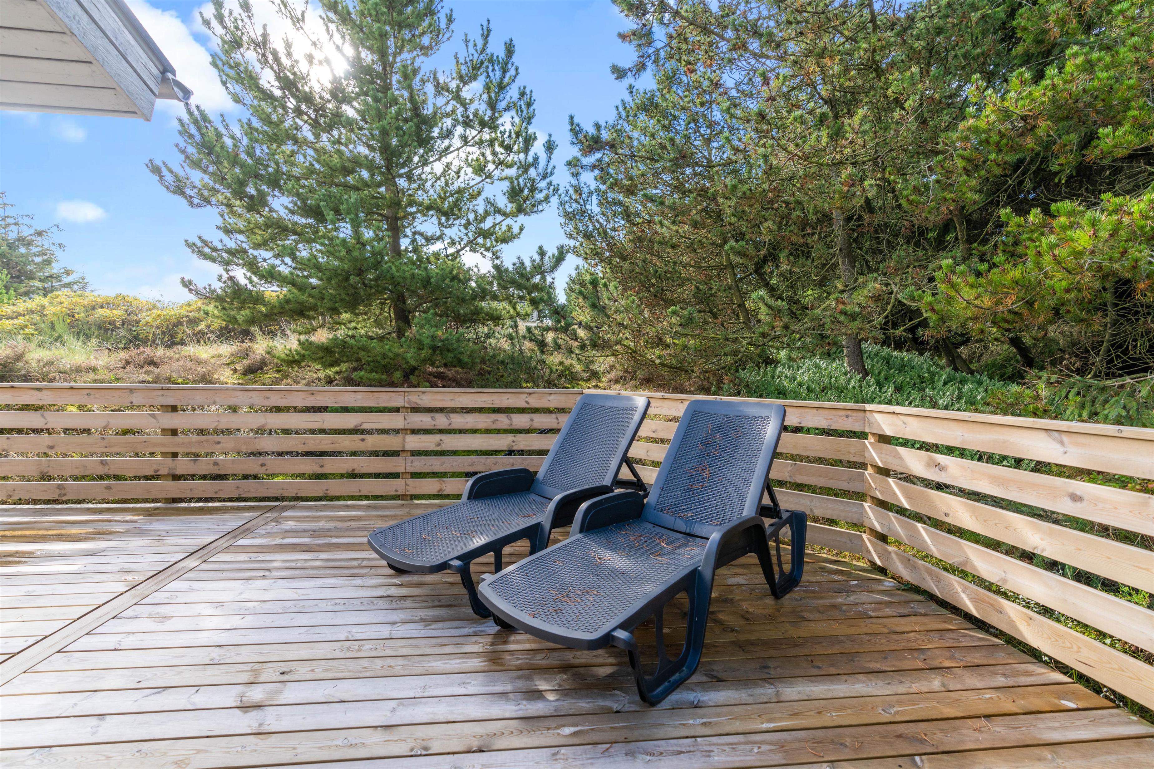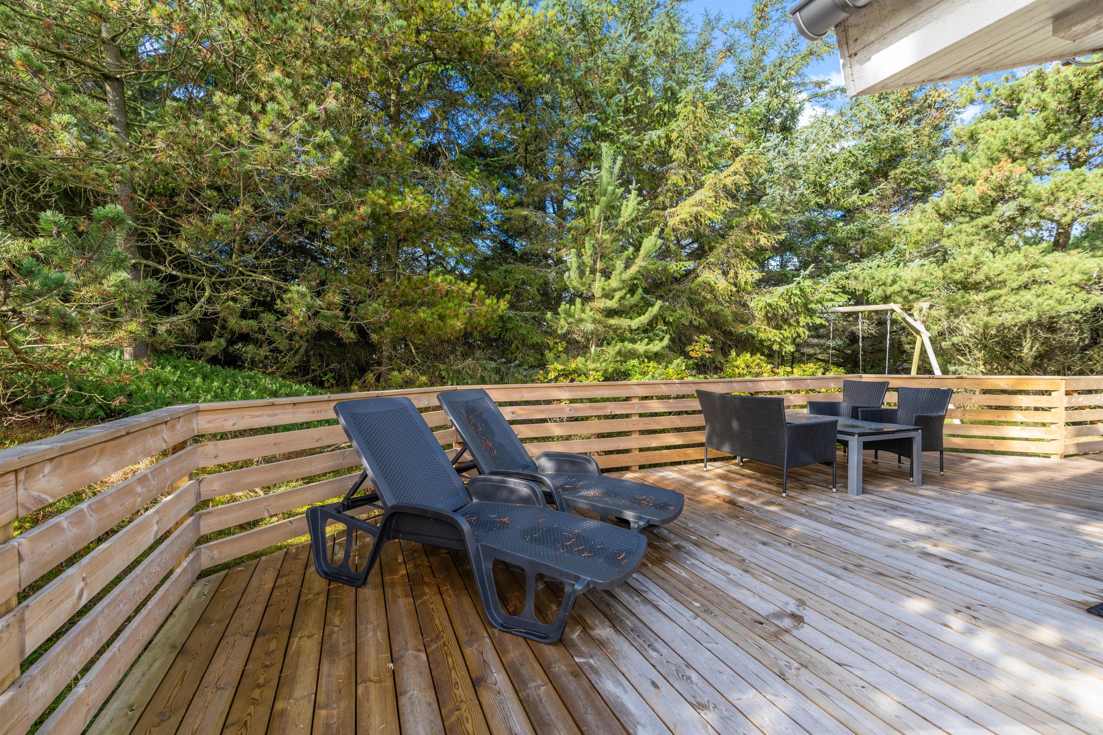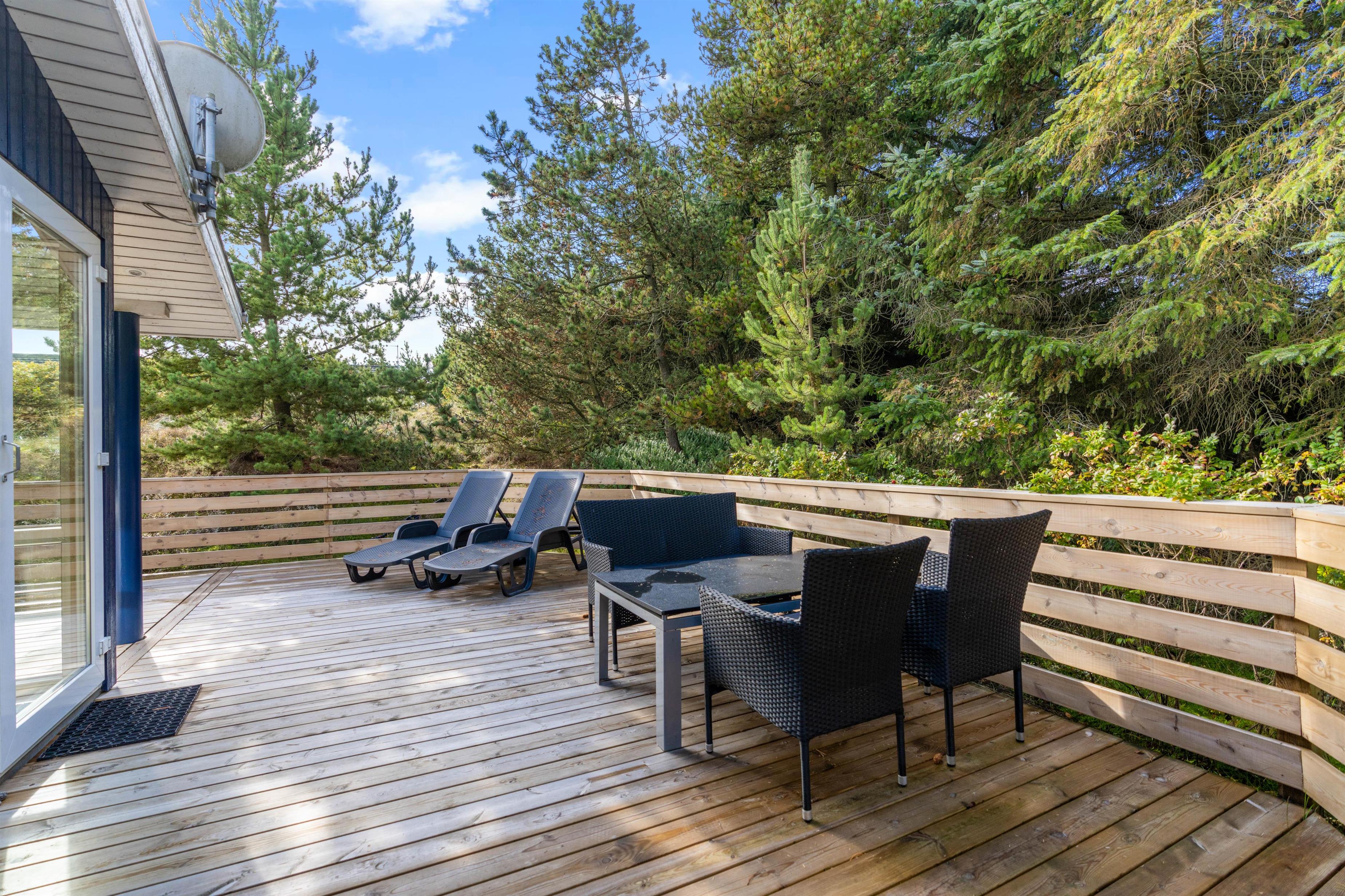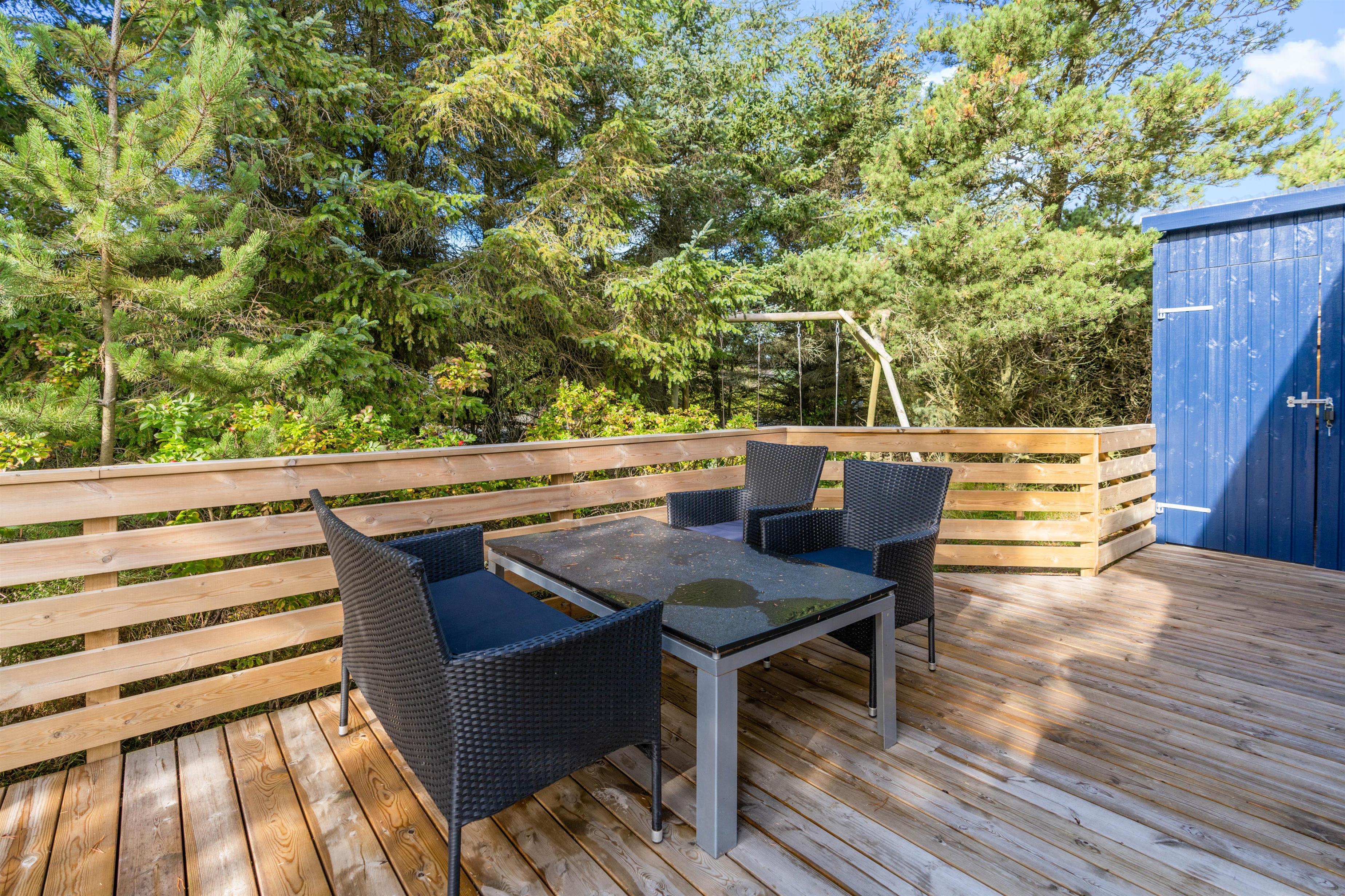 Terrassen ligger både syd og vest for feriehuset. Så her kan du nyde mange solskinstimer på de gode sommerdage. Især den vestlige del af terrassen er godt afskærmet af træer og buske, hvilket ikke kun giver læ, men også mulighed for at nyde terrasselivet og grillaftenerne i fred.