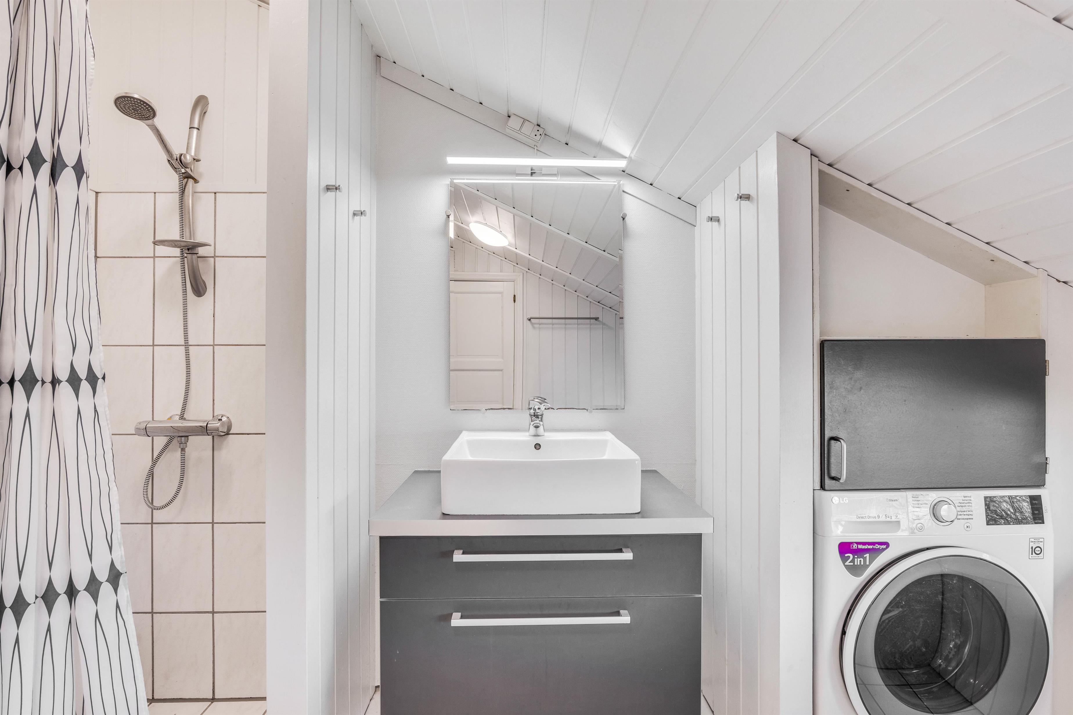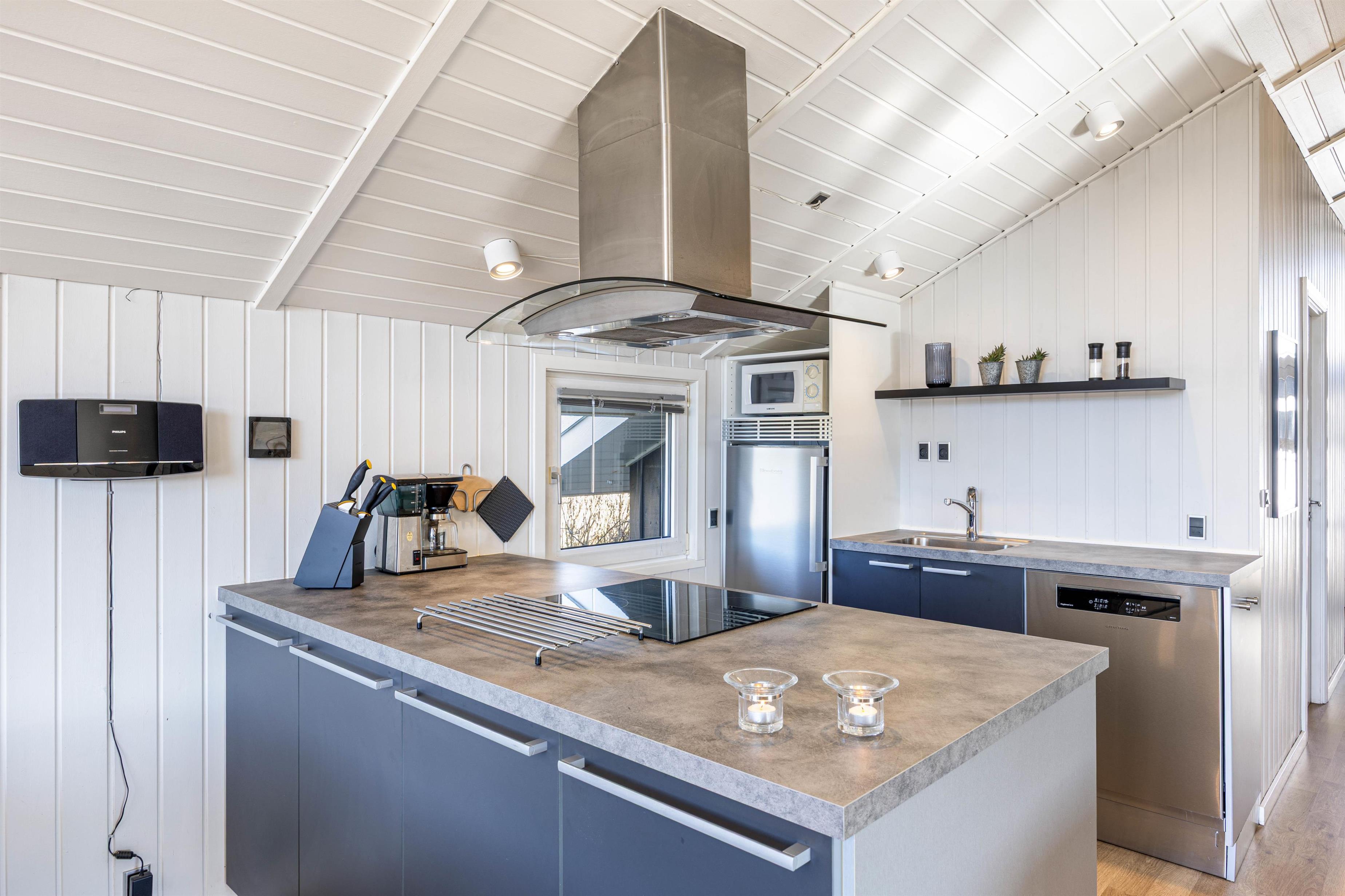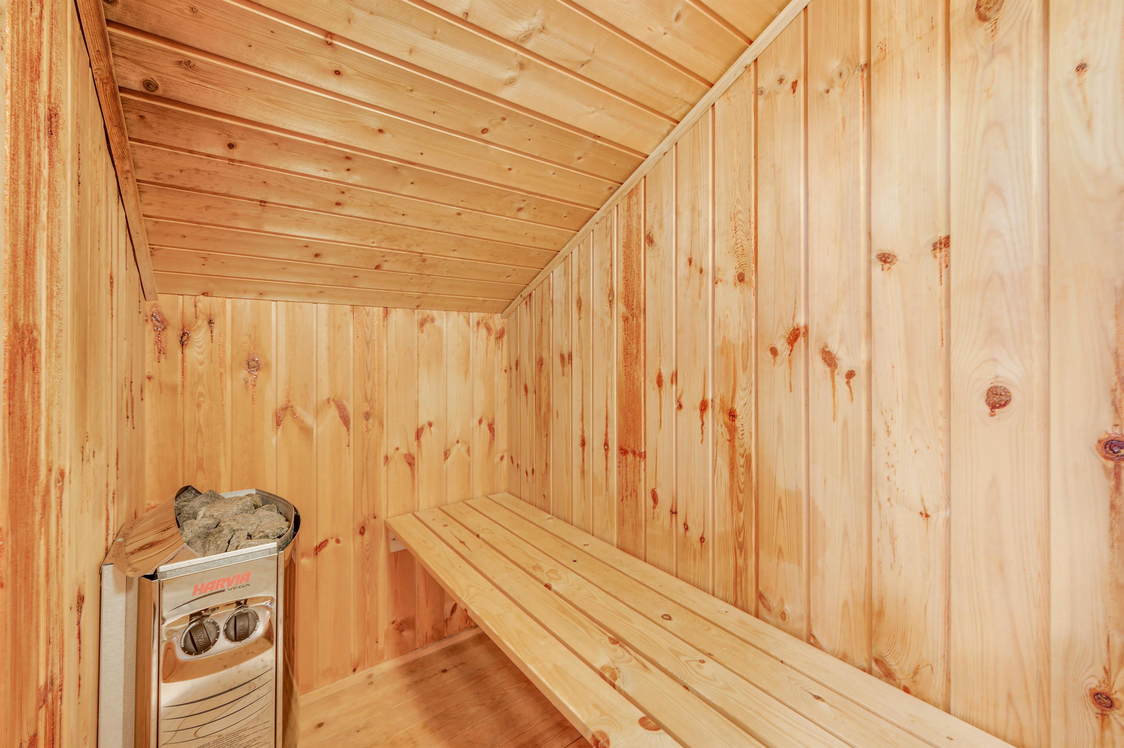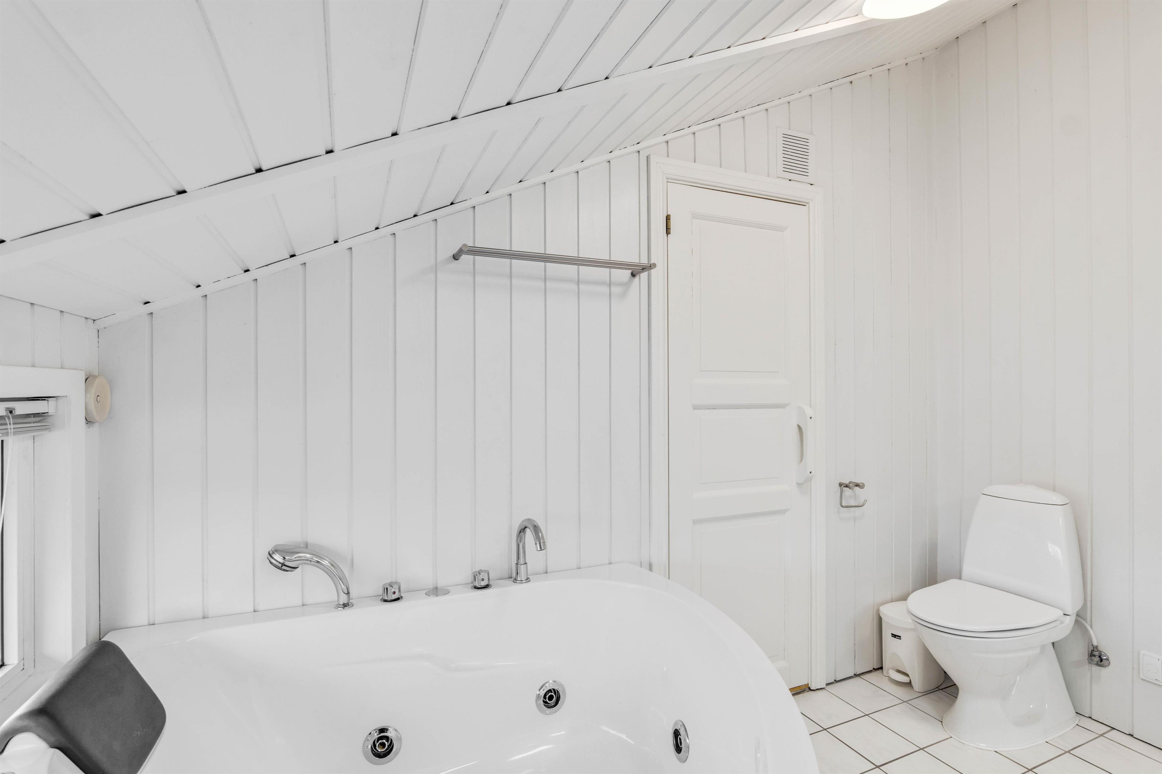 Det fine badeværelse er lyst og godt indrettet, der er gulvvarme, bruseniche, vaskemaskine, hjørnespa og en sauna. Køkkenet er en del af stuen og indeholder de ting, som man har brug for bl.a. en opvaskemaskine, en mikroovn og en fryser på 85 L.