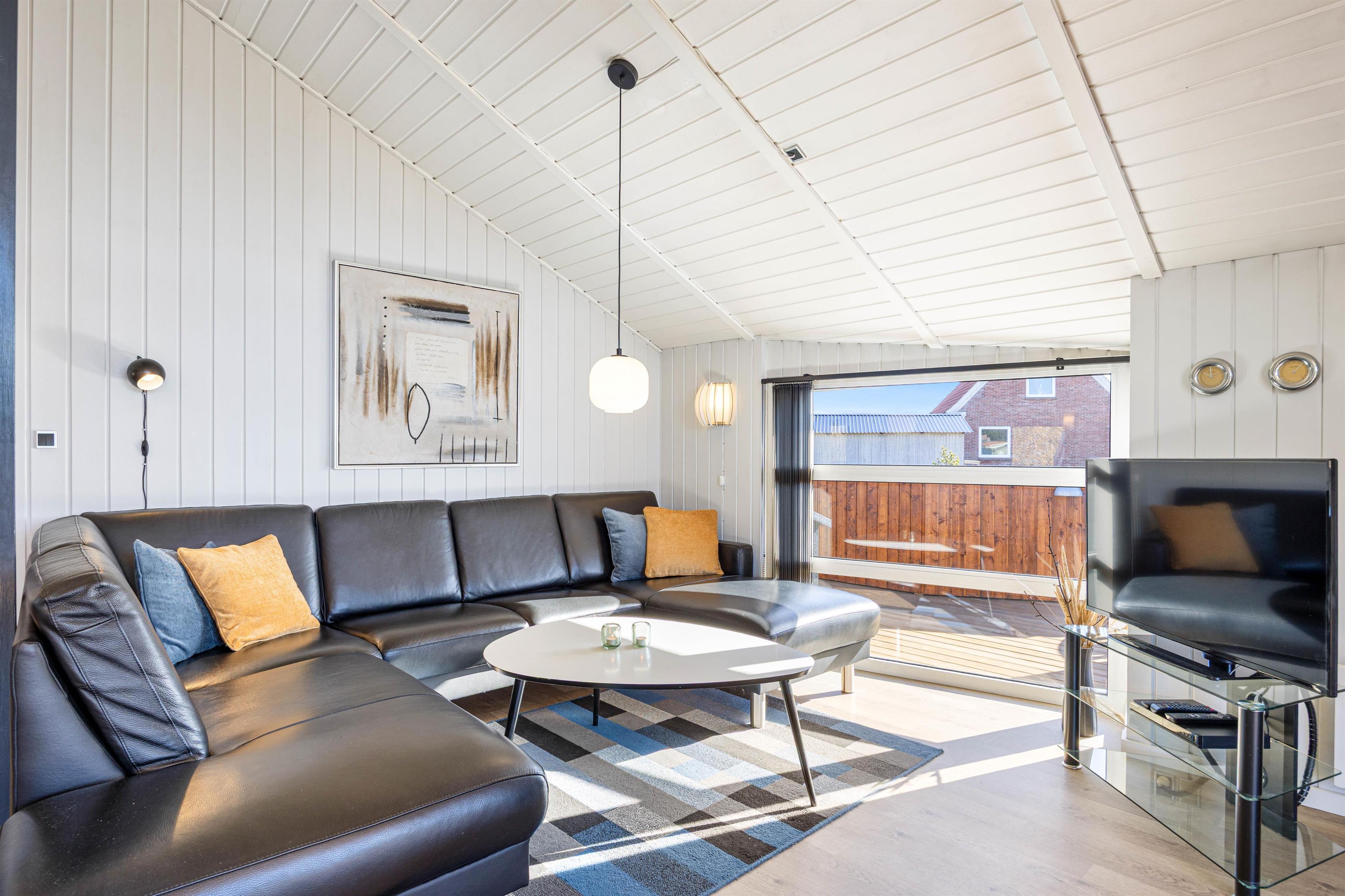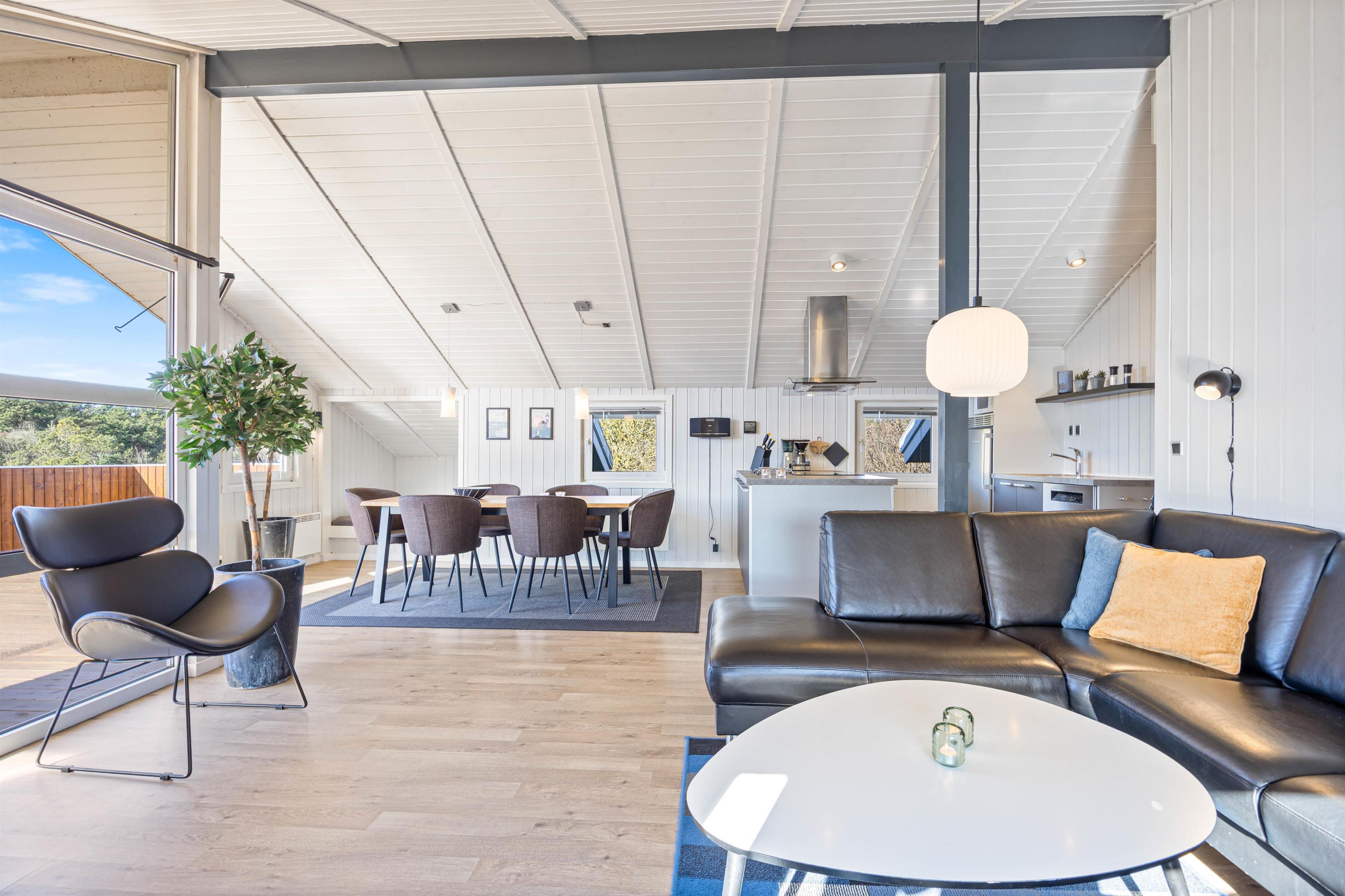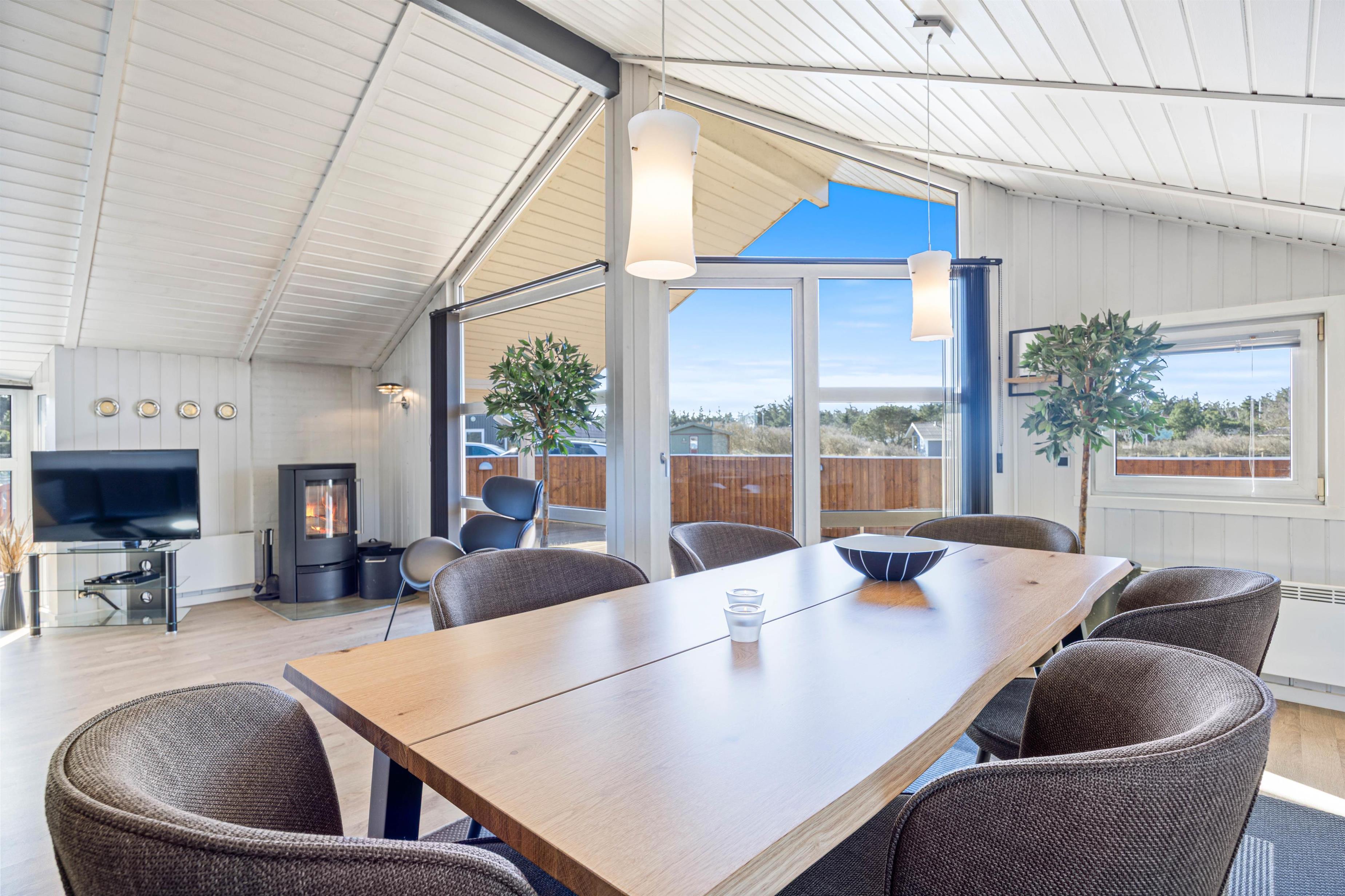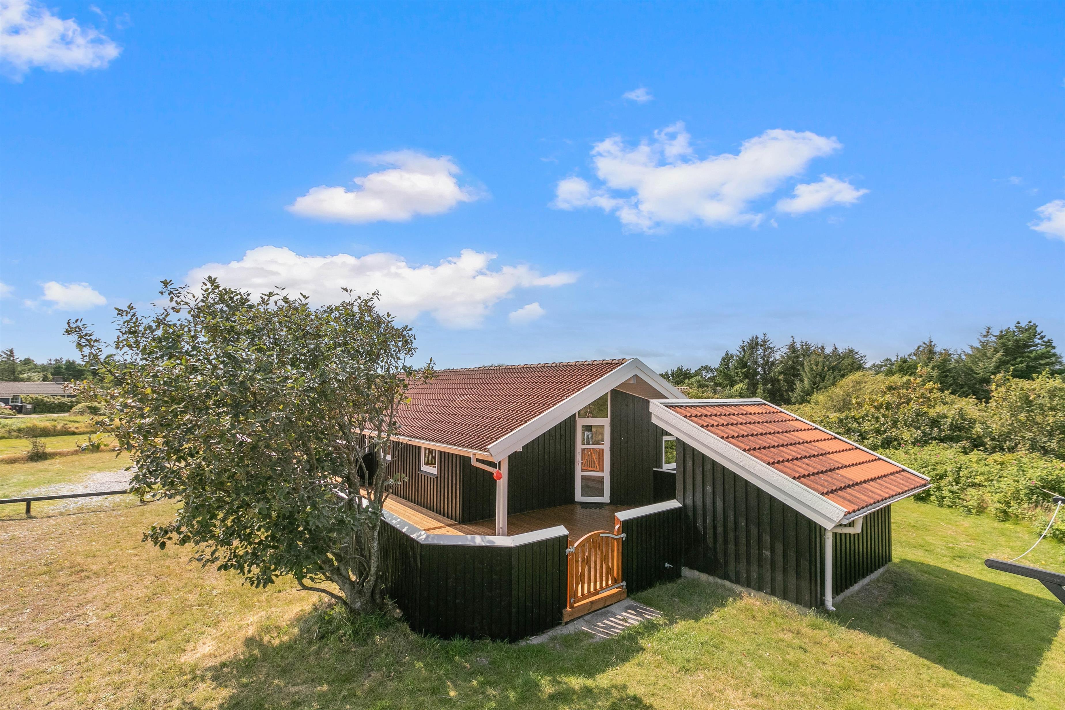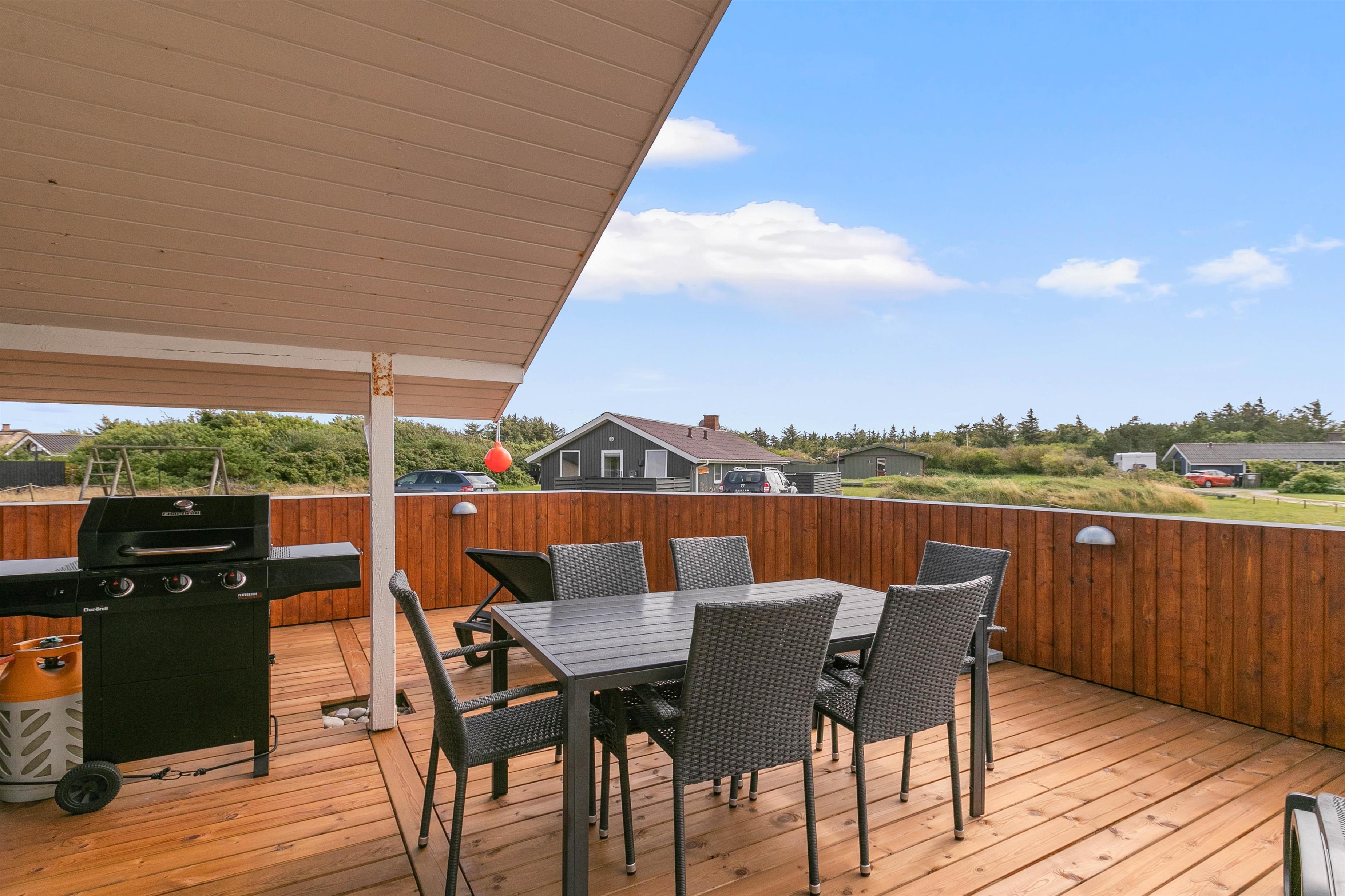 Sommerhuset er omgivet af en stor lukket og delvist overdækket terrasse, der er perfekt til feriens udendørsliv. Her kan du i fredelige omgivelser nyde et glas hvidvin på en sommeraften eller nyde en kop kaffe og en god bog på en liggestol i læ for blæsten. Til de små er der en gynge på naturgrunden.