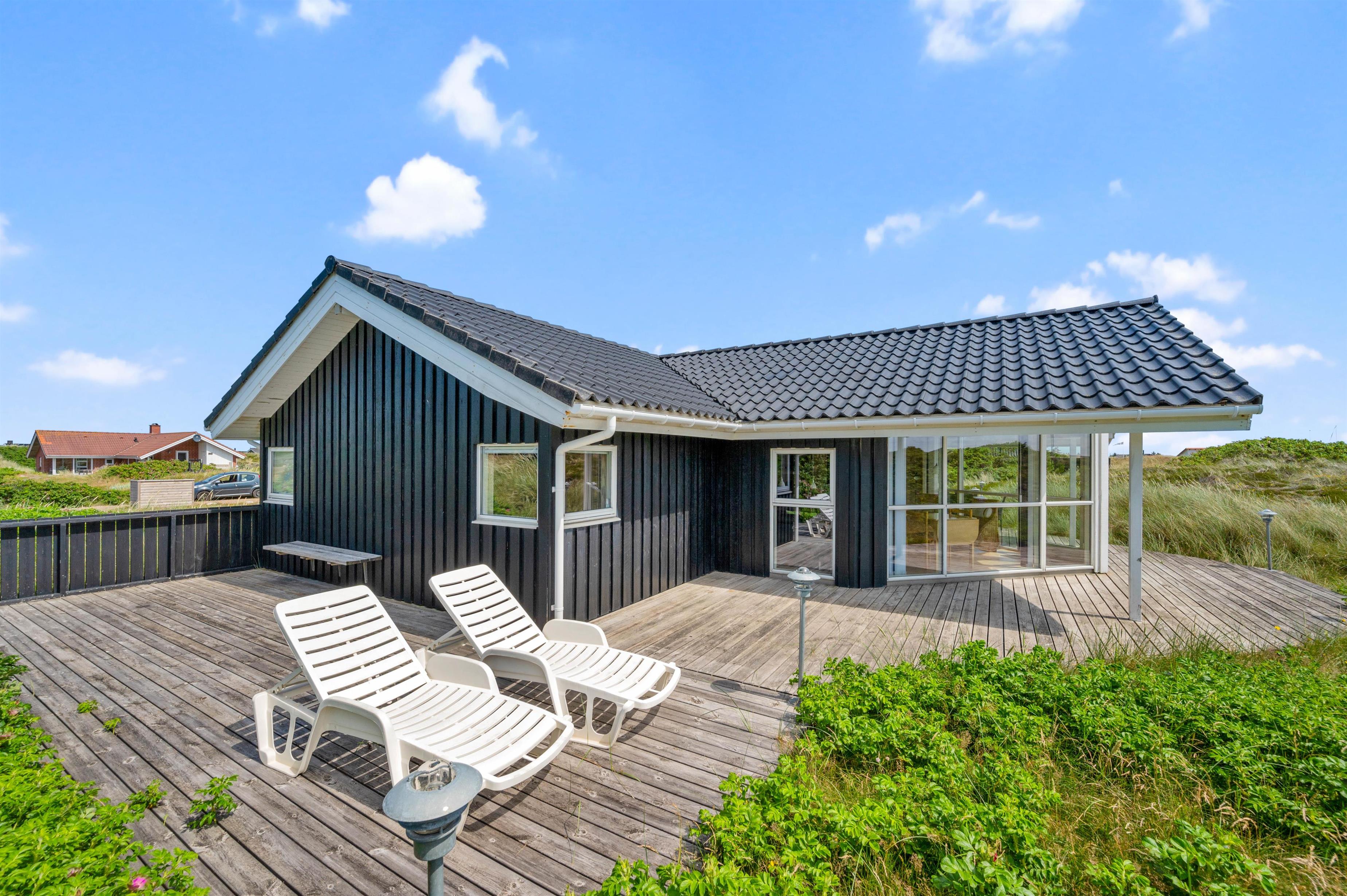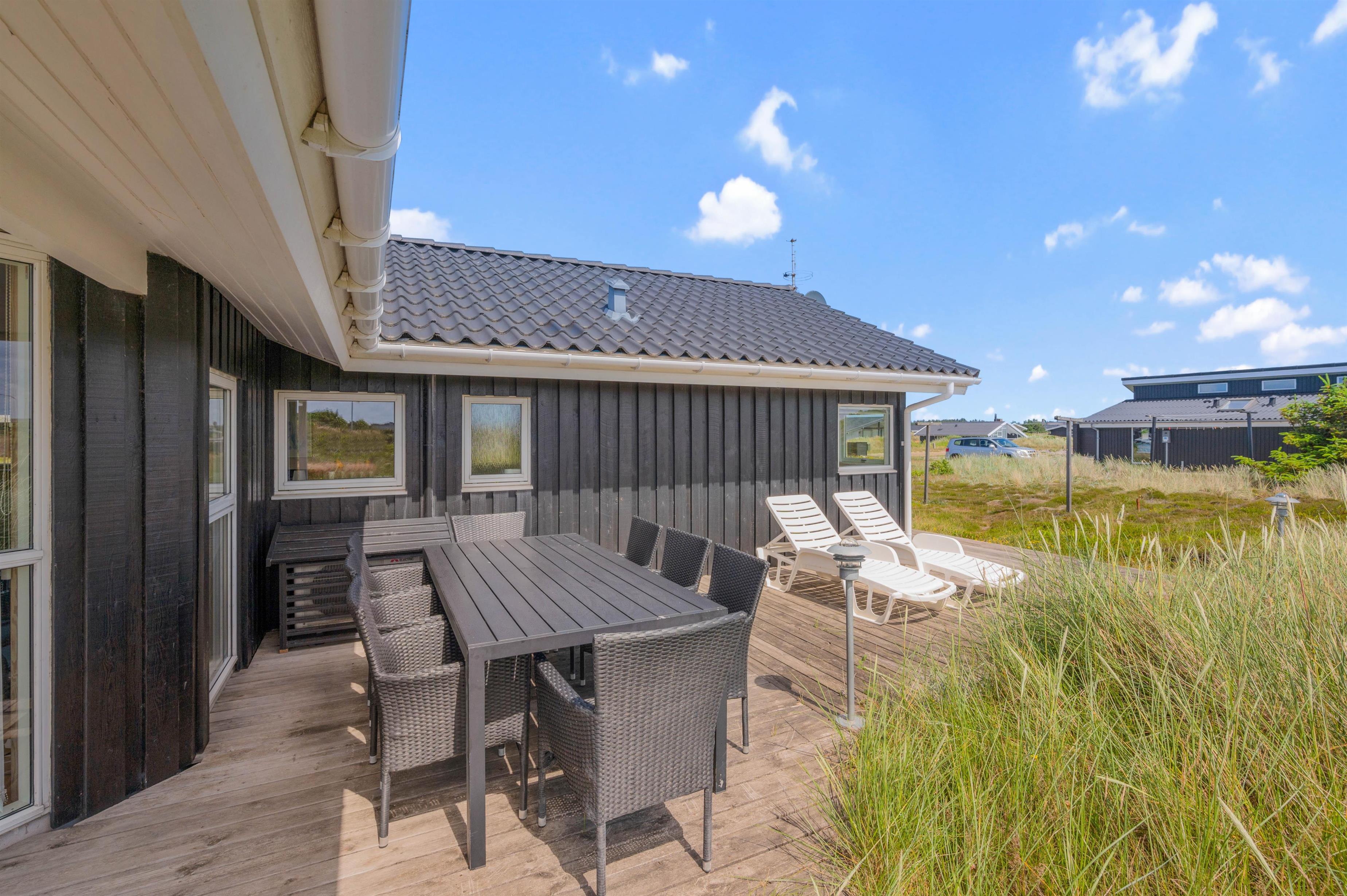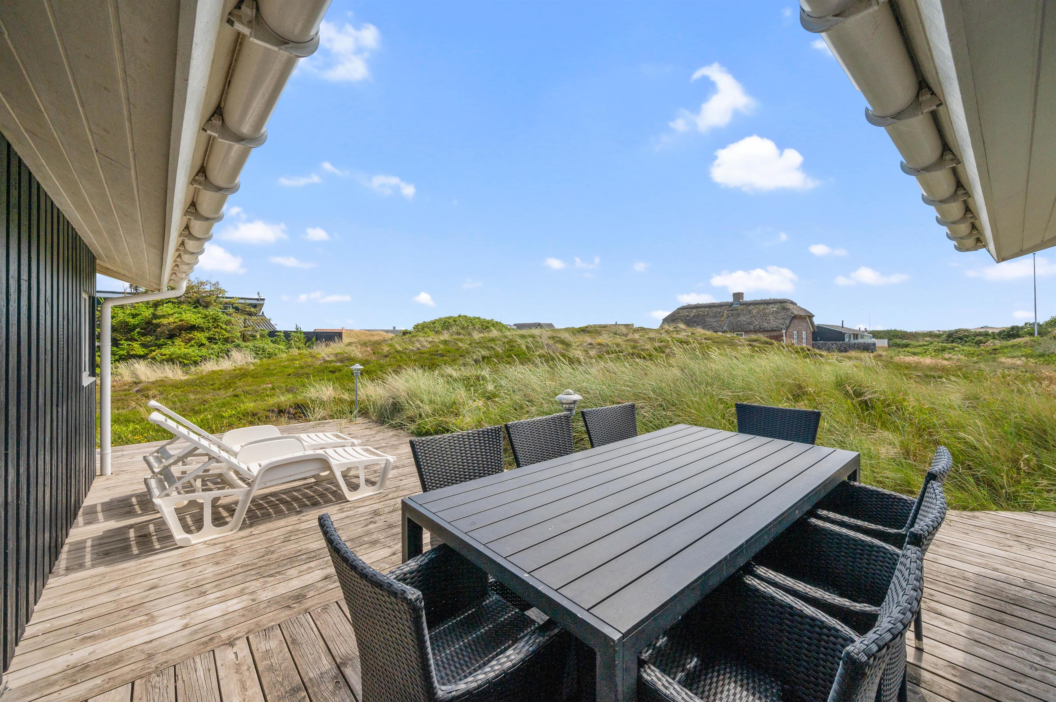 Feriehuset ligger på en stor naturgrund med udsigt til det smukke klitlandskab. Den gode terrasse er udstyret med liggestole, havemøbler og grill. Den er delvist overdækket, og I kan helt ugeneret nyde de varme dage i liggestolene med efterfølgende grillaften.