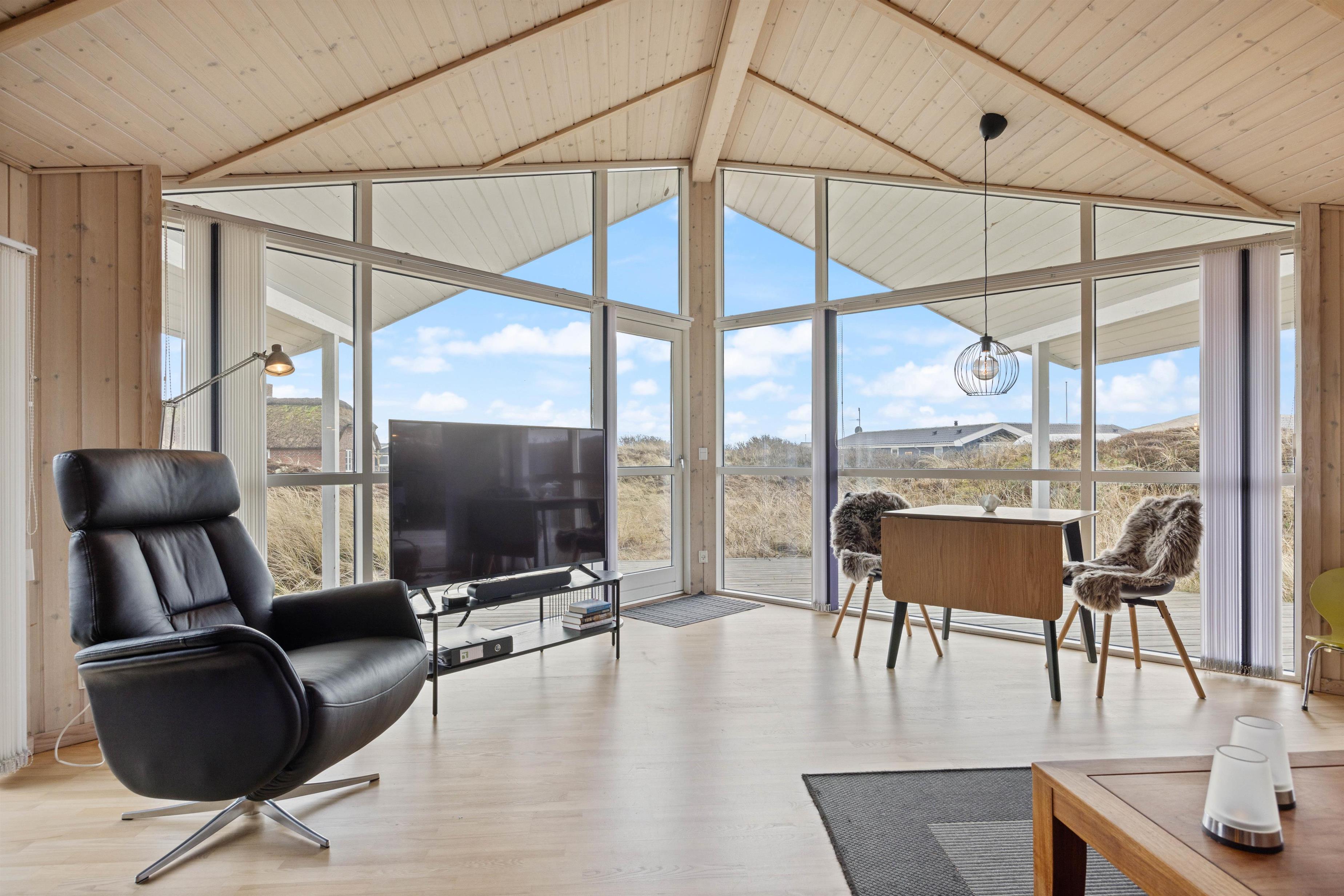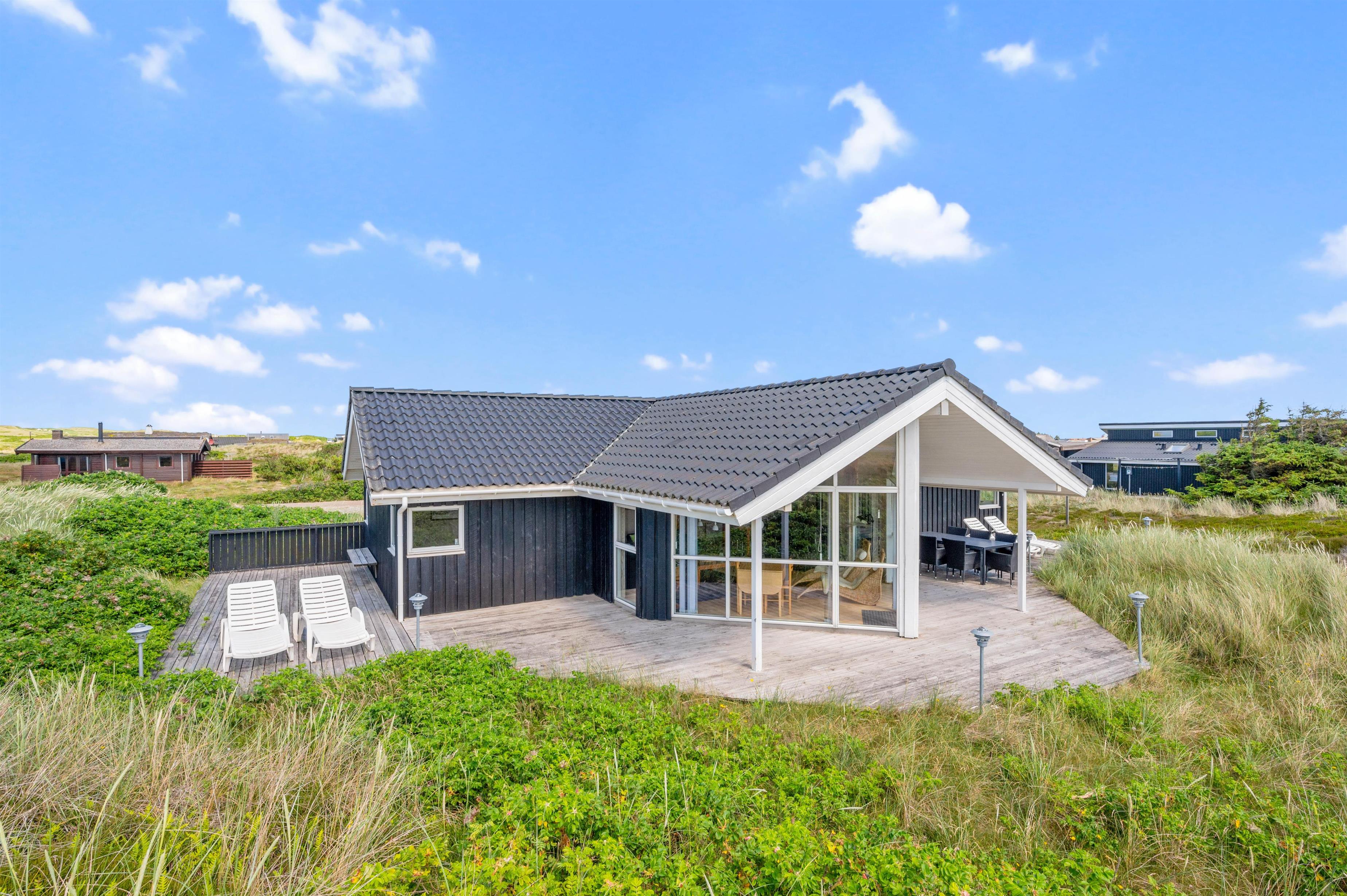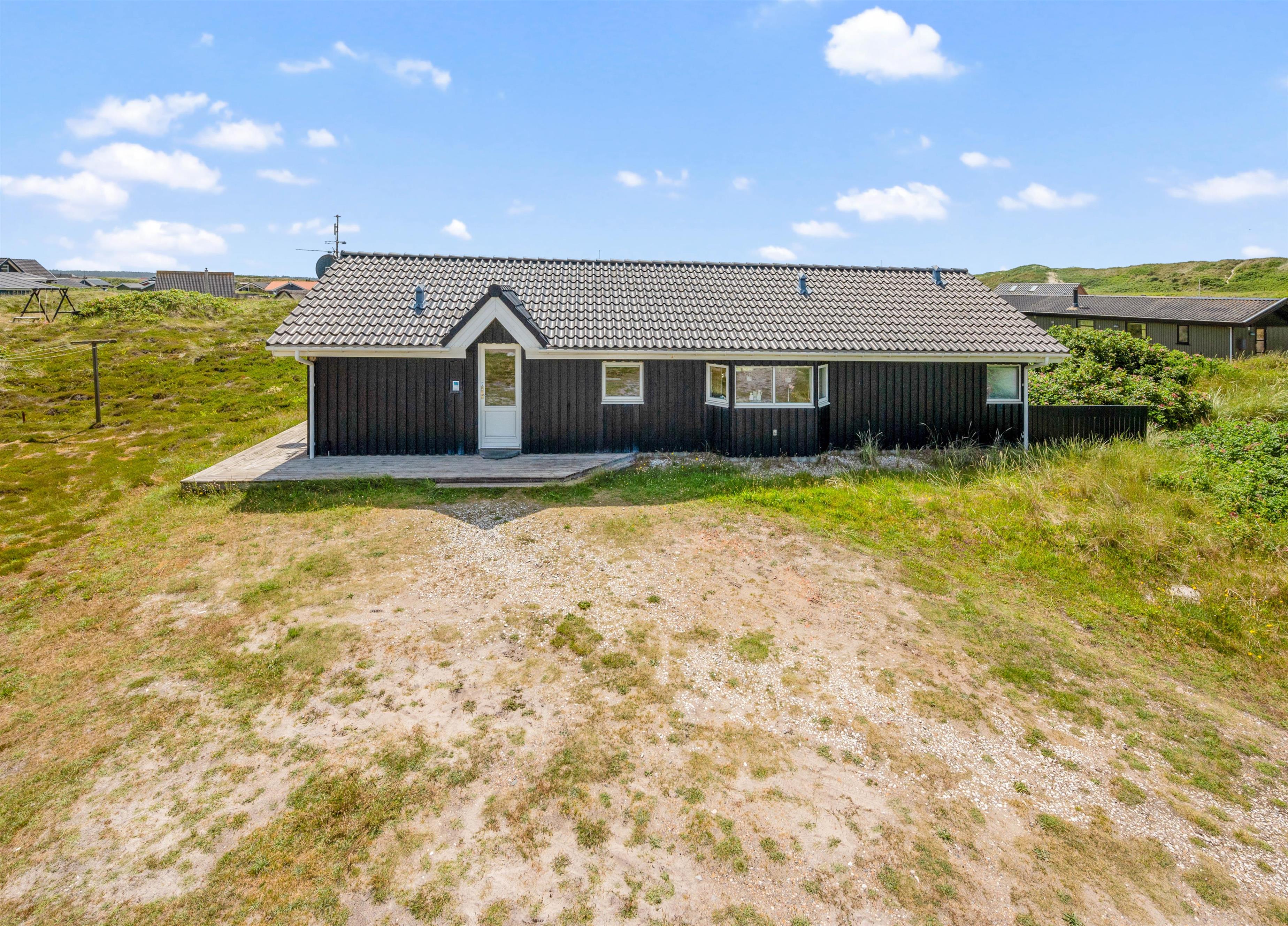 Feriehuset ligger på en stor naturgrund med udsigt til det smukke klitlandskab. Den gode terrasse er udstyret med liggestole, havemøbler og grill. Den er delvist overdækket, og I kan helt ugeneret nyde de varme dage i liggestolene med efterfølgende grillaften.