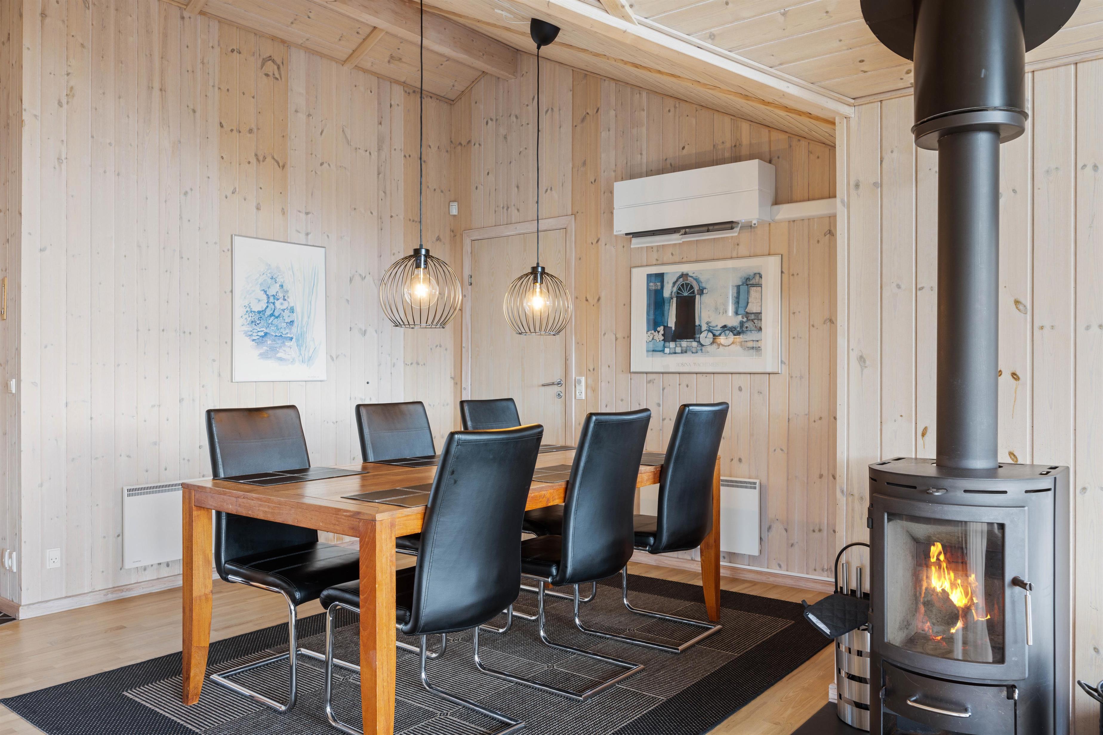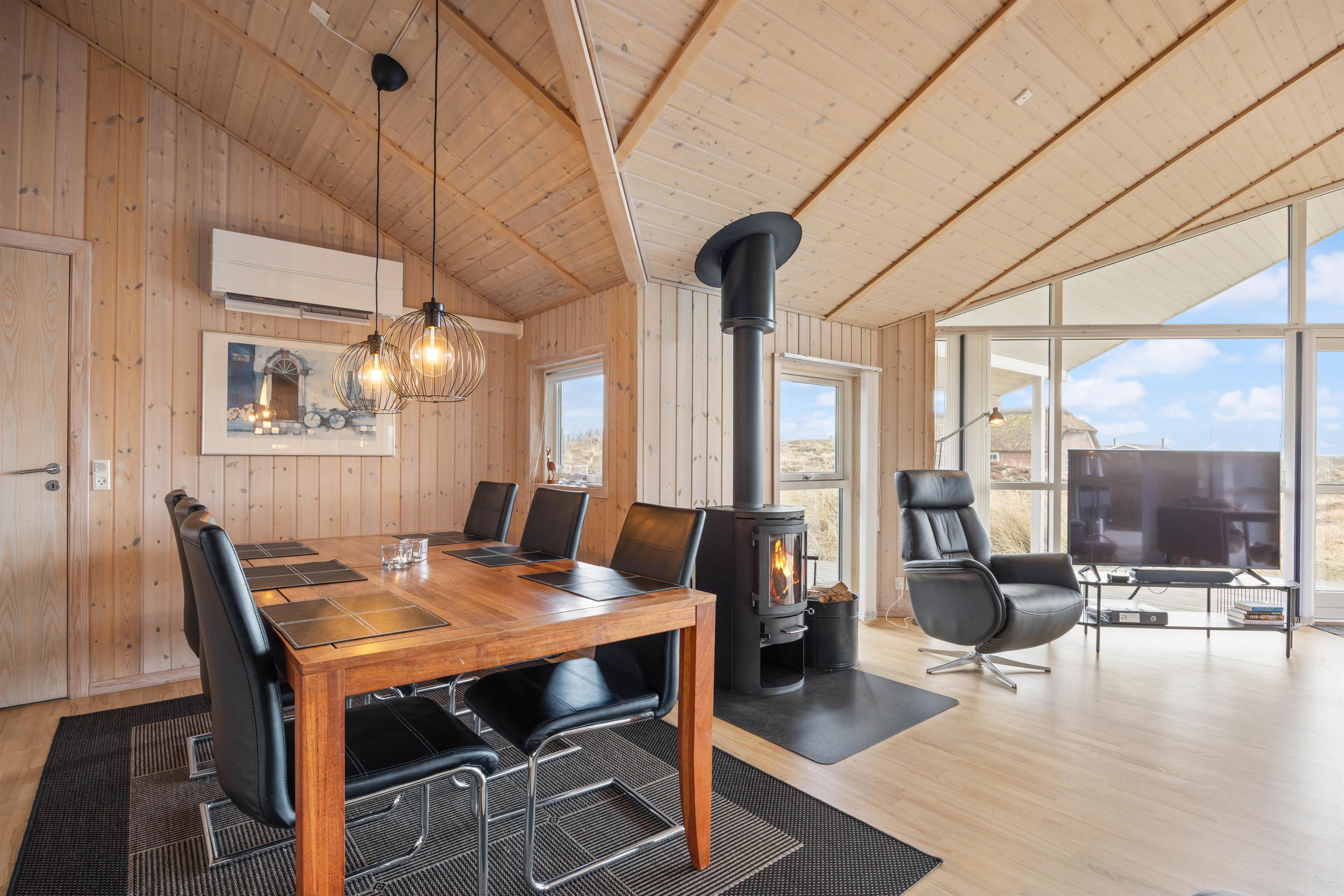 Fra det store glasparti i stuen strømmer lyset ind, og man kan kun føle sig godt tilpas. Slap af med en bog i de komfortable møbler, mens brændeovnen knitrer i baggrunden, eller se en god film på fjernsynet, som har et Apple-tv til fri afbenyttelse.