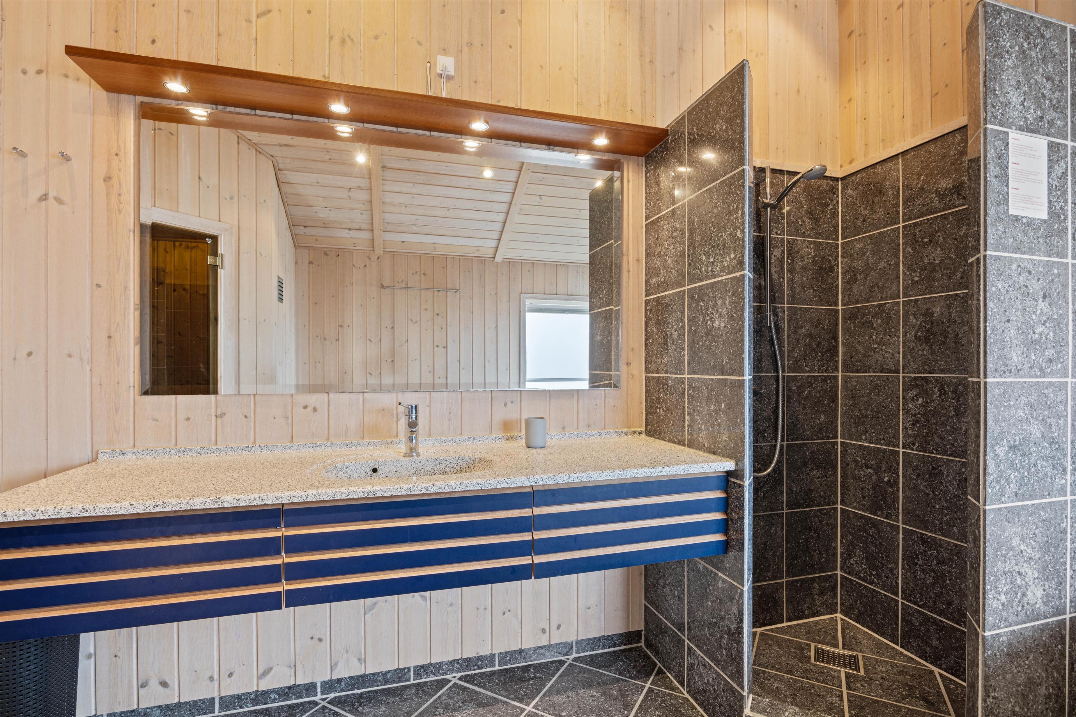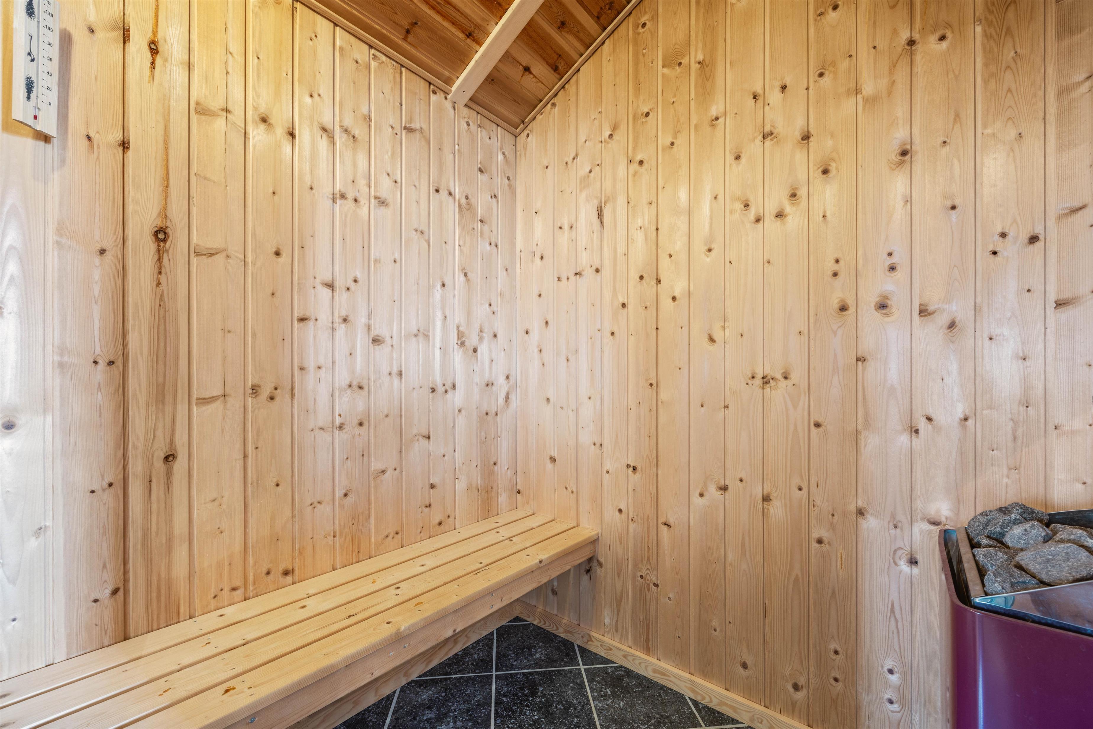 Sommerhuset er indrettet med 2 gode badeværelser, hvoraf det største gemmer på et af feriehusets highlights. Her får I nemlig en skøn wellnessoase med sauna og spabad, hvor I kan lade batterierne op efter en forfriskende dag på stranden.
