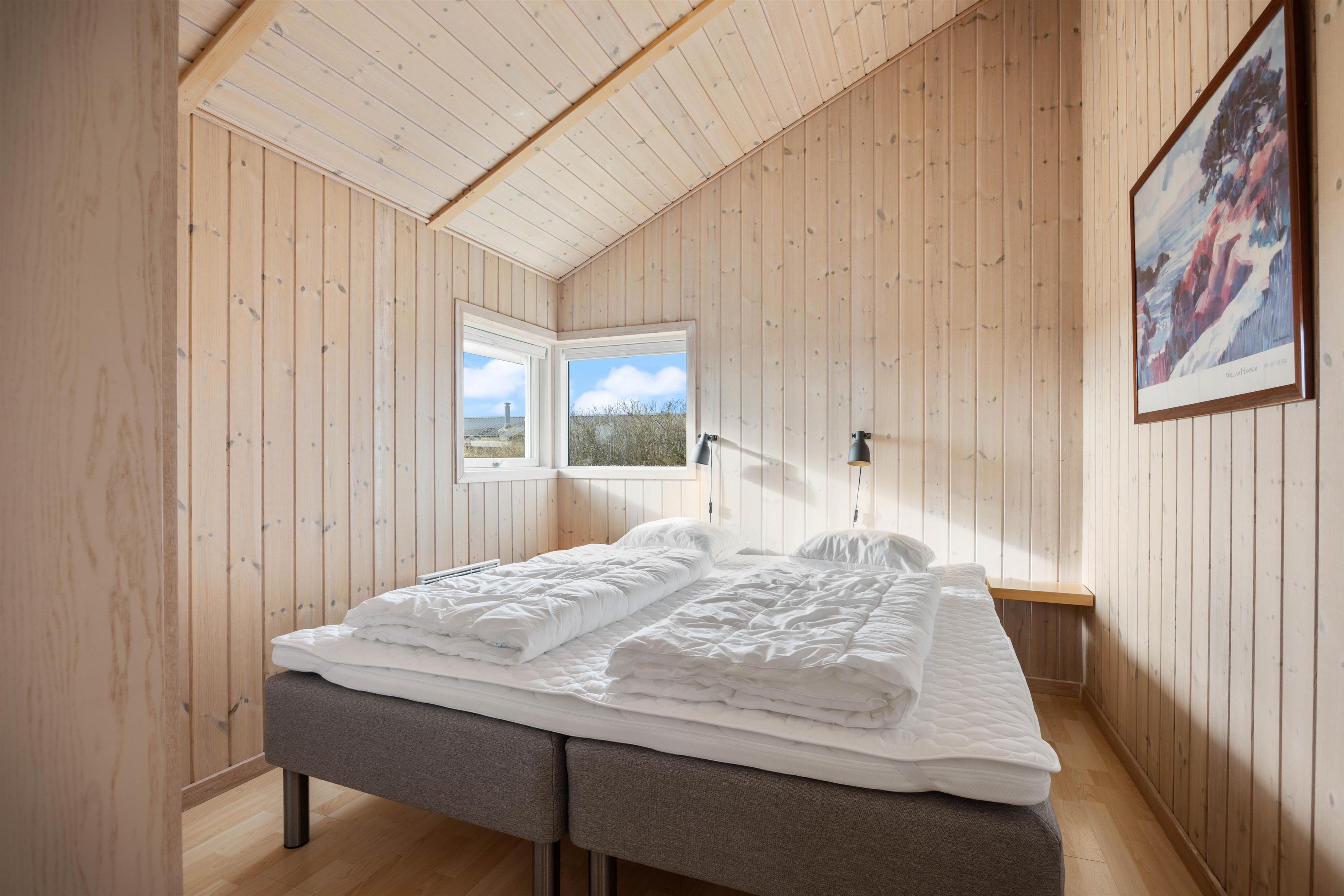 Kun 200 meter fra stranden finder I dette fine sommerhus med en skøn beliggenhed på en kuperet grund i Bjerregård. Feriehuset har plads til 6 personer, og indretningen byder blandt andet på et stort badeværelse med spabad og sauna.