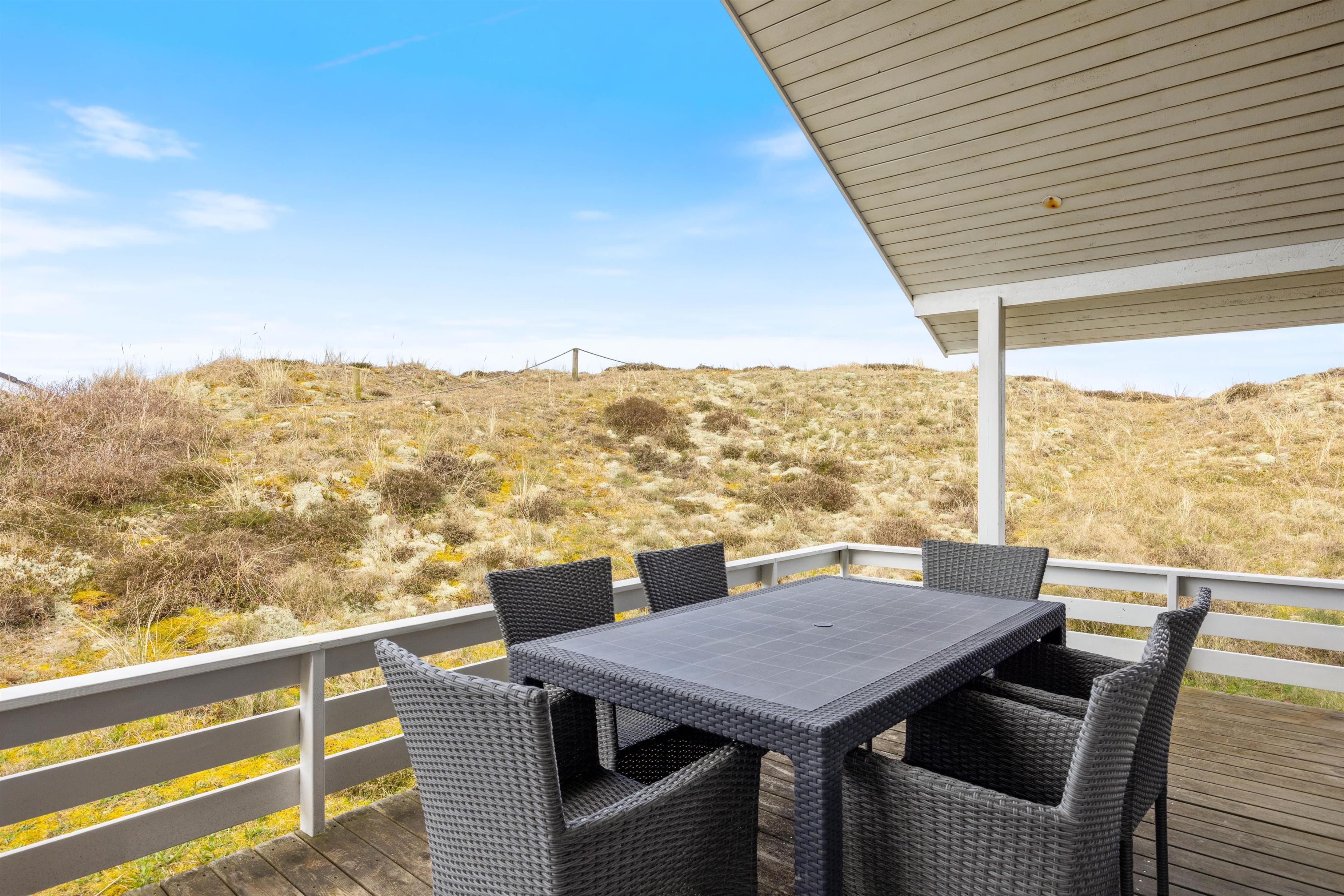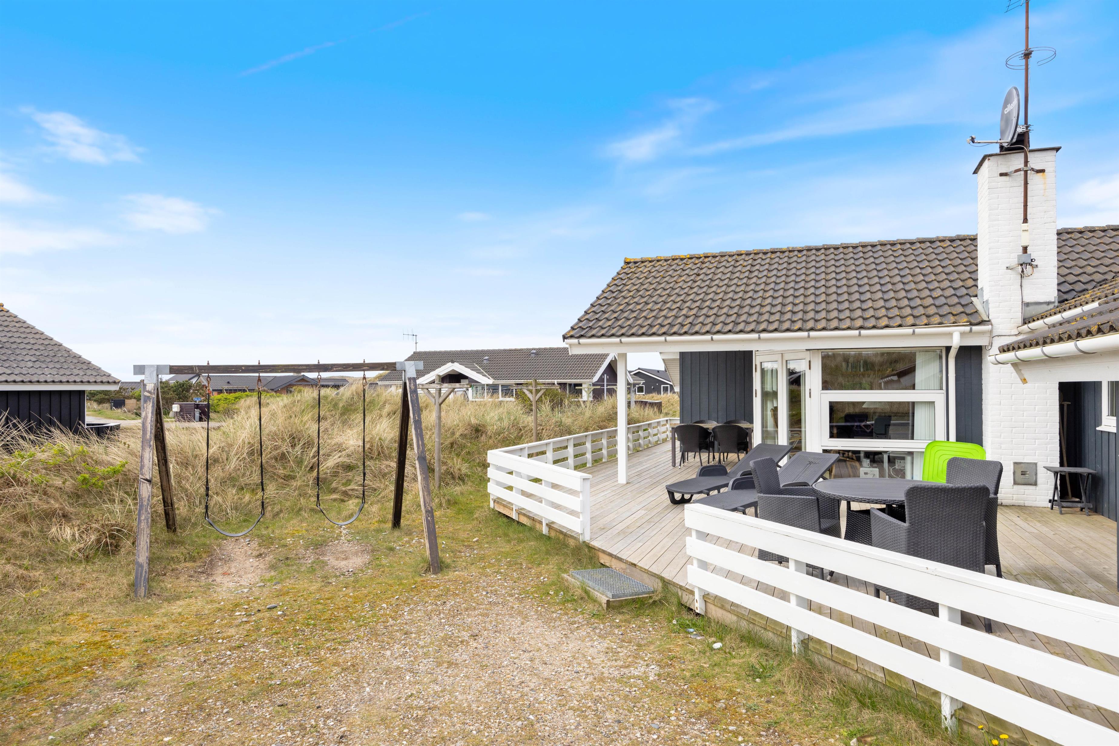 På terrassen kan I sætte jer godt til rette og nyde roen. Feriehuset er nemlig beliggende på en naturgrund i det attraktive Bjerregård, tæt på fredede hedearealer og Vesterhavet. På terrassen, der er delvist overdækket, kan I altid finde et hyggeligt spot til morgenkaffen eller frokost i skyggen. Havemøblerne venter blot på jer, og mens der slappes af på terrassen, kan børnene lege under opsyn på gyngerne.