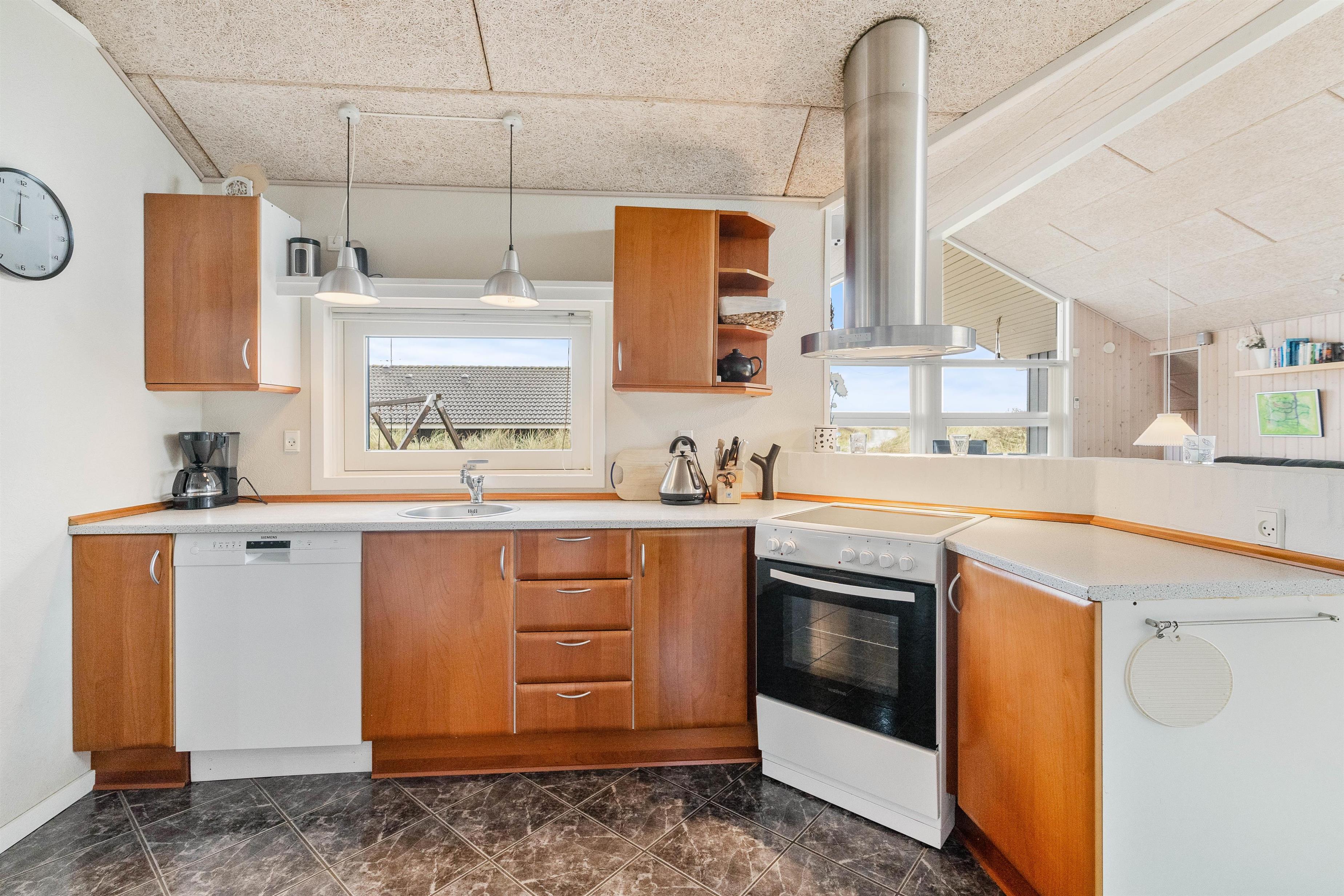 Sommerhuset på Bjerregårdsvej 300 kan huse op mod seks feriegæster, der kan nyde ferien i gode omgivelser. Lysindfaldet og de store vinduespartier i opholdsstuen giver sommerhuset et helt særligt præg af at være midt i naturen. Her kan I alle samles til hyggelige spilleaftner i sofaen, og på de køligere aftner, kan I tænde op i brændeovnen for at gøre det ekstra hyggeligt. Her er endda en alkove, hvis man får brug for et hvil midt på dagen, mens der bages eller forberedes aftensmad i køkkenet. Måske I skal samles omkring spisebordet med tapas og god vin?