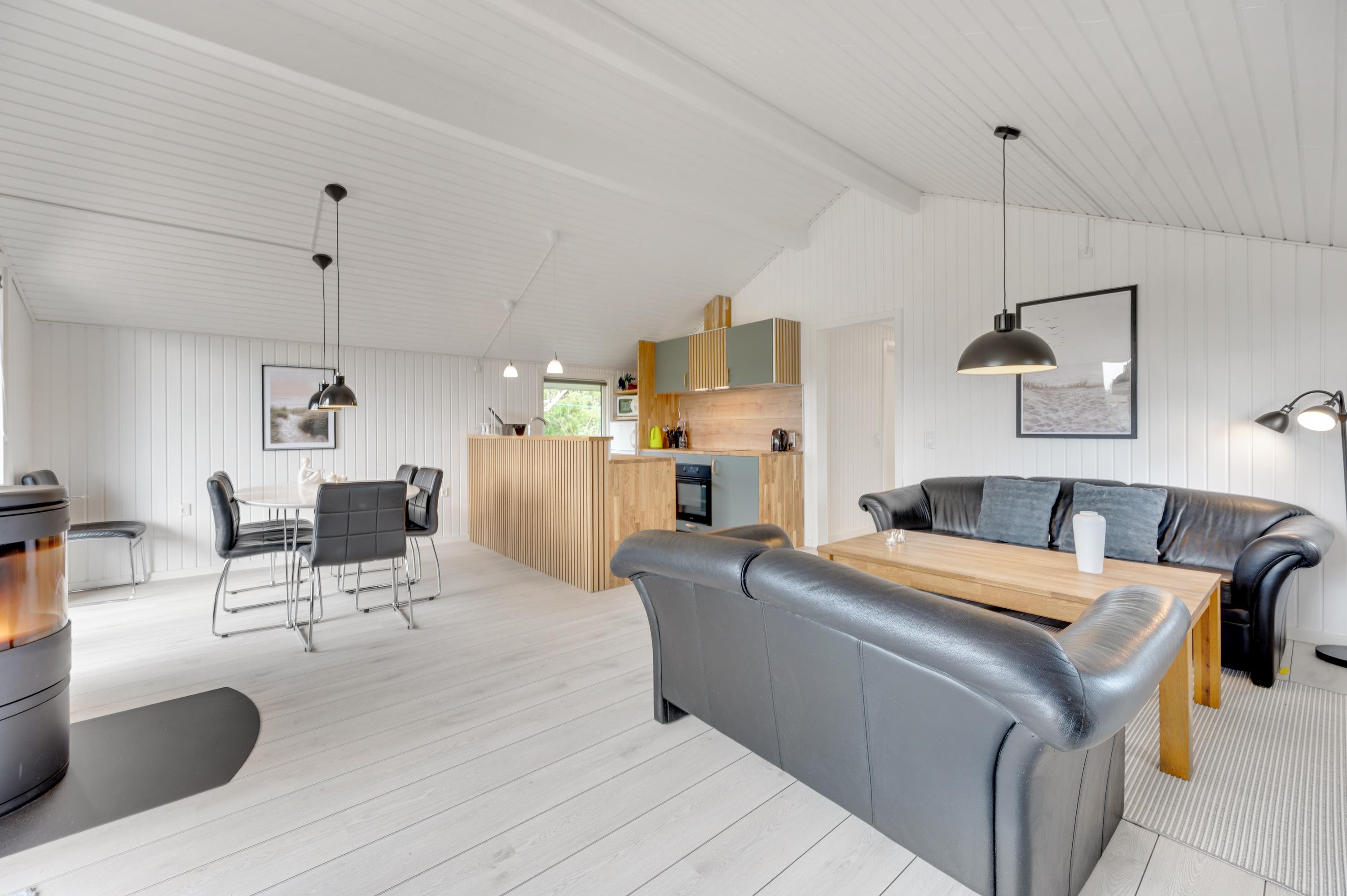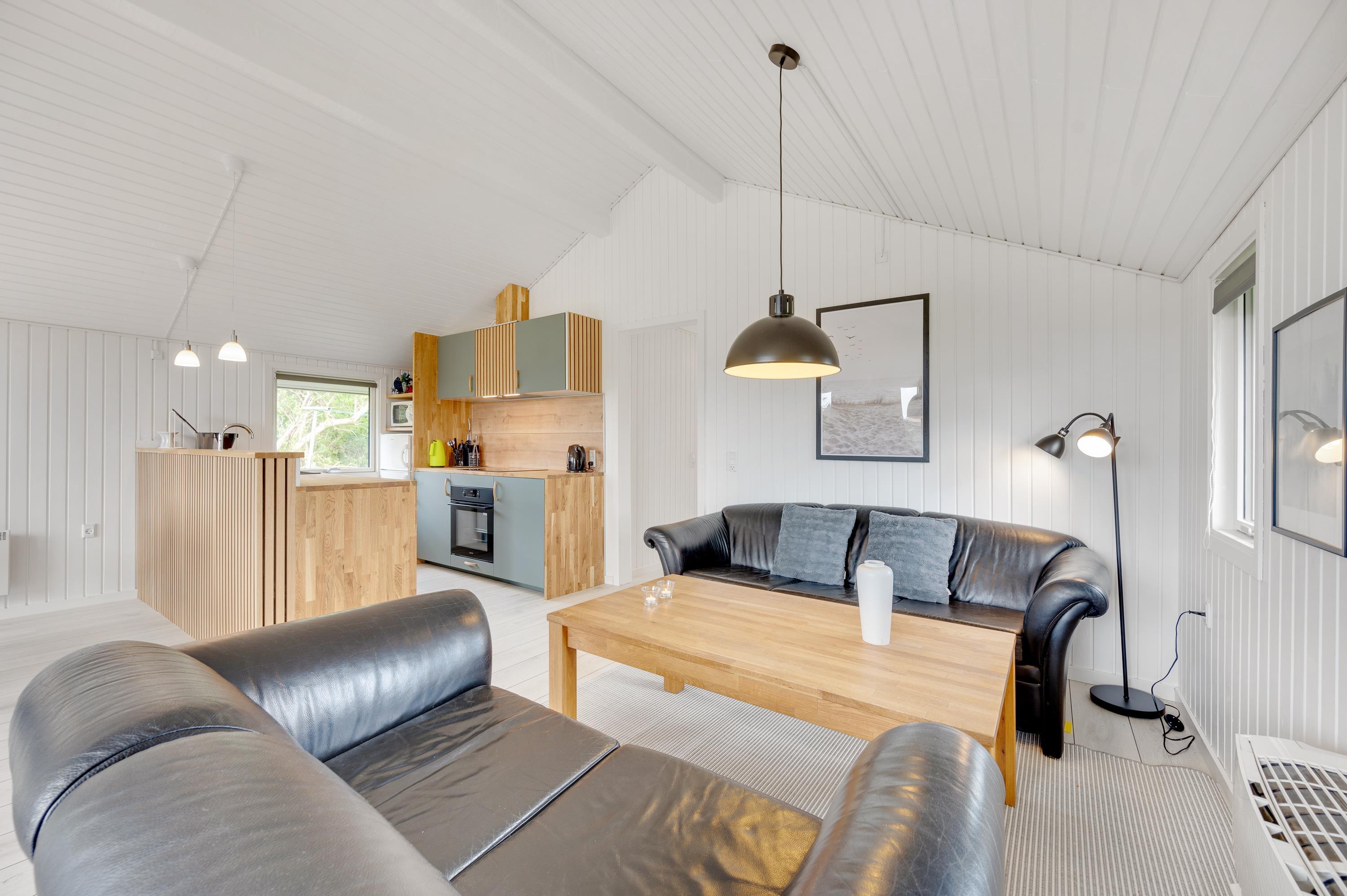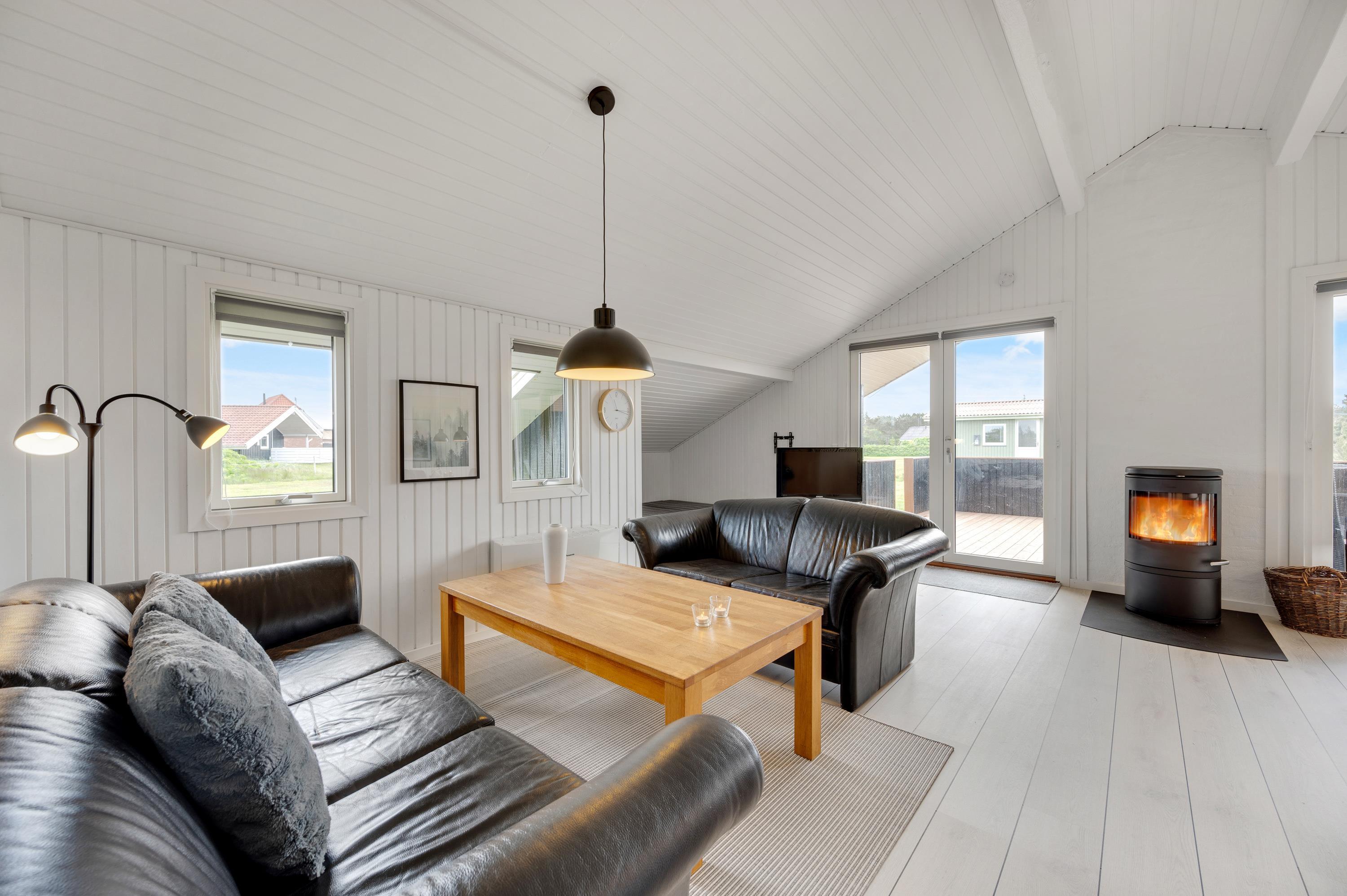 Køkkenet er udstyret med opvaskemaskine, mikroovn og køleskab med lille fryser. Køkkenet står i åben forbindelse med den hyggelige stue, som bl.a. er udstyret med en god brændeovn og fladskærm. I stuen er der en stor alkove, hvor du kan slappe af og hygge dig, f.eks. med en god bog. Her er desuden gratis trådløst internet.