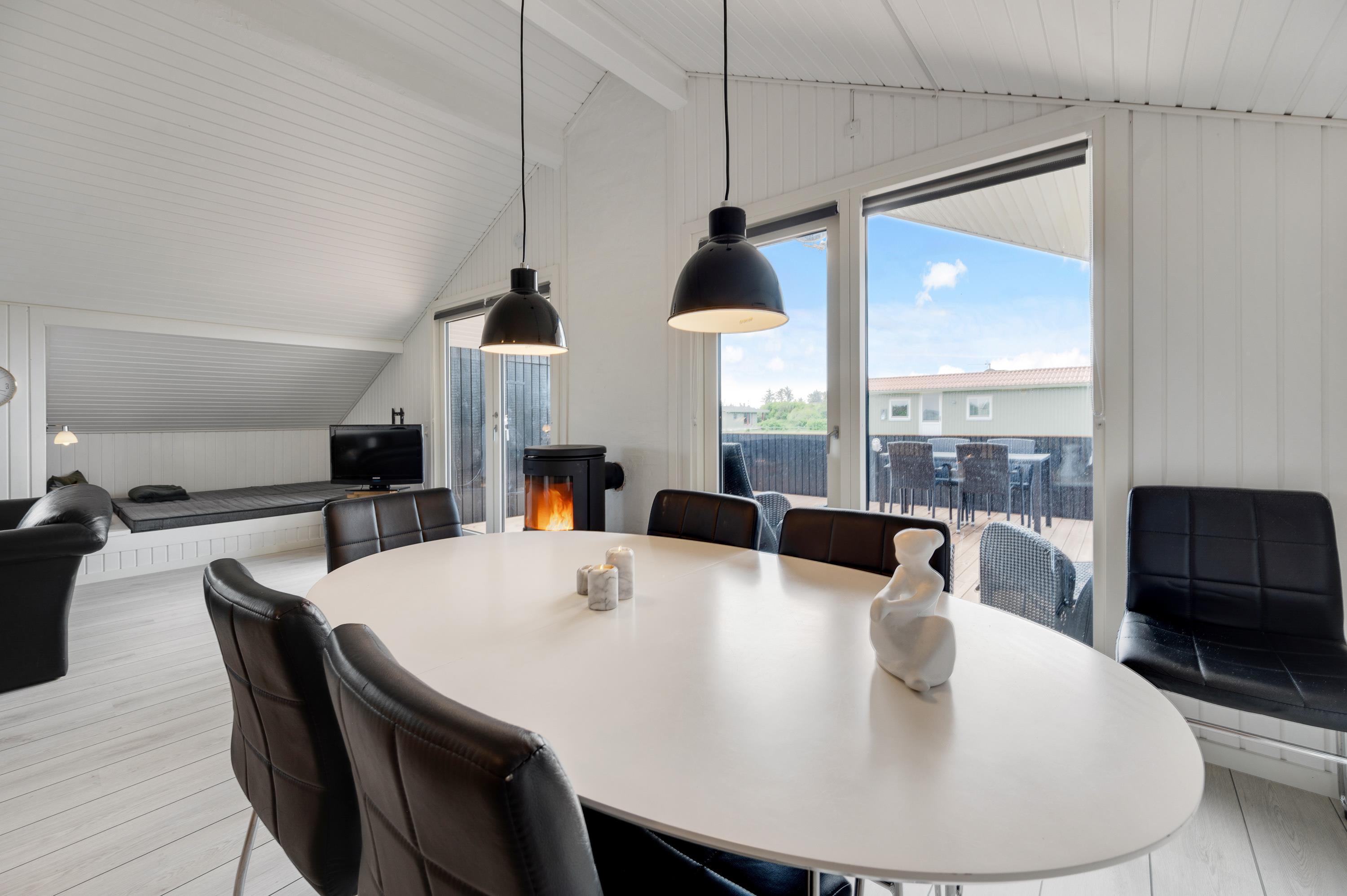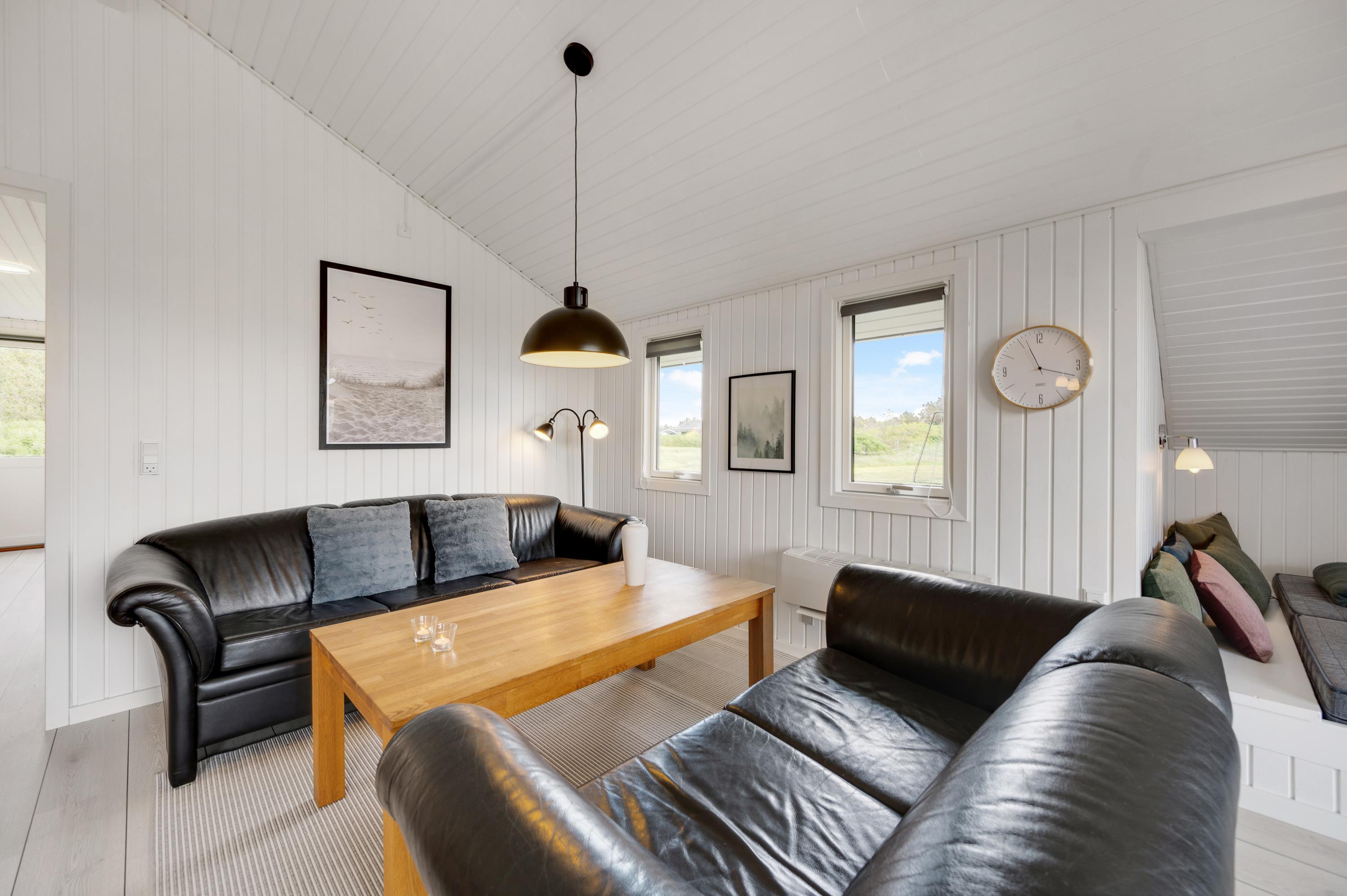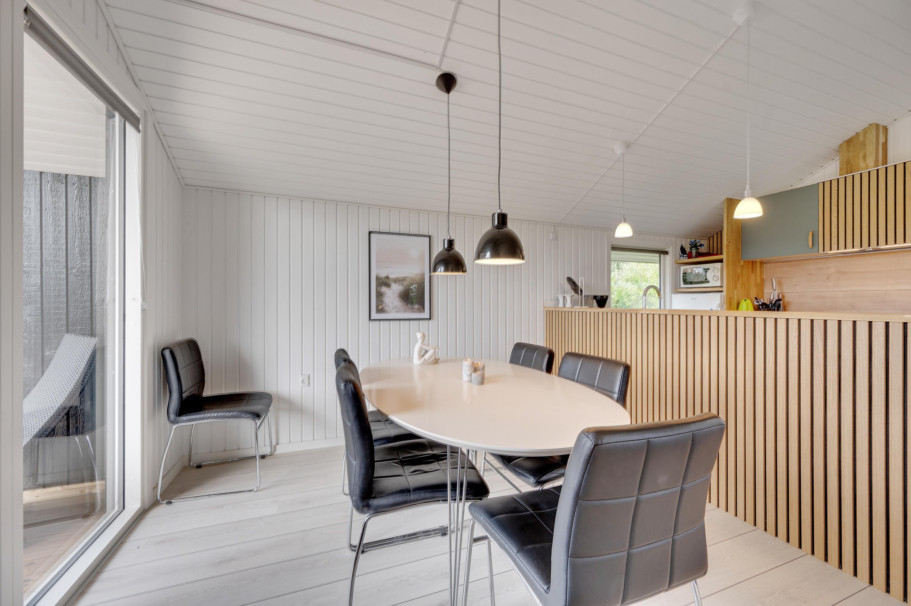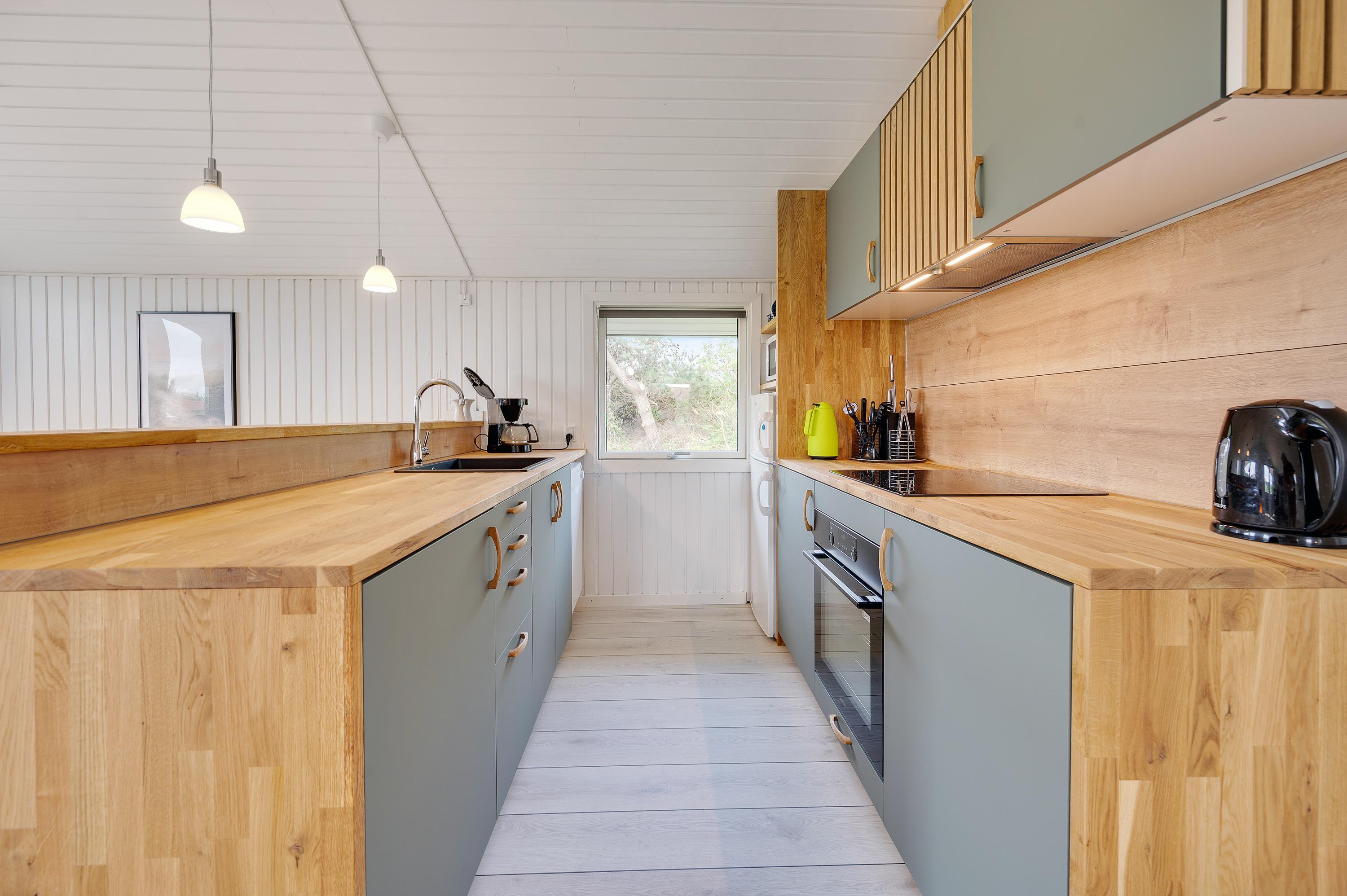 Køkkenet er udstyret med opvaskemaskine, mikroovn og køleskab med lille fryser. Køkkenet står i åben forbindelse med den hyggelige stue, som bl.a. er udstyret med en god brændeovn og fladskærm. I stuen er der en stor alkove, hvor du kan slappe af og hygge dig, f.eks. med en god bog. Her er desuden gratis trådløst internet.