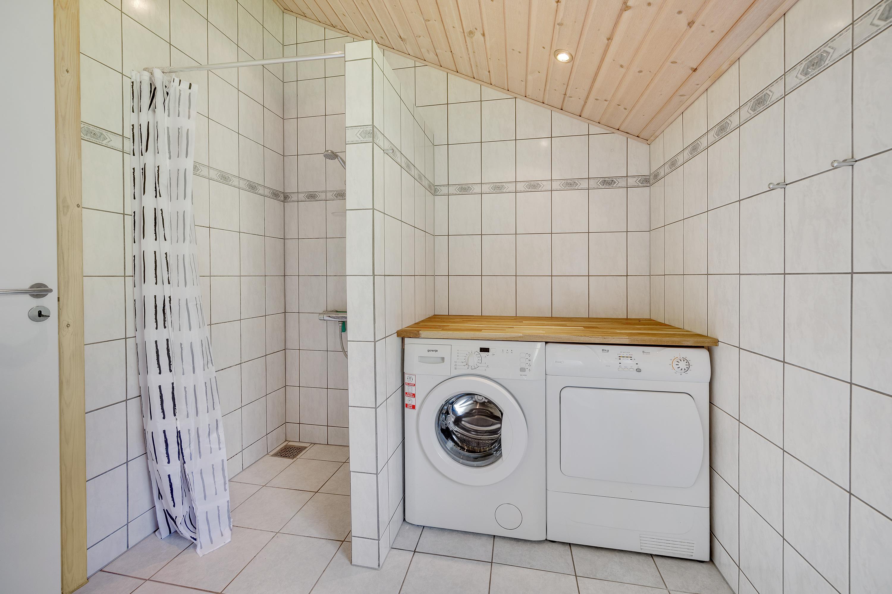 Her er et stort og flot badeværelse med vaskemaskine og tørretumbler, bruseniche og gulvvarme.