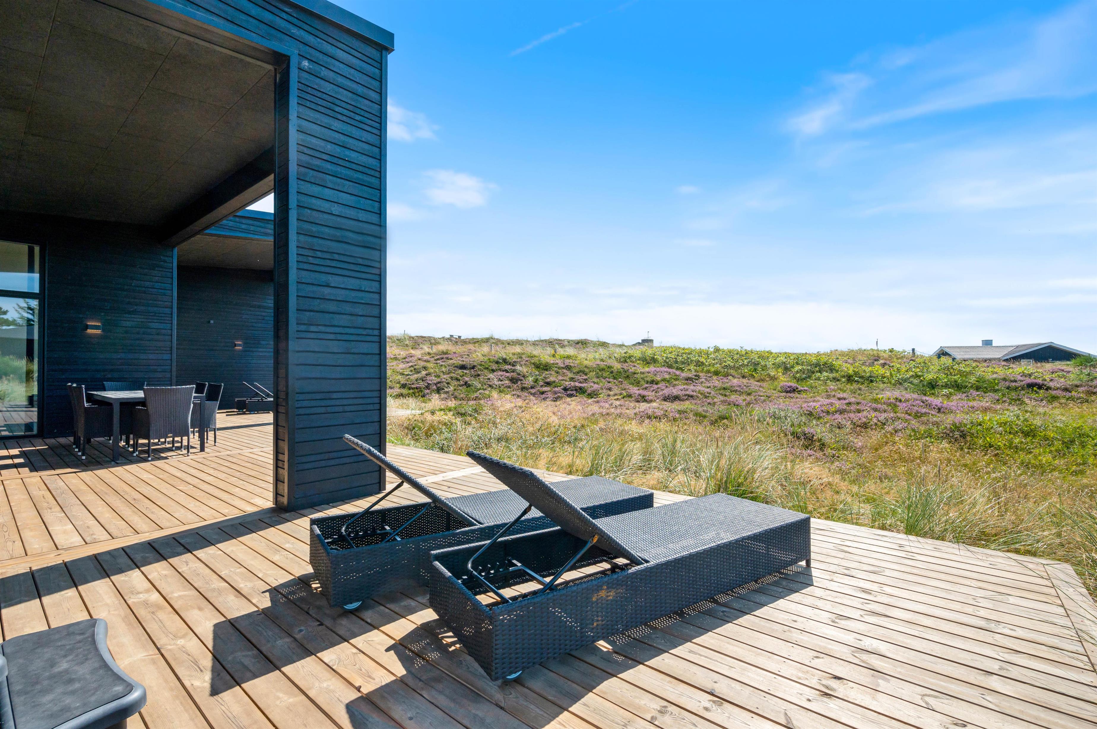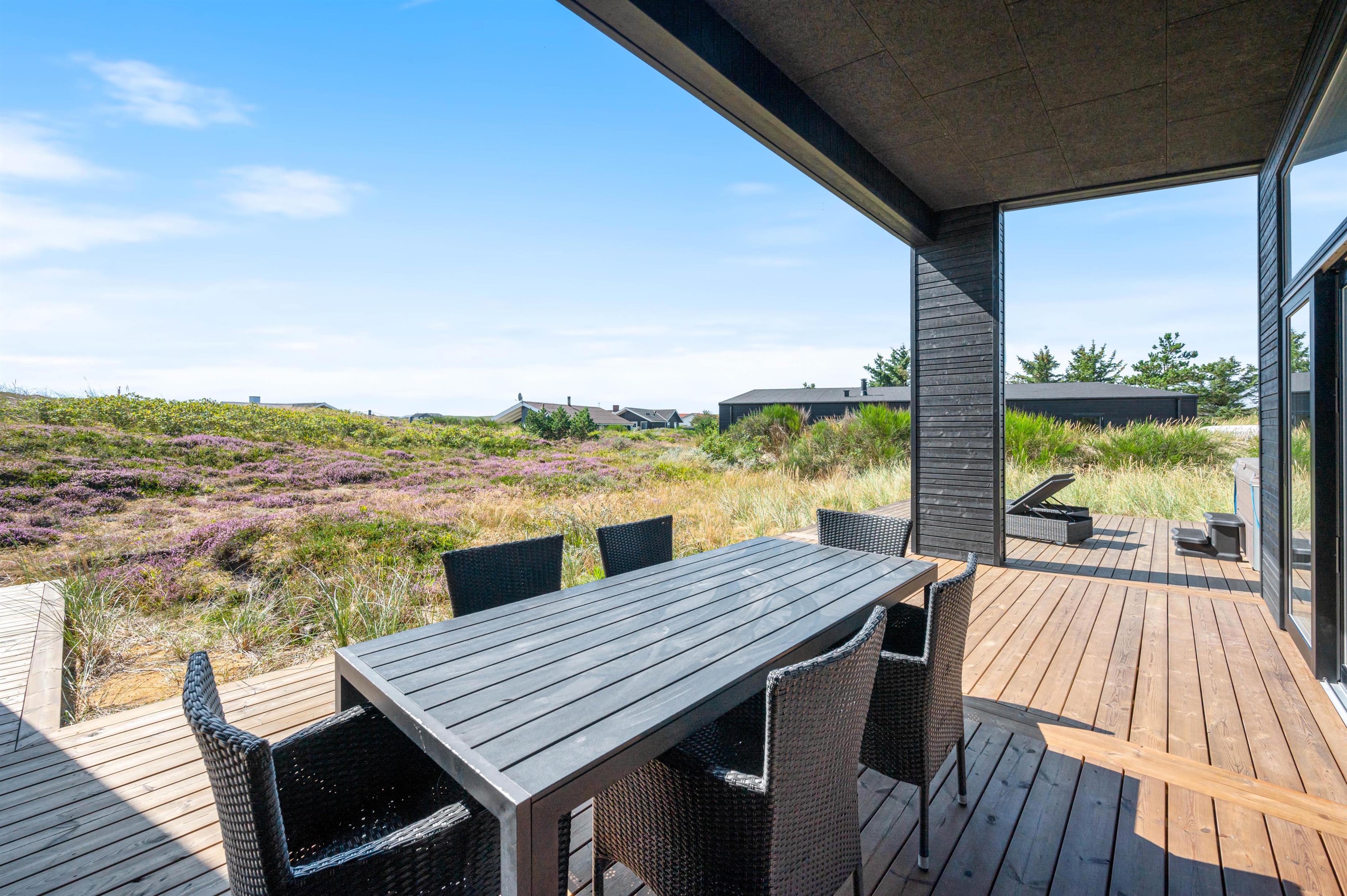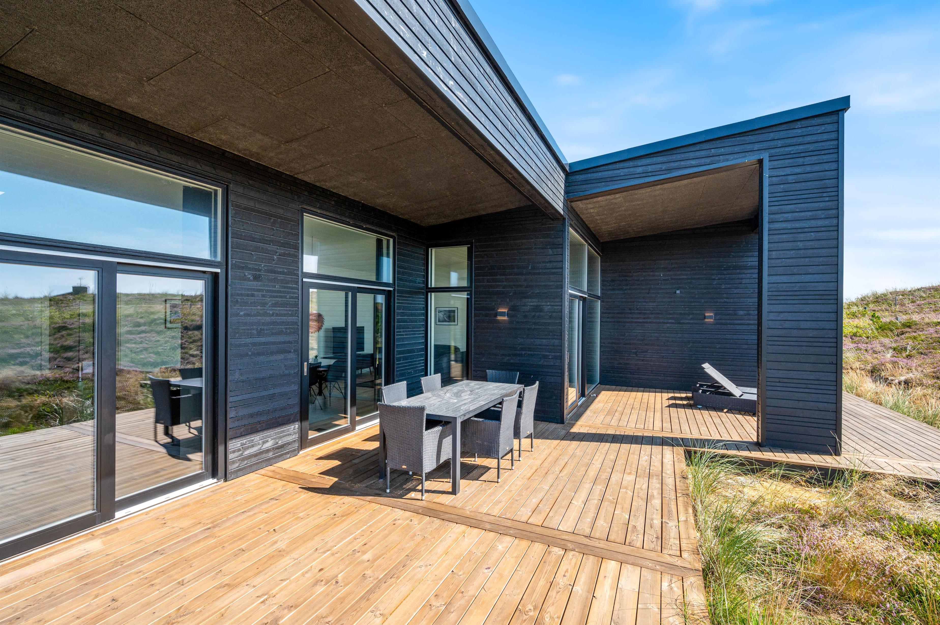 Rundt om hele feriehuset løber en dejlig træterrasse, så der er mulighed for at nyde solen dagen lang. En del af terrassen mod syd er overdækket, så I kan nemt finde skygge i dagtimerne samt nyde de lange sommeraftner ude – selv efter duggens fald. Den øst- og vestvendte del af terrassen giver jer mulighed for at nyde de smukke solopgange og solnedgange, der selvfølgelig også nemt nydes fra første parket ved Vesterhavet, der bare ligger 500 meters gang fra sommerhuset.