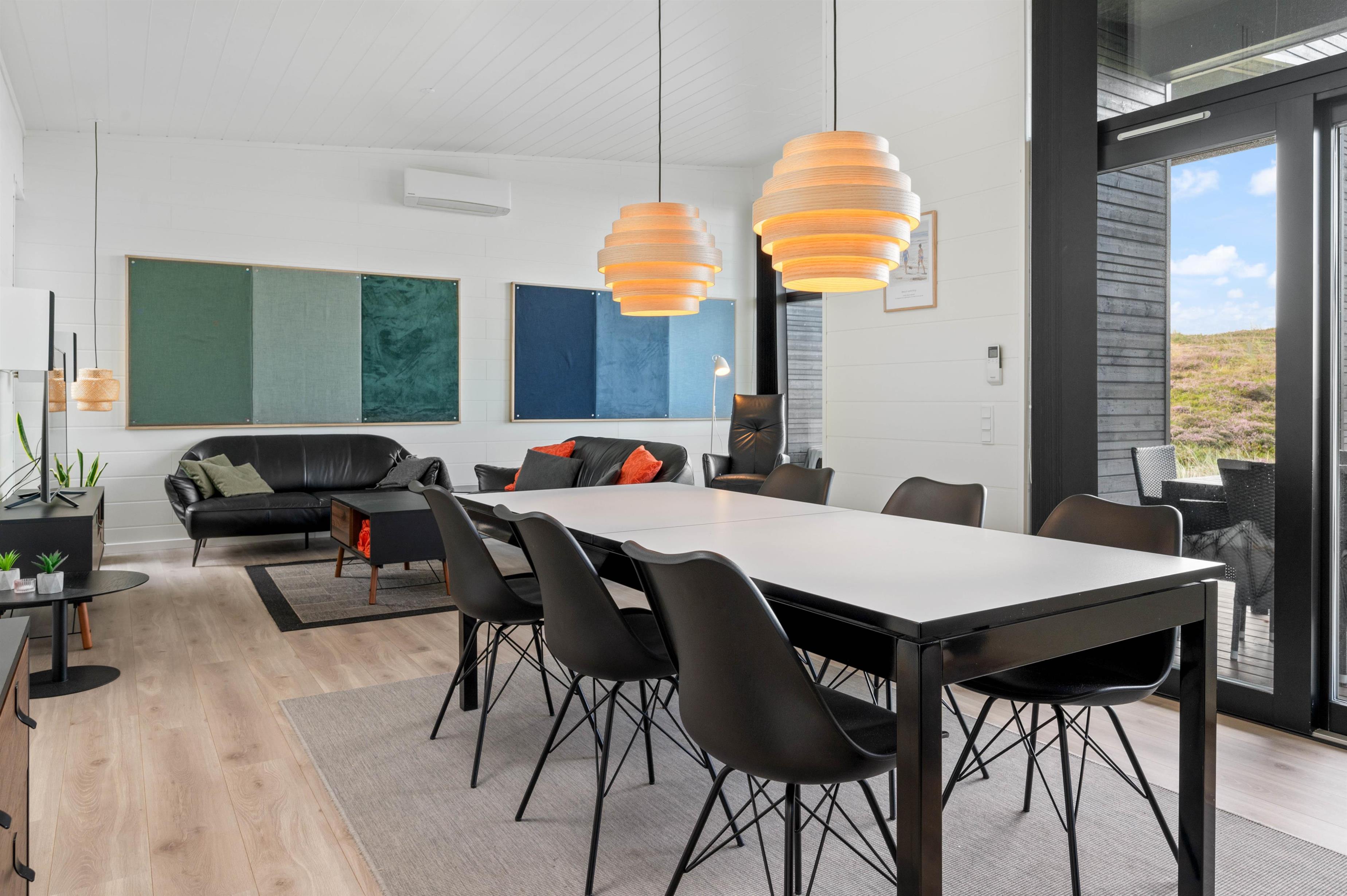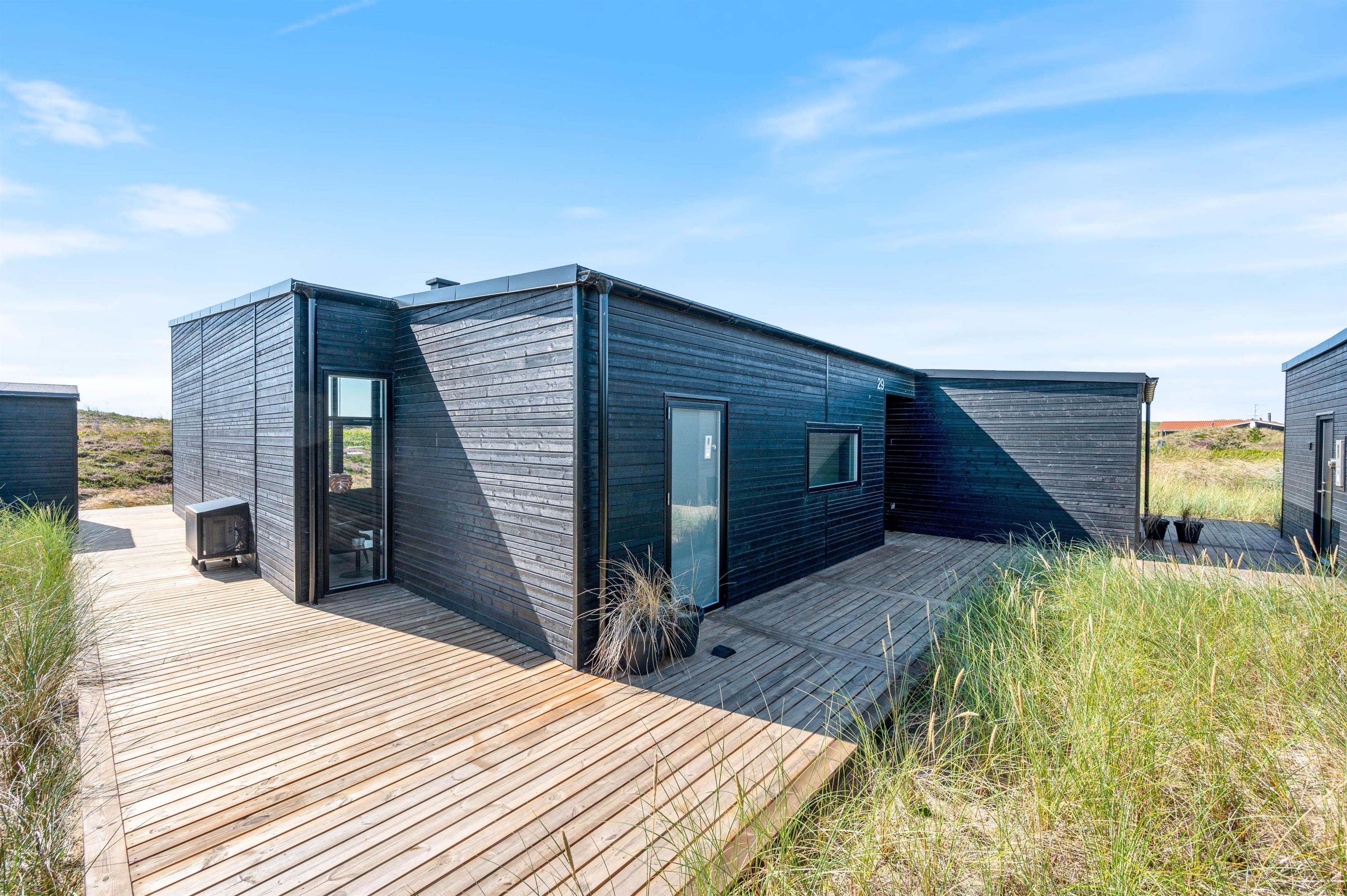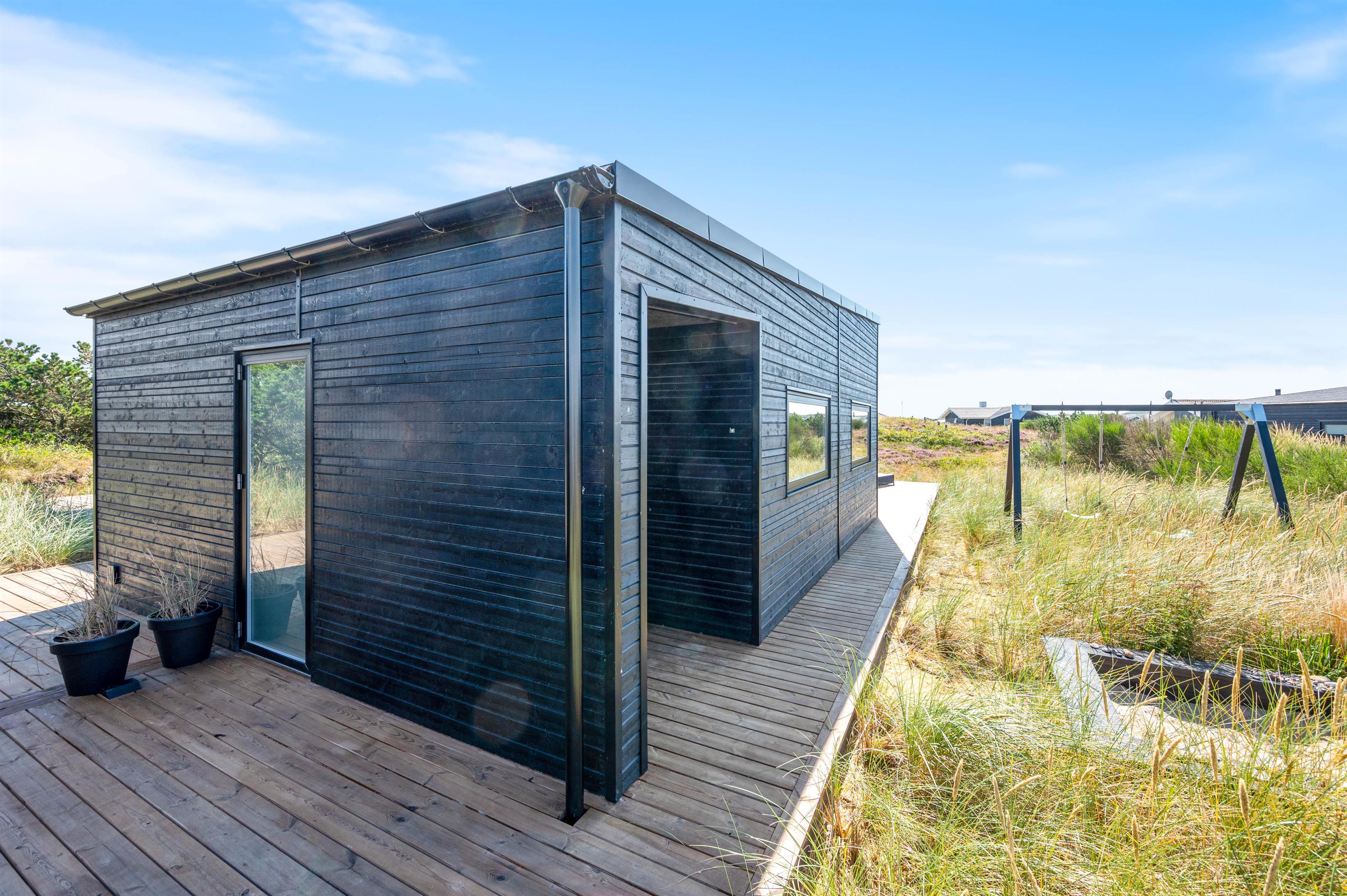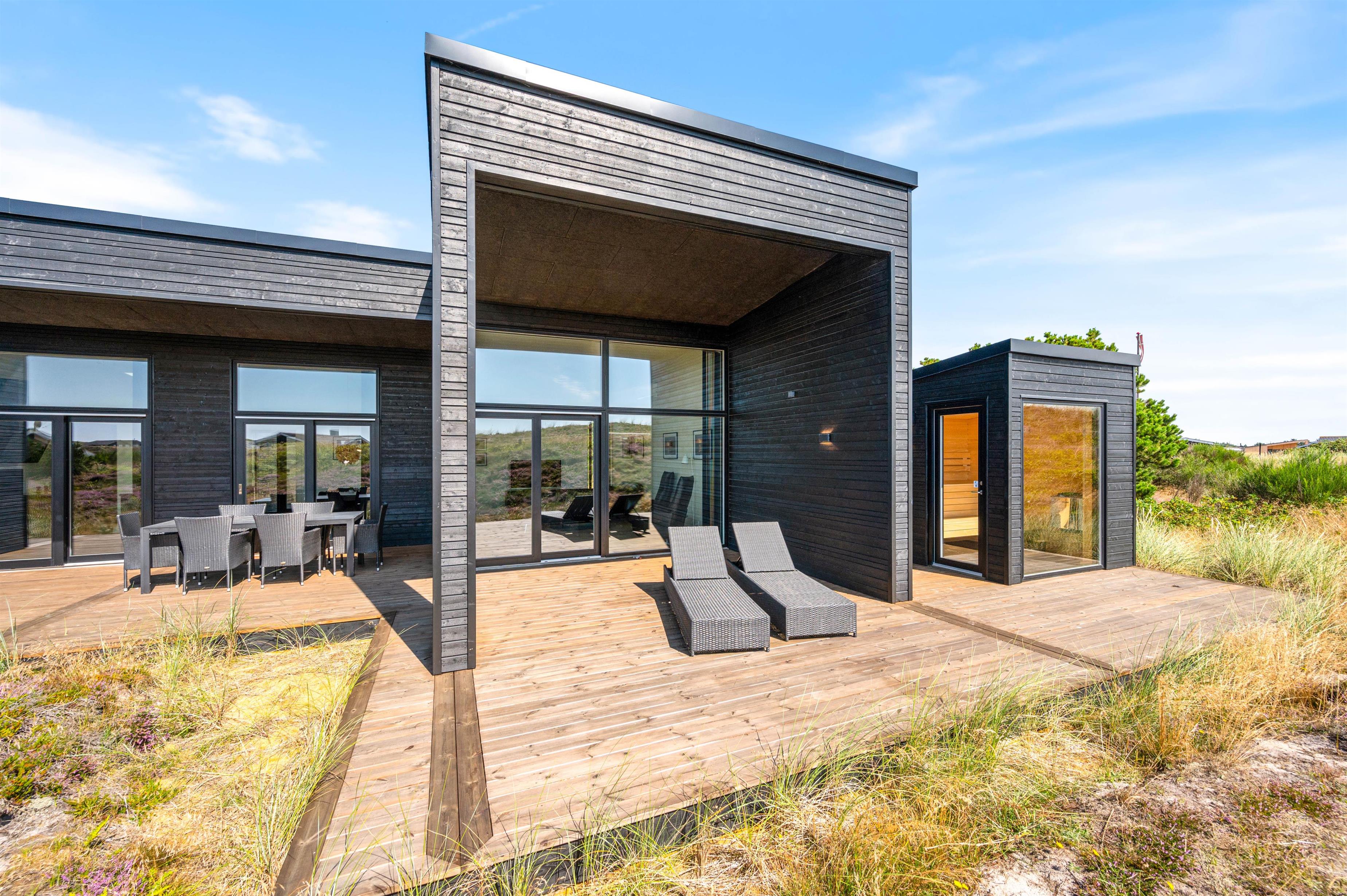 Rundt om hele feriehuset løber en dejlig træterrasse, så der er mulighed for at nyde solen dagen lang. En del af terrassen mod syd er overdækket, så I kan nemt finde skygge i dagtimerne samt nyde de lange sommeraftner ude – selv efter duggens fald. Den øst- og vestvendte del af terrassen giver jer mulighed for at nyde de smukke solopgange og solnedgange, der selvfølgelig også nemt nydes fra første parket ved Vesterhavet, der bare ligger 500 meters gang fra sommerhuset.
