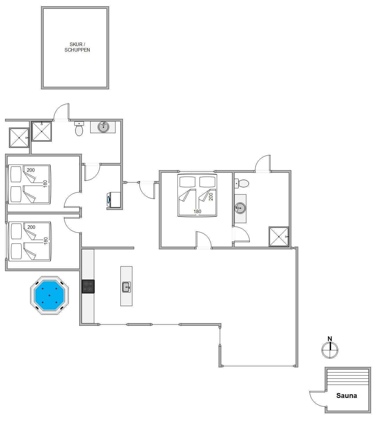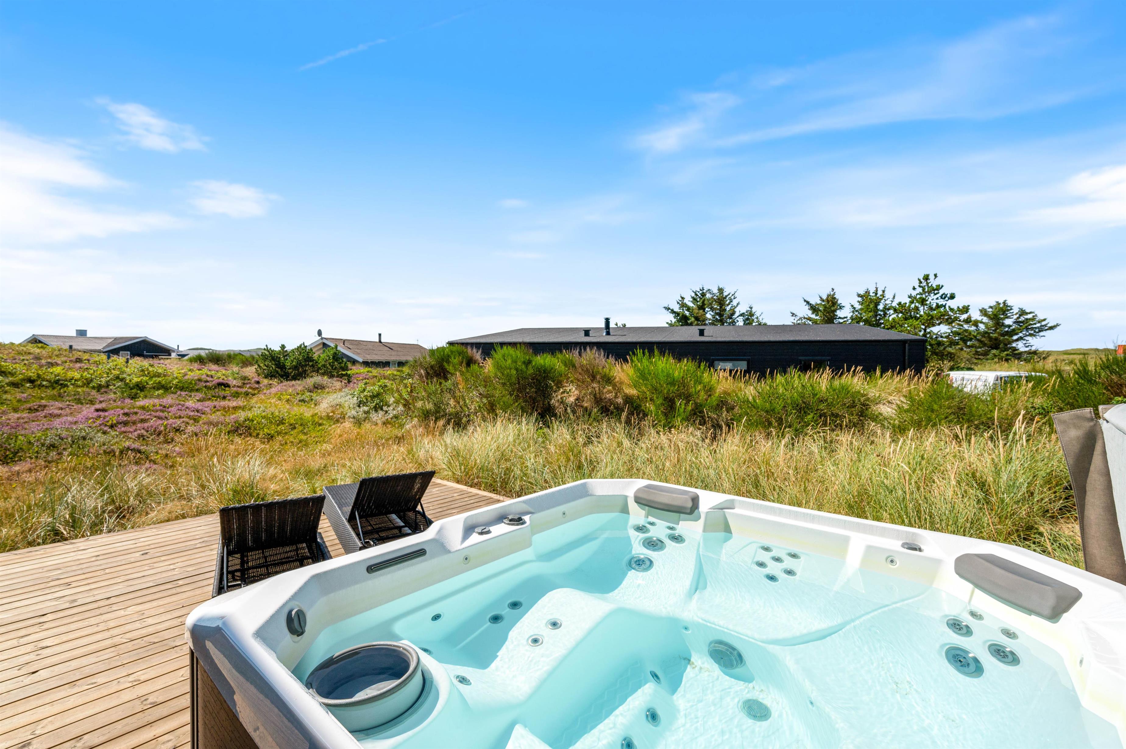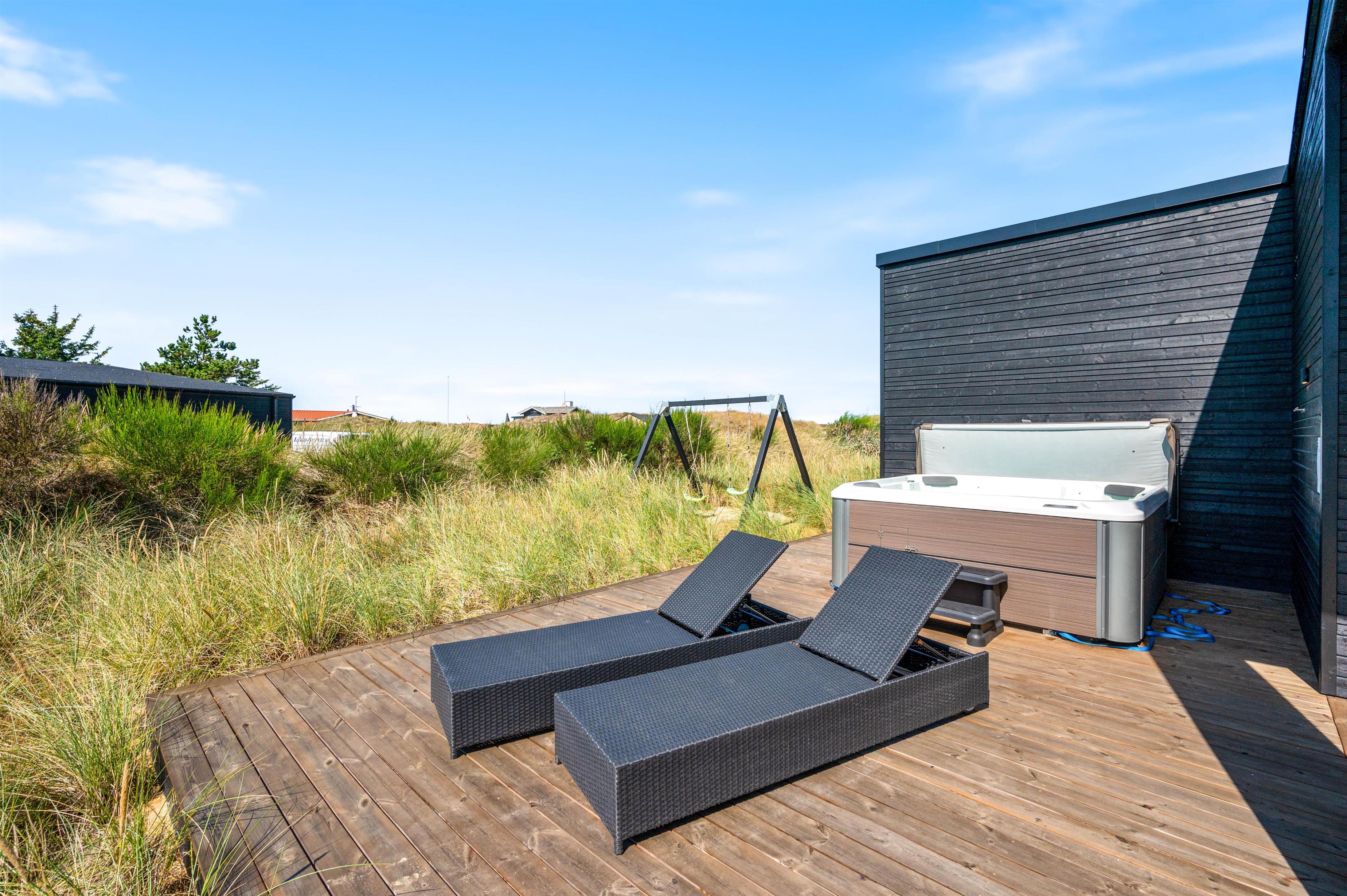 På terrassen mod syd finder I også både udespa og sauna med udsigt til klitterne – en fantastisk fornemmelse at kunne sidde midt i det skønne klitlandskab i de koldere måneder og nyde saunaens varme eller sidde under den smukke stjernehimmel i den boblende udespa. Udebruseren står fra april til november til rådighed, hvor du kan vaske sand og salt af efter en tur ved stranden.