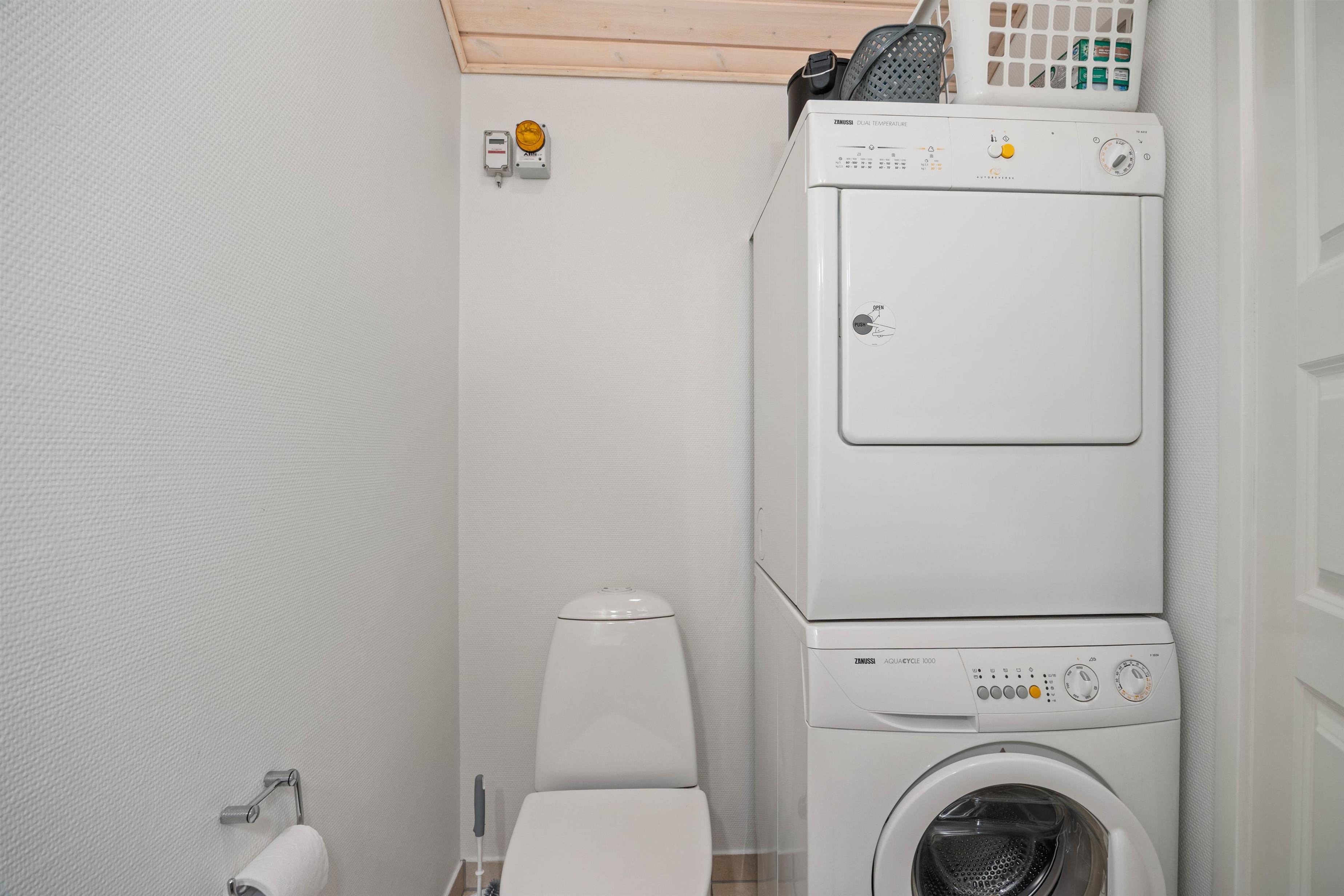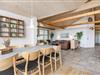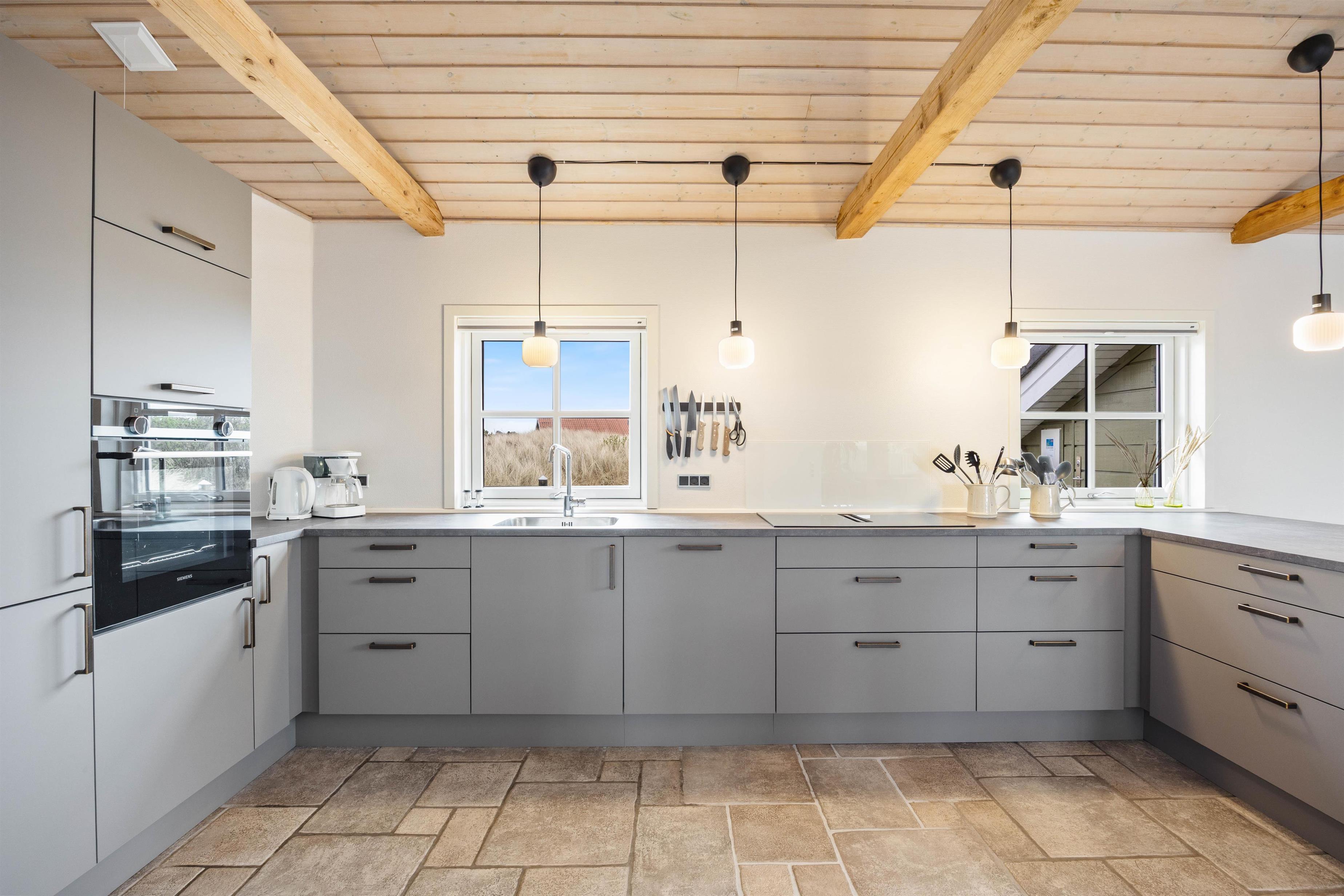 Sommerhuset er lækkert indrettet, og her er tænkt på det meste, så du kan holde en skøn og afslappende ferie i dejlige omgivelser. I det store opholdsrum er der er dejligt lysindfald fra de mange vinduerne, og bjælkerne i loftet sætter prikket over i'et, og gør det ekstra hyggeligt. Her kan I tilbringe tid sammen i sofaen, spille brætspil og lave mad i det veludstyrede køkken, mens brændeovnen knitrer i baggrunden. Feriehuset er udstyret med både vaskemaskine og tørretumbler, så I altid kan have rent tøj. Derudover er der også både barneseng og barnestol til rådighed.