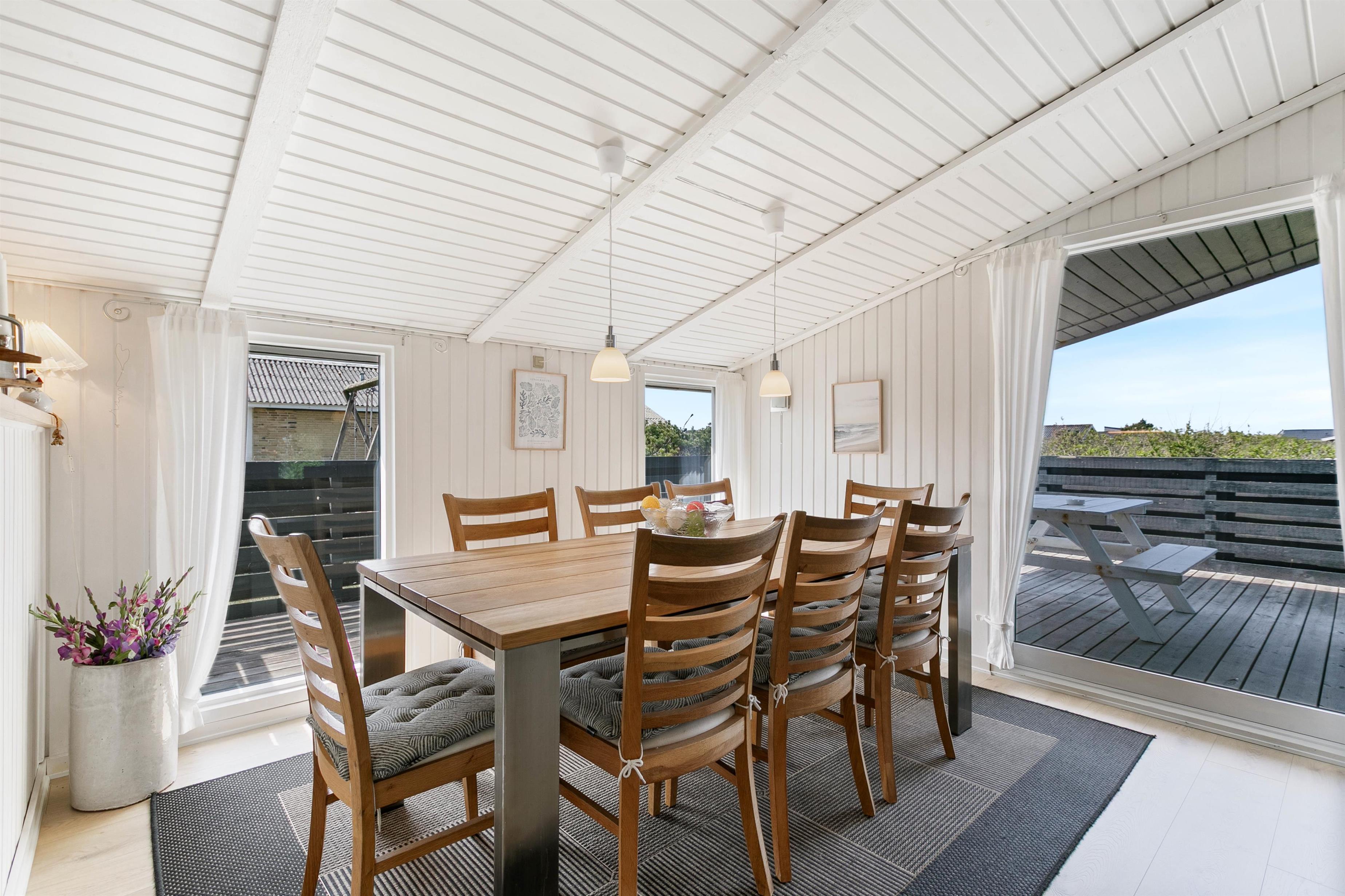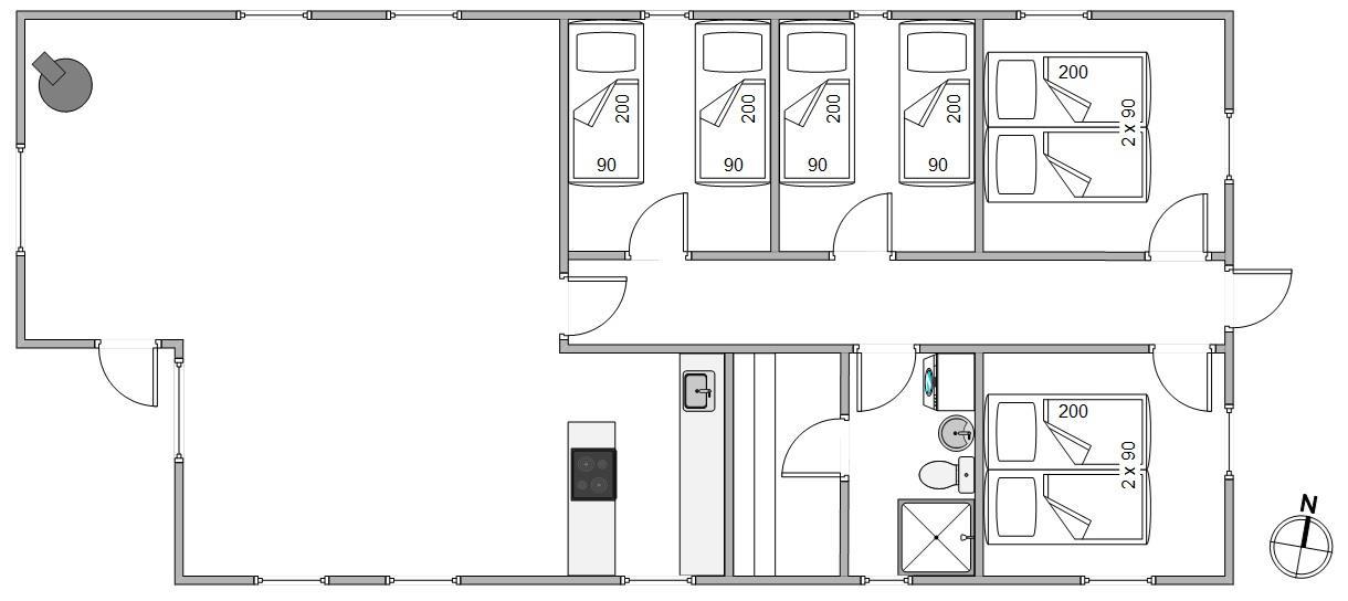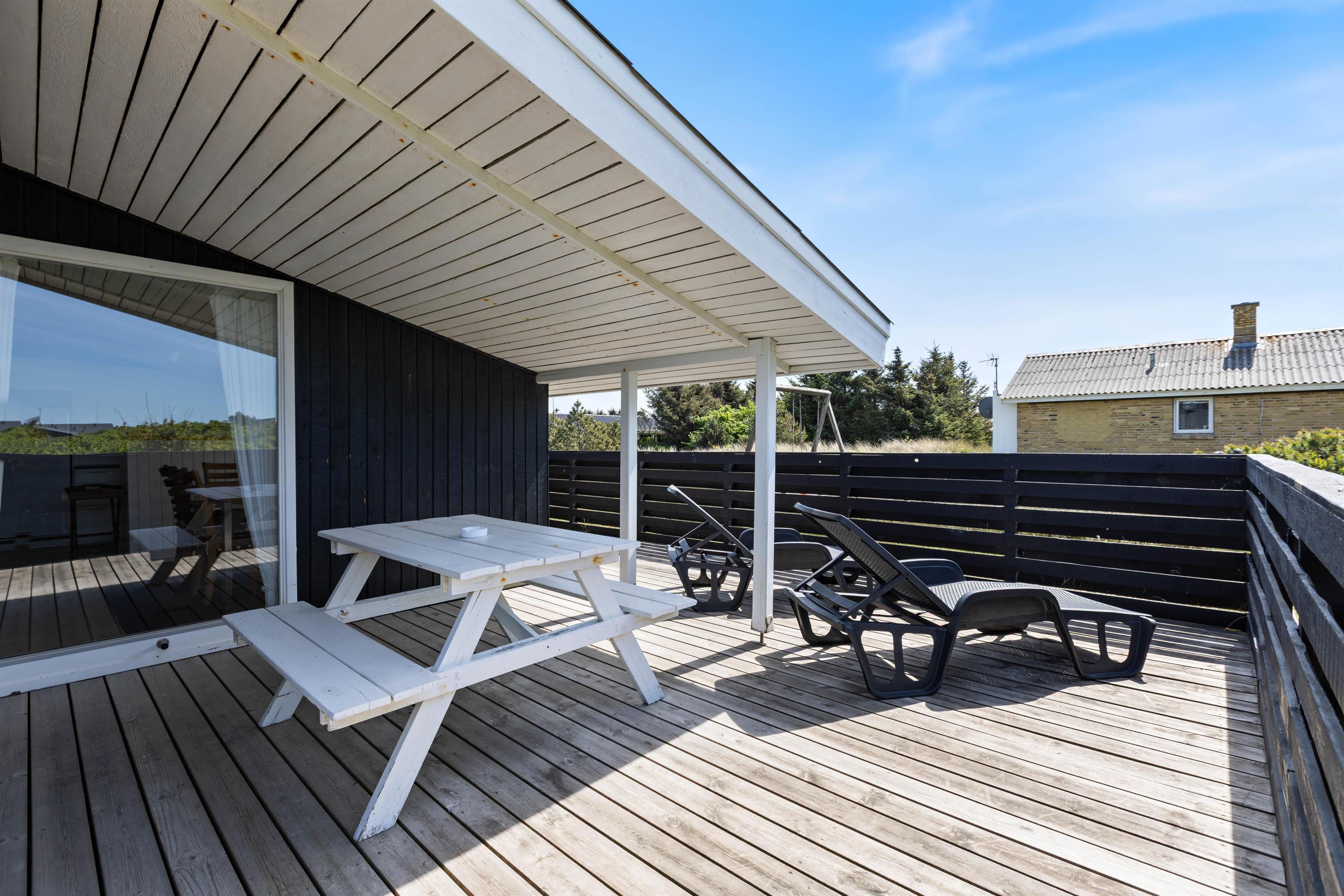2 lukkede terrasser ligger i forlængelse af sommerhuset mod øst og vest. Her er der plads nok til, at alle familiemedlemmer kan finde en plads i solen, og I kan roligt lade børnene lege udenfor, mens I laver aftensmad i køkkenet eller steger bøffer på grillen.