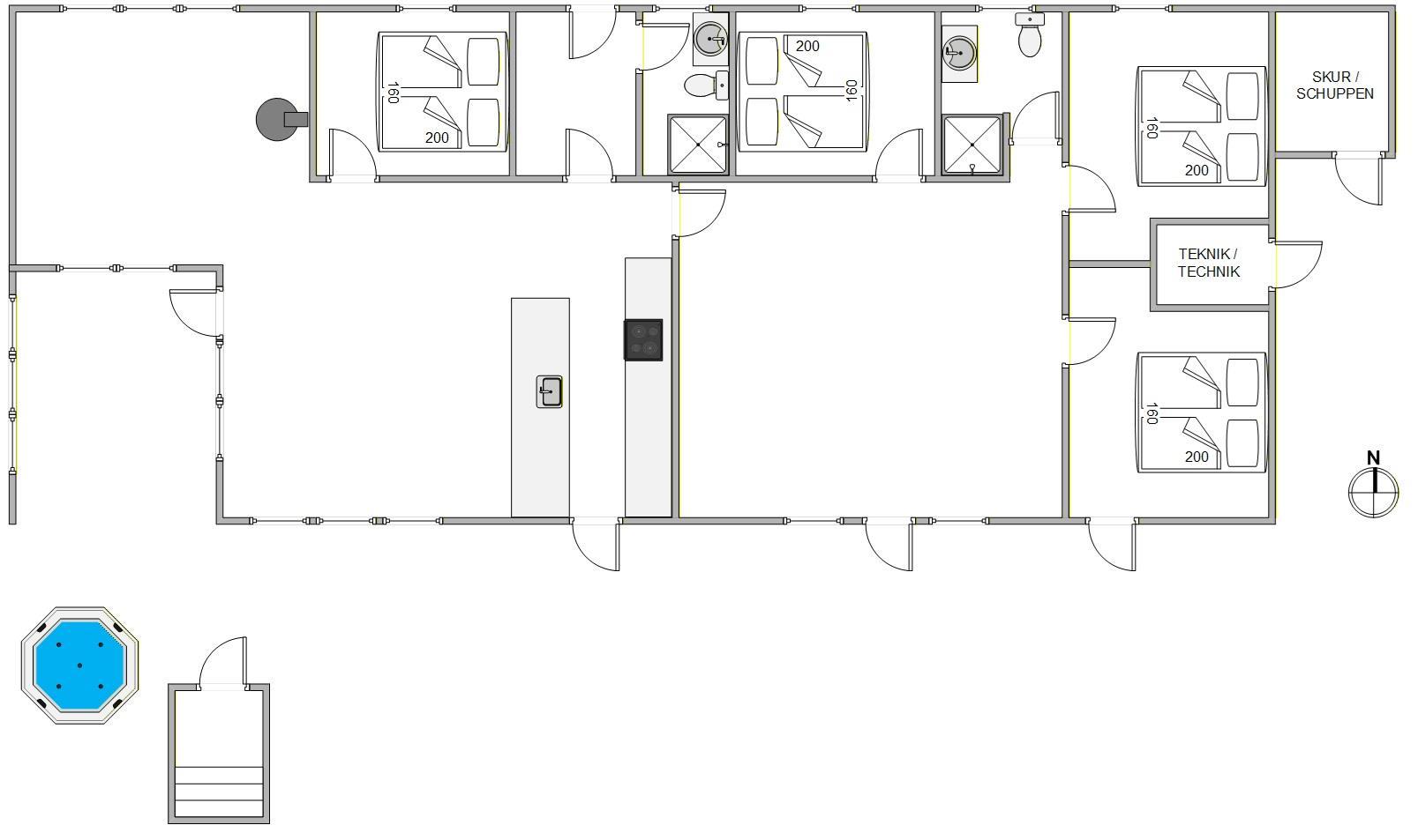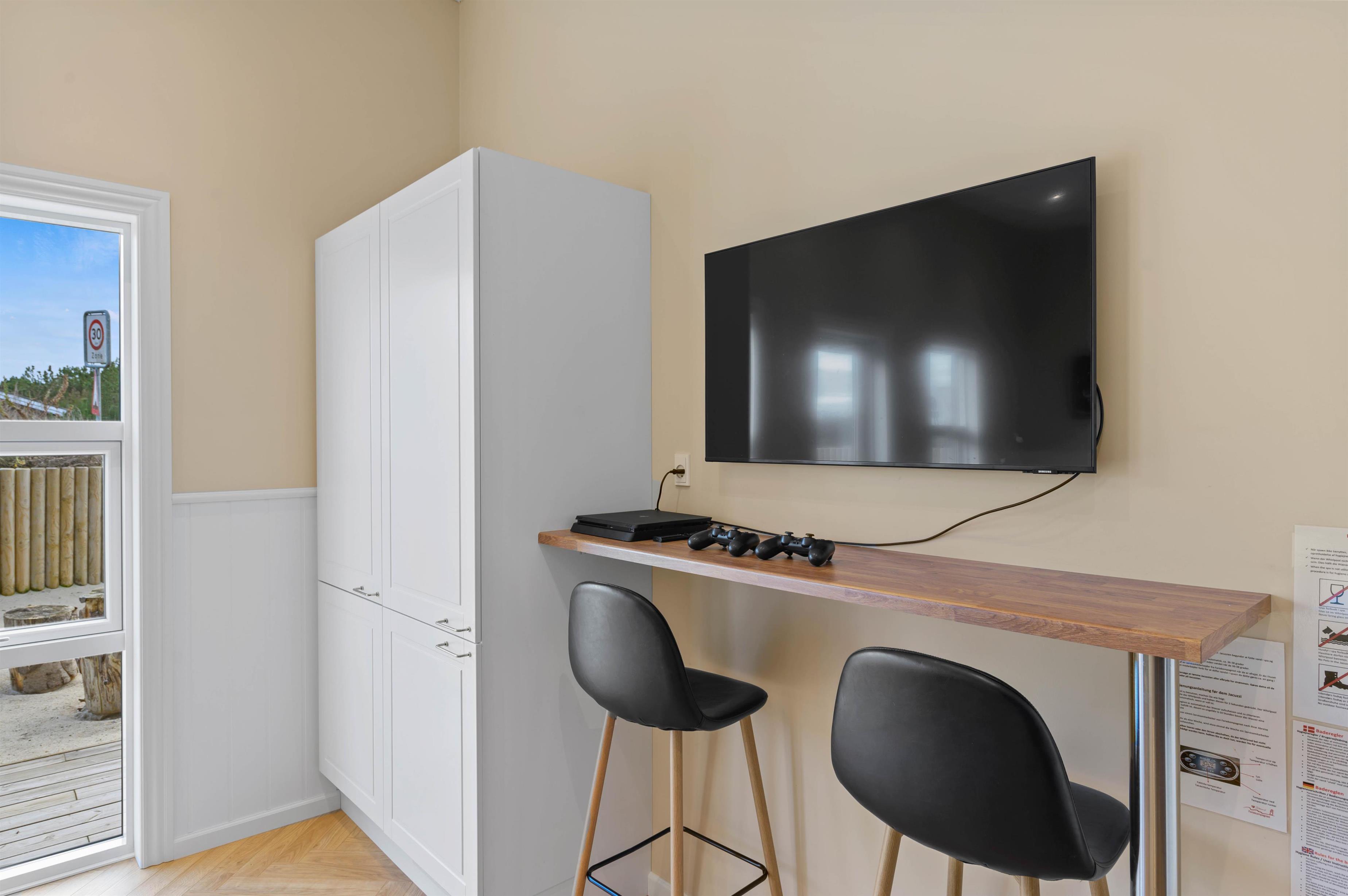 Samlingspunktet vil naturligt blive det indbydende køkken/alrum med morgenmadsbar og spiseplads. Nogle kan være i gang med madlavning, mens andre samtaler og hygger. Fra køkken/alrummet er der udgang til terrassen, samt til aktivitetsrum og værelser. De komfortable møbler og brændeovnen inviterer ind i stuen til yderligere afslapning. I aktivitetsrummet kan de konkurrencelystne starte en turnering i bordtennis, pool eller dart hen over ferien.