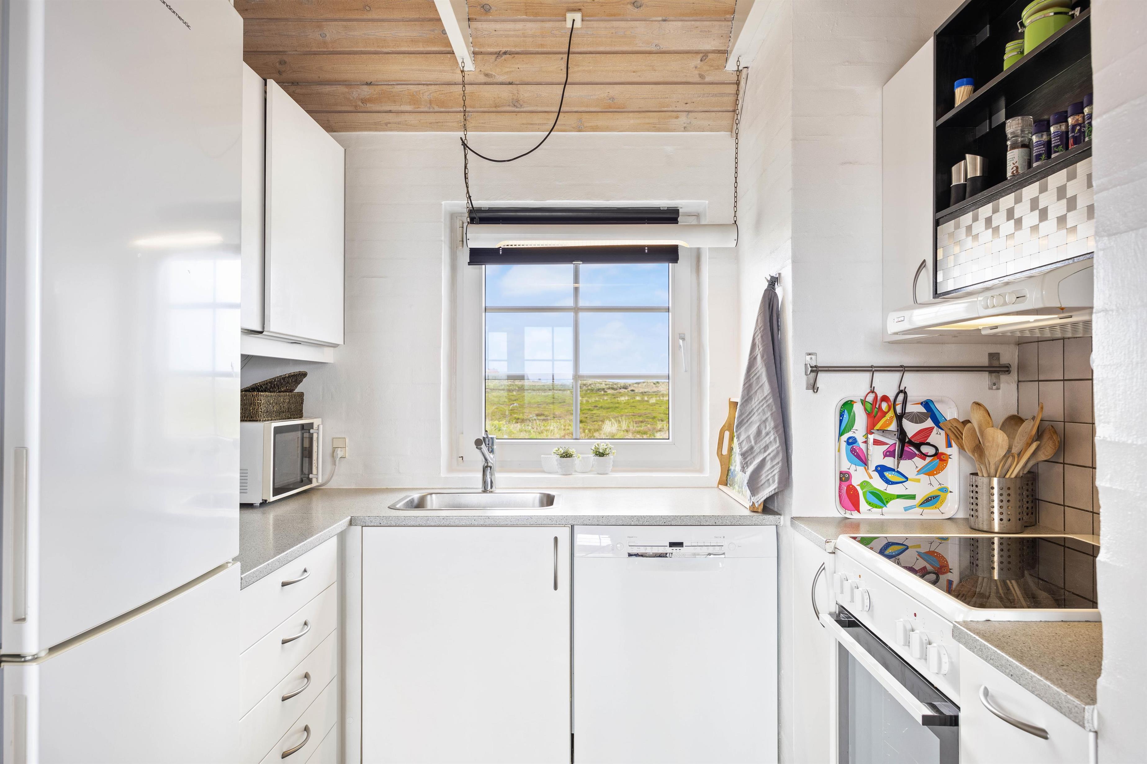 I køkkenet er der en opvaskemaskine, en mikroovn og en fryser på 10L. Spiseafdelingen står i åben forbindelse med både køkkenet og stuen. Stuen har trægulv og loft til kip og er hyggeligt indrettet - et perfekt sted at samle hele familien. Der er en brændeovn, et fladskærms-TV og en DVD-afspiller. Saml familien i sofaen med en god film, og mærk brændeovnens varme brede sig. I sommerhuset er der også en energibesparende luft-til-luft varmepumpe, som også kan bruges som aircondition på de varme dage.