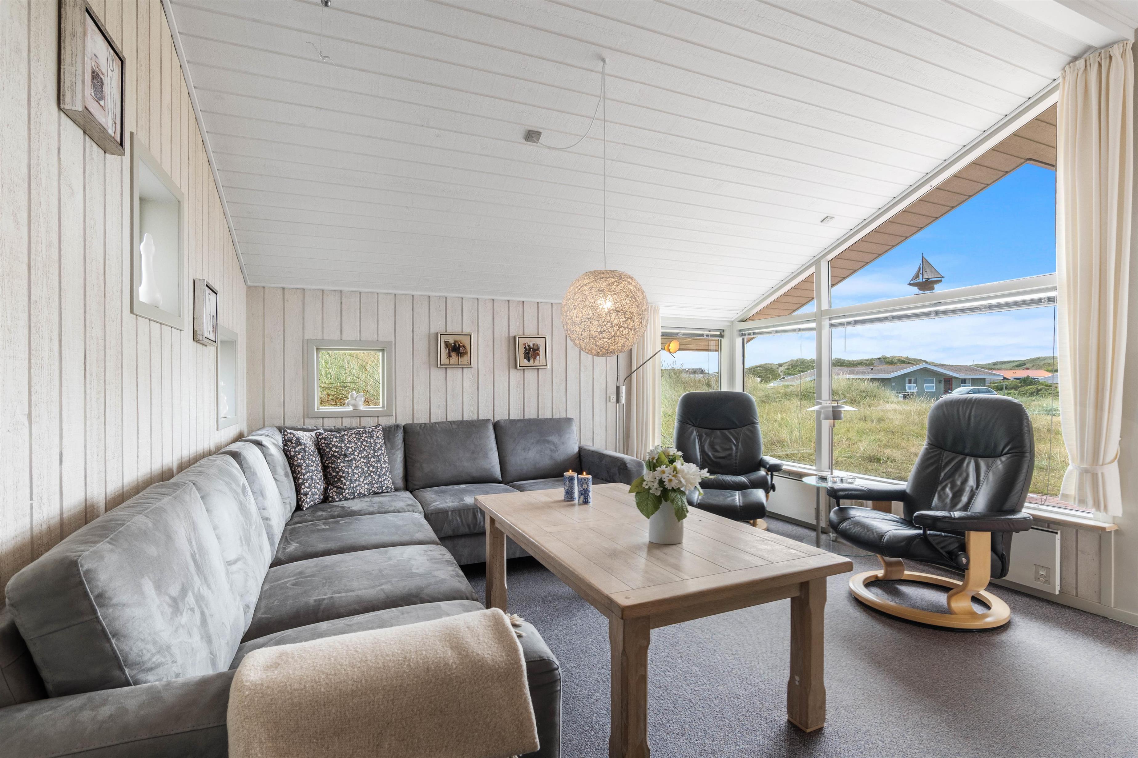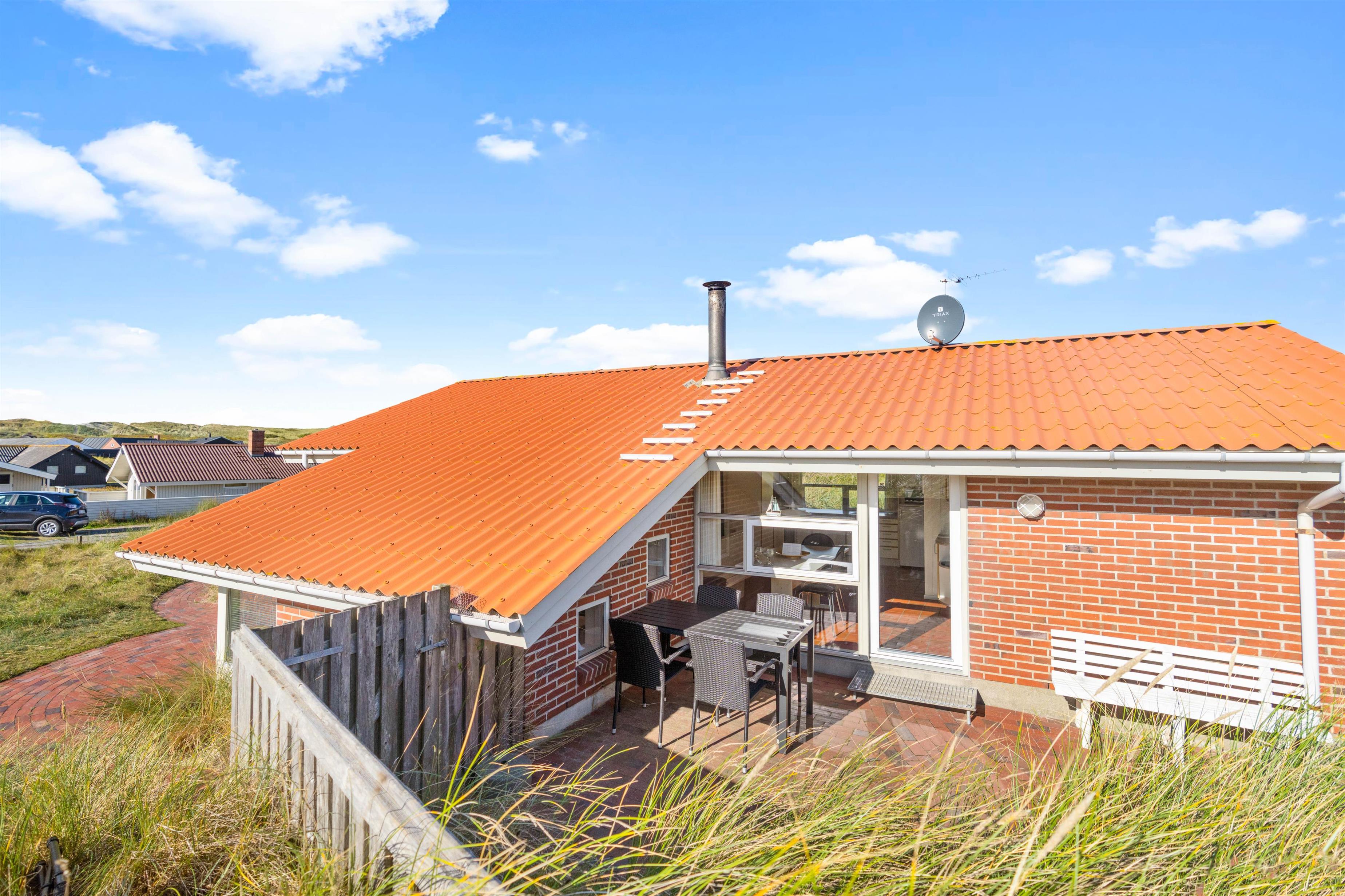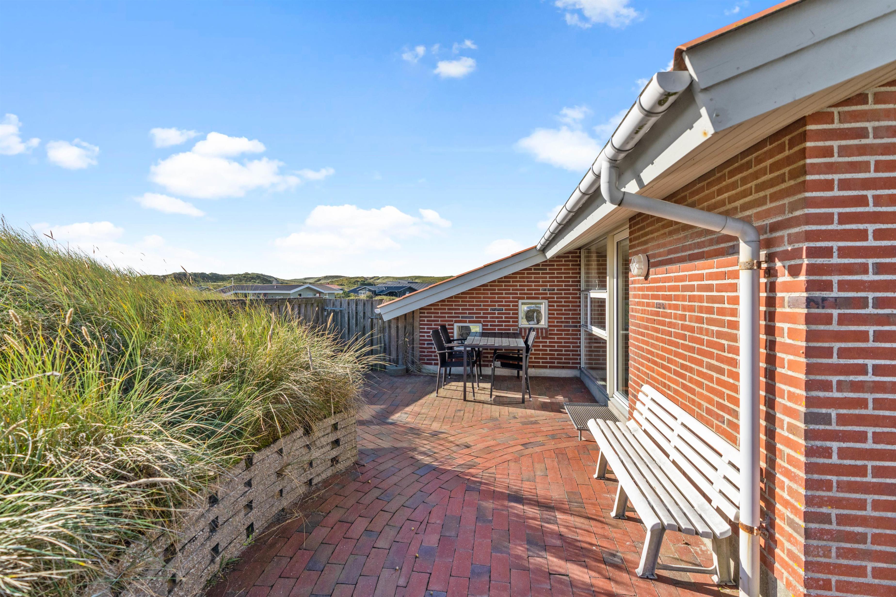 Med en særdeles fin beliggenhed kun ca. 250 meter fra stranden ligger dette feriehus af sten placeret på en kuperet naturgrund. Her er masser af fred og ro til at nyde naturen på den danske nordsøkyst. Den store og velafskærmede terrasse med gode havemøbler er en fredfyldt plet, hvor børn og hund rigtigt kan tumle rundt.