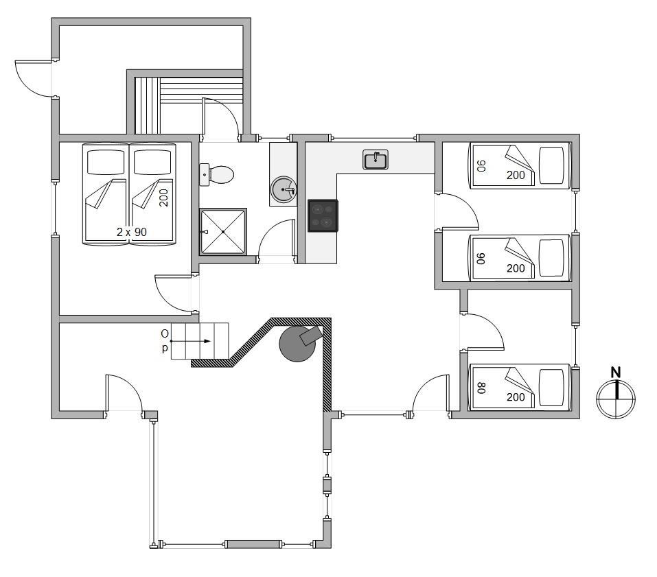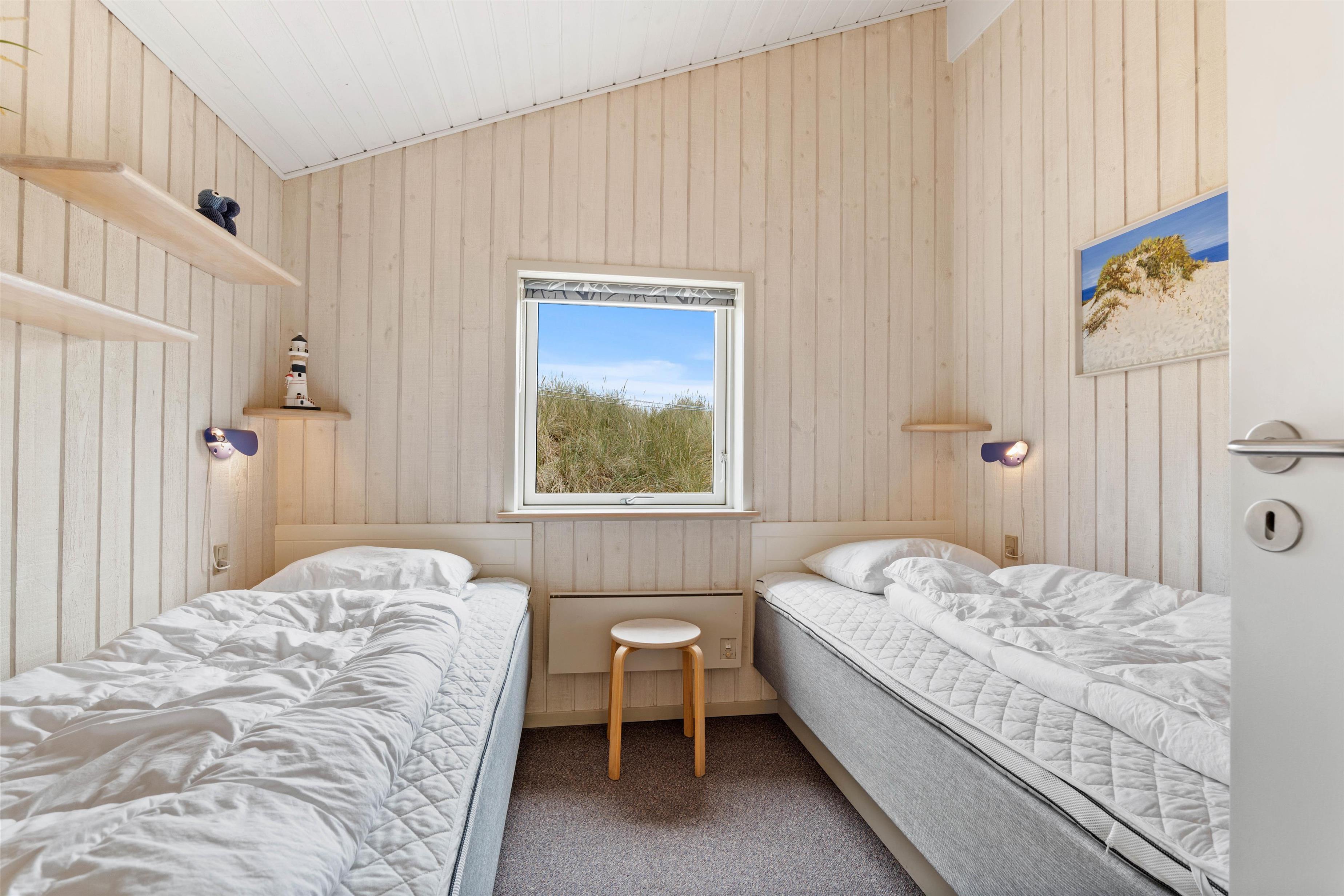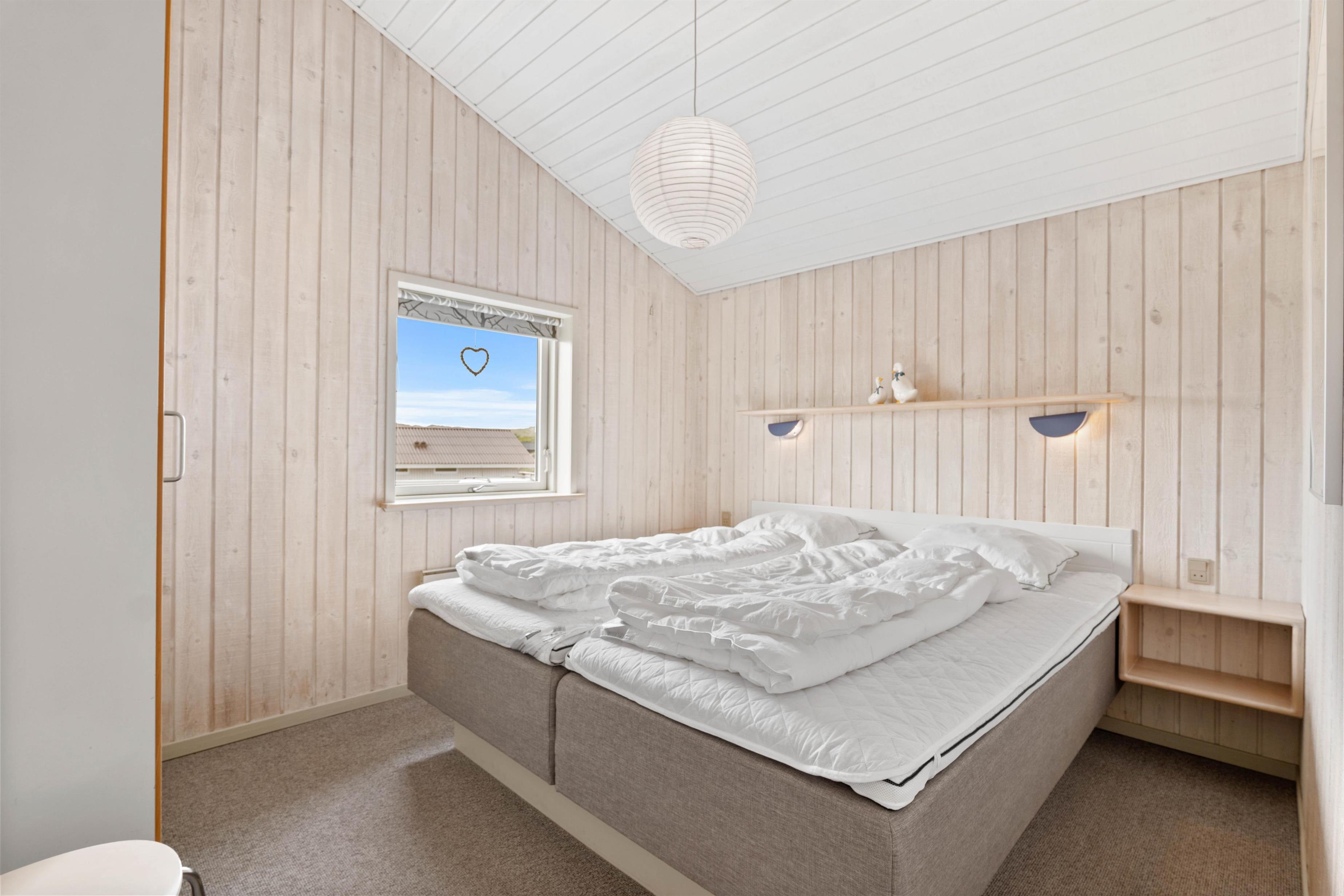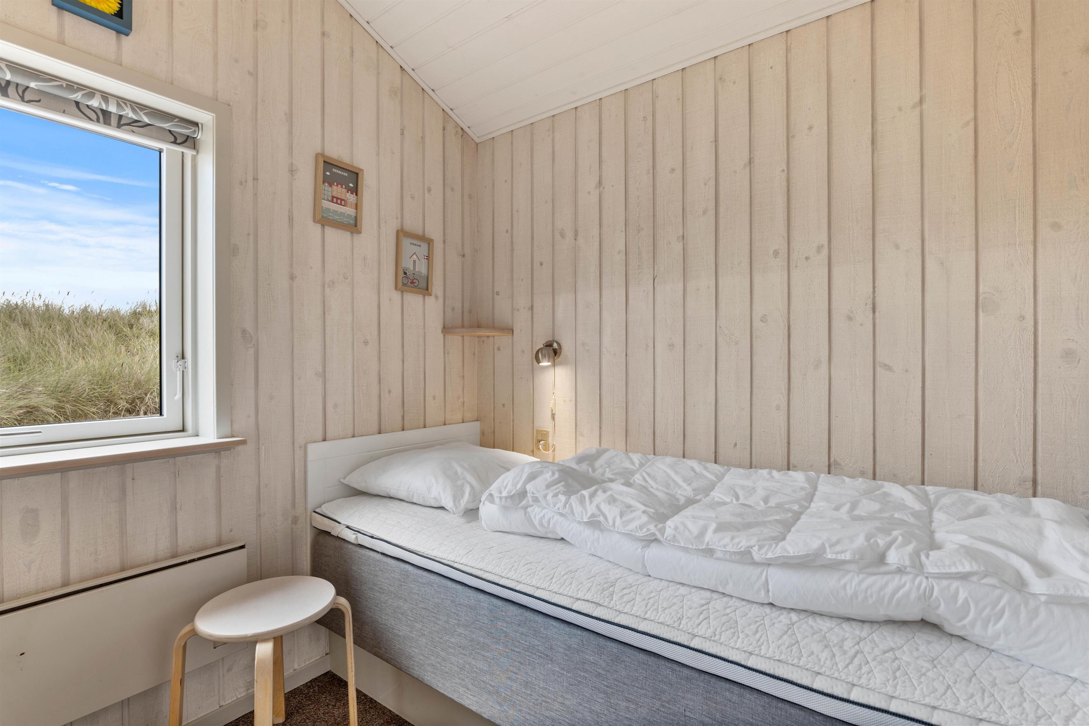 Sommerhuset har tre gode soveværelser – et med dobbeltseng, et med to enkeltsenge og et med en enkeltseng. Her er der plads til hele familien – også hunden.