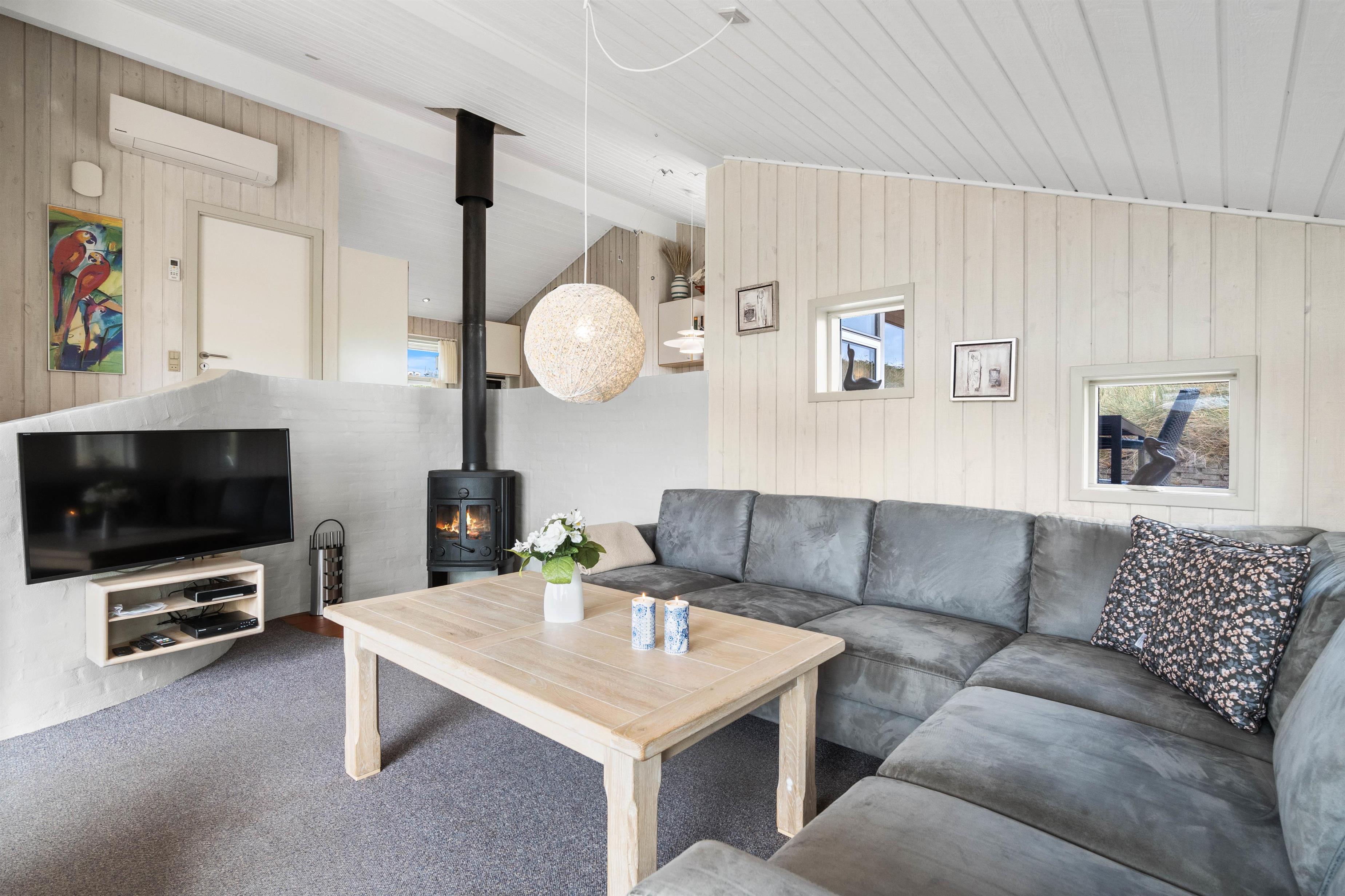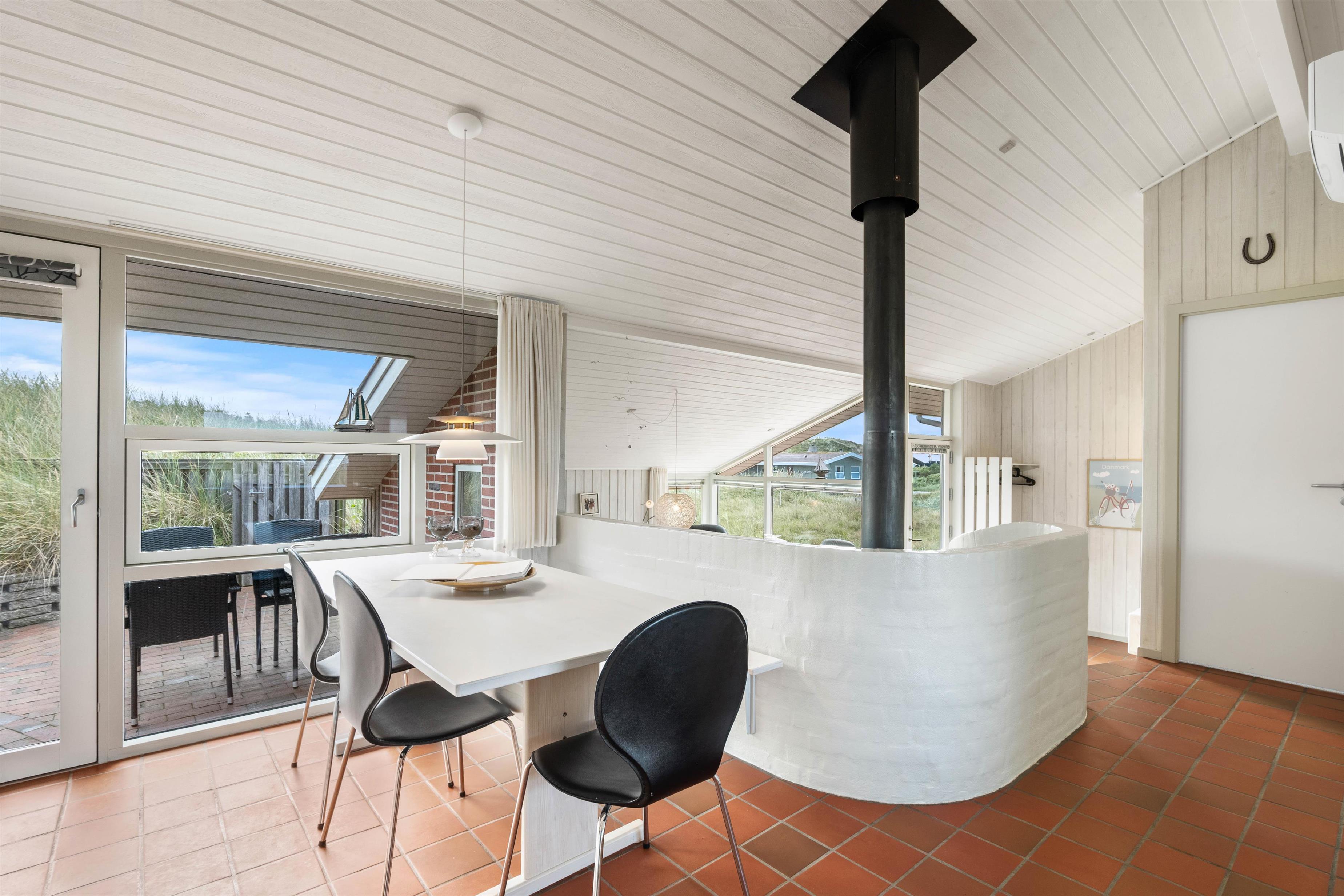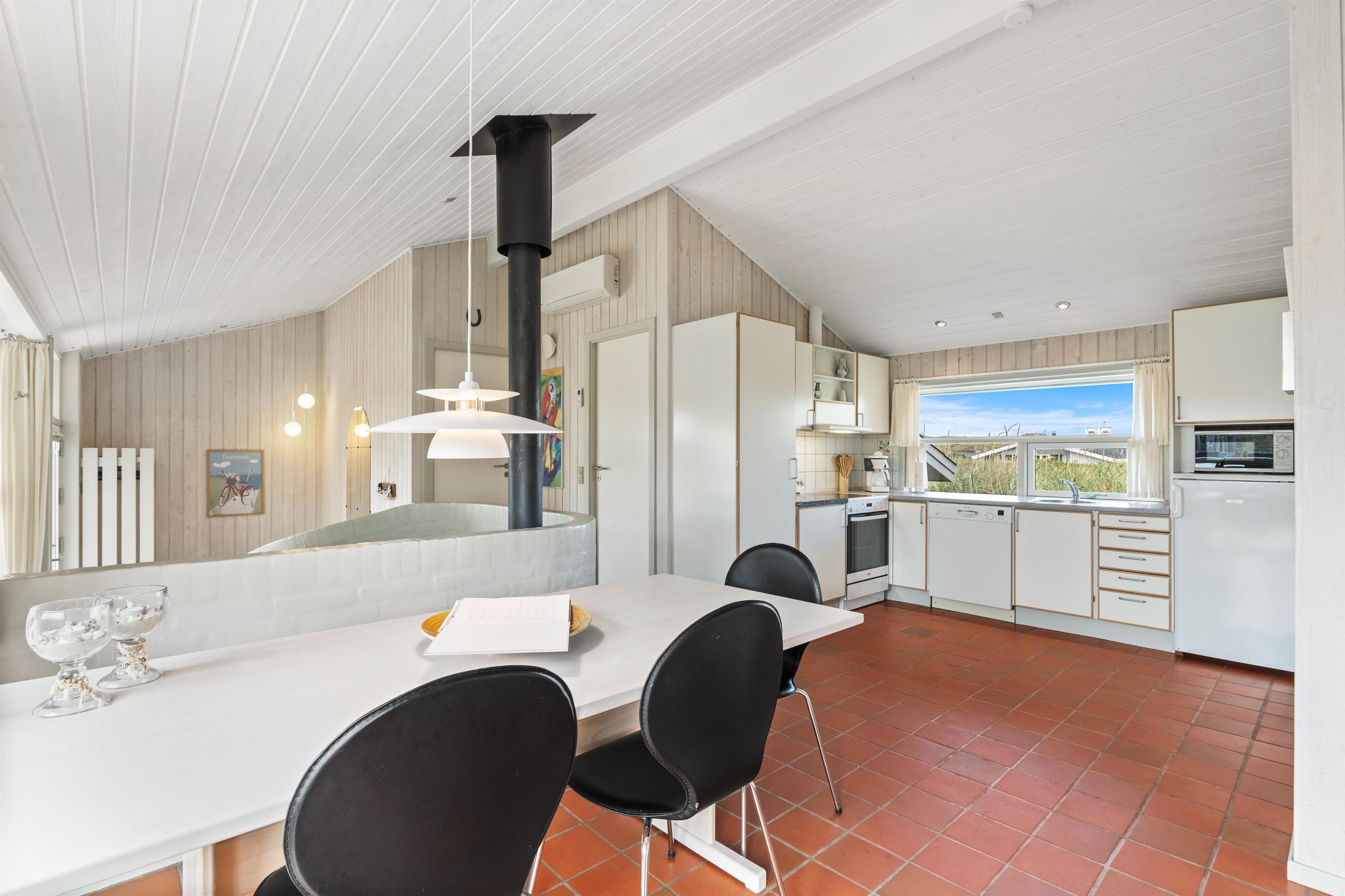 Feriehusets lyse og veludstyrede køkken ligger i forbindelse med spiseafdelingen, som er adskilt fra den særdeles hyggelige opholdsafdeling af en smukt svungen halvmur. I den forsænkede stue er der en dejlig afslappet atmosfære med brændeovn og god udsigt over den smukke natur.