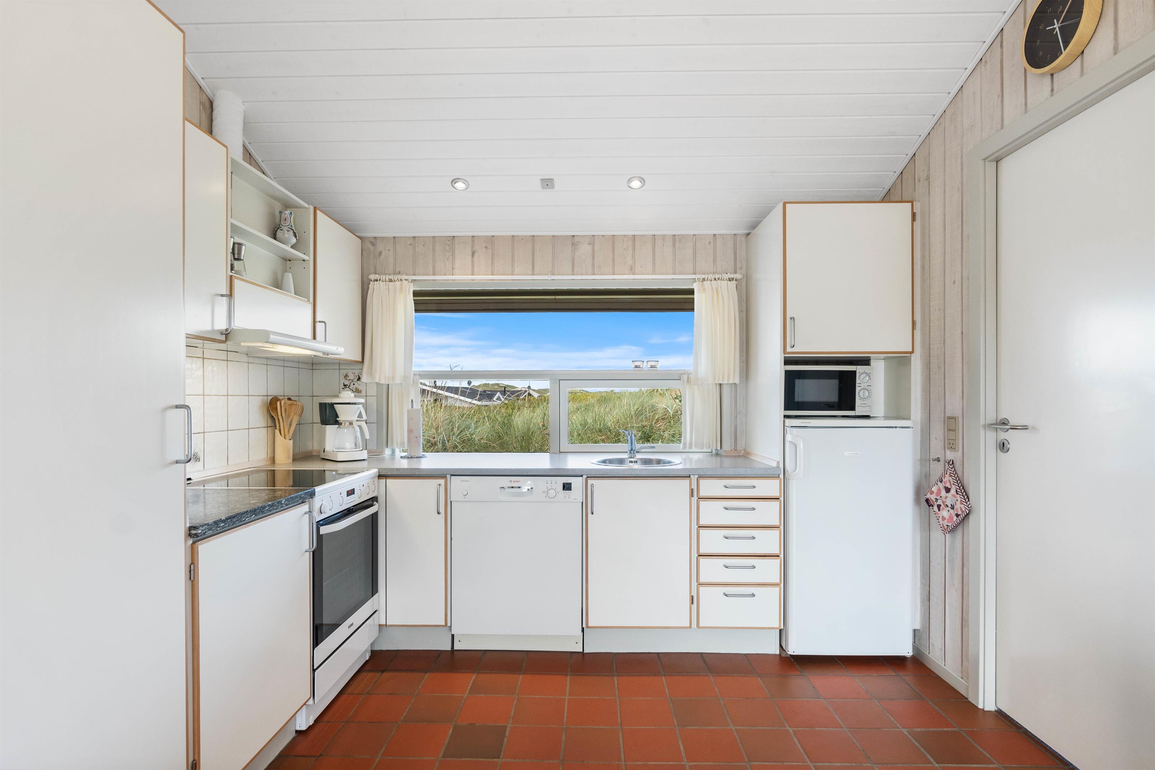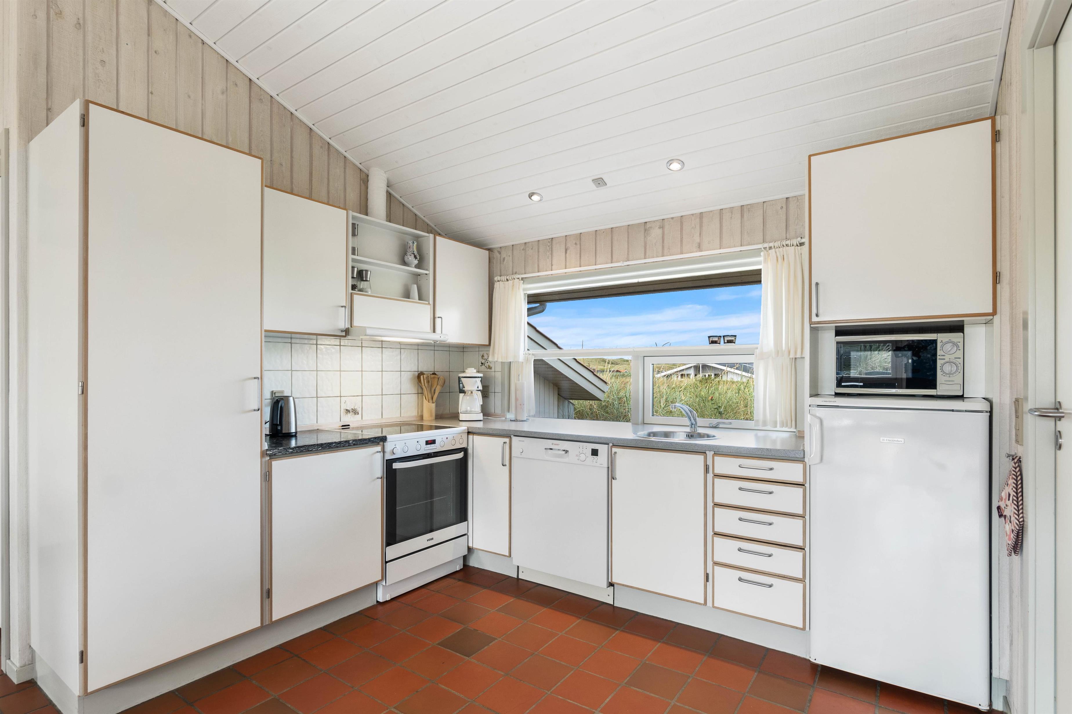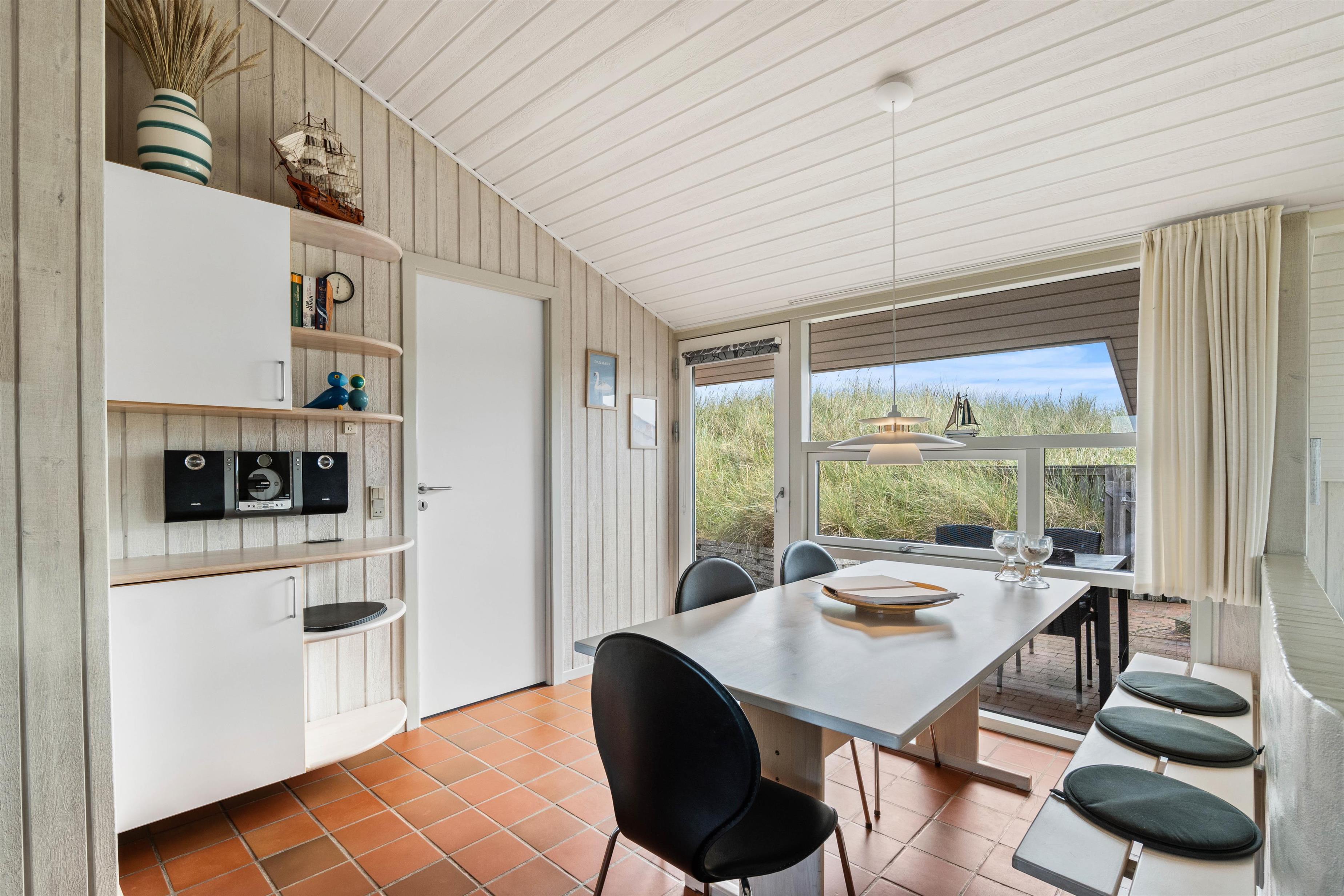 Feriehusets lyse og veludstyrede køkken ligger i forbindelse med spiseafdelingen, som er adskilt fra den særdeles hyggelige opholdsafdeling af en smukt svungen halvmur. I den forsænkede stue er der en dejlig afslappet atmosfære med brændeovn og god udsigt over den smukke natur.