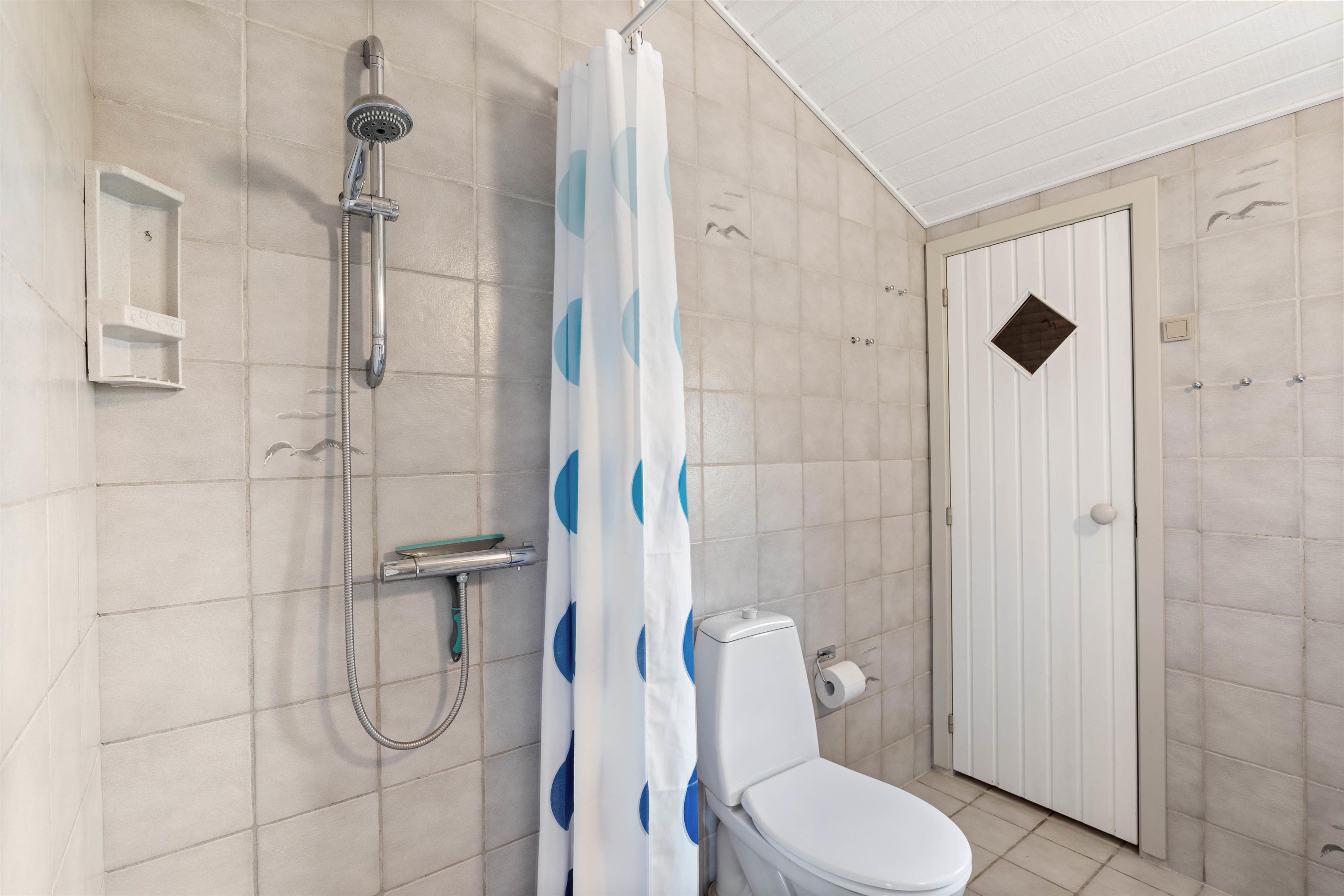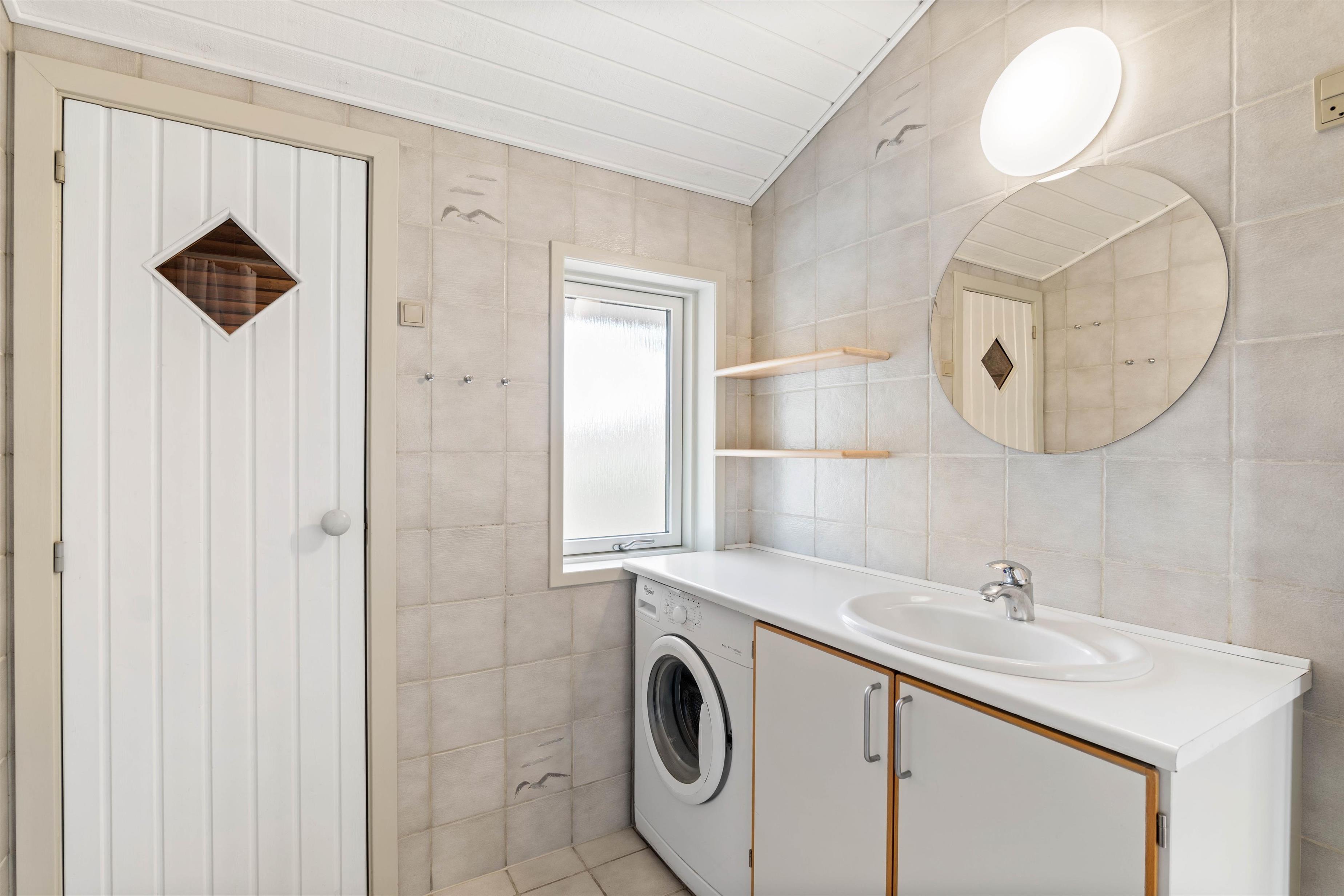 Feriehusets badeværelse har gulvvarme, så I ikke fryser tæerne fra morgenstunden. Fra badeværelset har I desuden adgang til et af sommerhusets highlight, som er en fin sauna. Der findes intet bedre, end at afslutte dagen med en tur i varmen efter en frisk gåtur ved vandet.