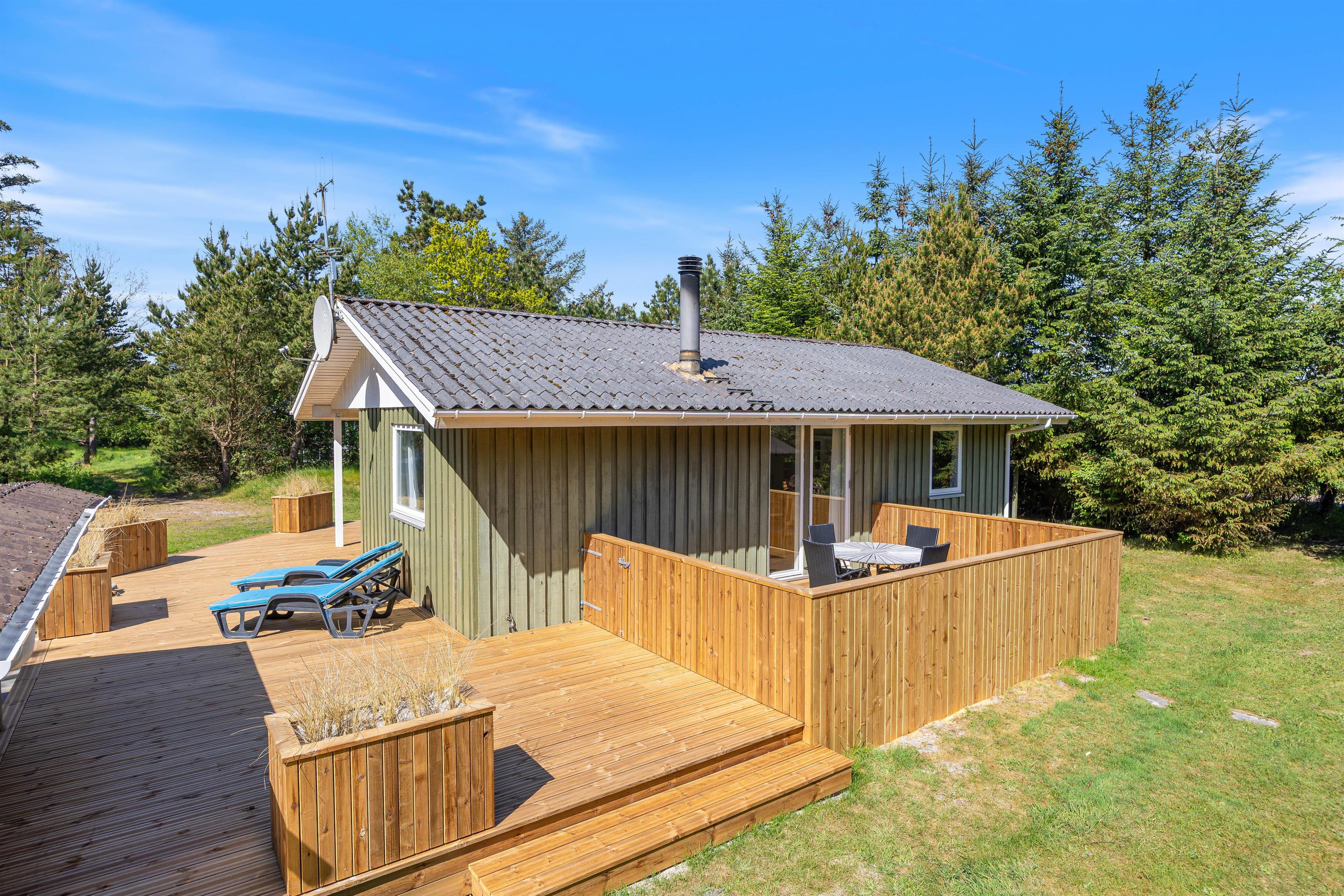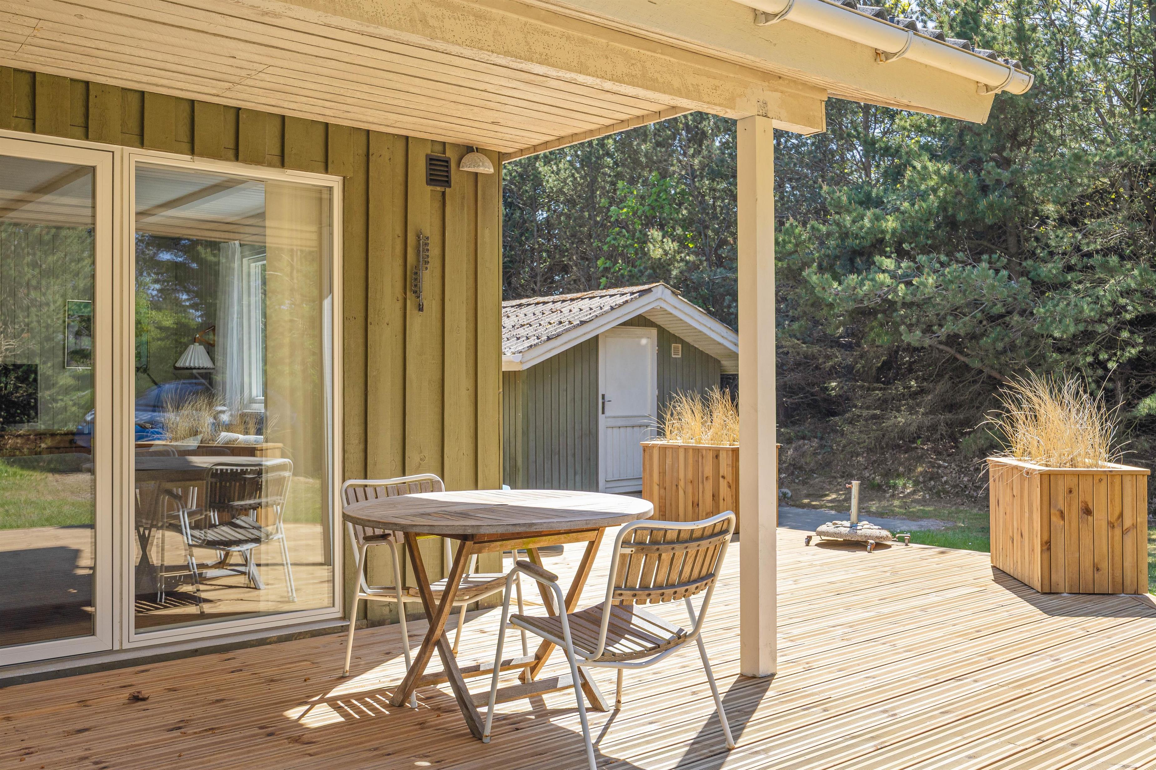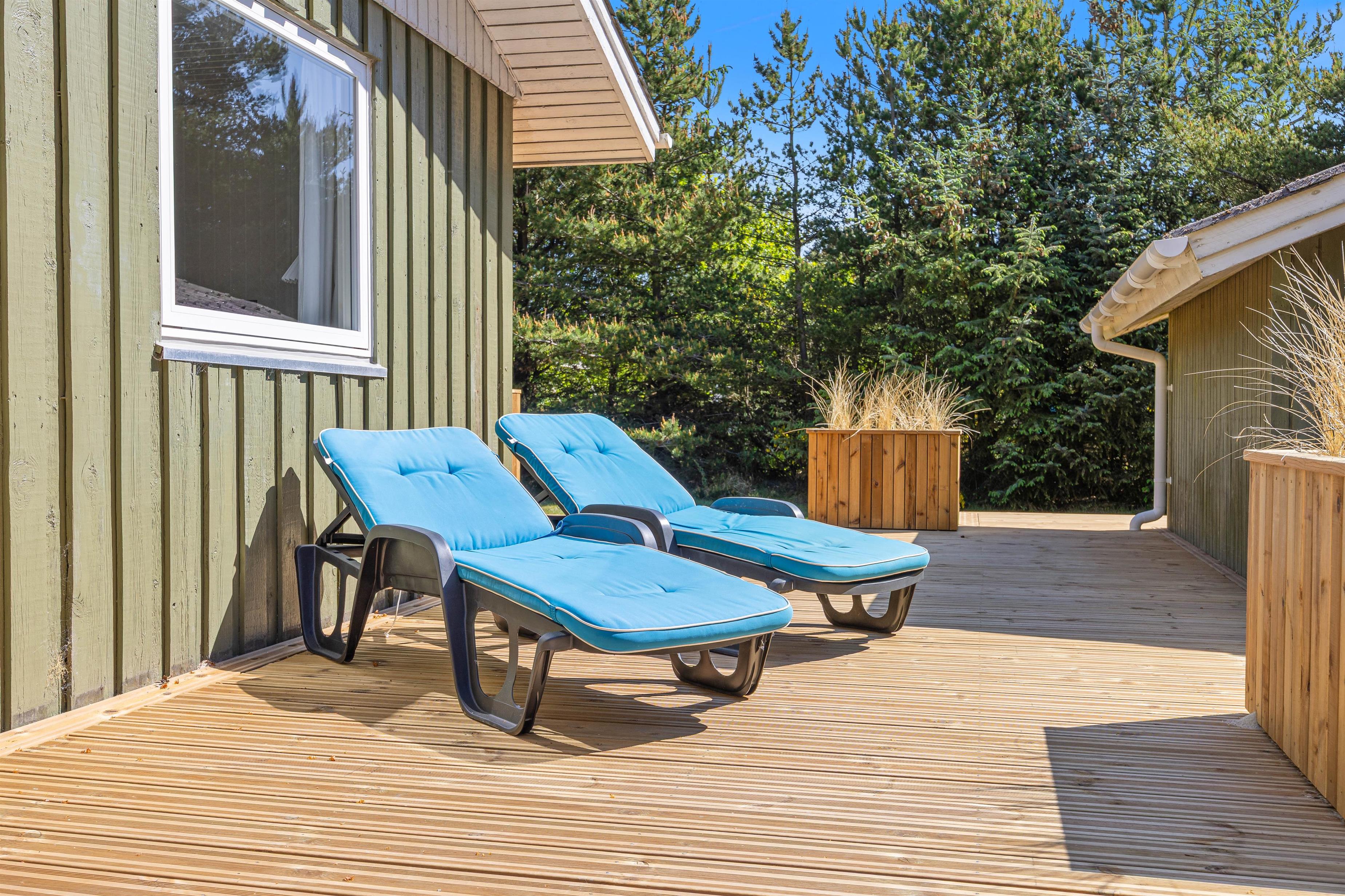 De store, træbeklædte terrasser – hvoraf en del er overdækket – indbyder til udeliv fra morgen til aften. Her finder I naturligvis havemøbler, liggestole og en grill, så I kan tilberede lækre feriemåltider under åben himmel. En vellykket feriedag kan passende rundes af med en hyggelig grillmiddag på terrassen, mens aftensolen langsomt går ned.
