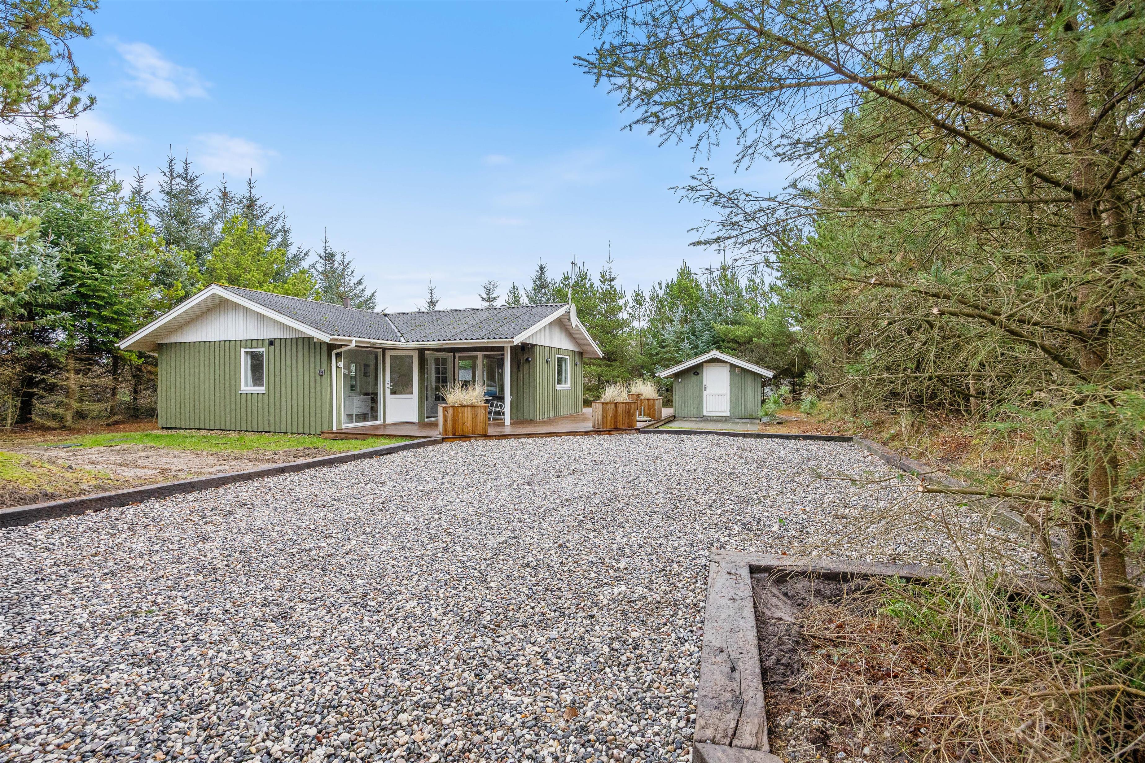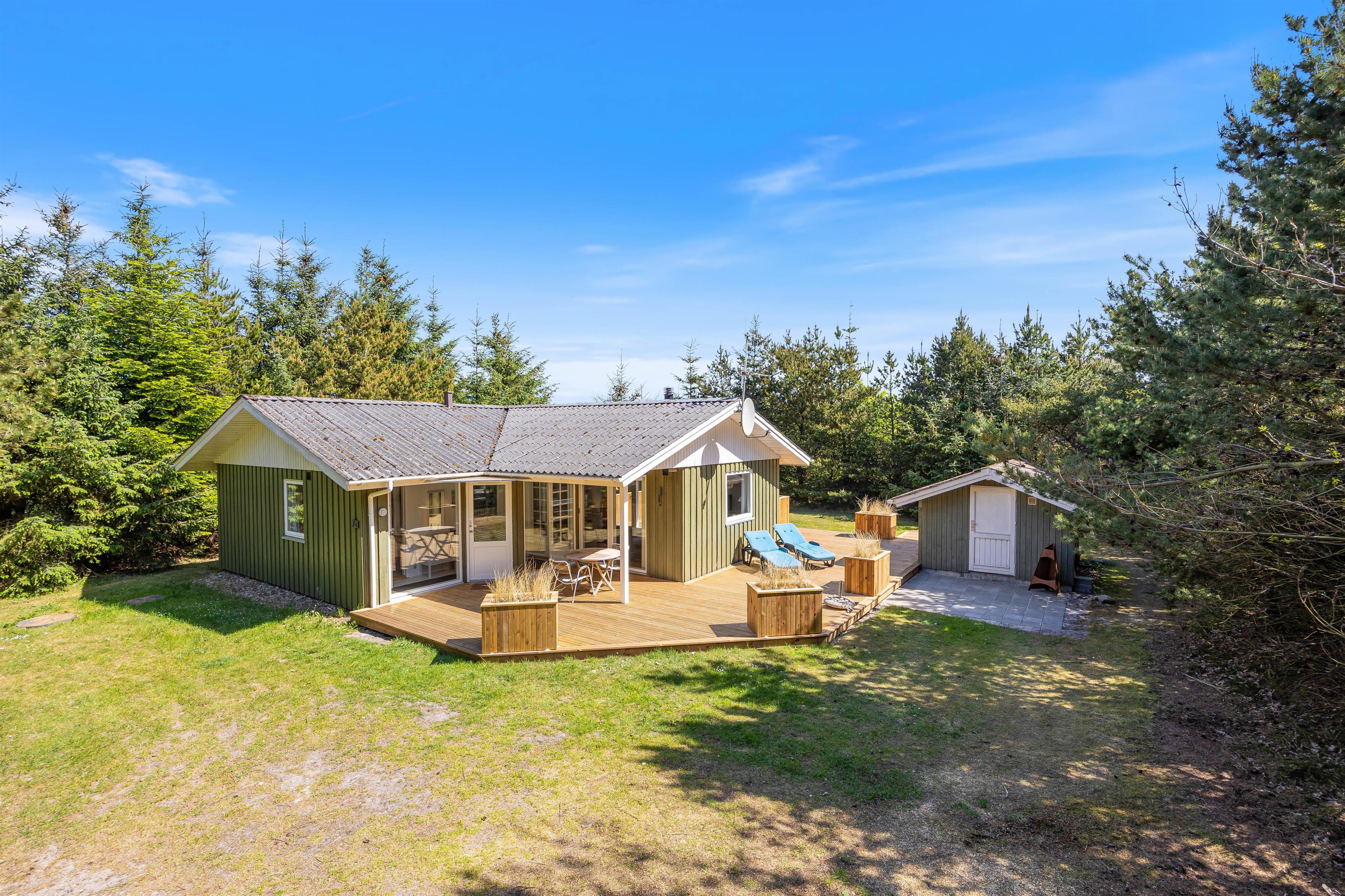 Sommerhuset er beliggende på en stor og velafskærmet grund omgivet af buske og træer, der både giver læ for vinden og sikrer privatliv. Her kan I nyde ferien i fredelige omgivelser og rigtig komme ned i gear, mens I slapper af og nyder naturen omkring jer.