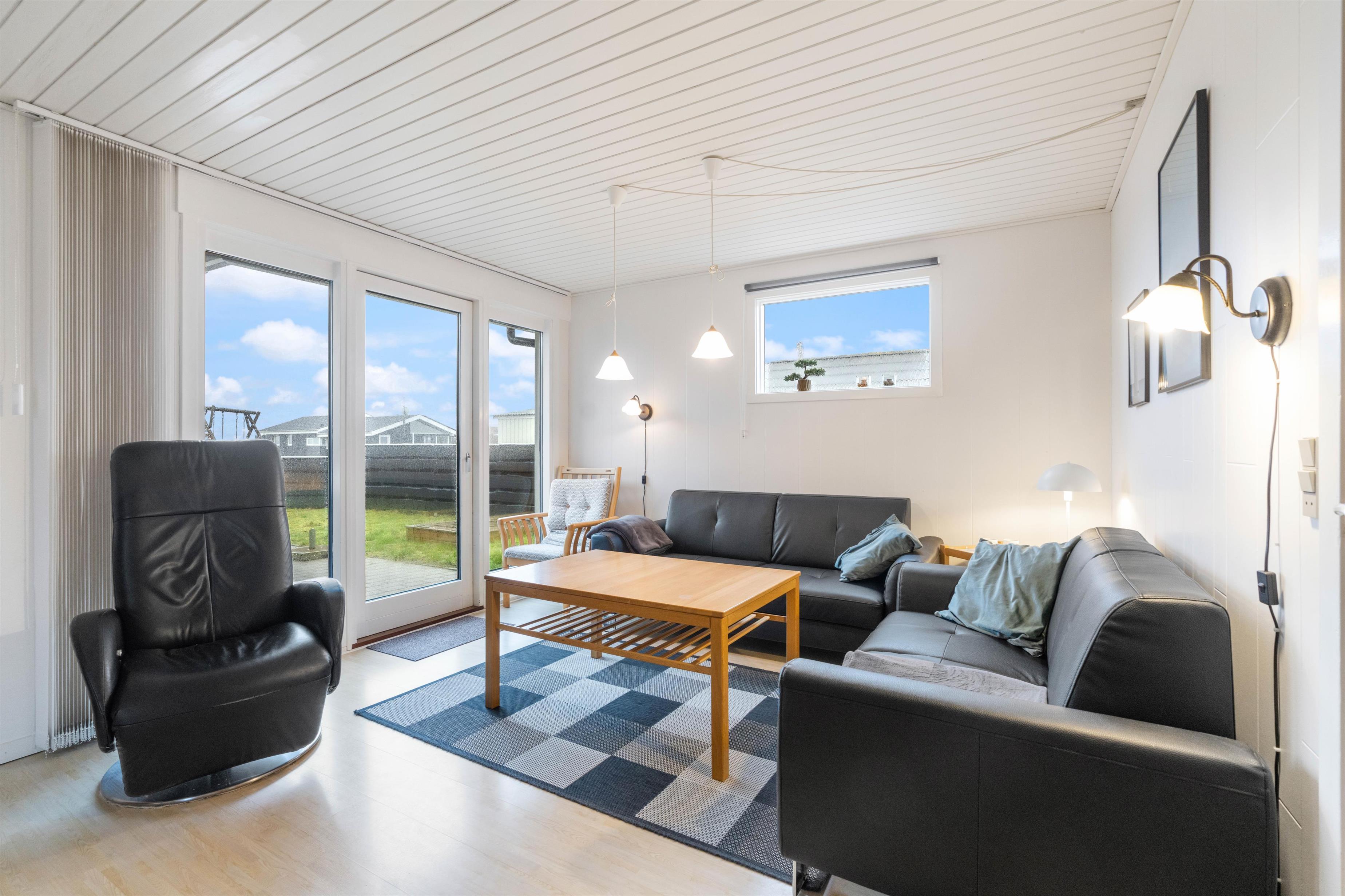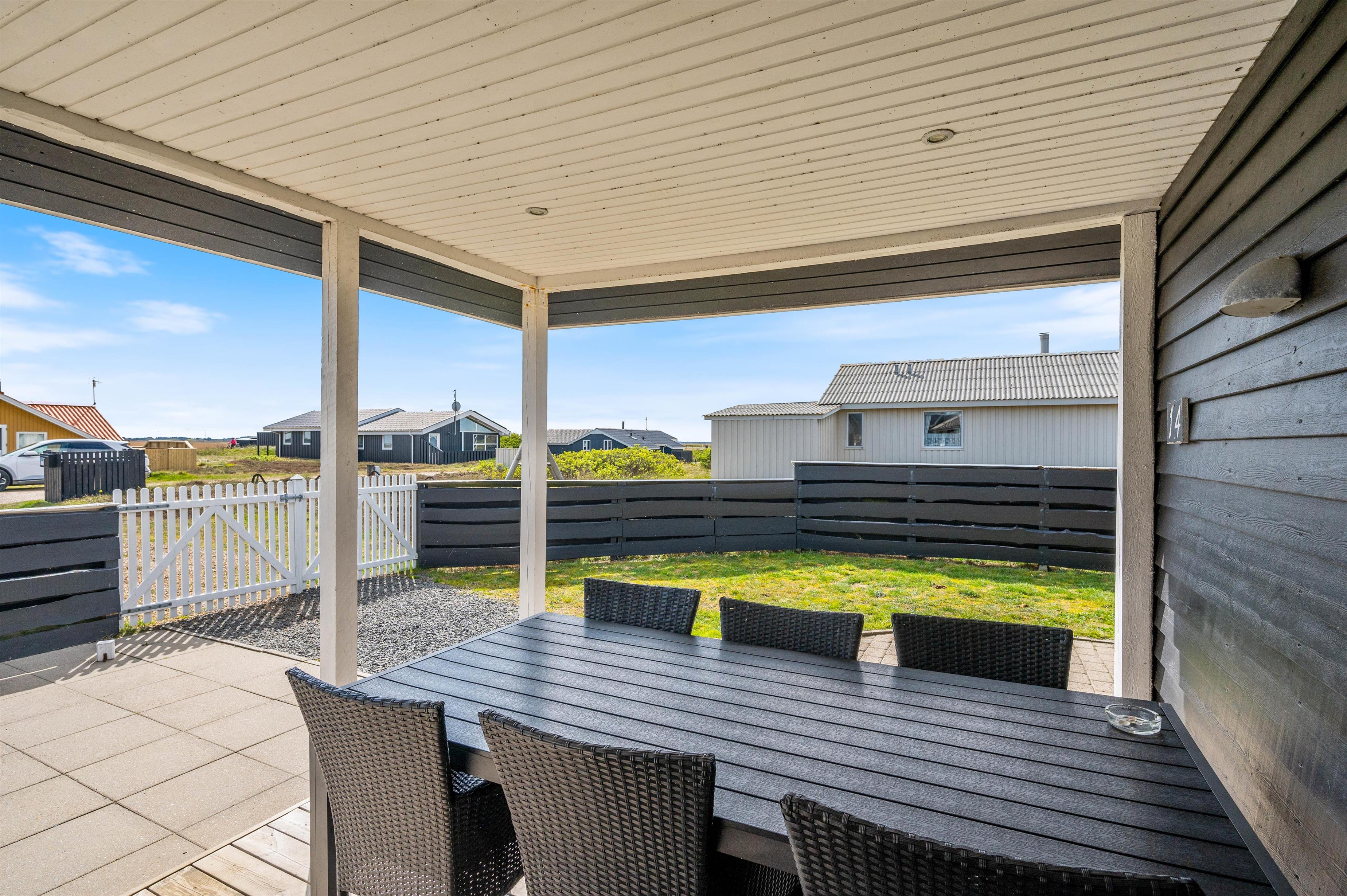 Med til huset hører en stor, lukket terrasse, som er rigtig praktisk, hvis I har små børn eller hunde med. Her kan de få lov til at løbe frit, mens I daser i solsengene eller tænder op i grillen og gør klar til en lækker middag. Til børnene er der også sørget for et gyngestativ og en sandkasse.