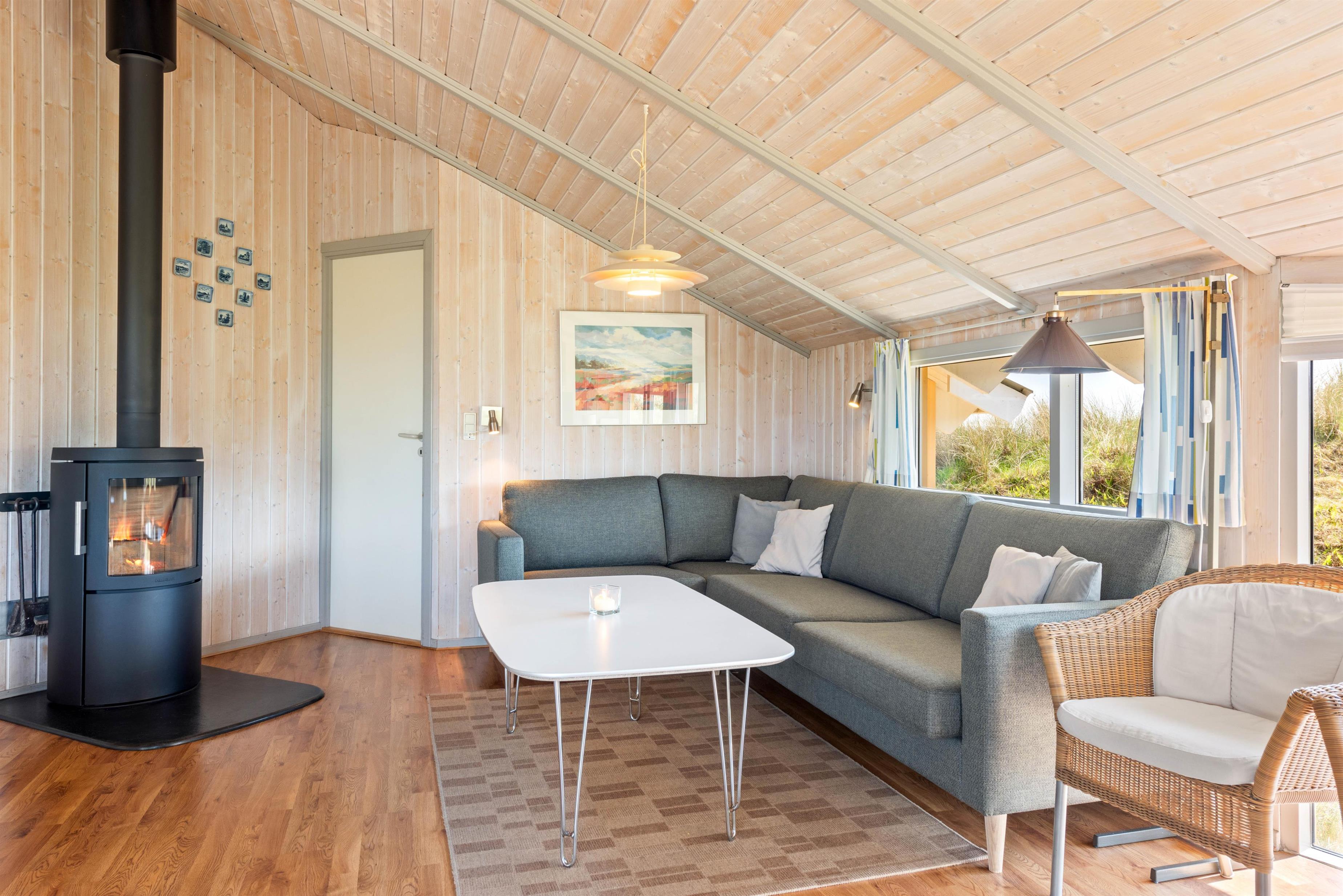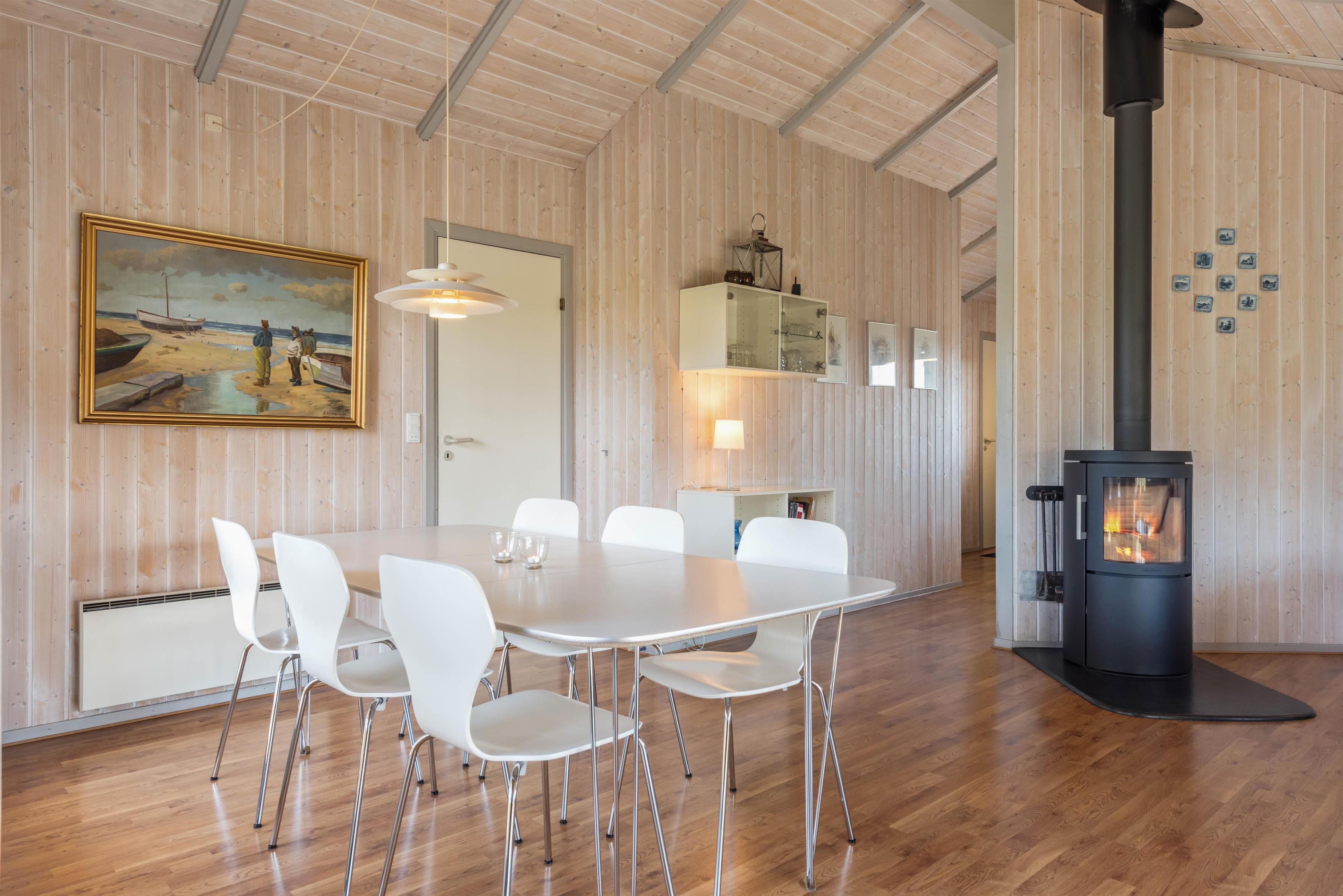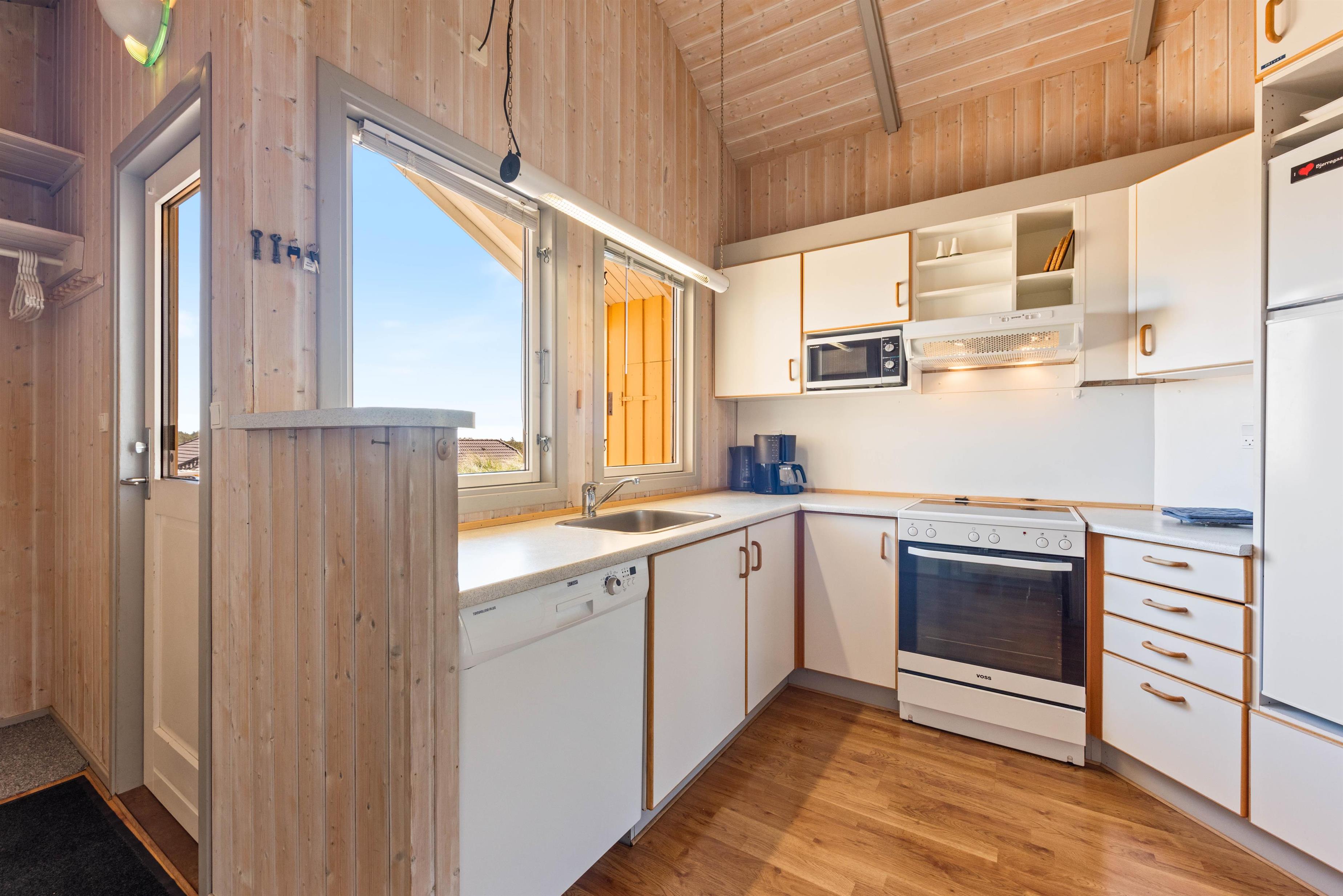 Dette feriehus til 6 personer har en stor lys stue med højt til loftet, en god spiseafdeling og et stort og rummeligt sofahjørne, hvor brændeovn hygger og luner på kølige dage. Her kan der rigtig slappes af med både DVD, CD-radio og trådløst internet, som naturligvis er gratis at benytte. Det lyse og funktionelle køkken har både køl/frys (40L), mikrobølgeovn og opvaskemaskine. I det store køkkenalrum er det muligt at samles hele familien om madlavning og hygge med brætspil og søde sager.