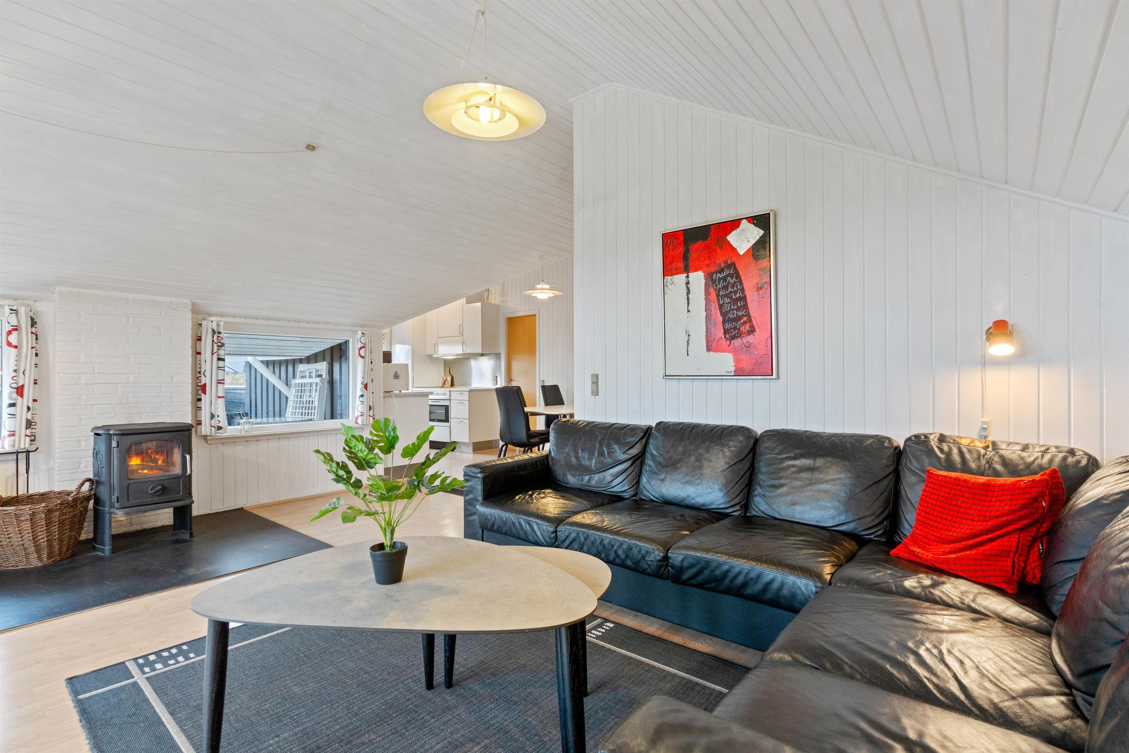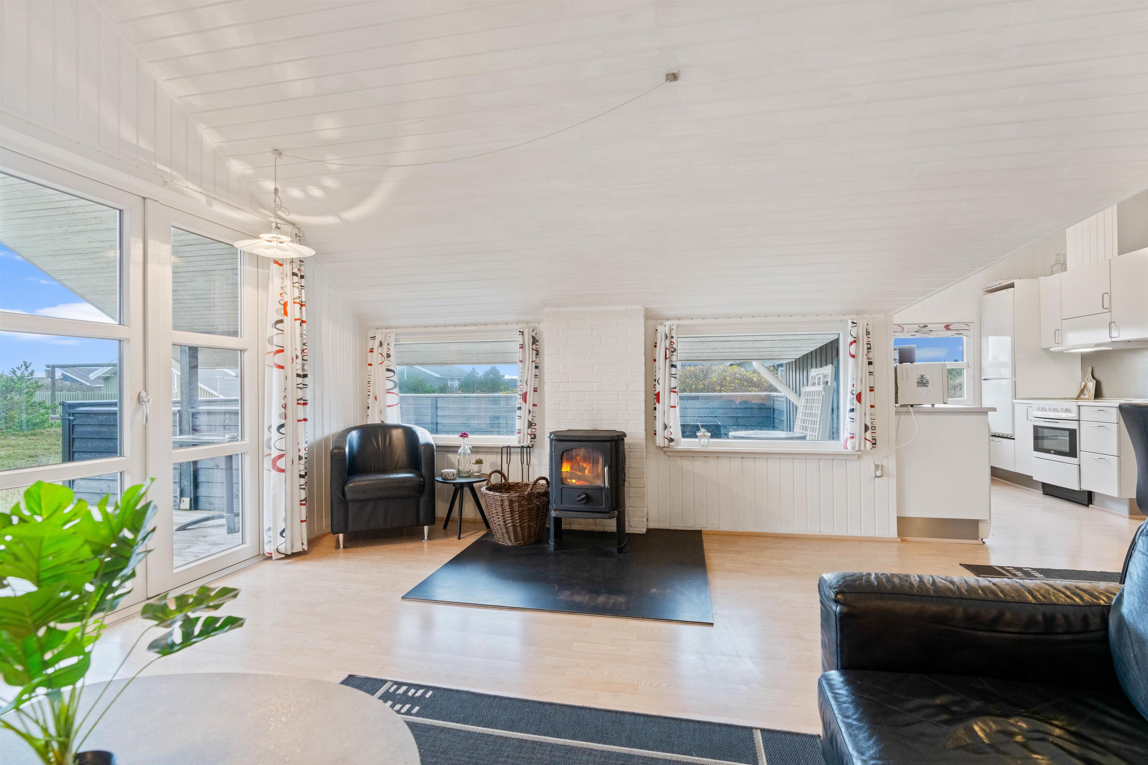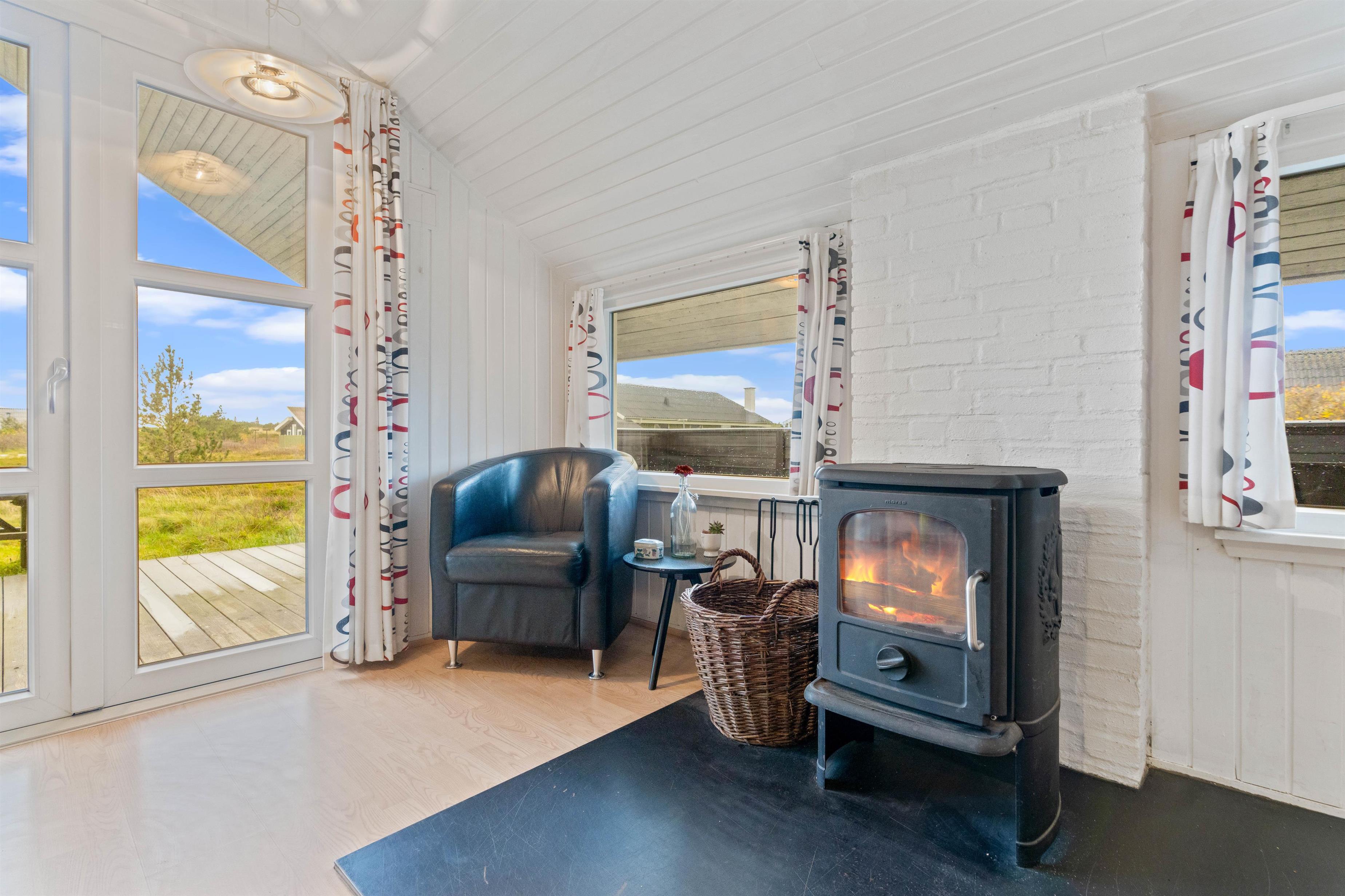 På de køligere årstider skal brændeovnens knitrende flammer nok sørge for både varme og ægte feriestemning. Der er desuden varmepumpe i sommerhuset.