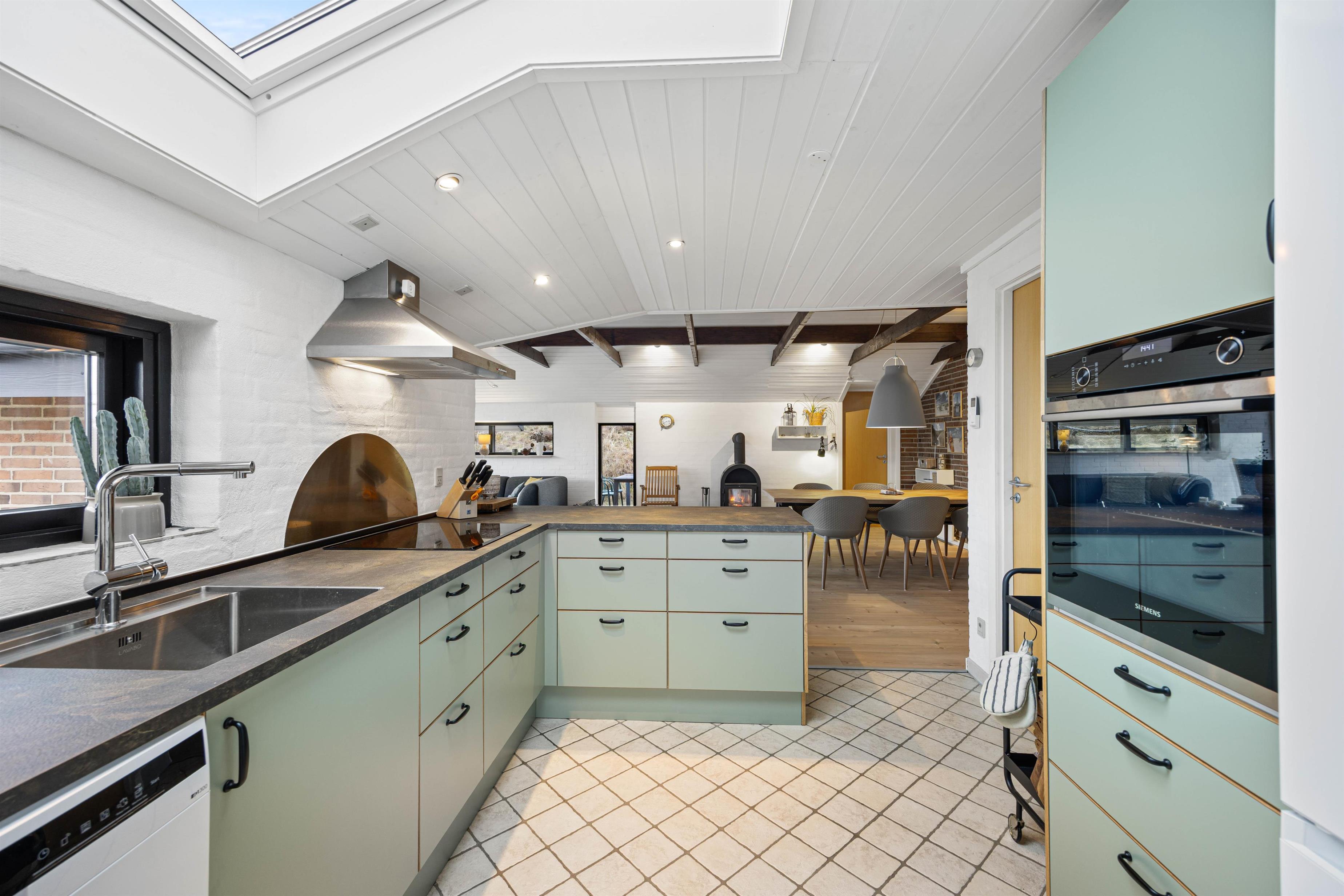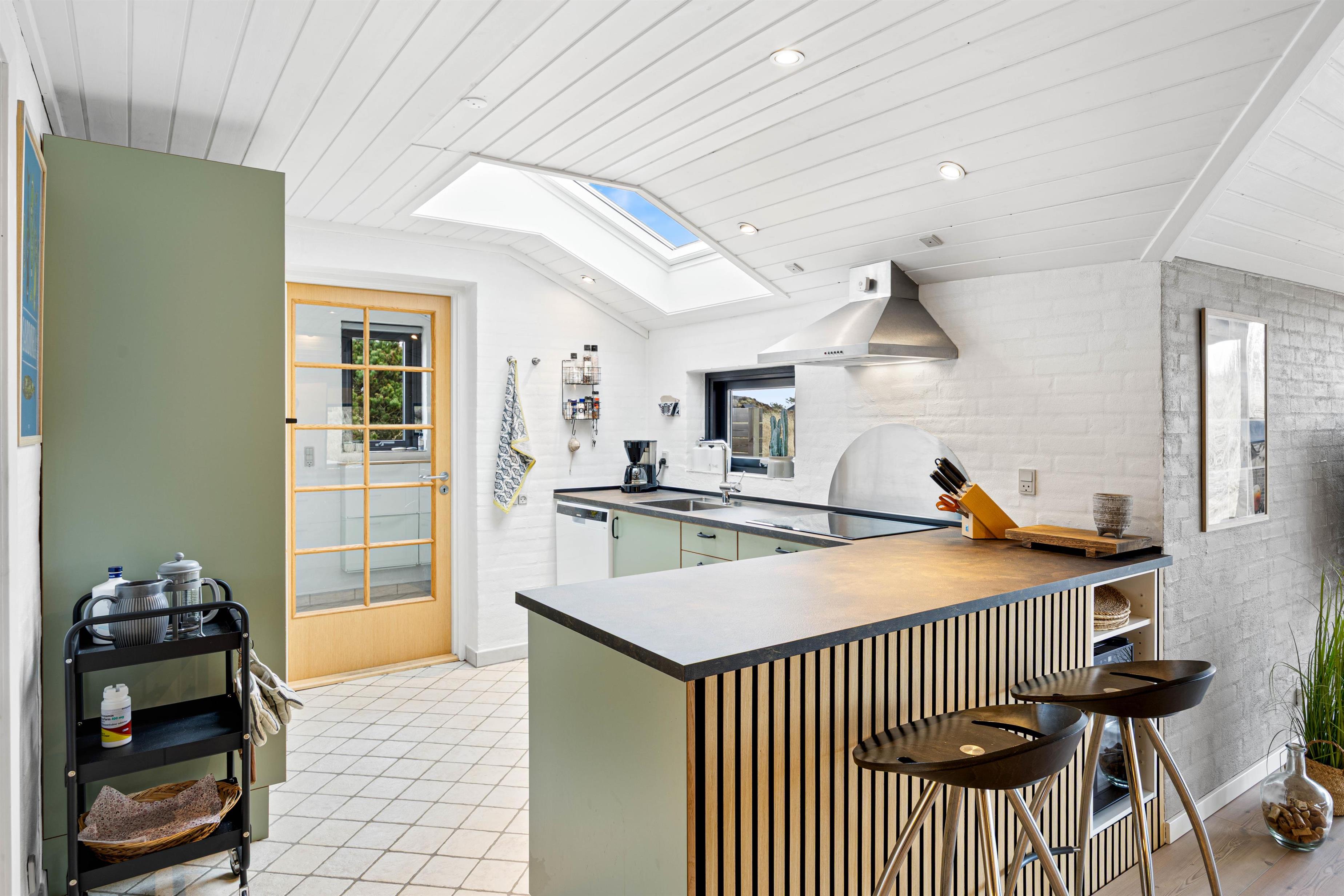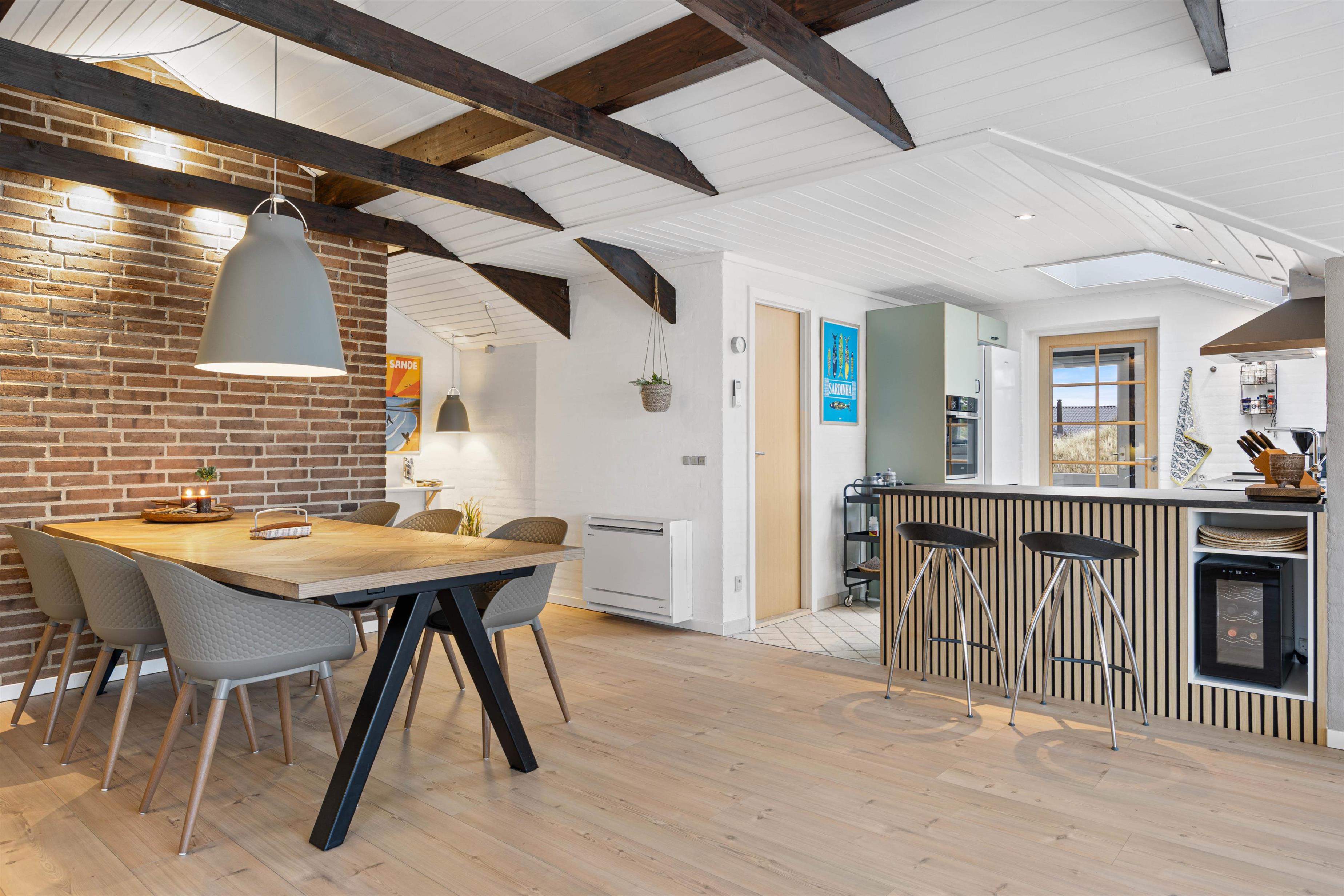 Sommerhuset er på 123 m2. Det moderne køkken med blandt andet nespresso maskine, vinkøleskab, opvaskemaskine og mikroovn samt Philips Hue ligger i åben forbindelse med den hyggelige stue, der er smagfuldt indrettet med møbler, der fint går i tråd med de buede lyse trælofter, de synlige mørkere bjælker, de hvide vægge og den rå murstensvæg, der giver stuen et rustikt og hyggeligt udtryk.