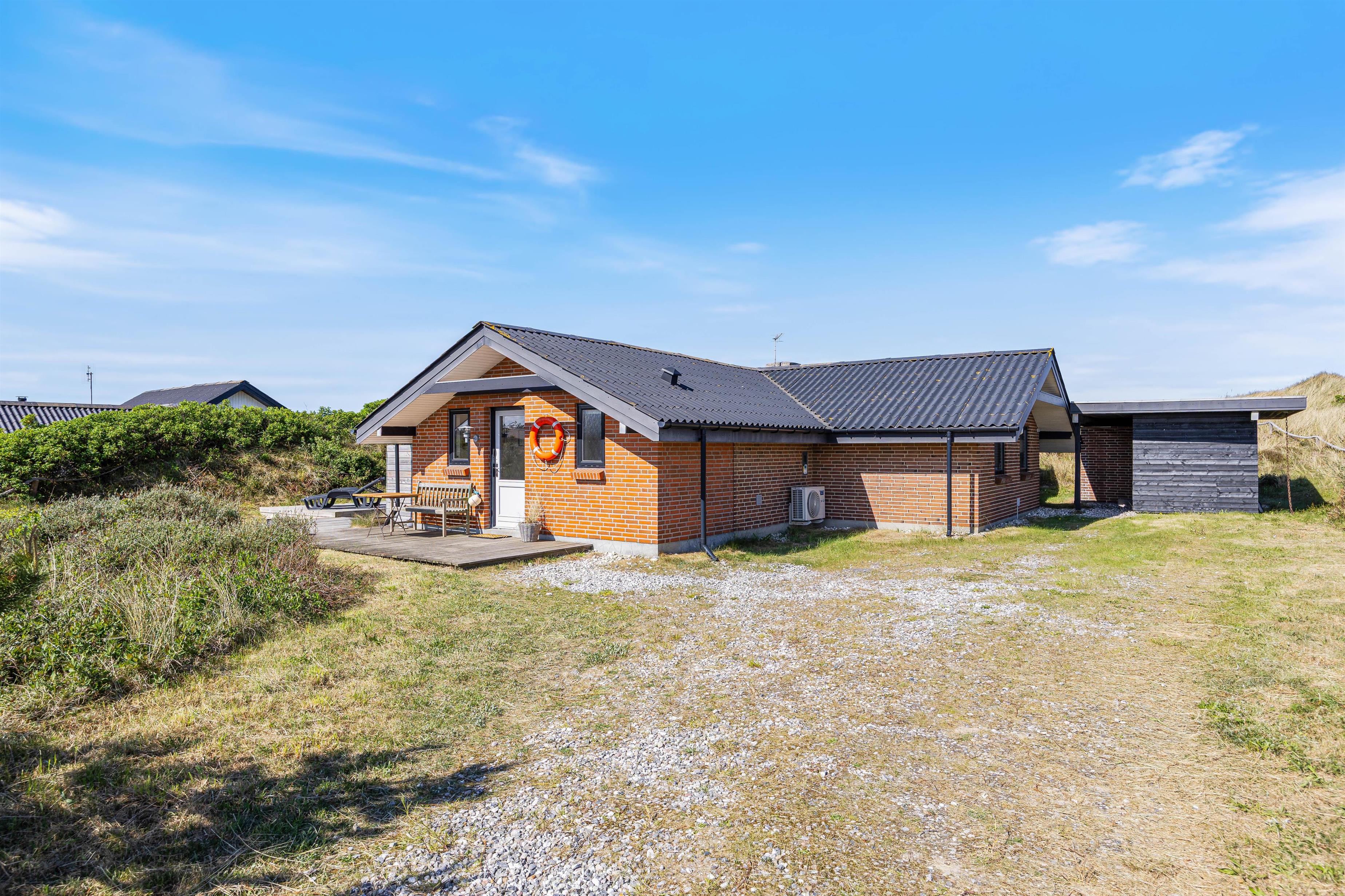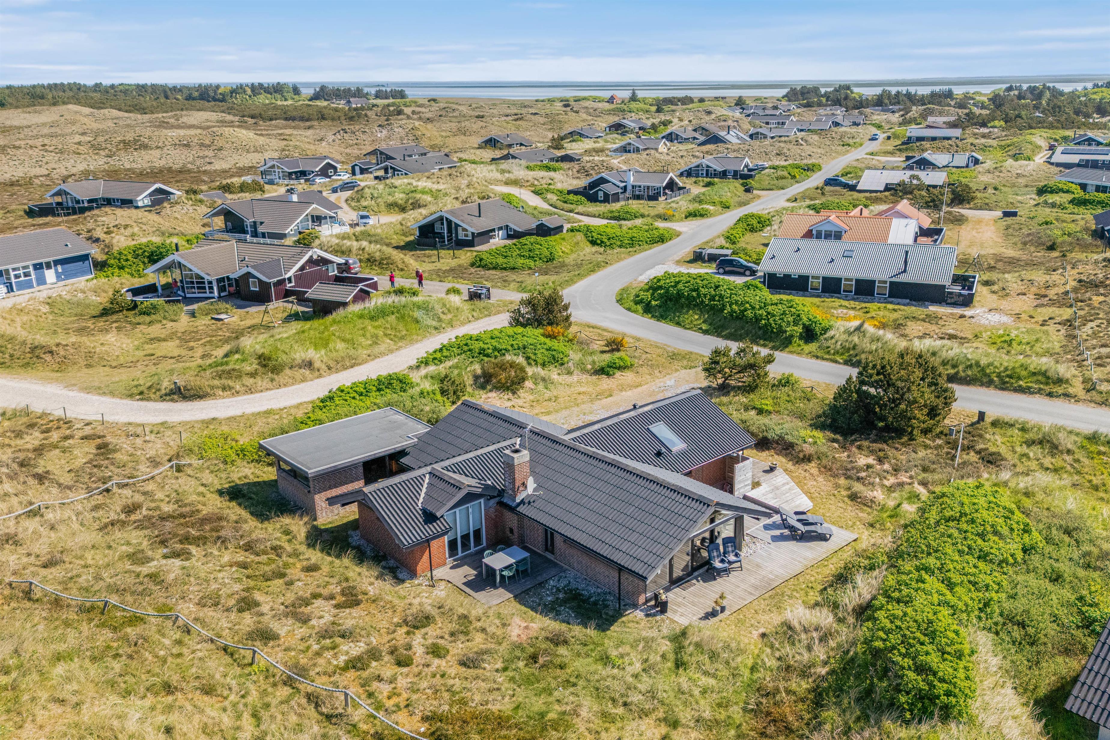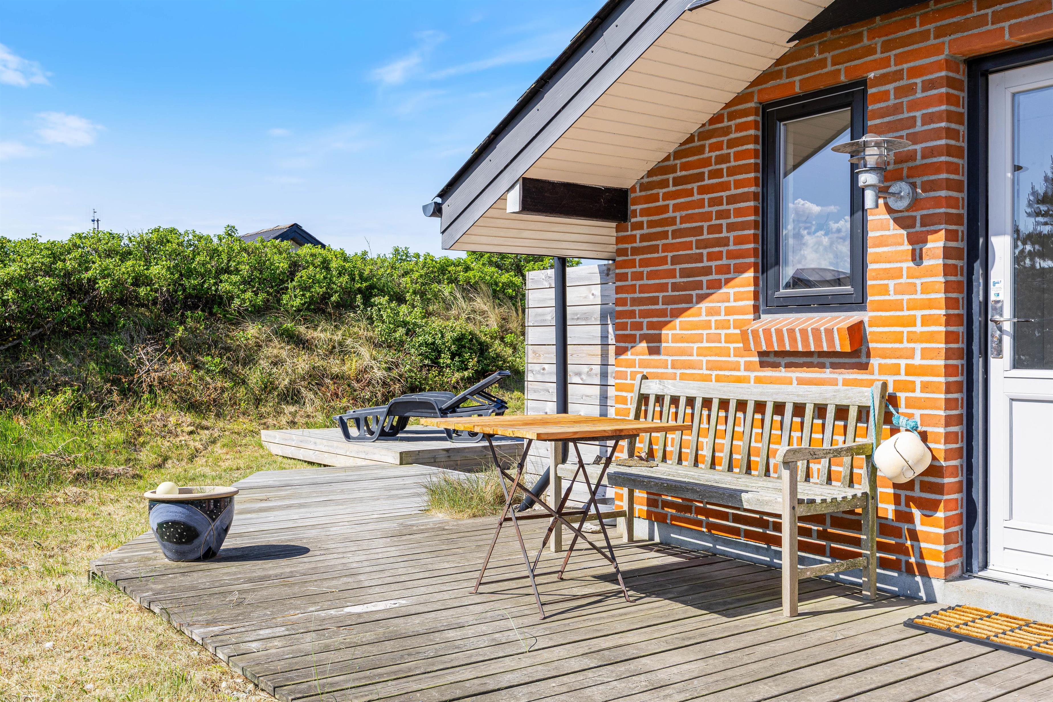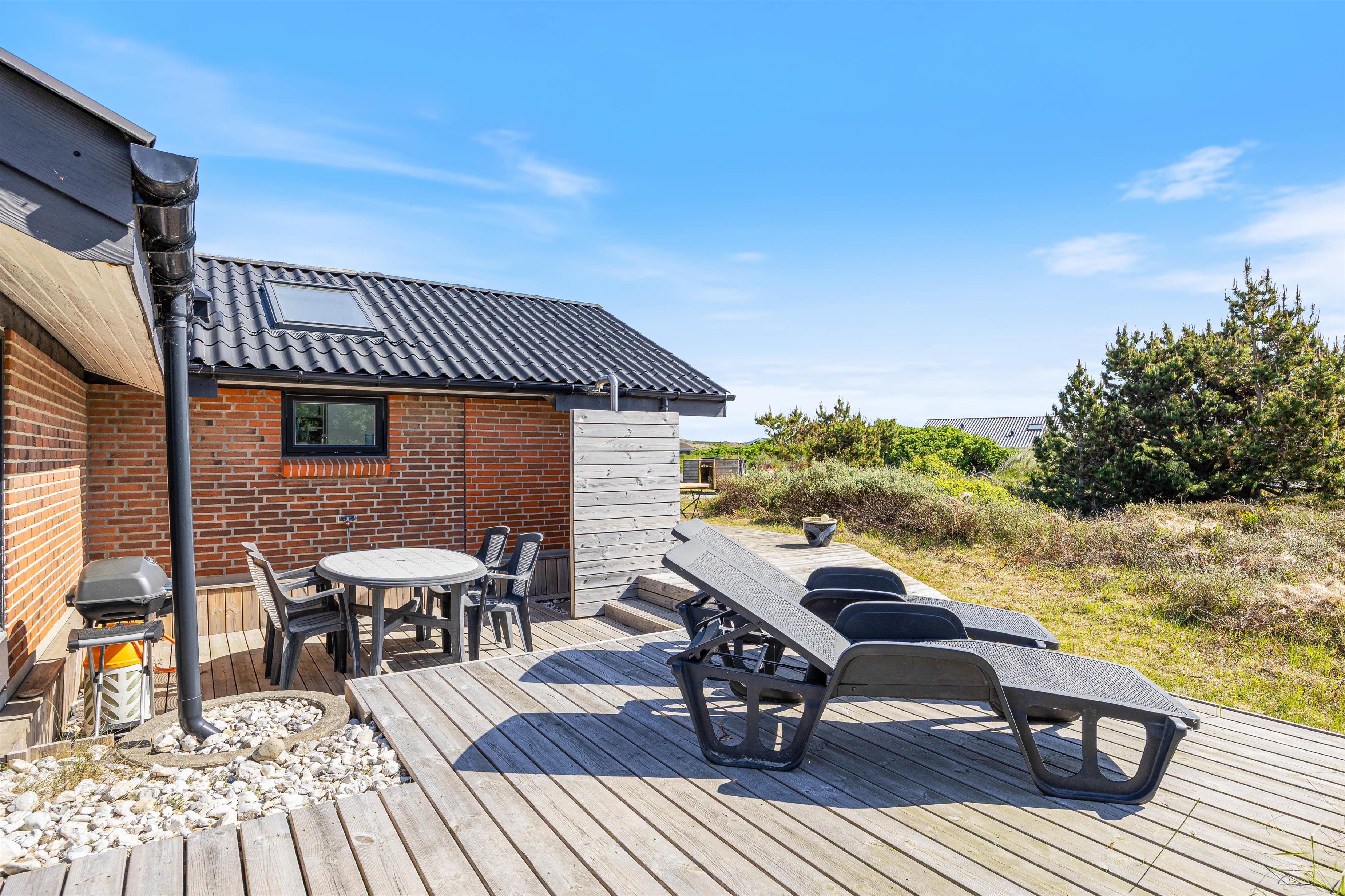Spisebordet har en fantastisk placering foran stuens panoramavinduer med udsigt til klitterne. Fra stuen har I udgang til den sydvendte terrasse. Afhængig af årstiden kan I hygge jer både ude og inde med følelsen af at sidde midt i den dejlige natur, og klitterne giver god afskærmning til naboer, så I kan føle jer ugeneret. Om aftenen kan I nemt og hurtigt tilberede en lækker middag på husets gasgrill, hvilket er til stor fornøjelse hos både store og små.