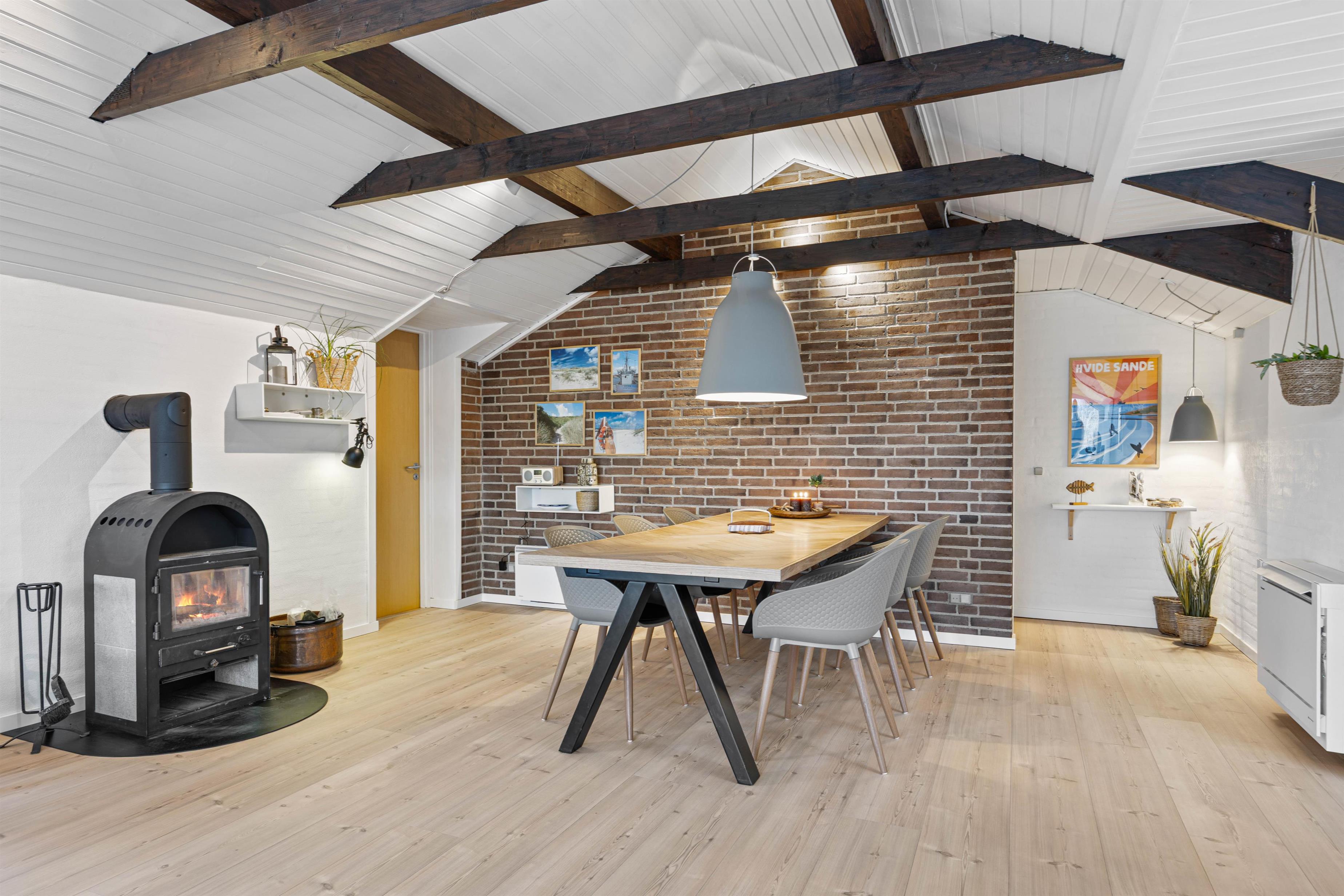 Brændeovnen er centralt placeret i stuen, så varmen og det hyggelige skær kan nydes fra både spisebord og sofagruppe. Skulle det blive nødvendigt at regulere temperaturen yderligere, kan varmepumpen med fordel tages i brug.